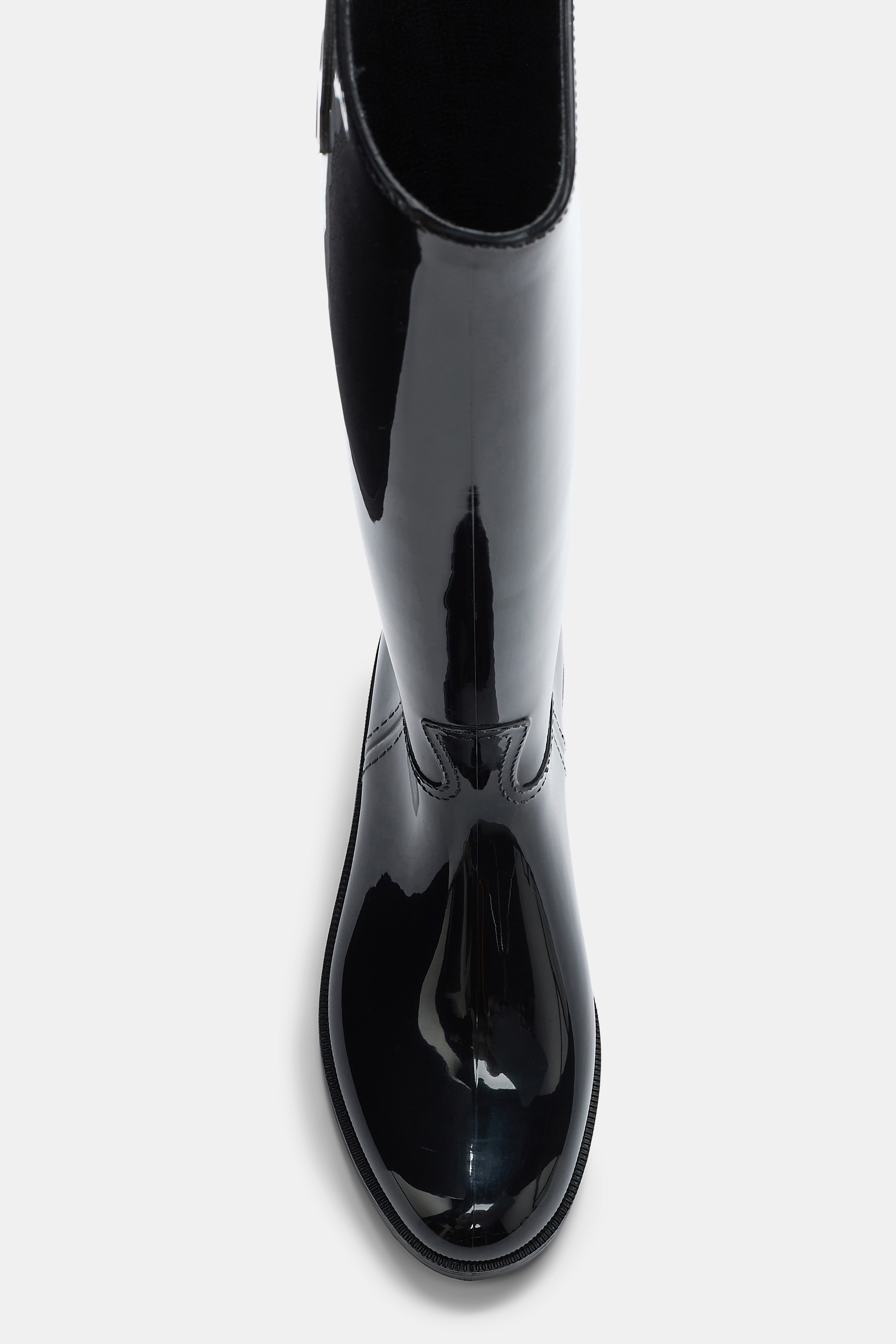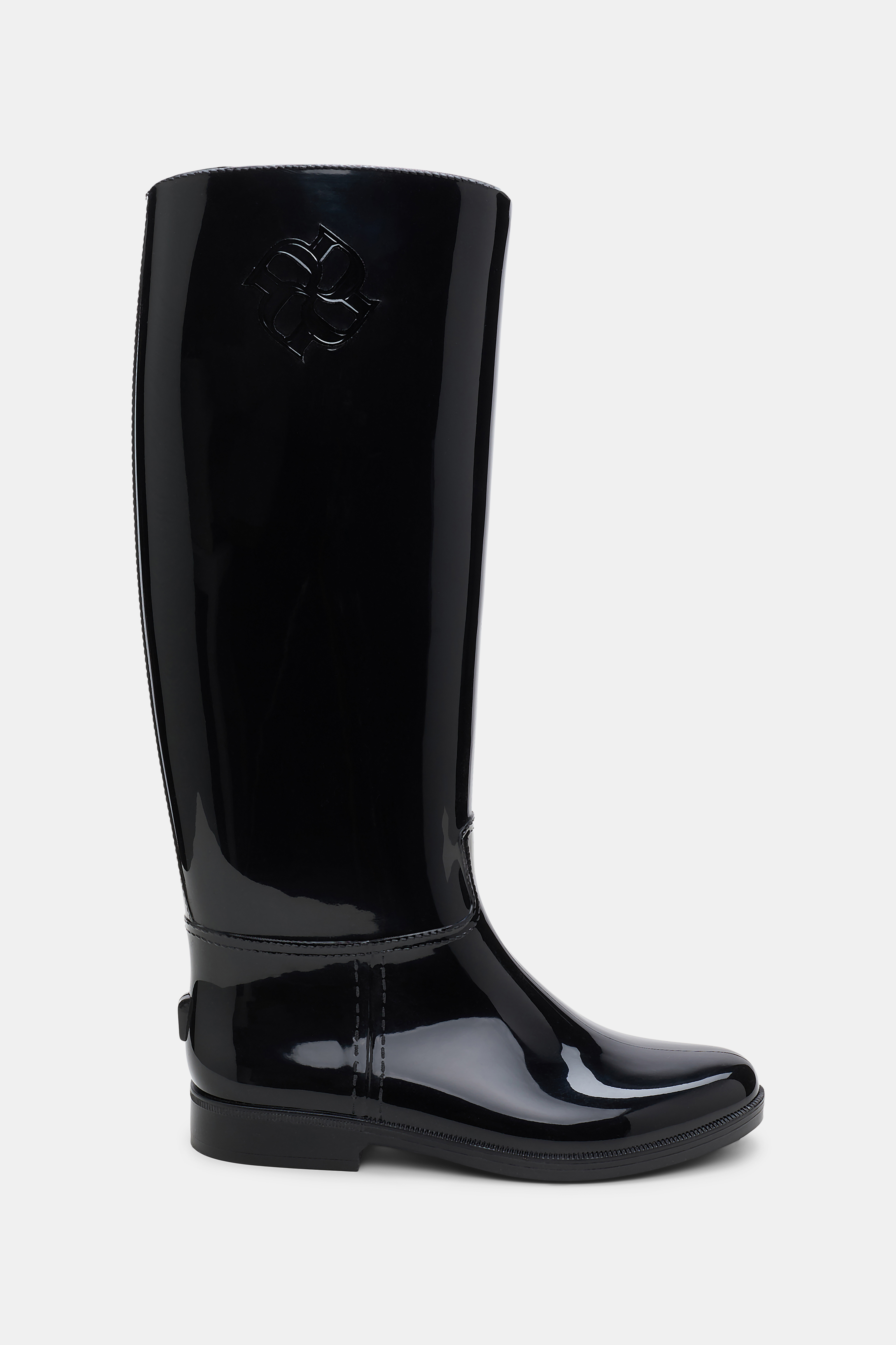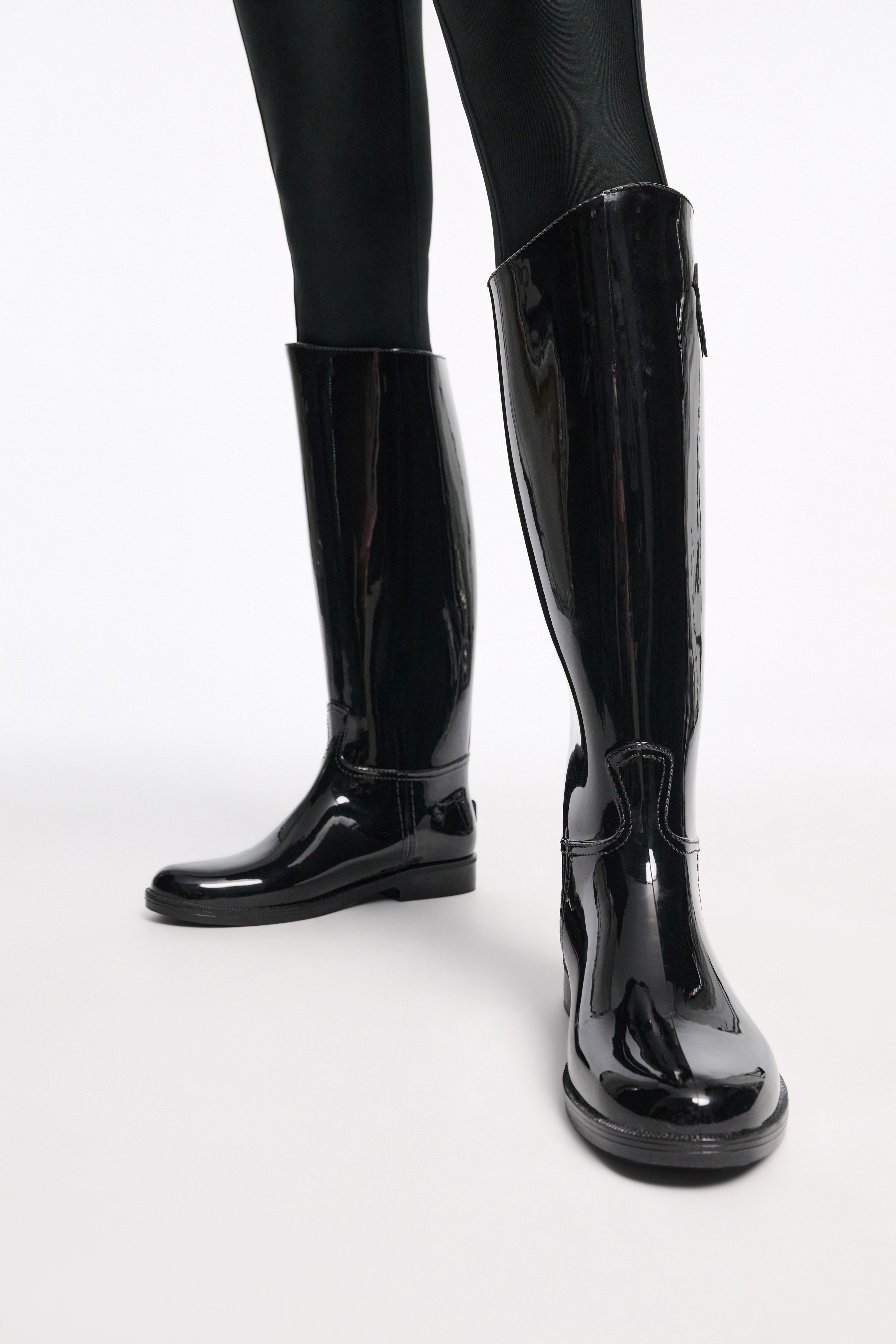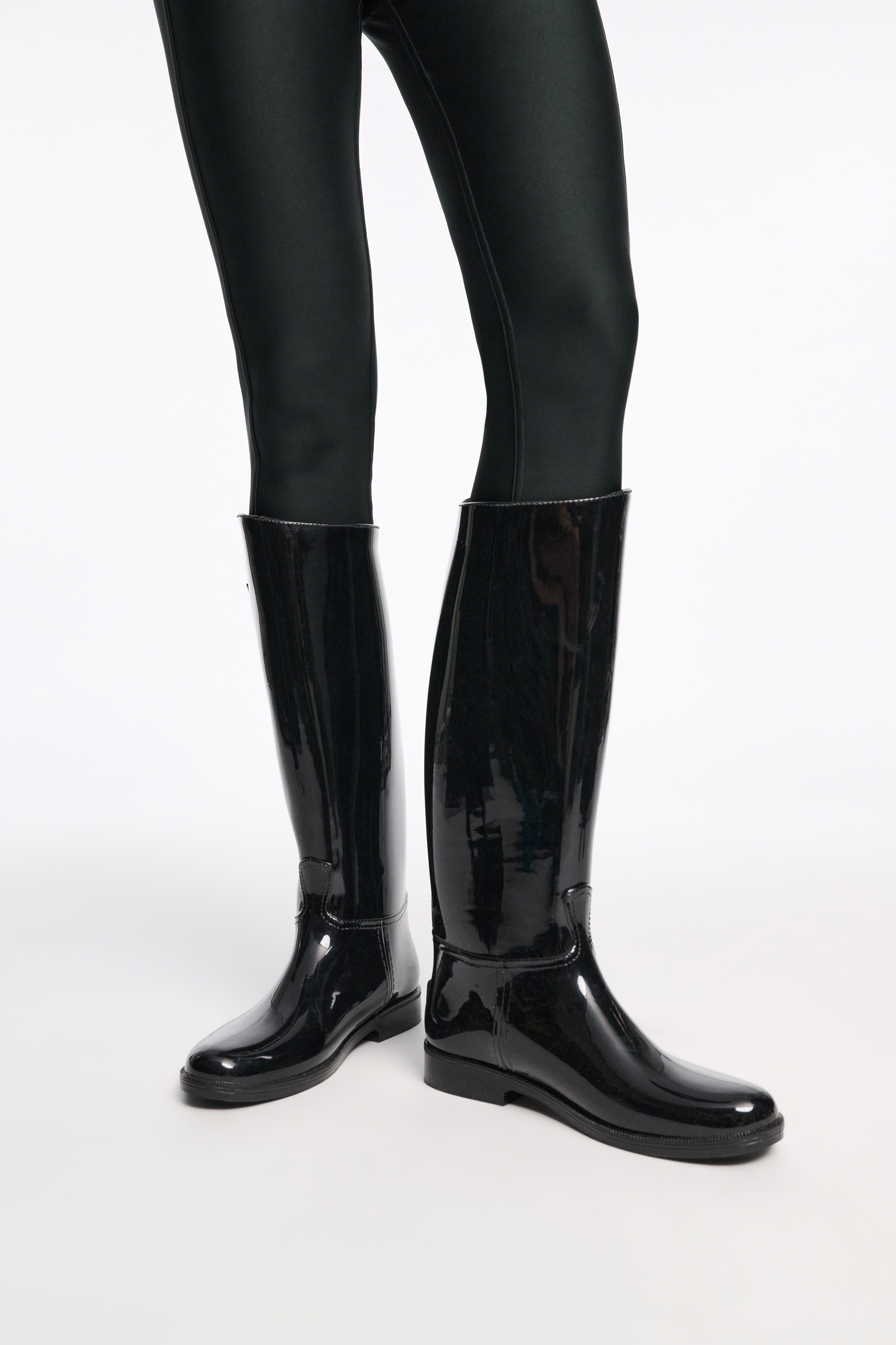The rubber riding boots have a shiny finish and feature a large D-Rose on the shaft.