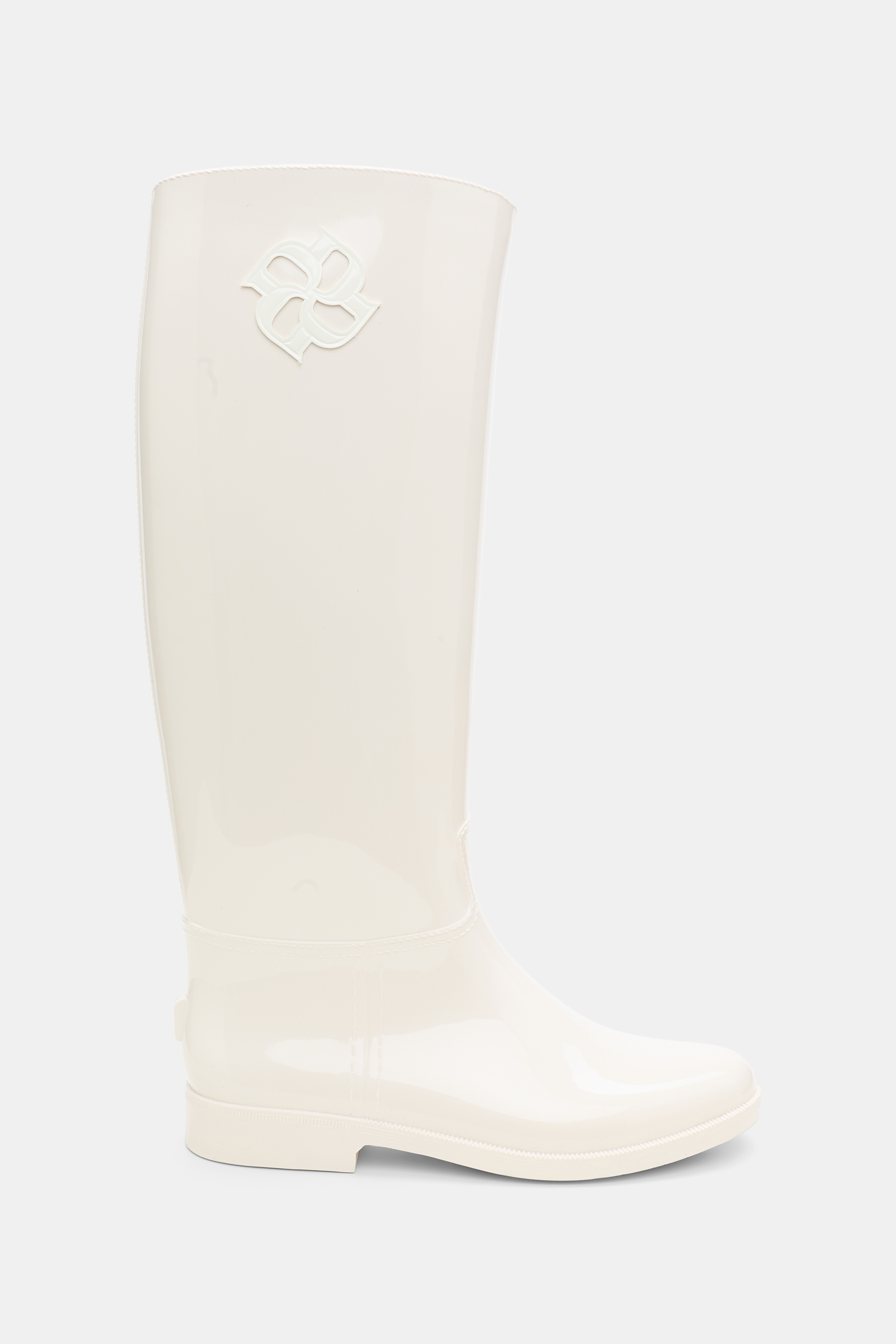 The rubber riding boots have a shiny finish and feature a large D-Rose on the shaft.