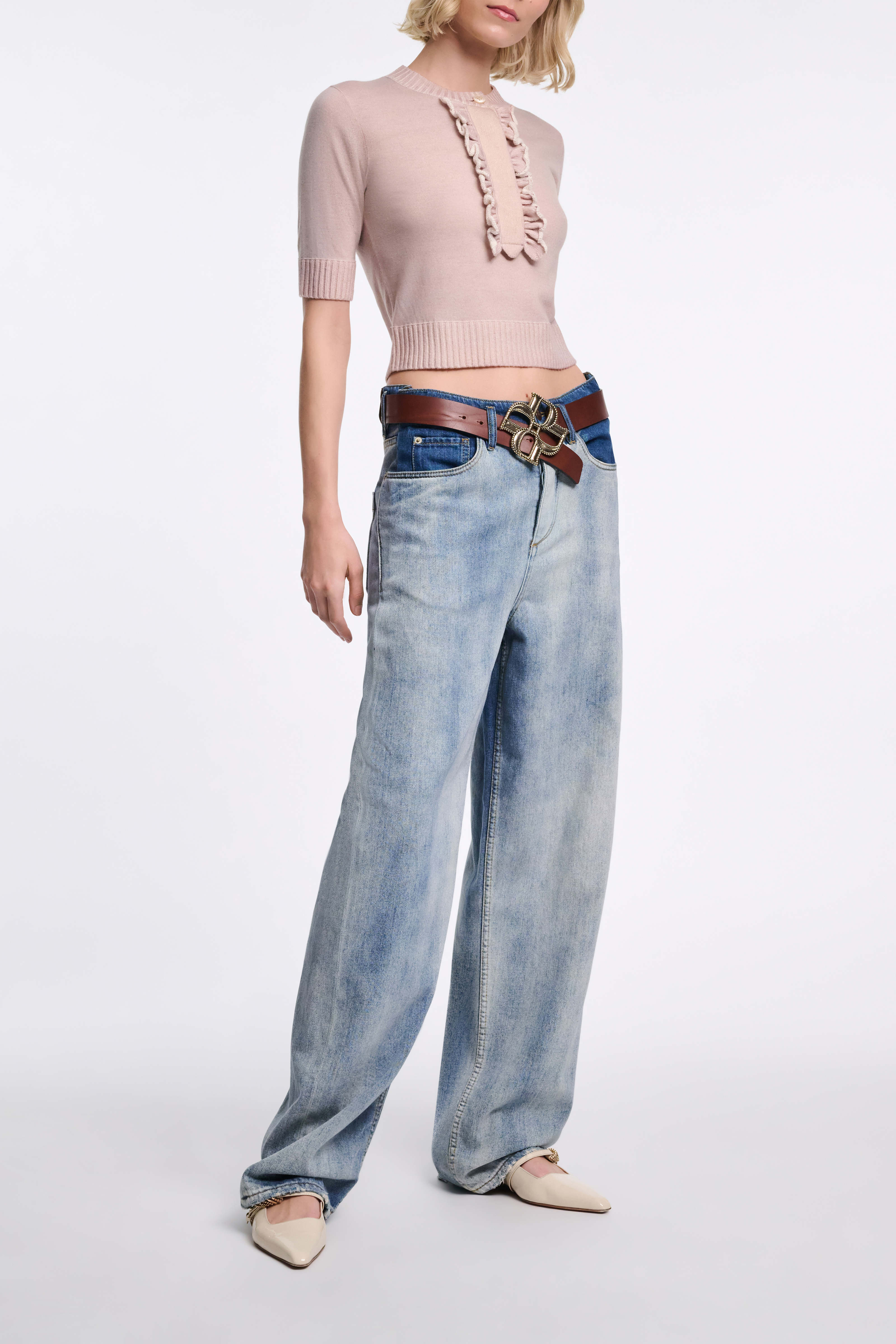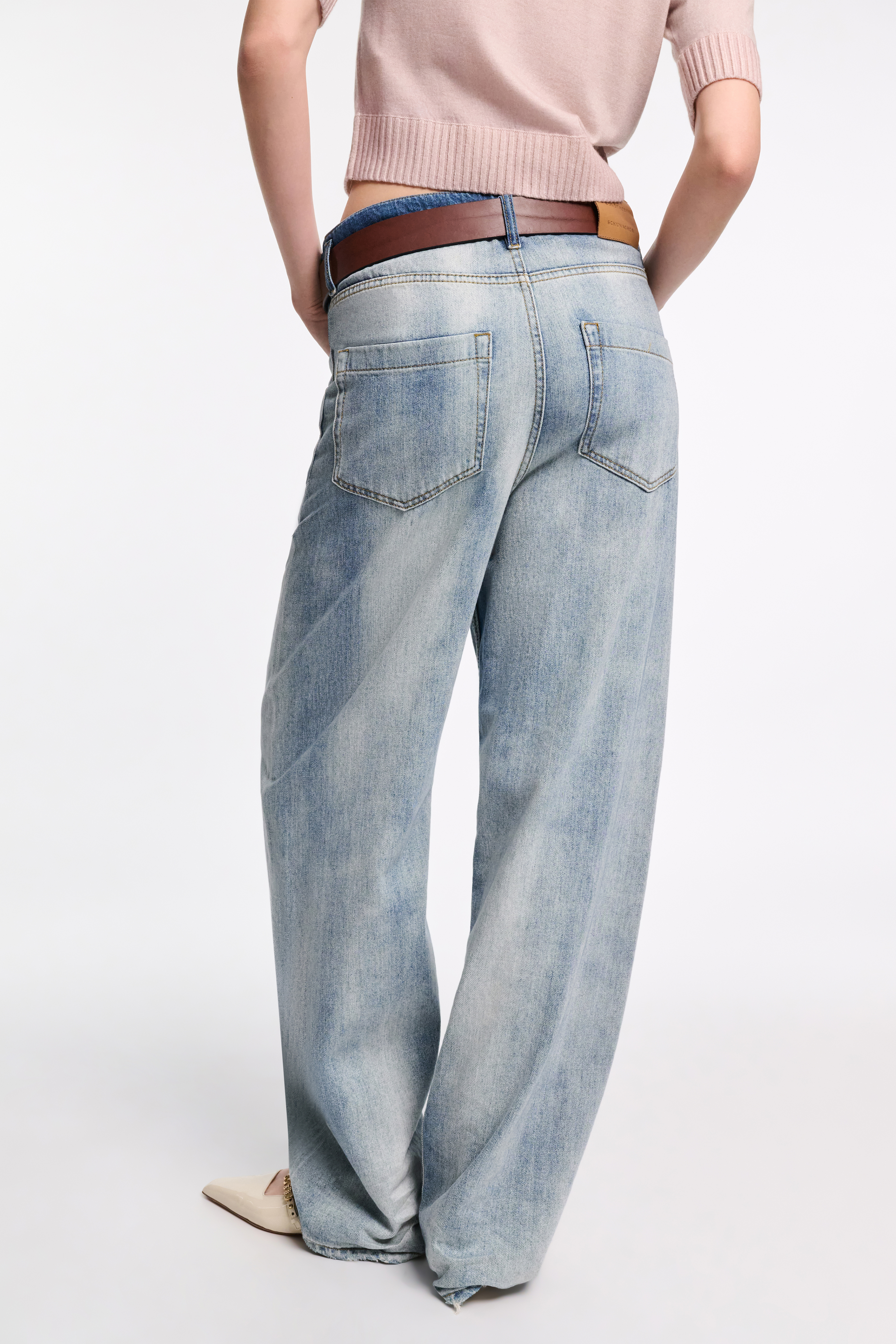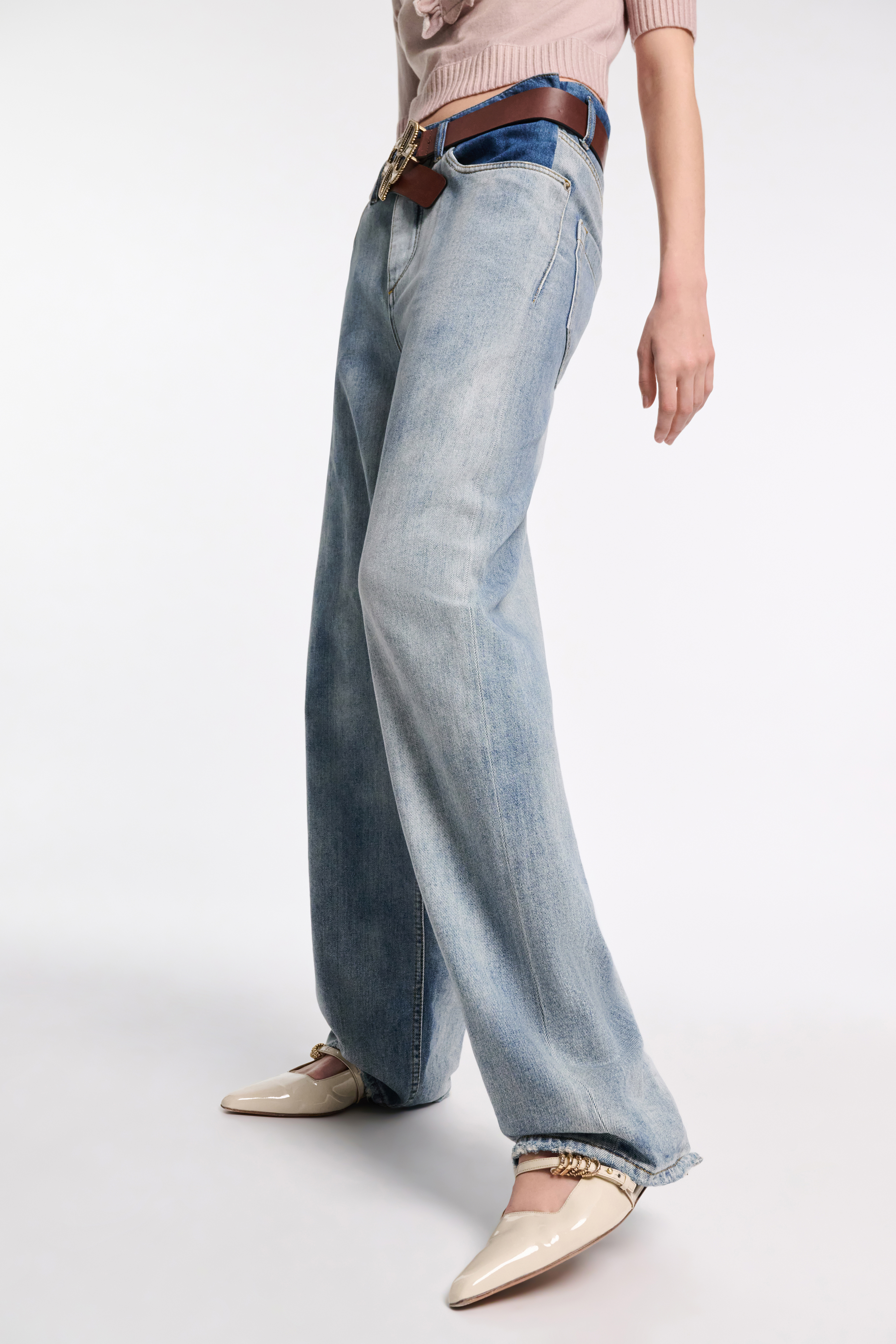 The two-tone jeans have a baggy fit and feature our cloudy wash below the waist and pockets.