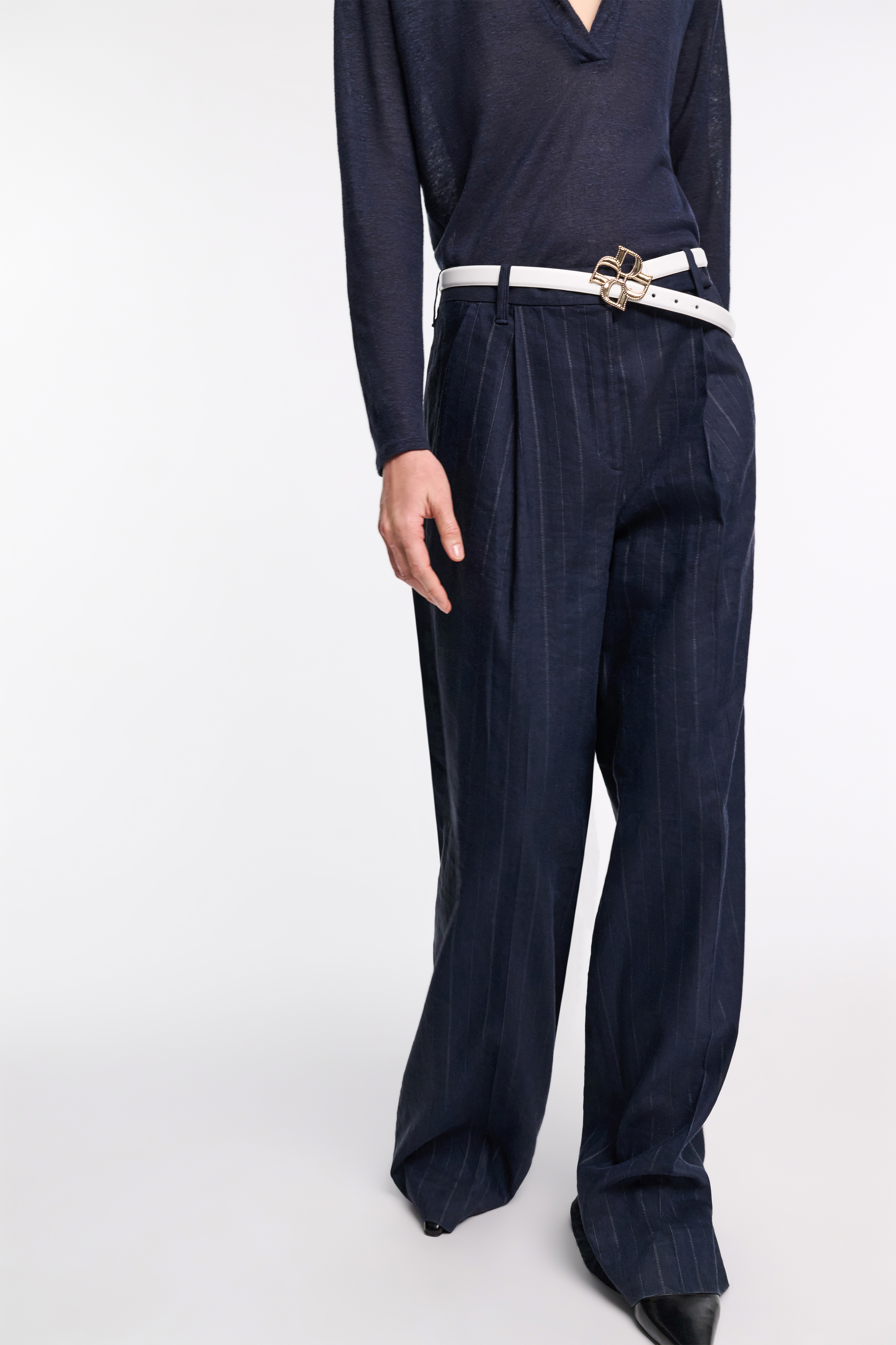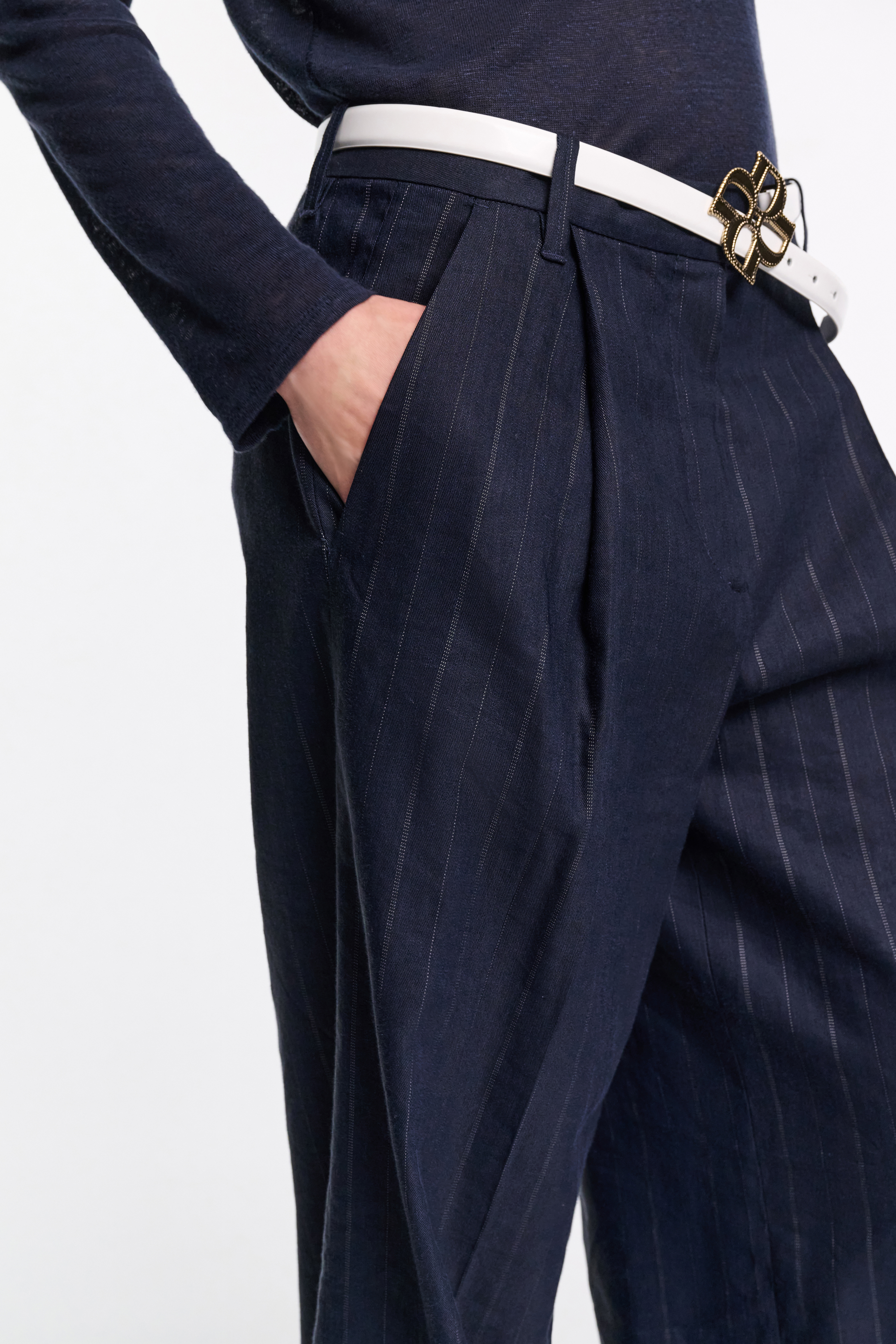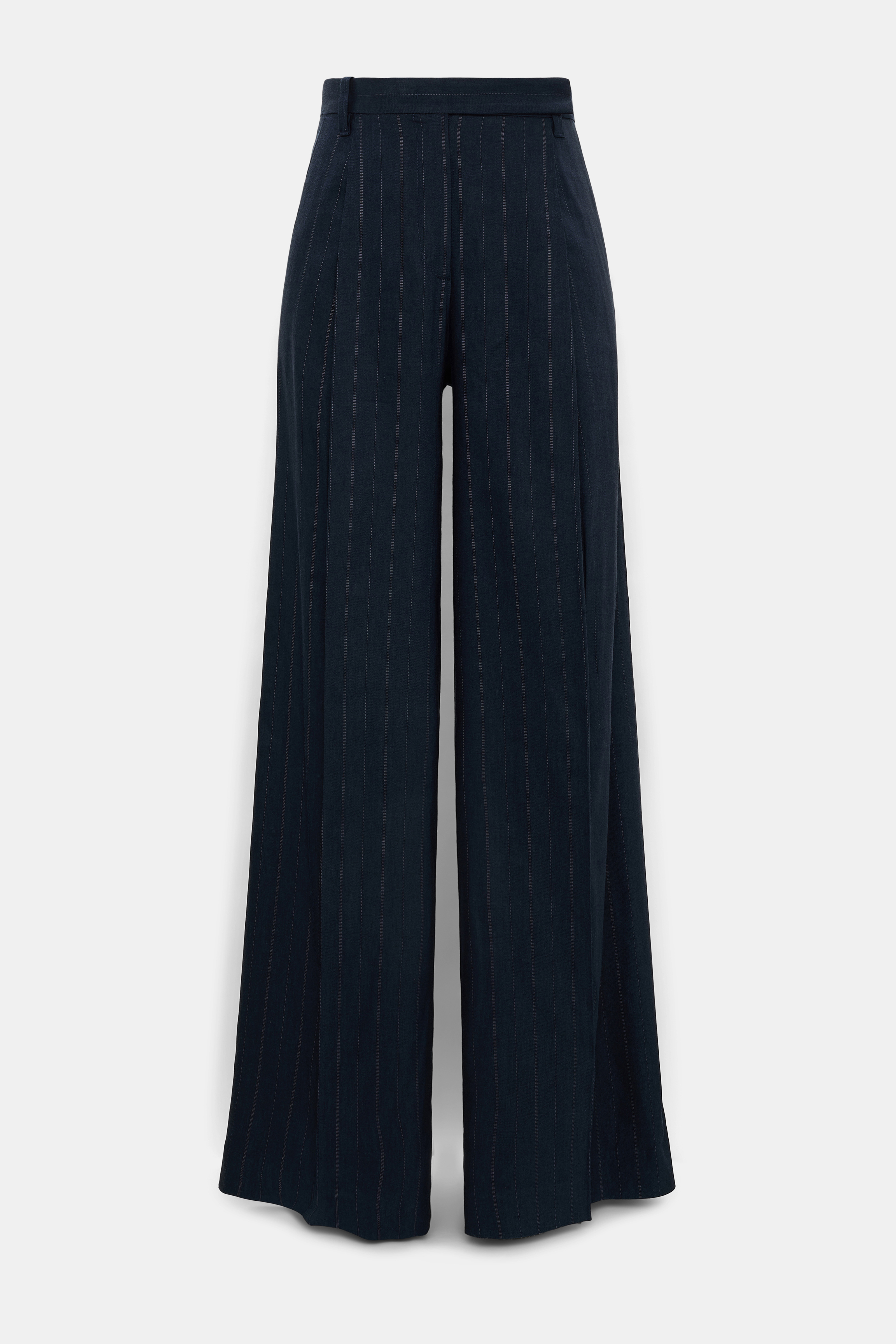 Crafted in a linen blend, the pinstripe pants feature front pleats and a wide leg.
