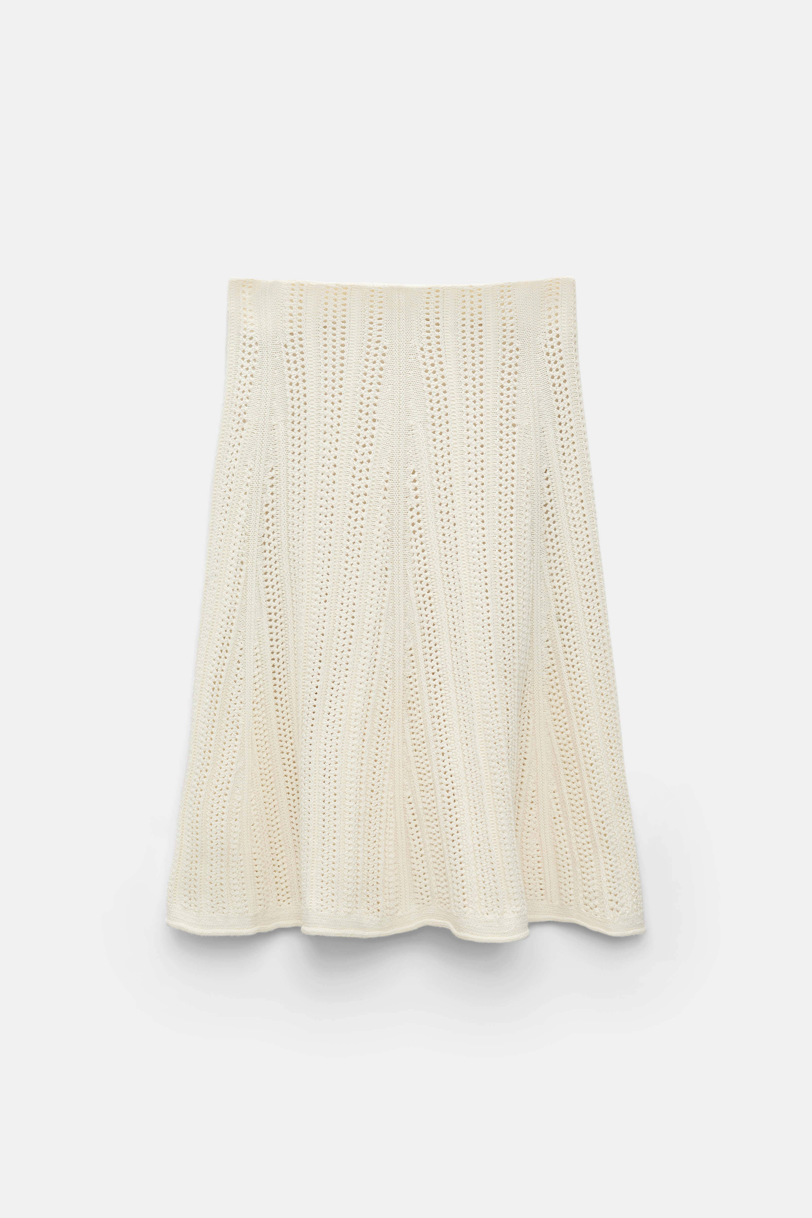 The skirt is knit in a stretch cotton mix and has allover graphic pointelle patterning.