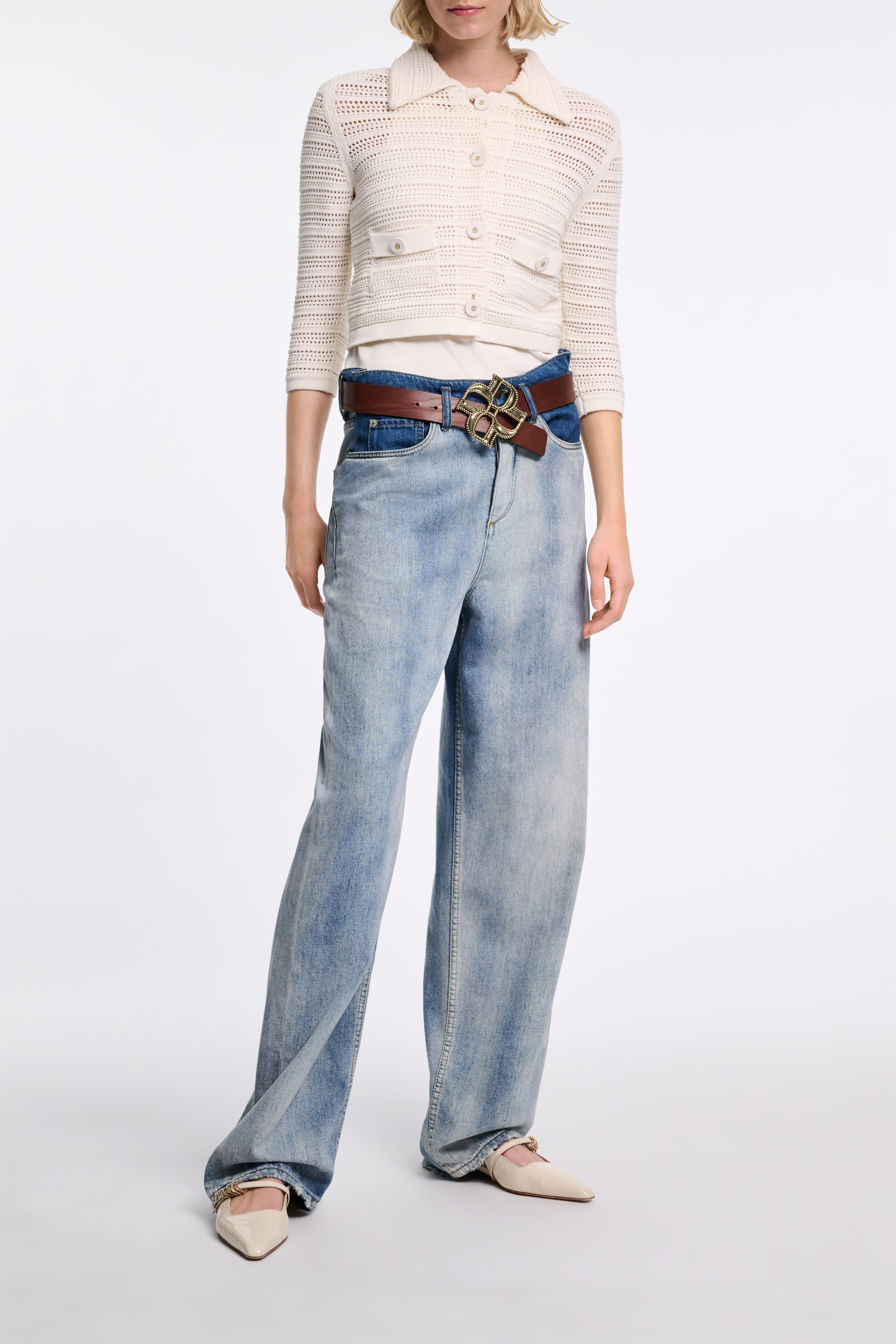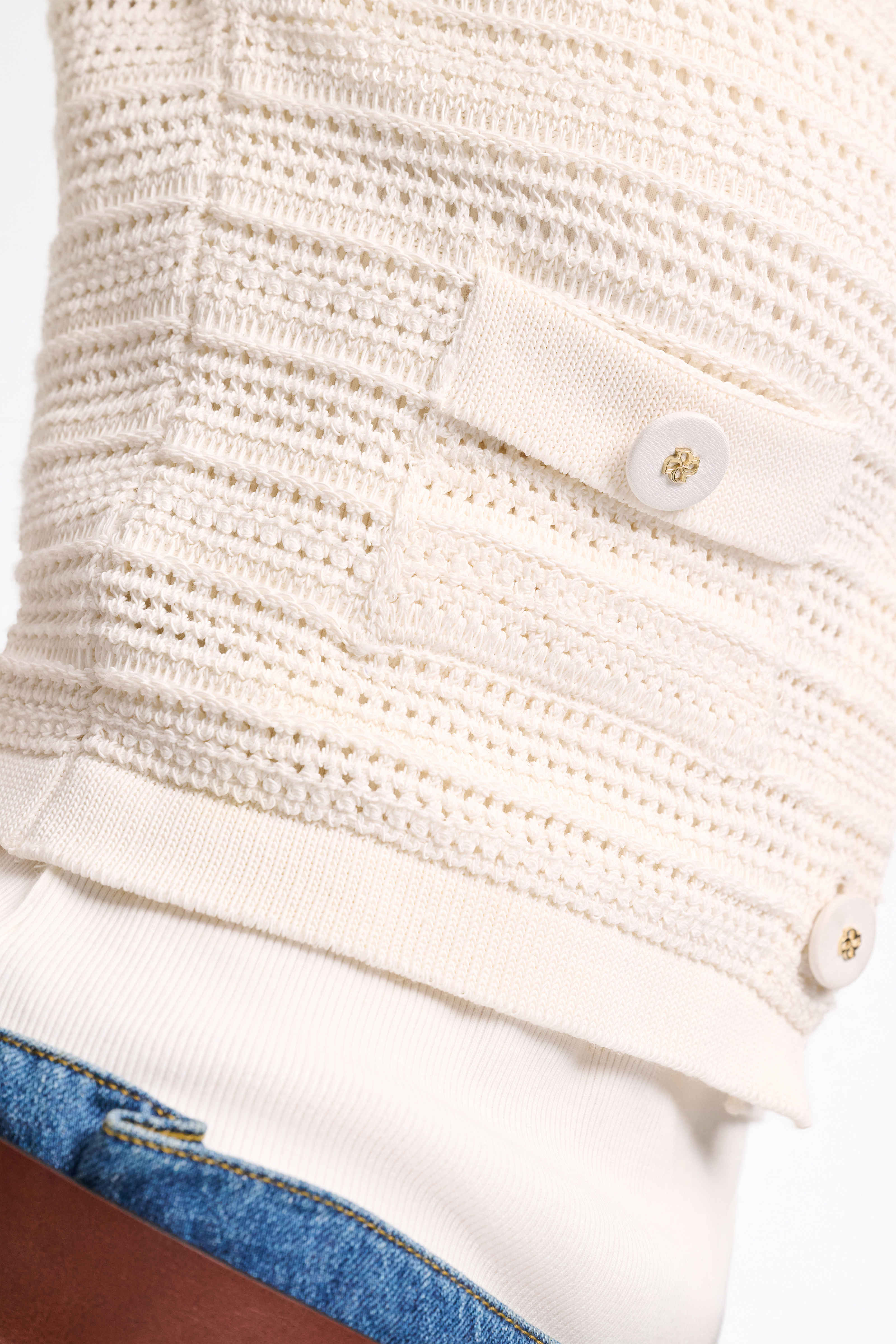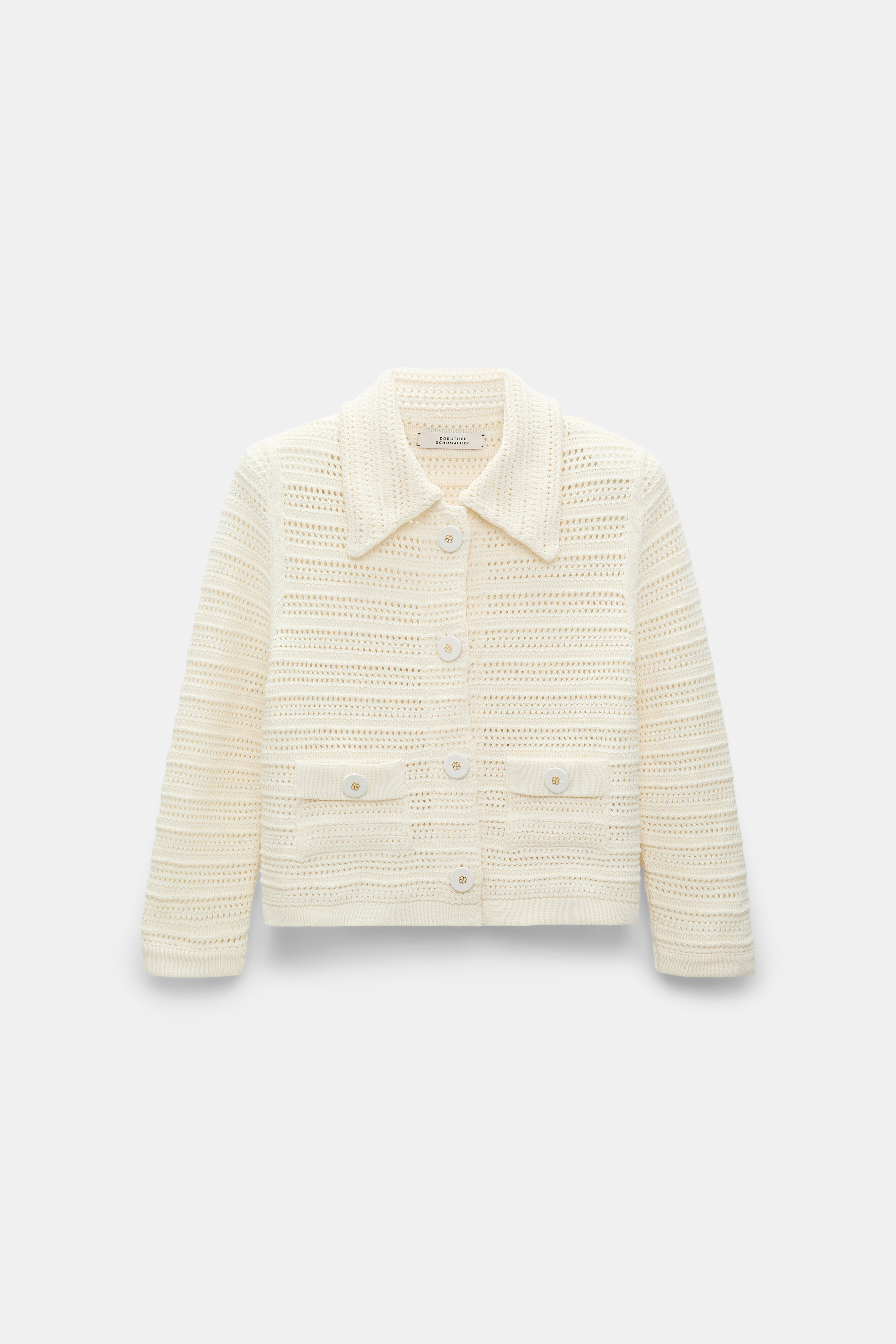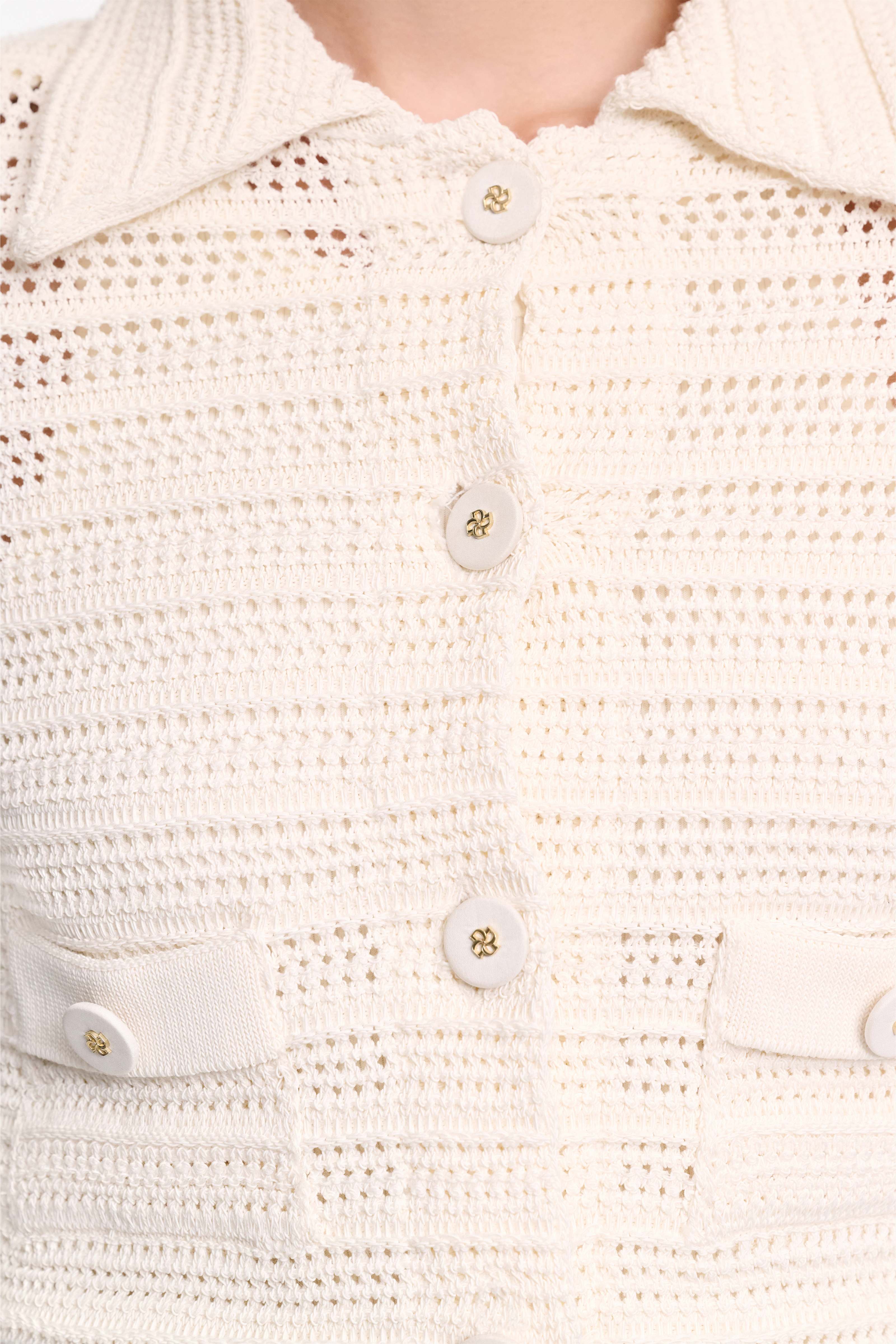 The cropped jacket is knit in a stretch cotton mix and has allover graphic pointelle patterning.
