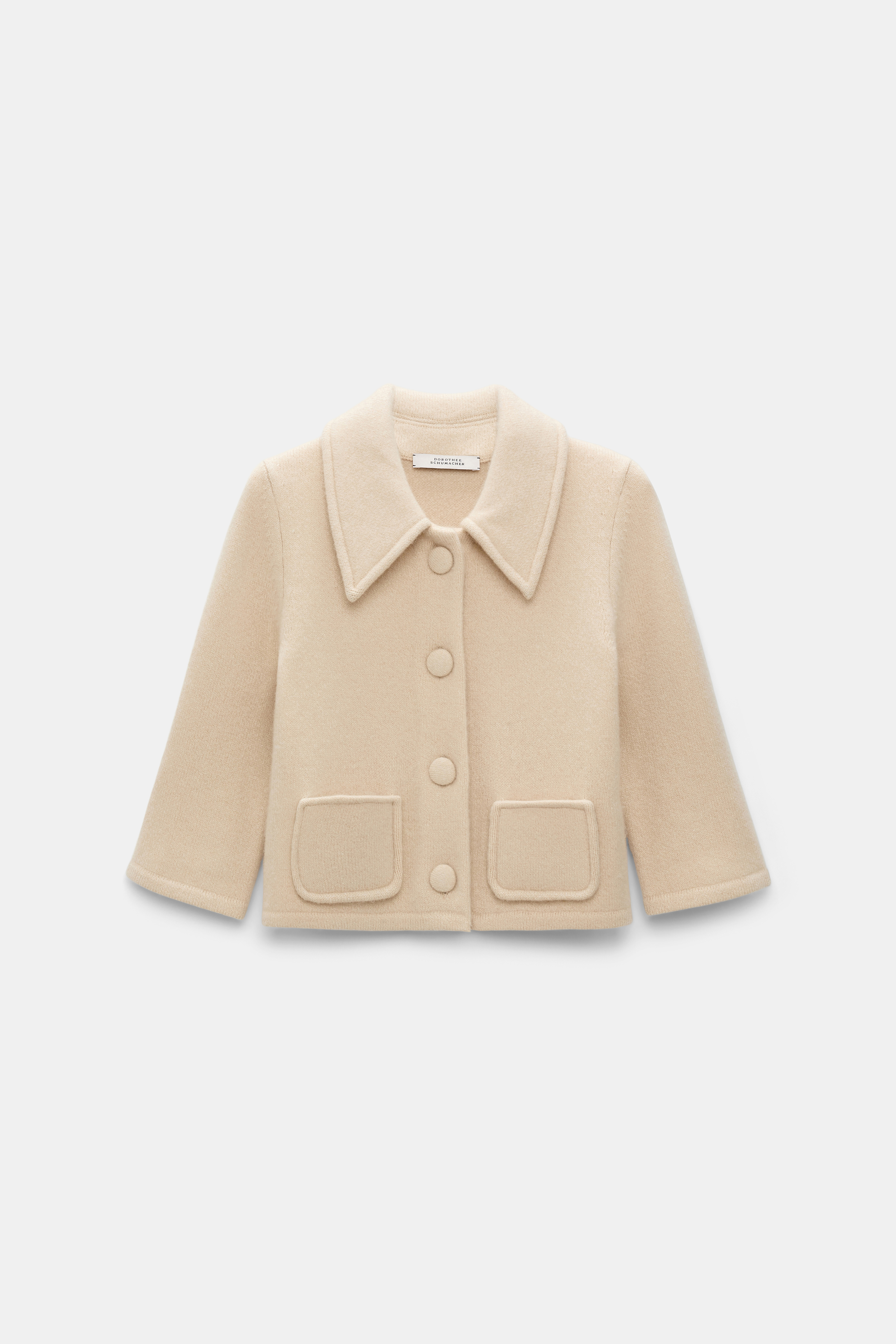 The cropped jacket is made from a soft Merino-cashmere mix and has an oversized collar.