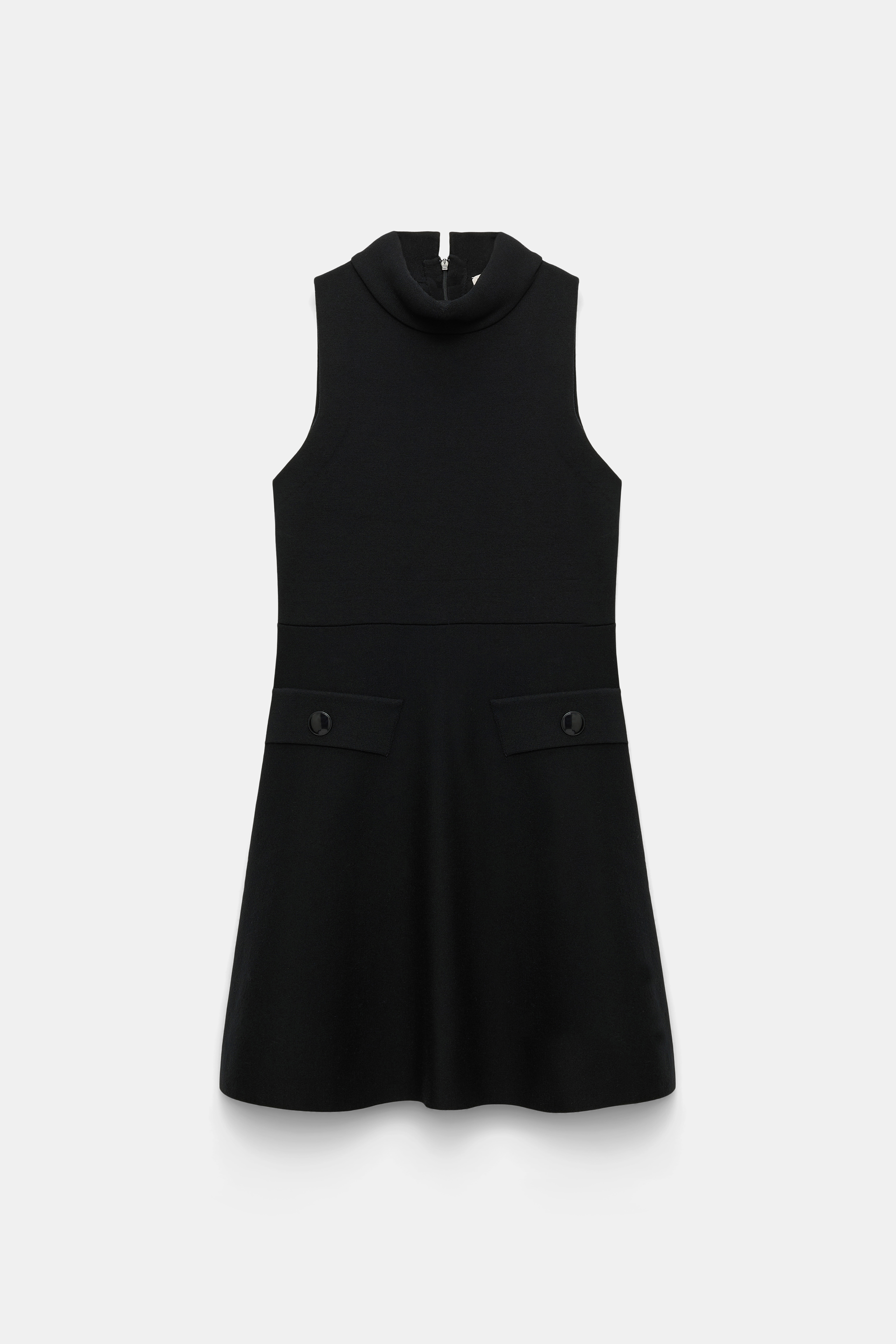 Channeling a retro-modern vibe, the sleeveless knit dress has a turtleneck collar and flared swing skirt.