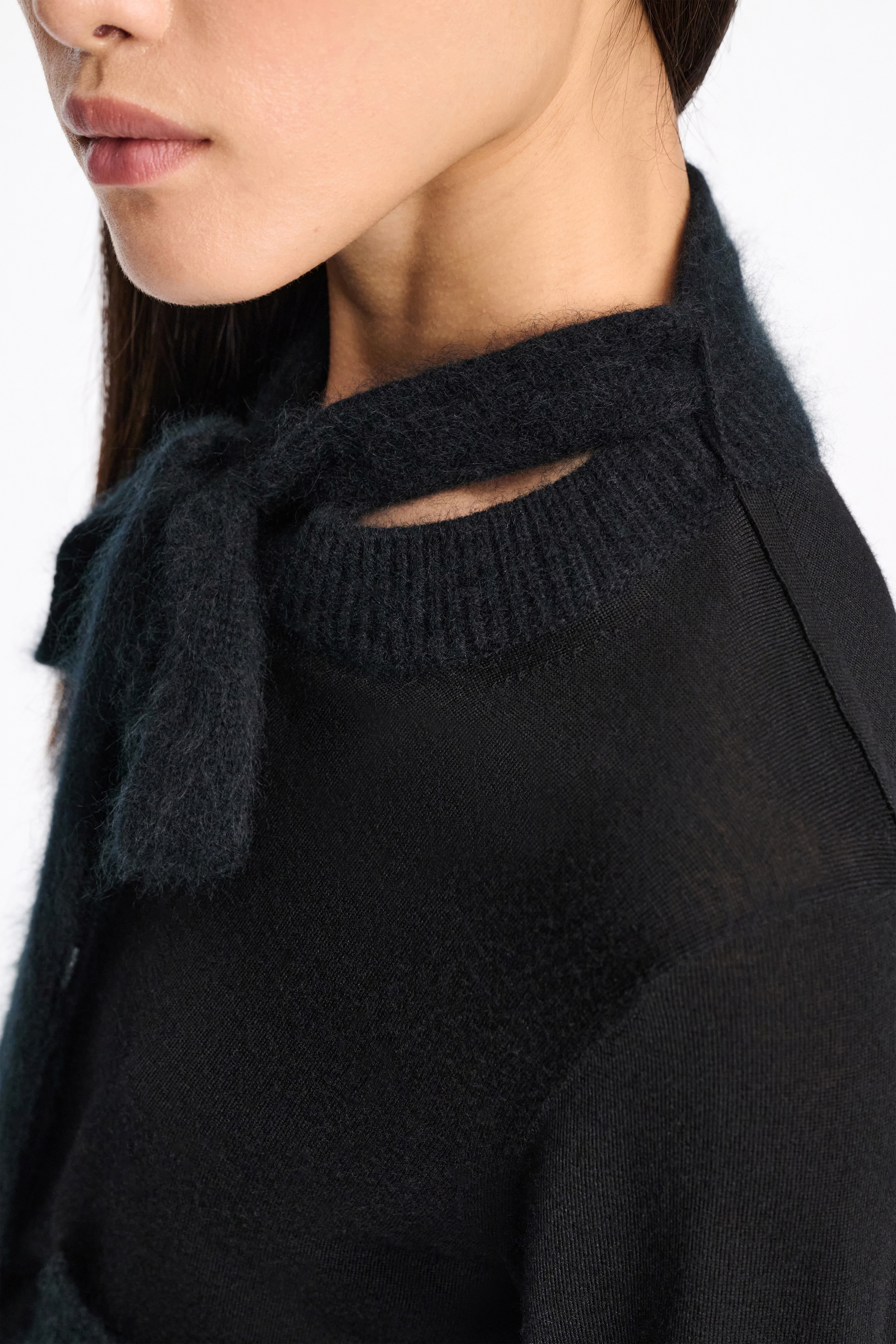 The cropped cardigan is knit in virgin Merino wool and features a tie neckline & detailing in our softest, fluffy wash finish Merino-cashmere mix.