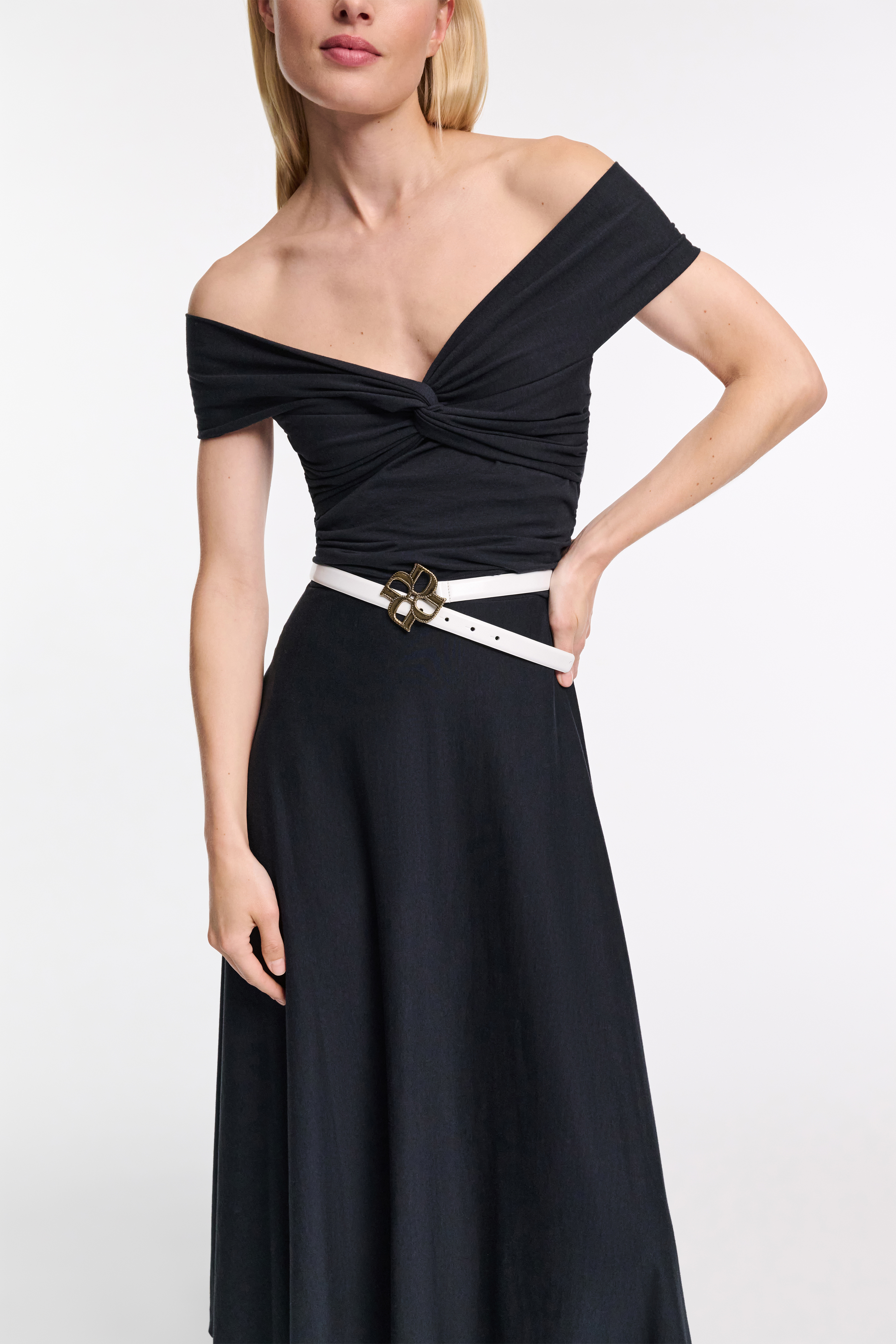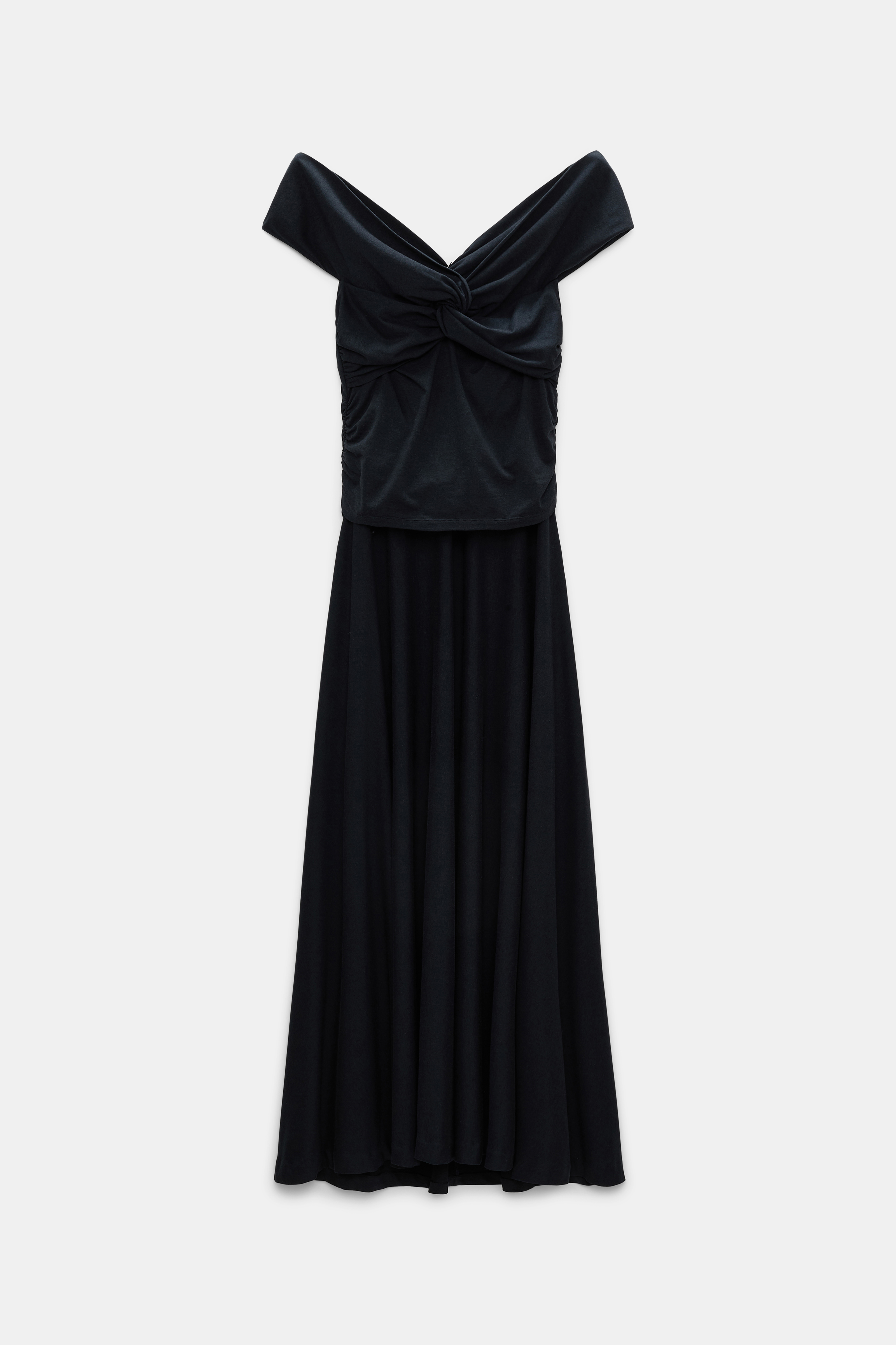 Crafted in a comfortable cotton-jersey mix, the stretchy dress features a draped knot detail and flared swing skirt.