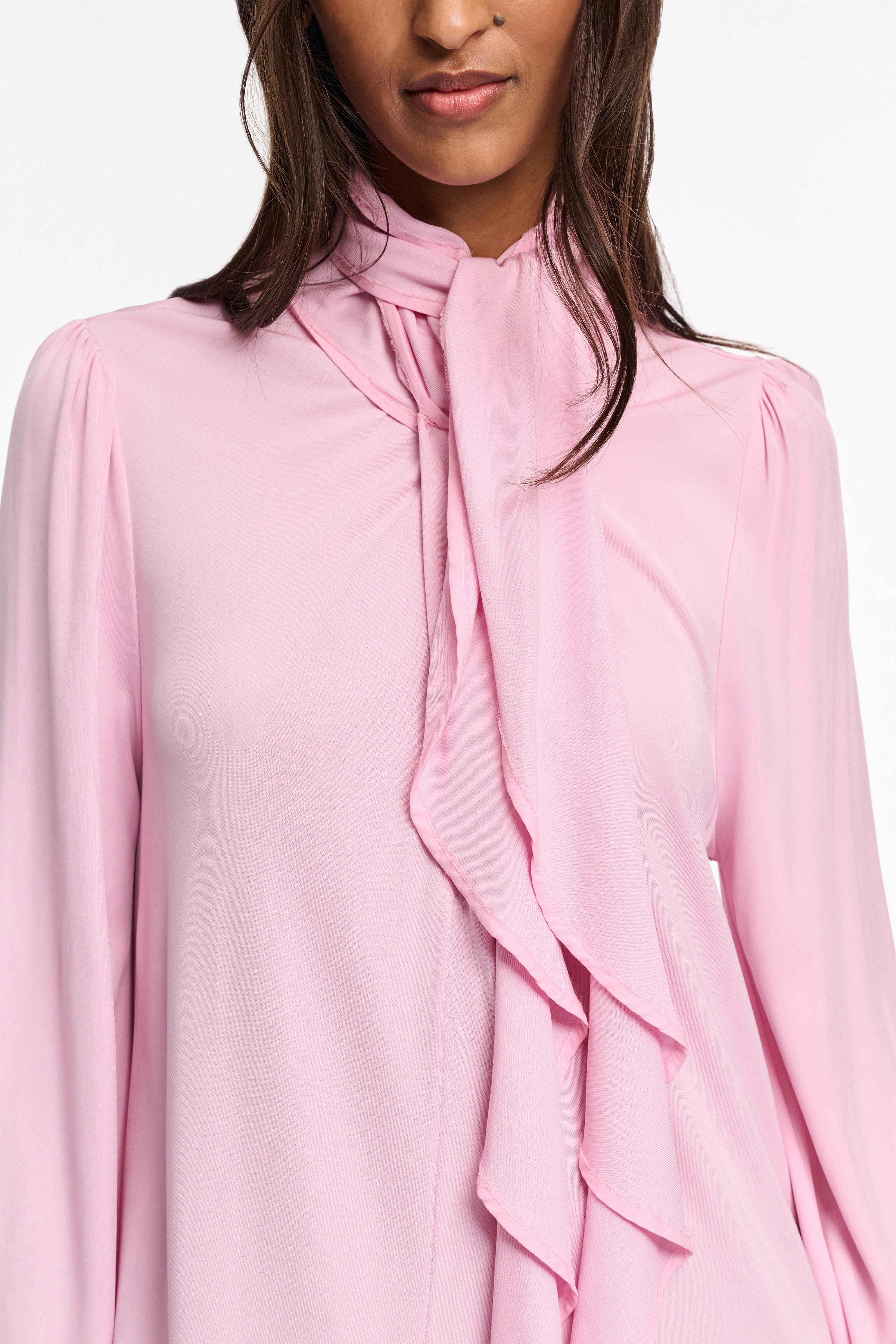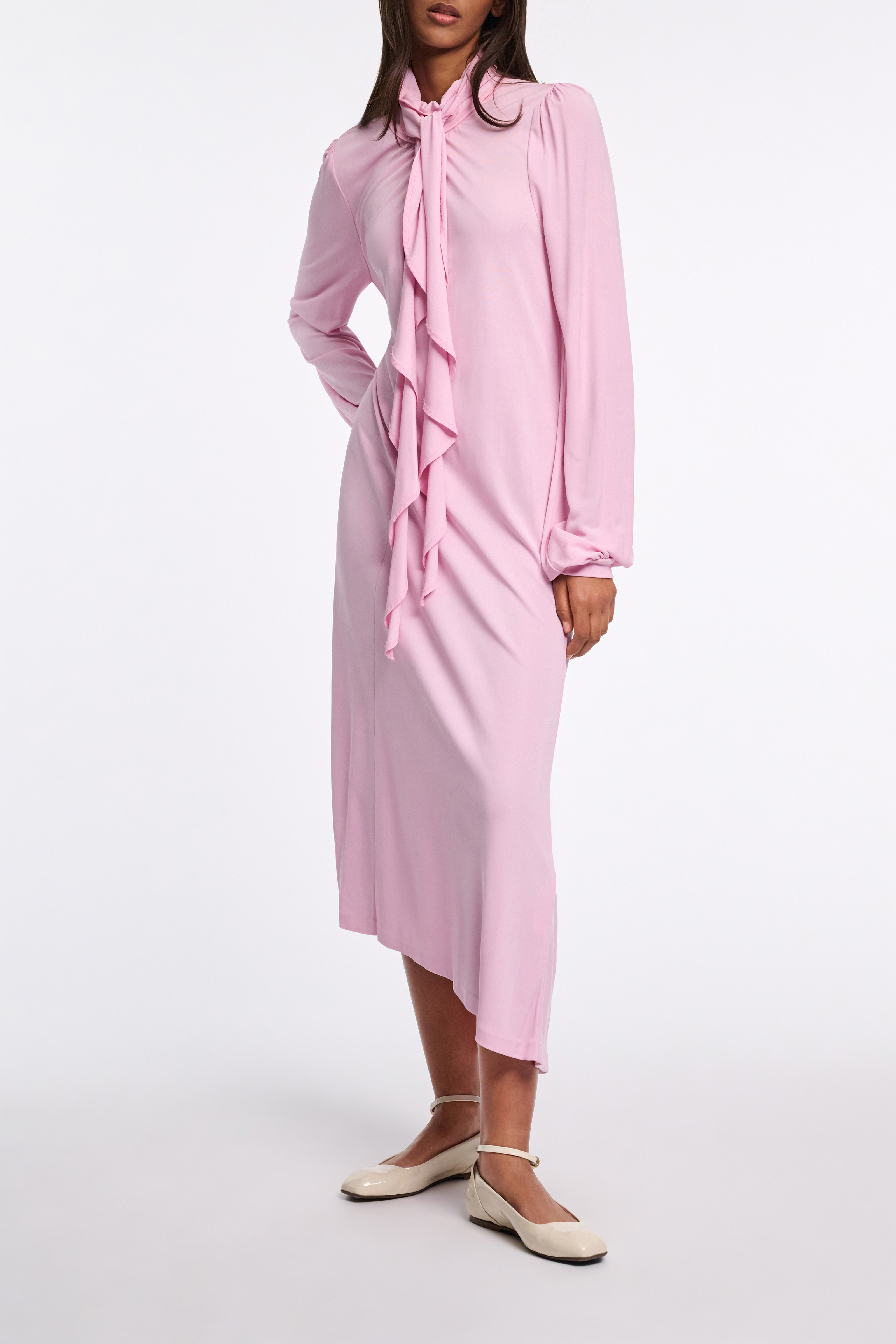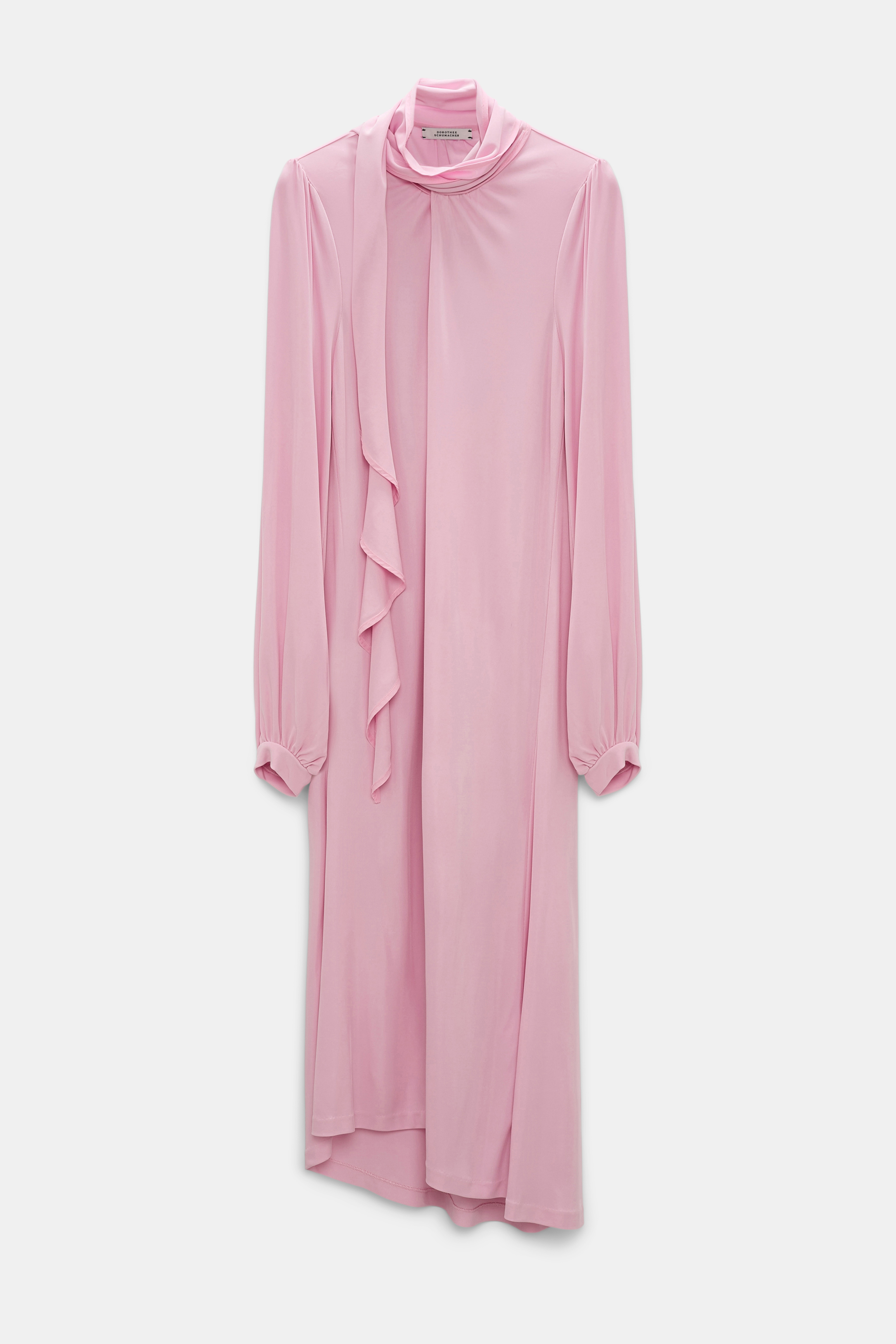 The dress is made from flowing crêpe-jersey and has a flounce scarf draped around the neckline.