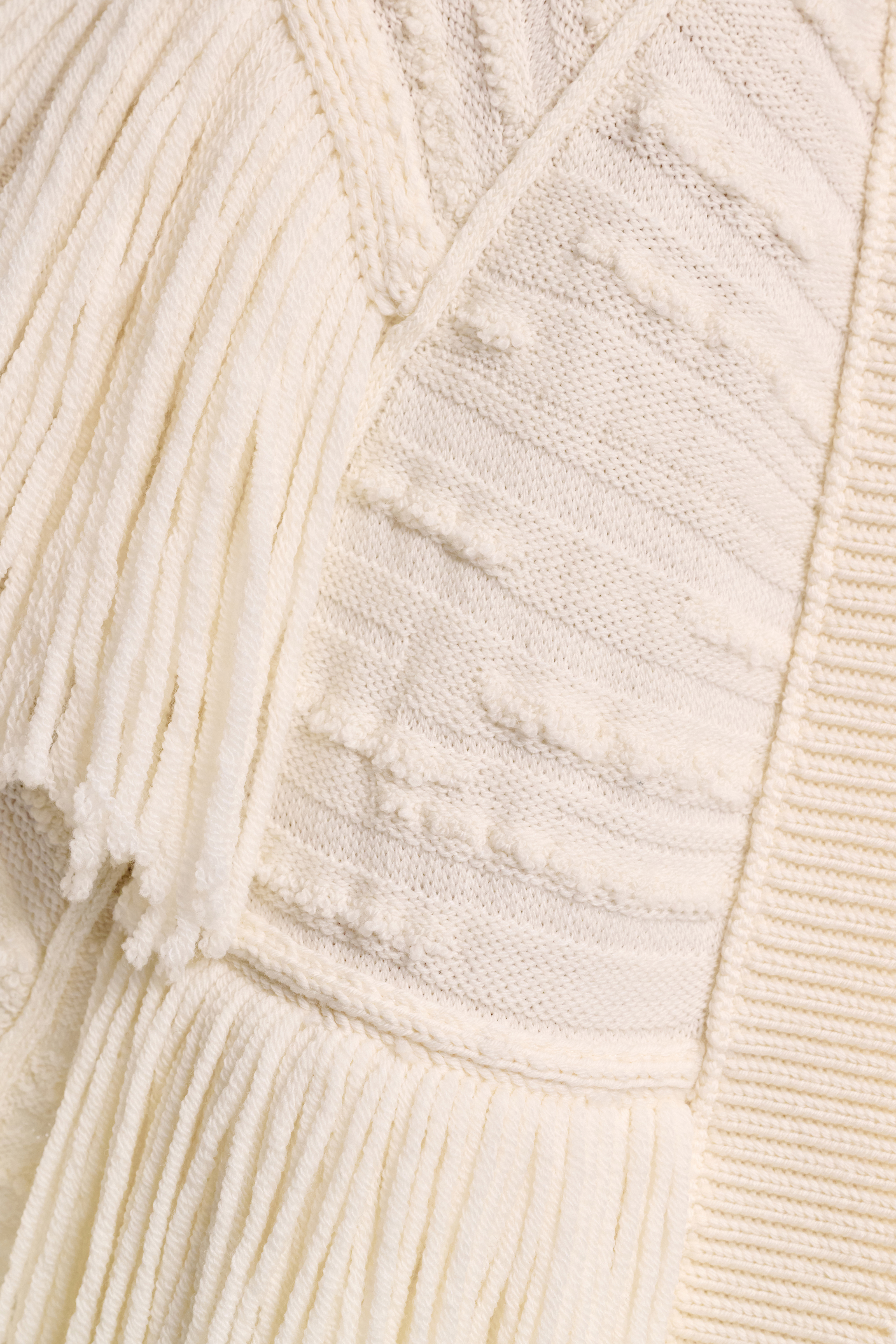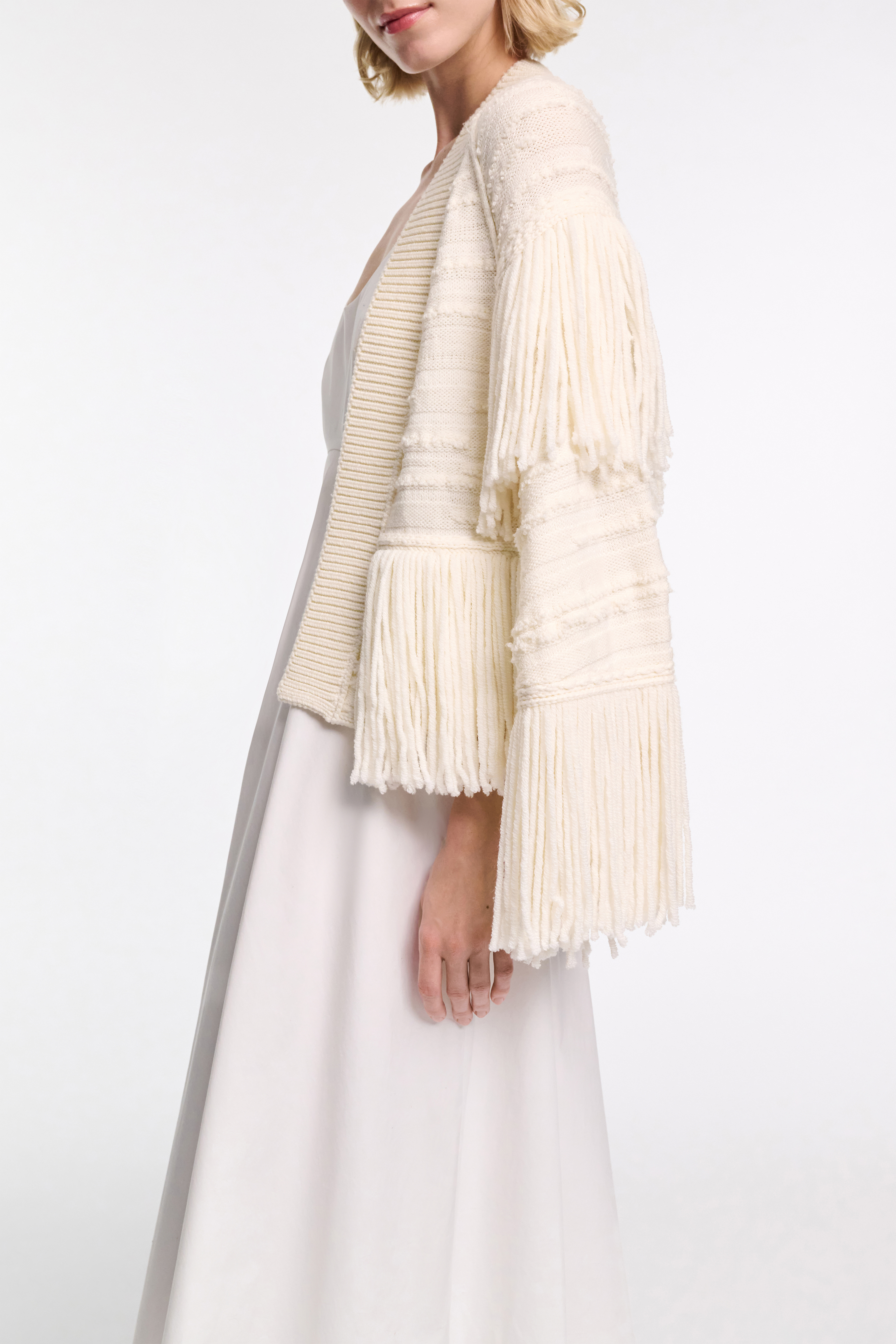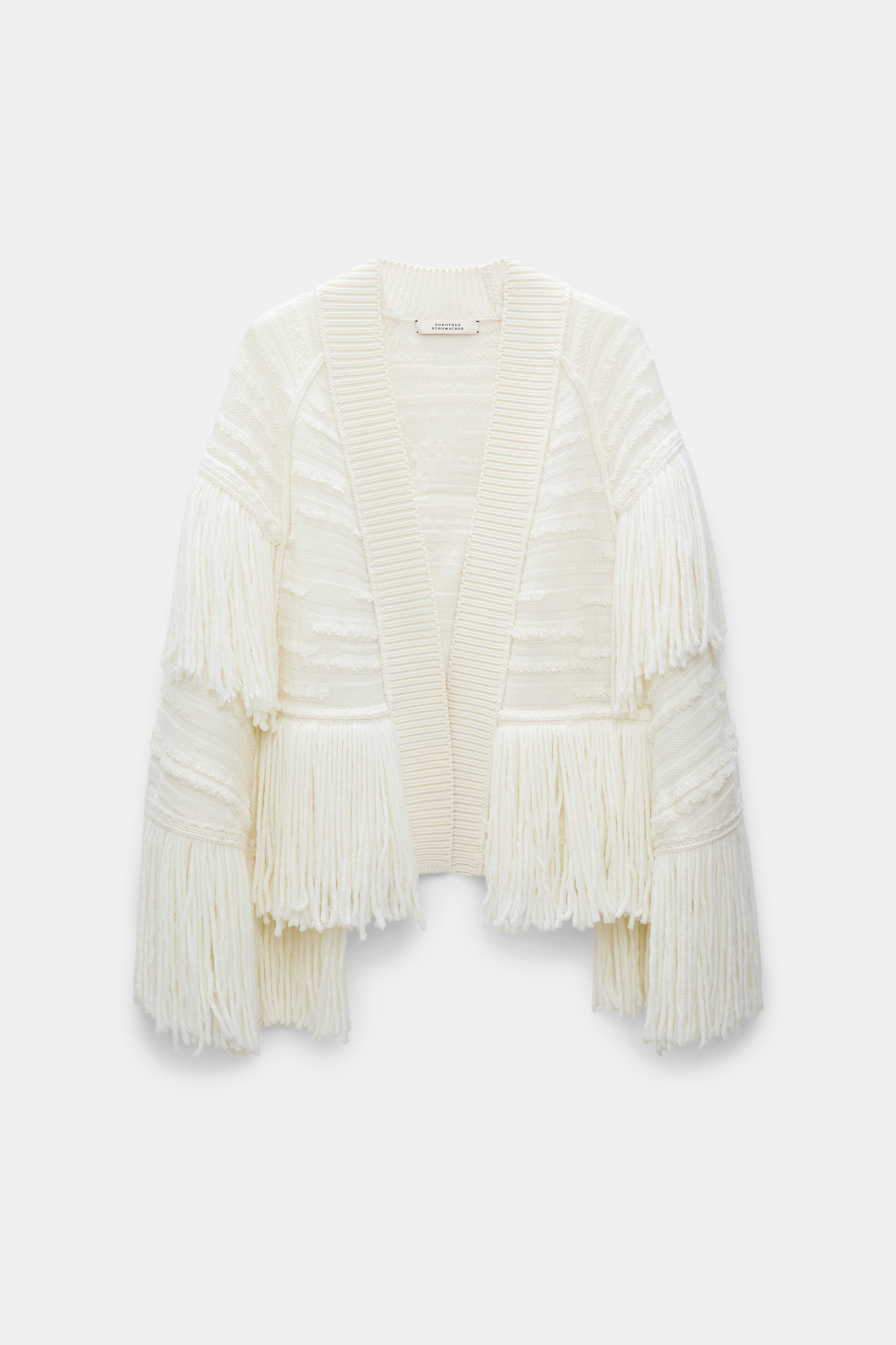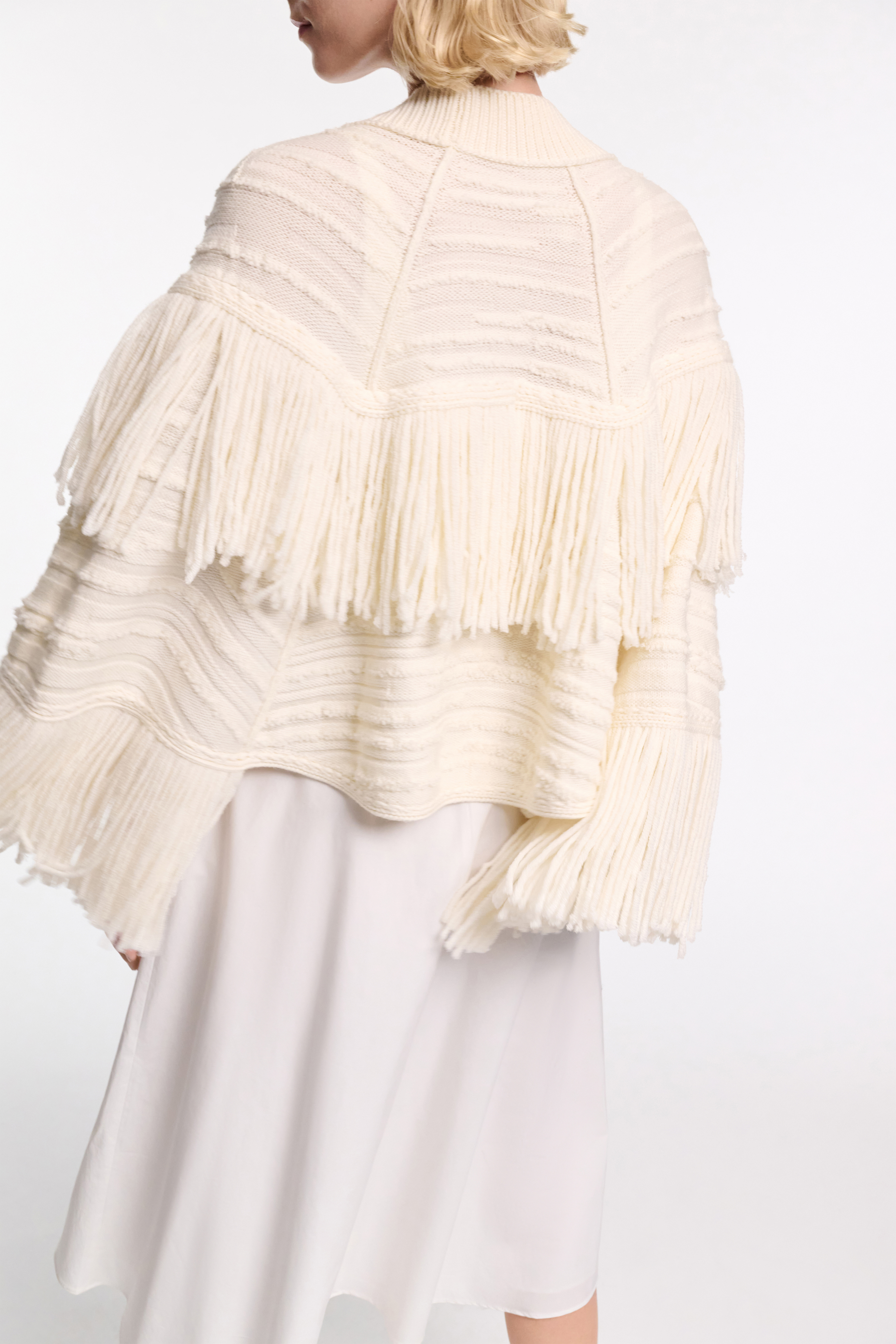 The cape style cardigan is made from soft virgin Merino wool and has a mix of fringe and tactile relief knit patterning.