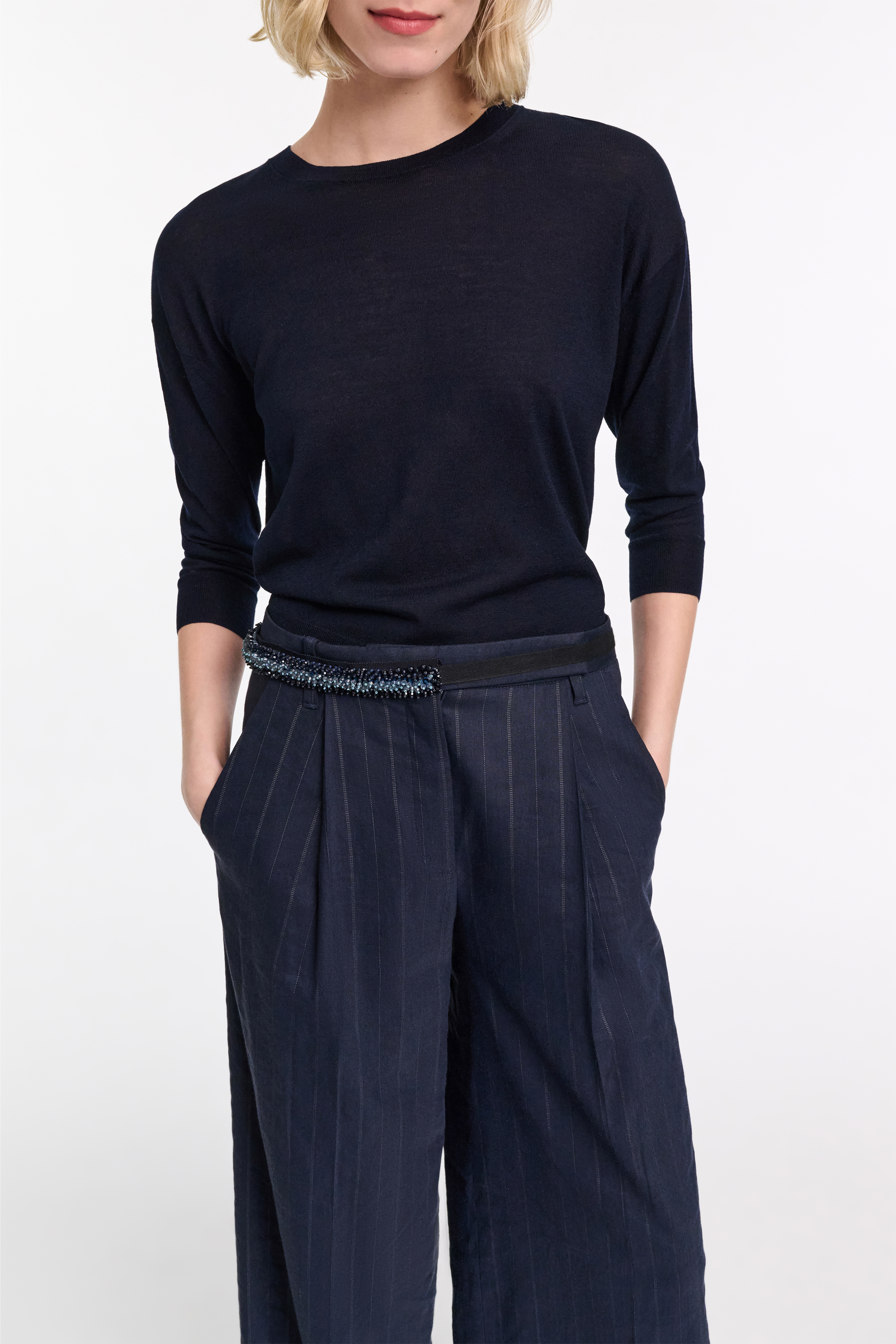 The pullover has a relaxed draped top and 3/4 sleeves.