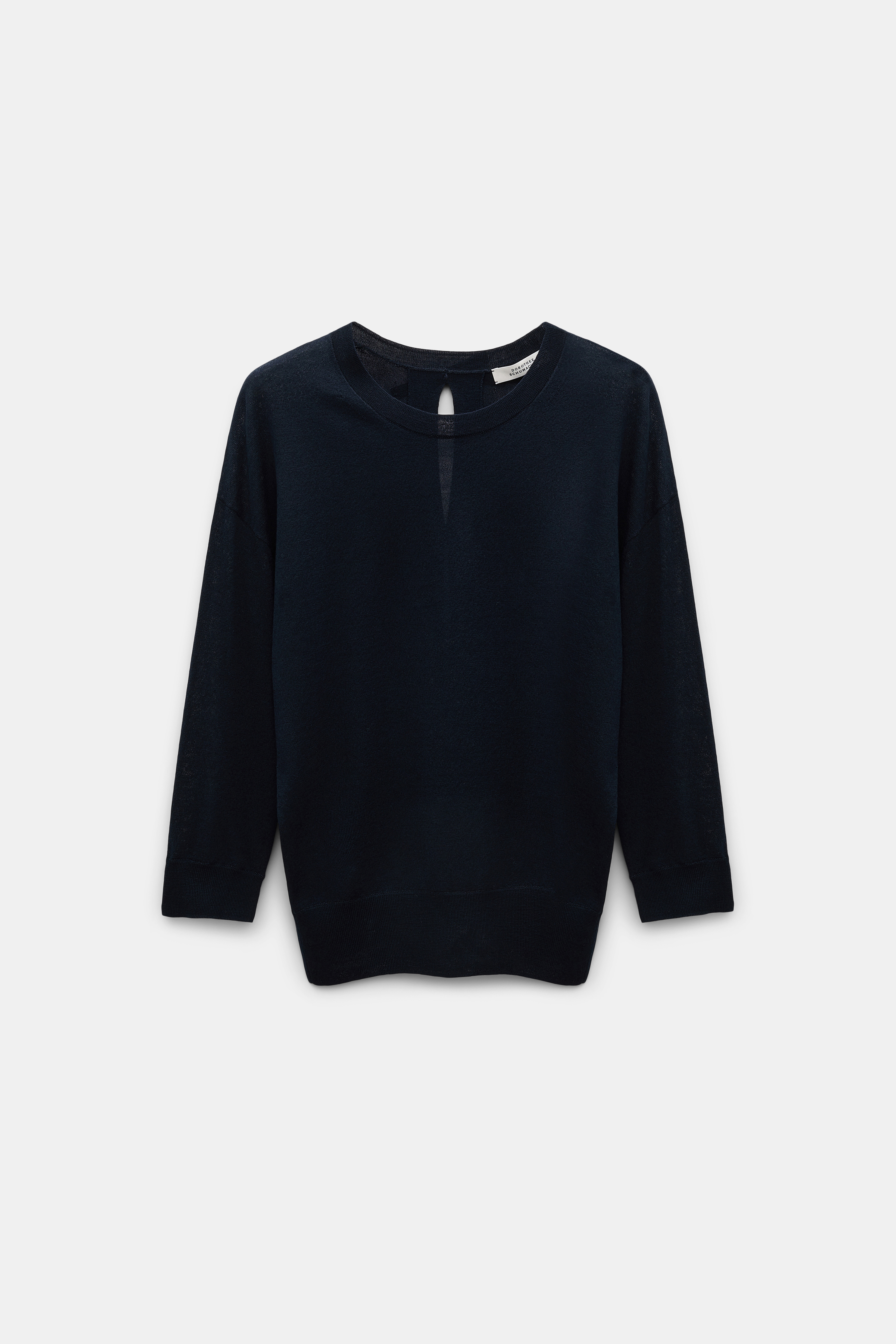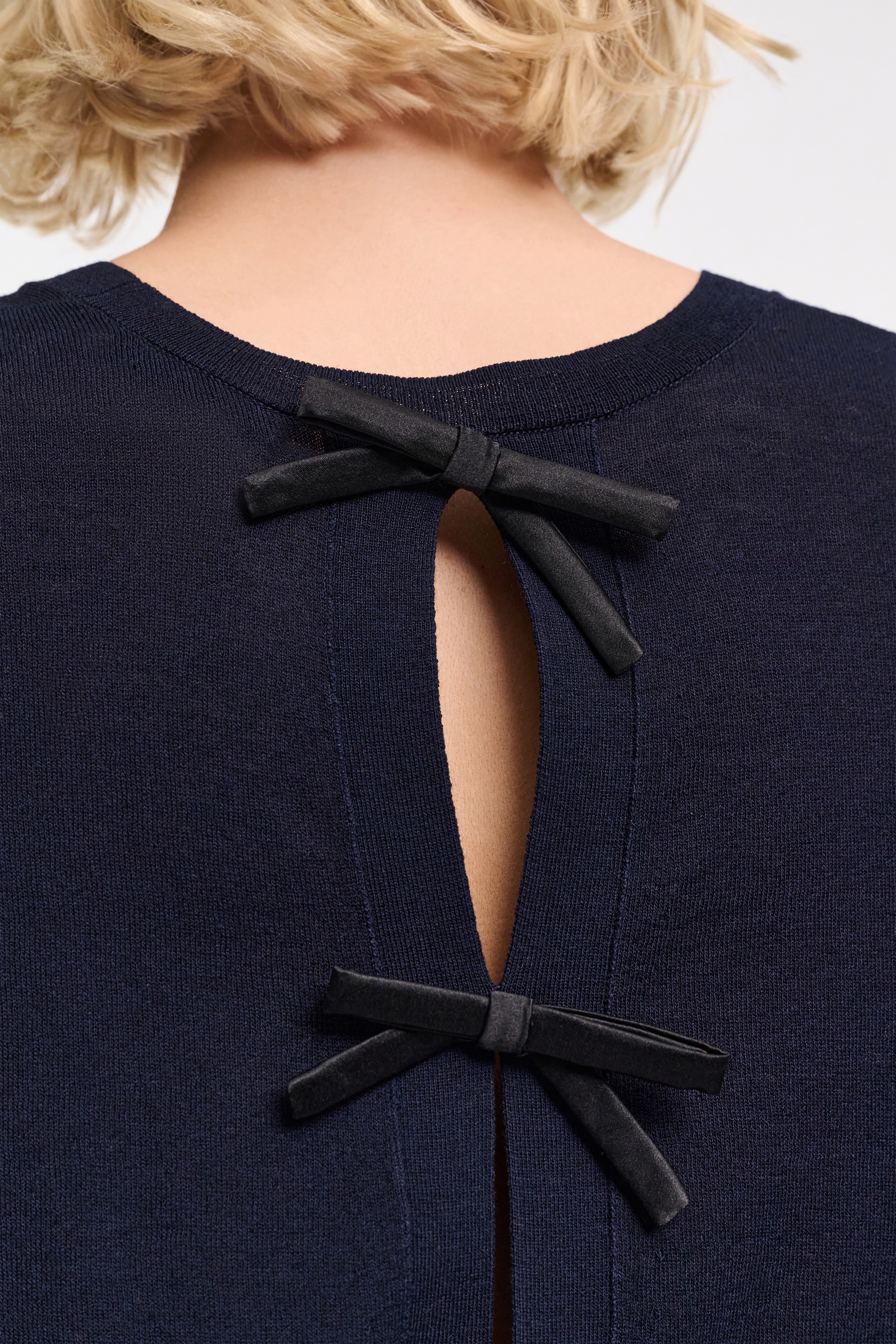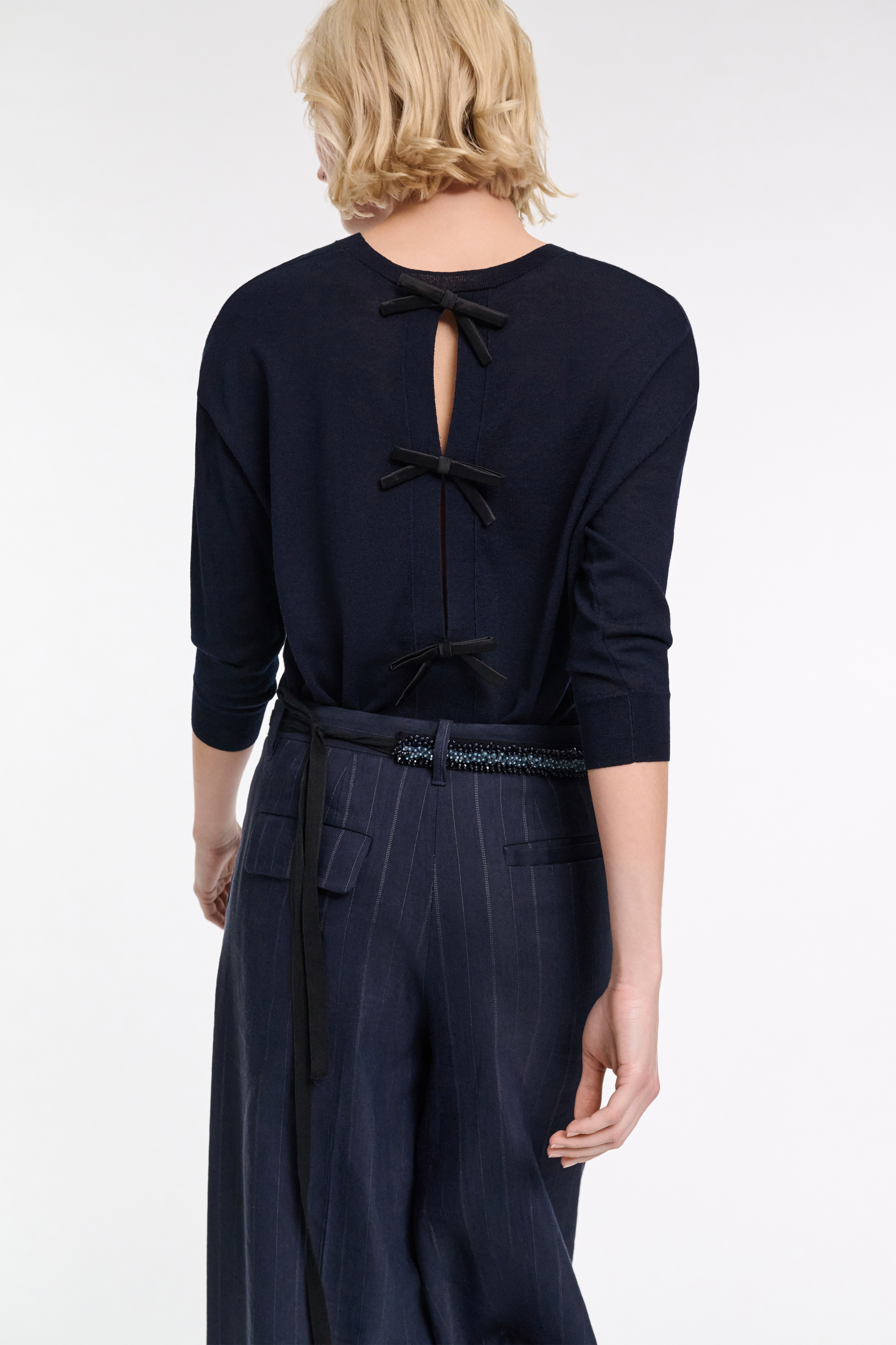 The pullover is made from a soft virgin wool-cotton mix and features a back slit with removable satin bows.