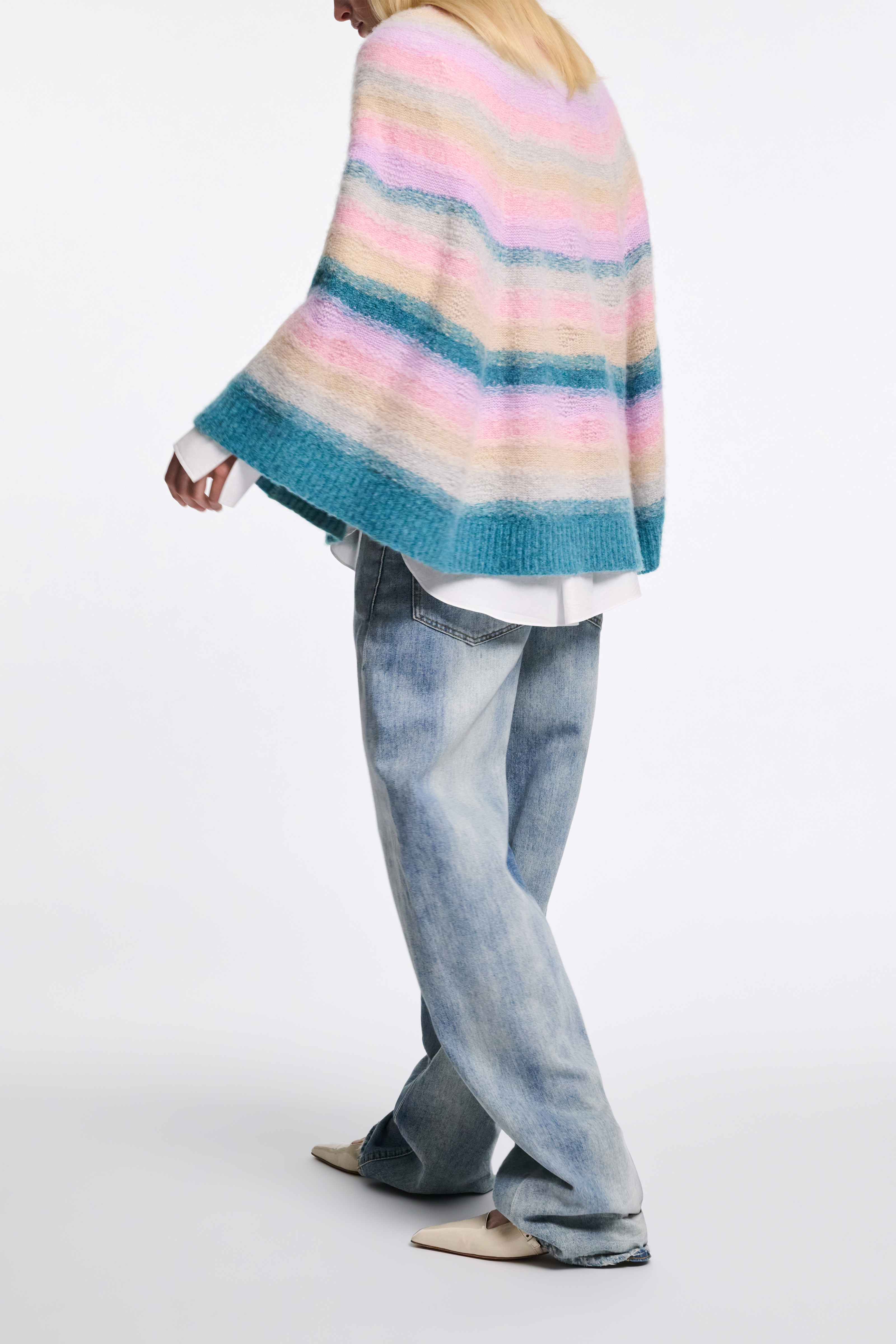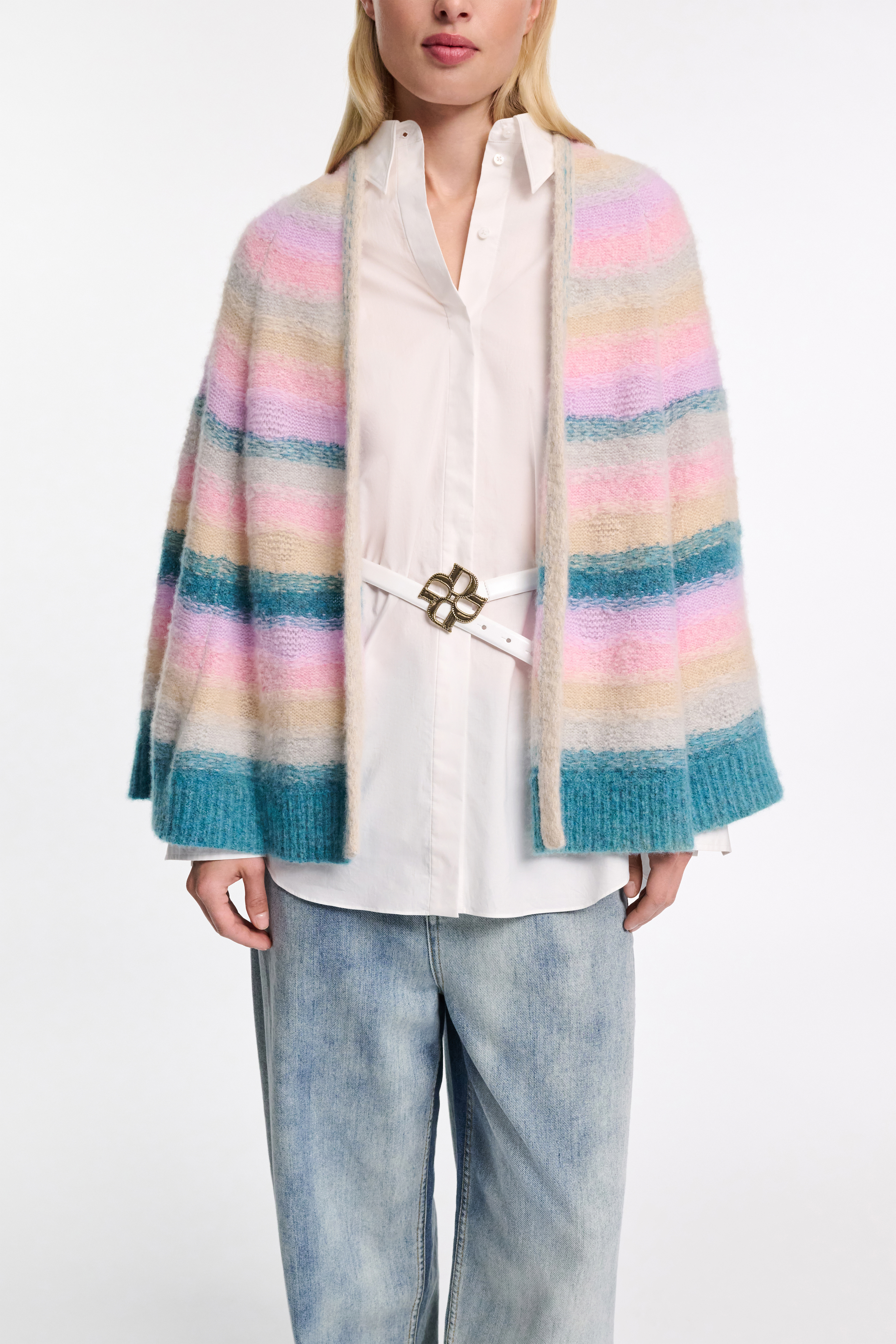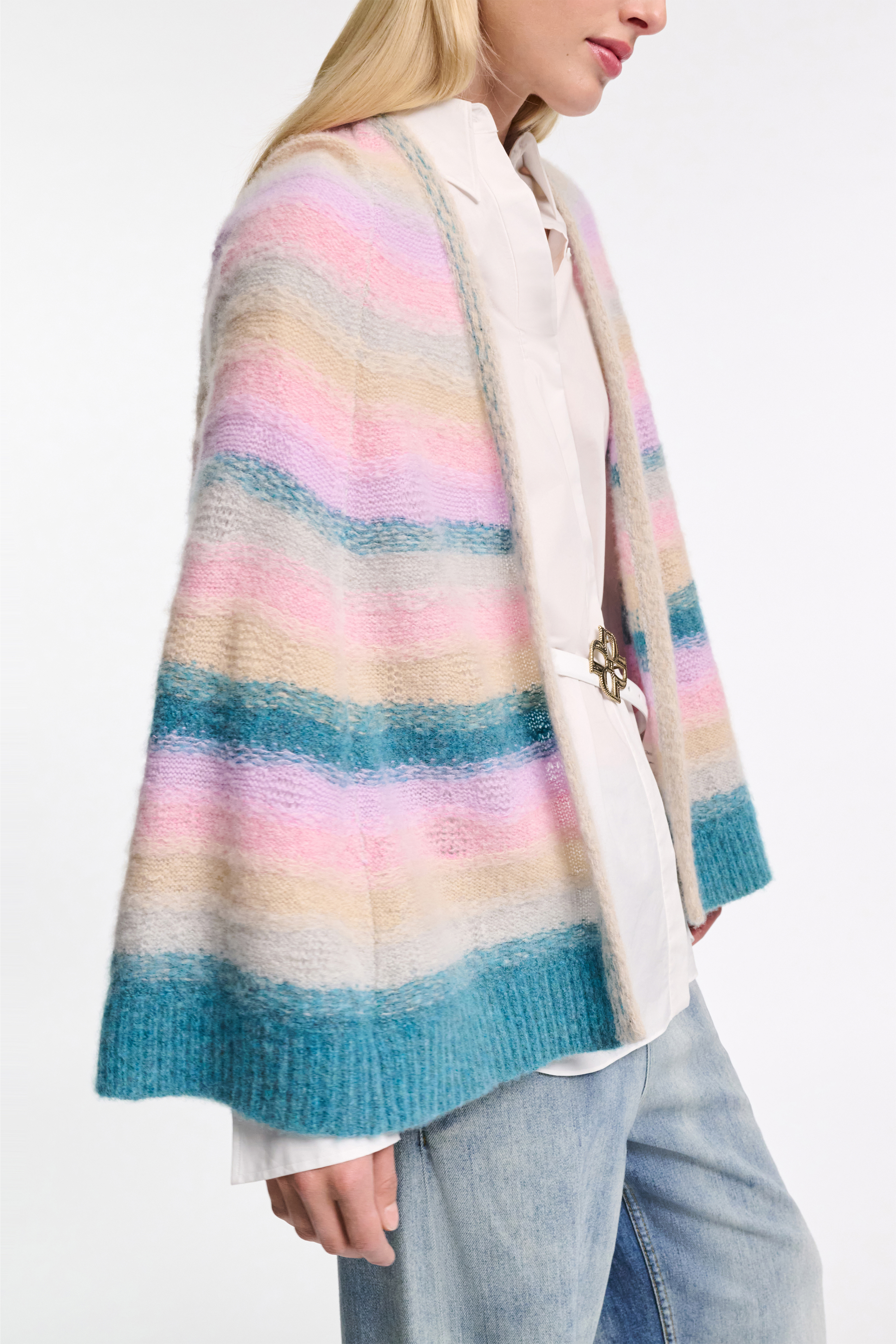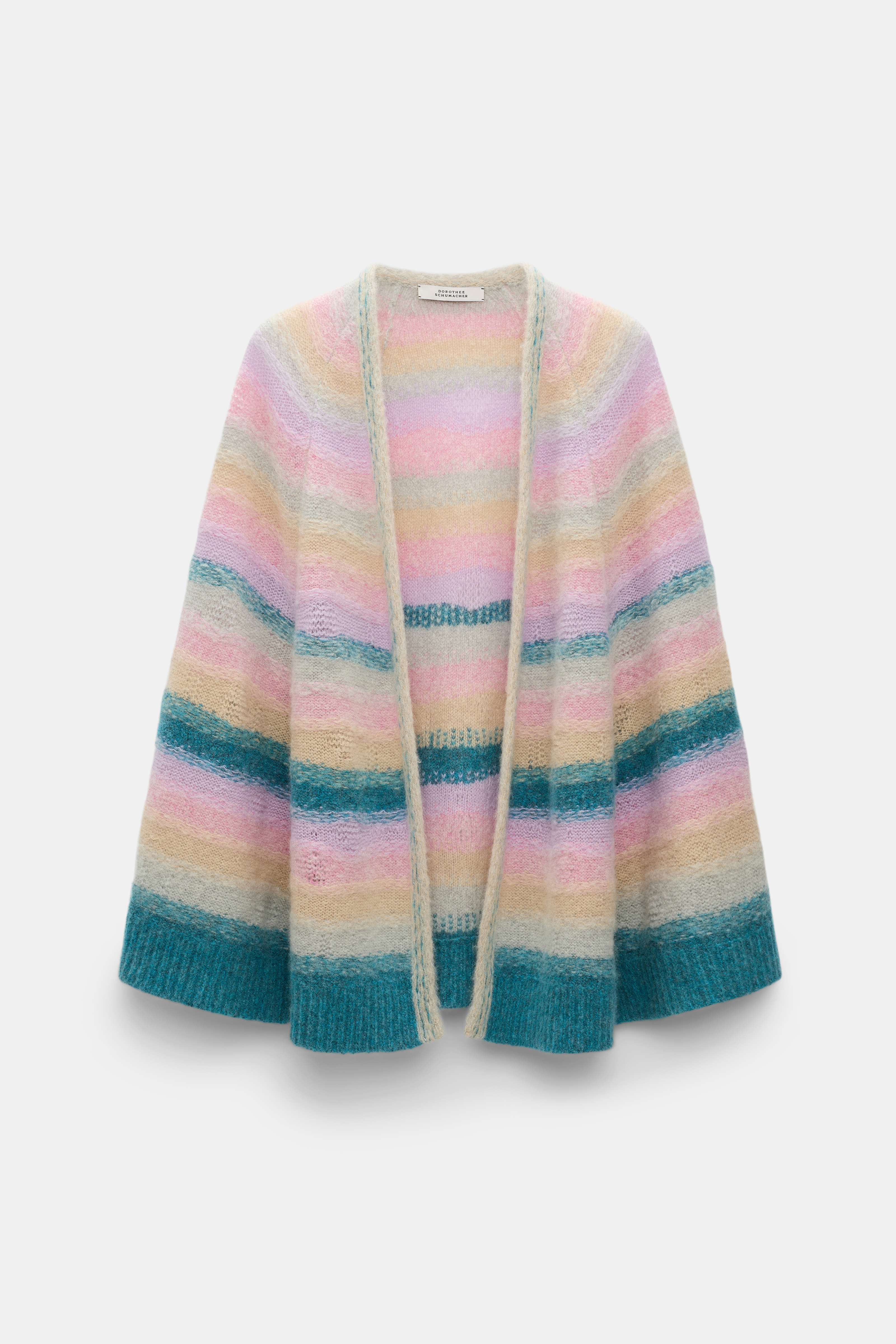 The cape-like cardigan is knit in plush new cashmere yarn and has an open front.