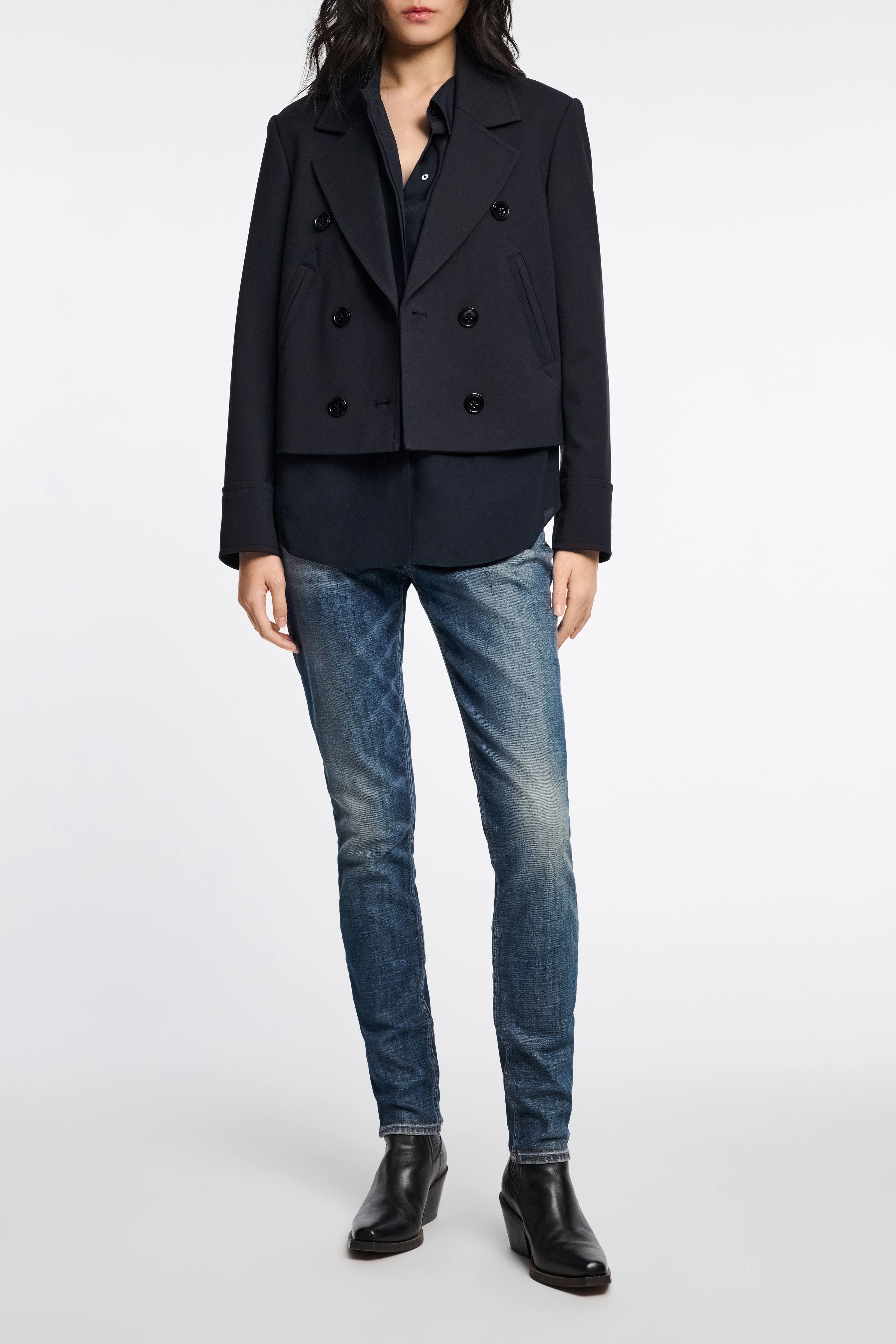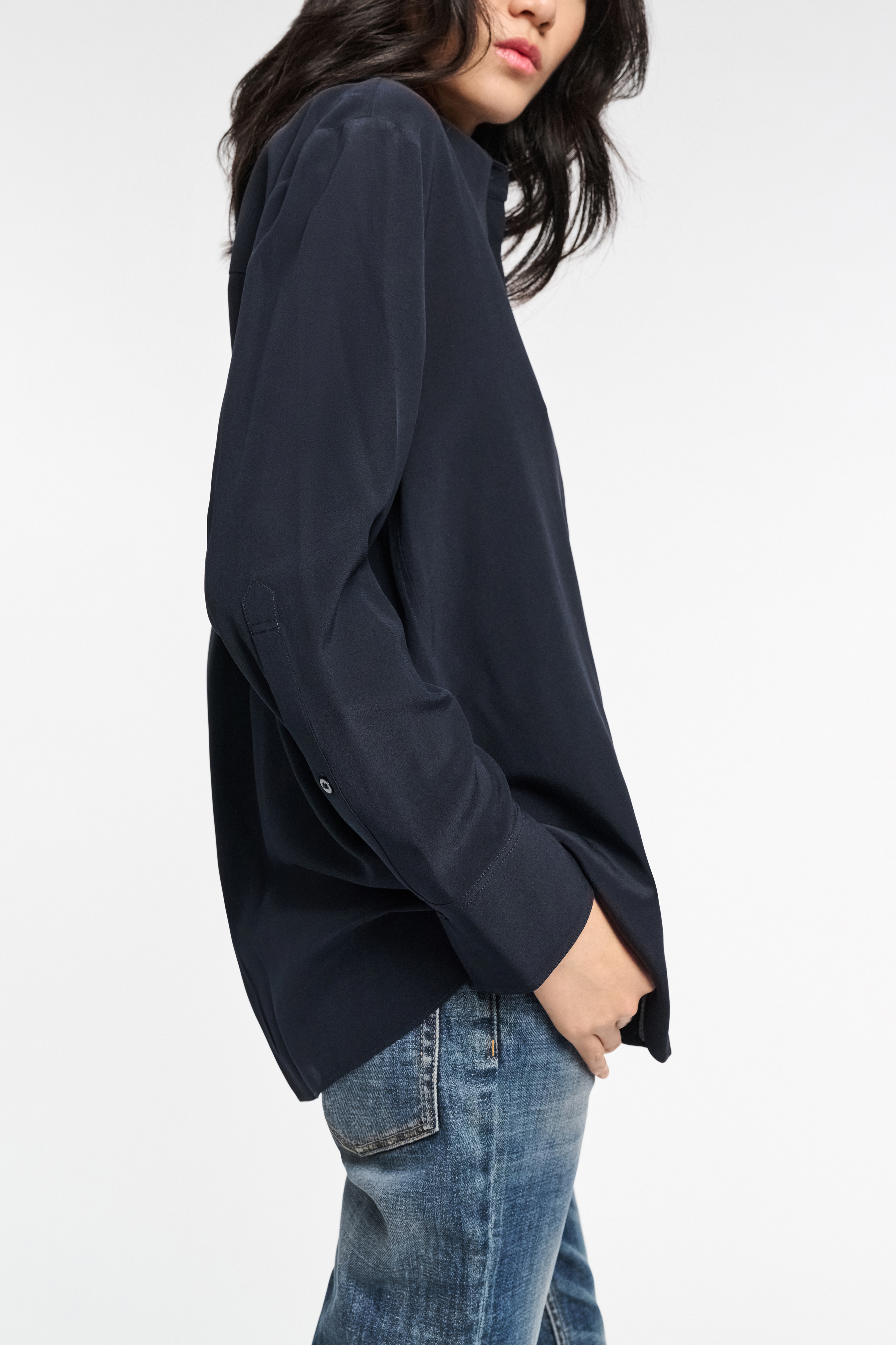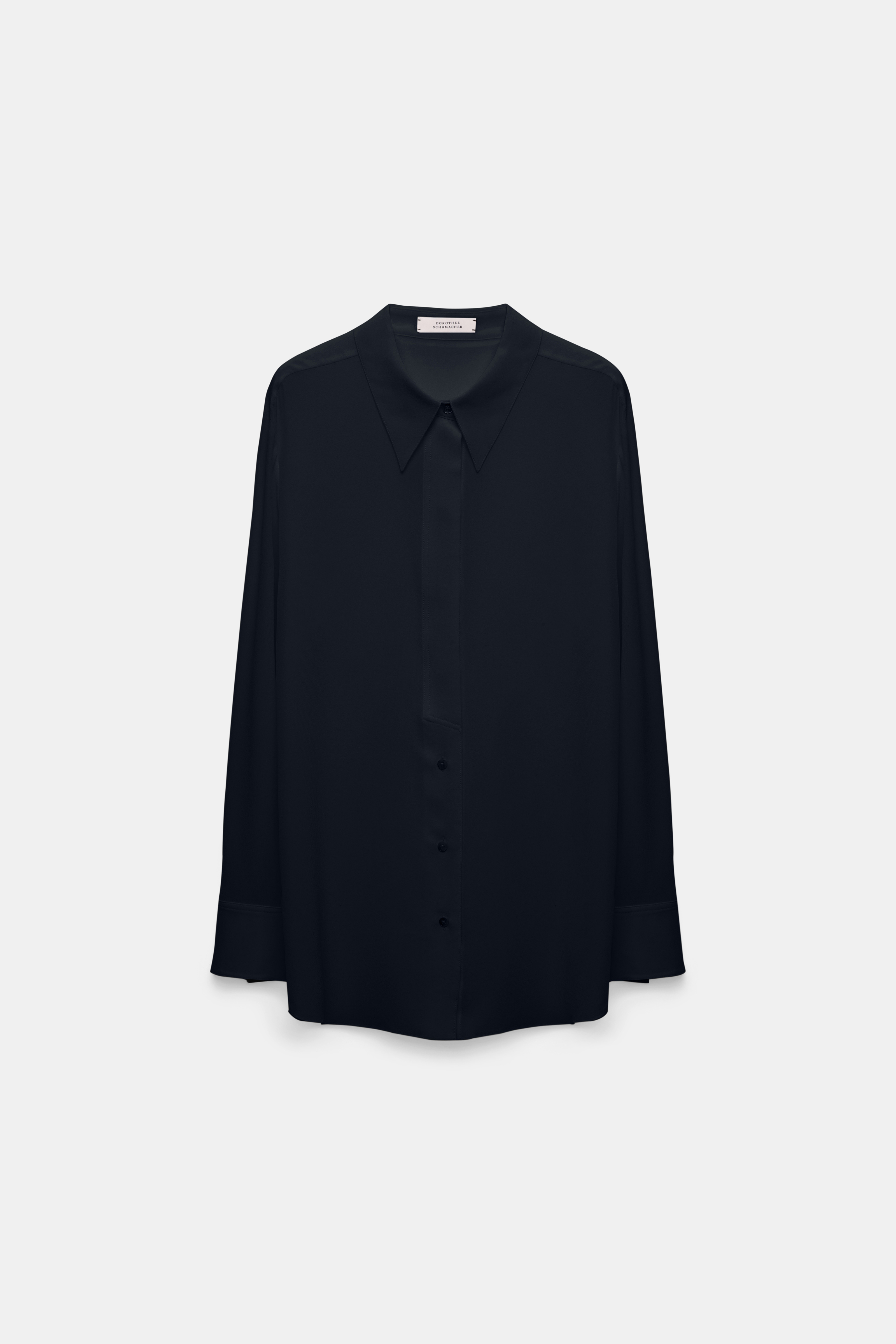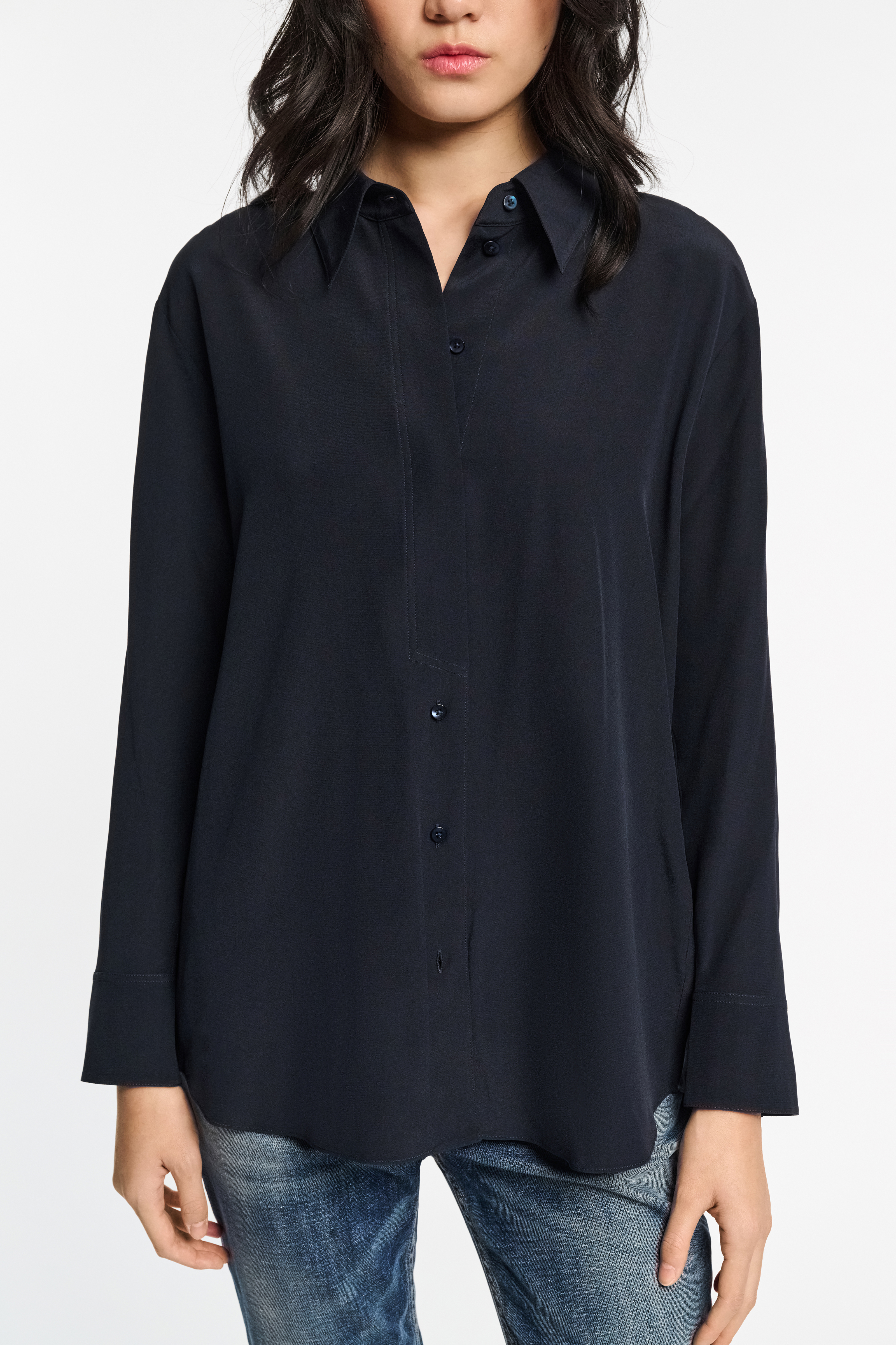 The crêpe de chine silk blouse has an oversized fit and partially concealed button placket.