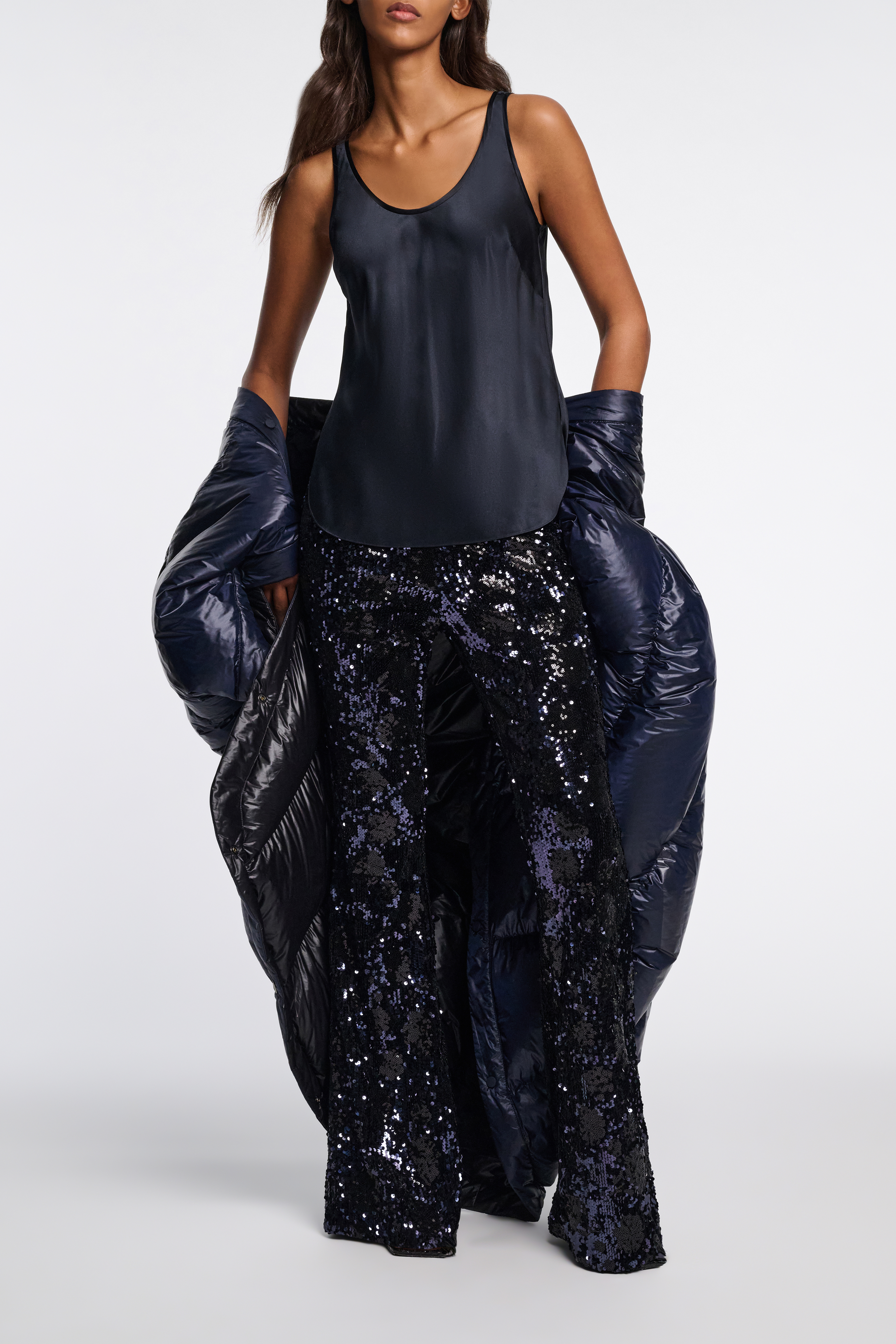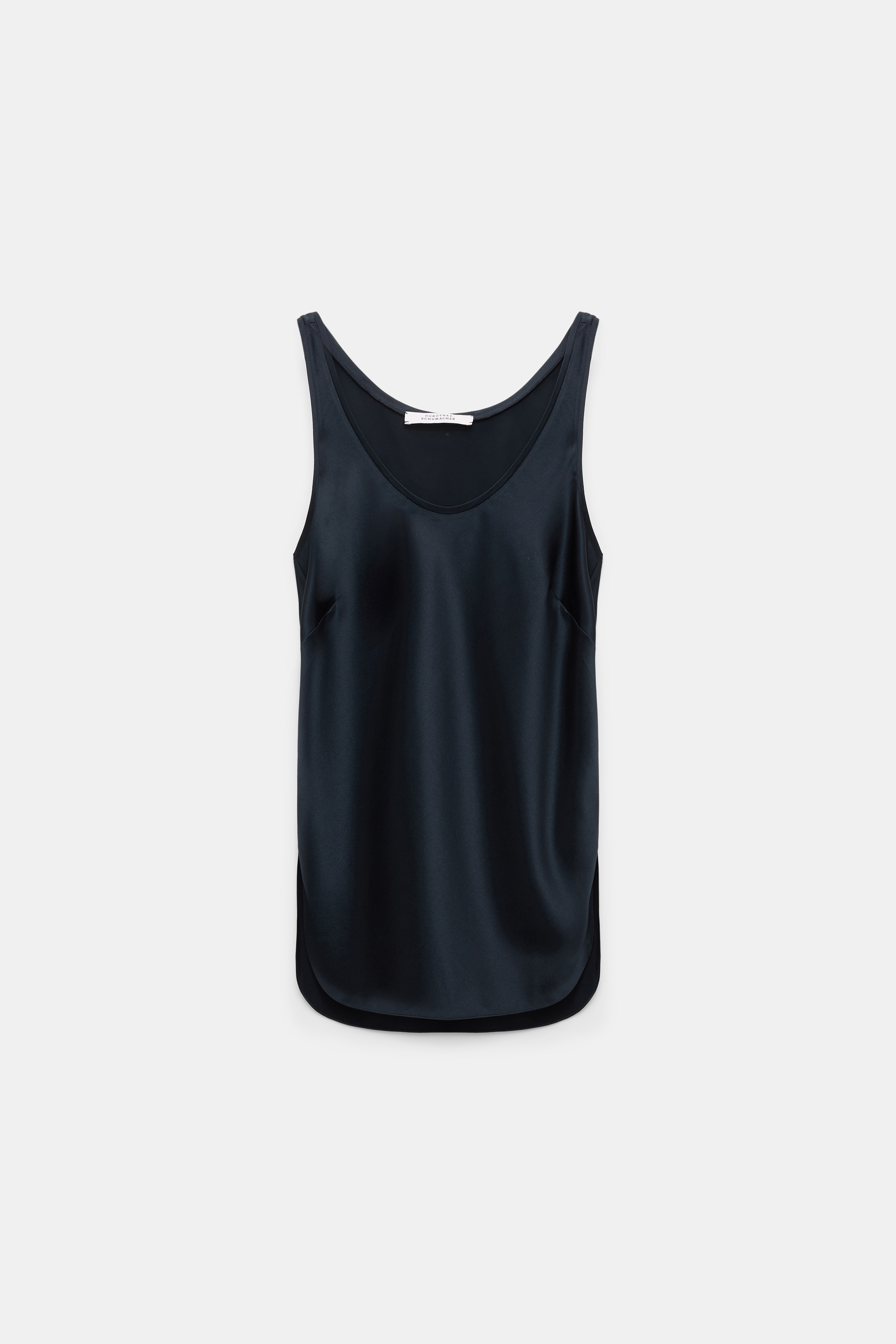 The silk-satin tank top has a soft scoop neckline and flattering bias drape.