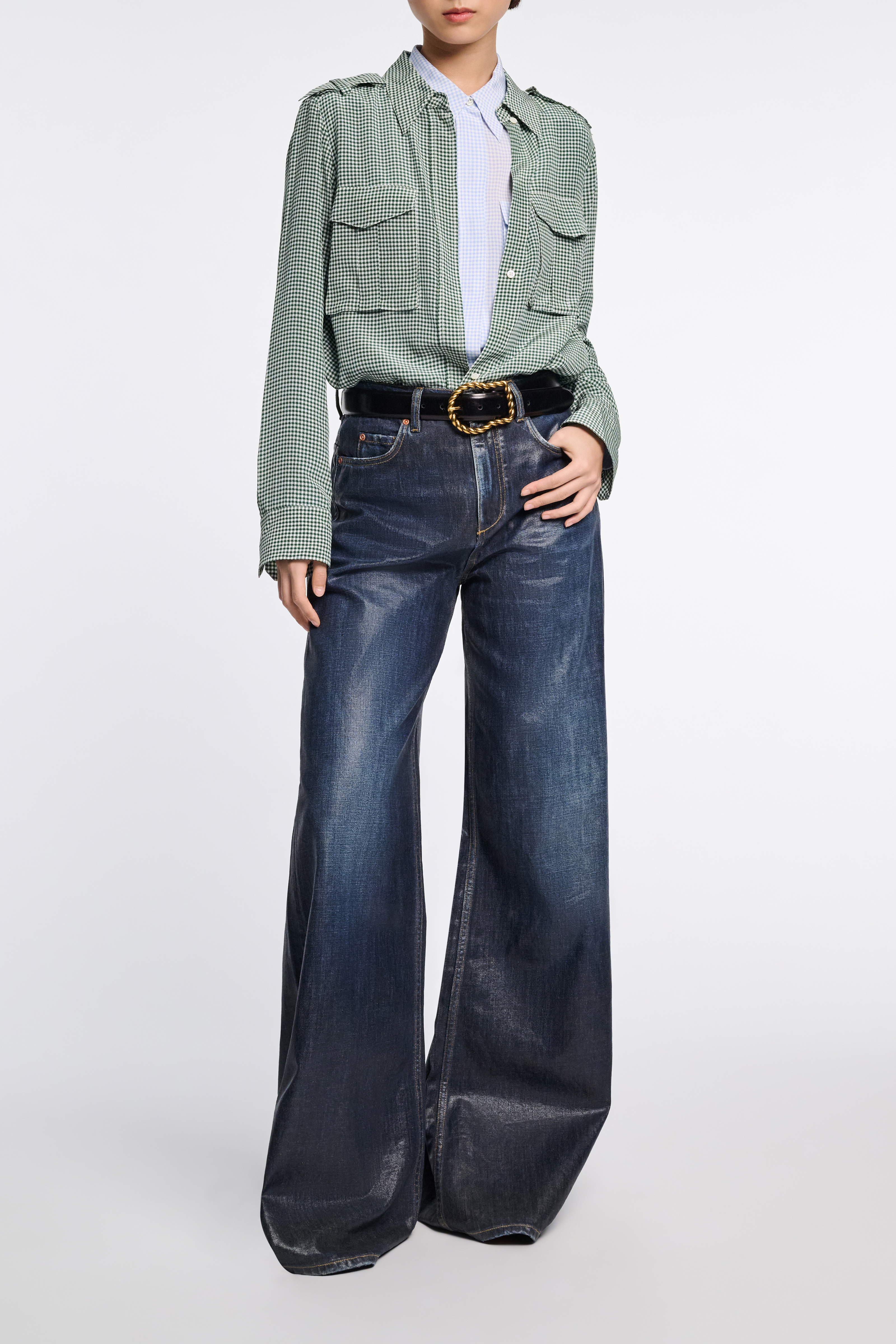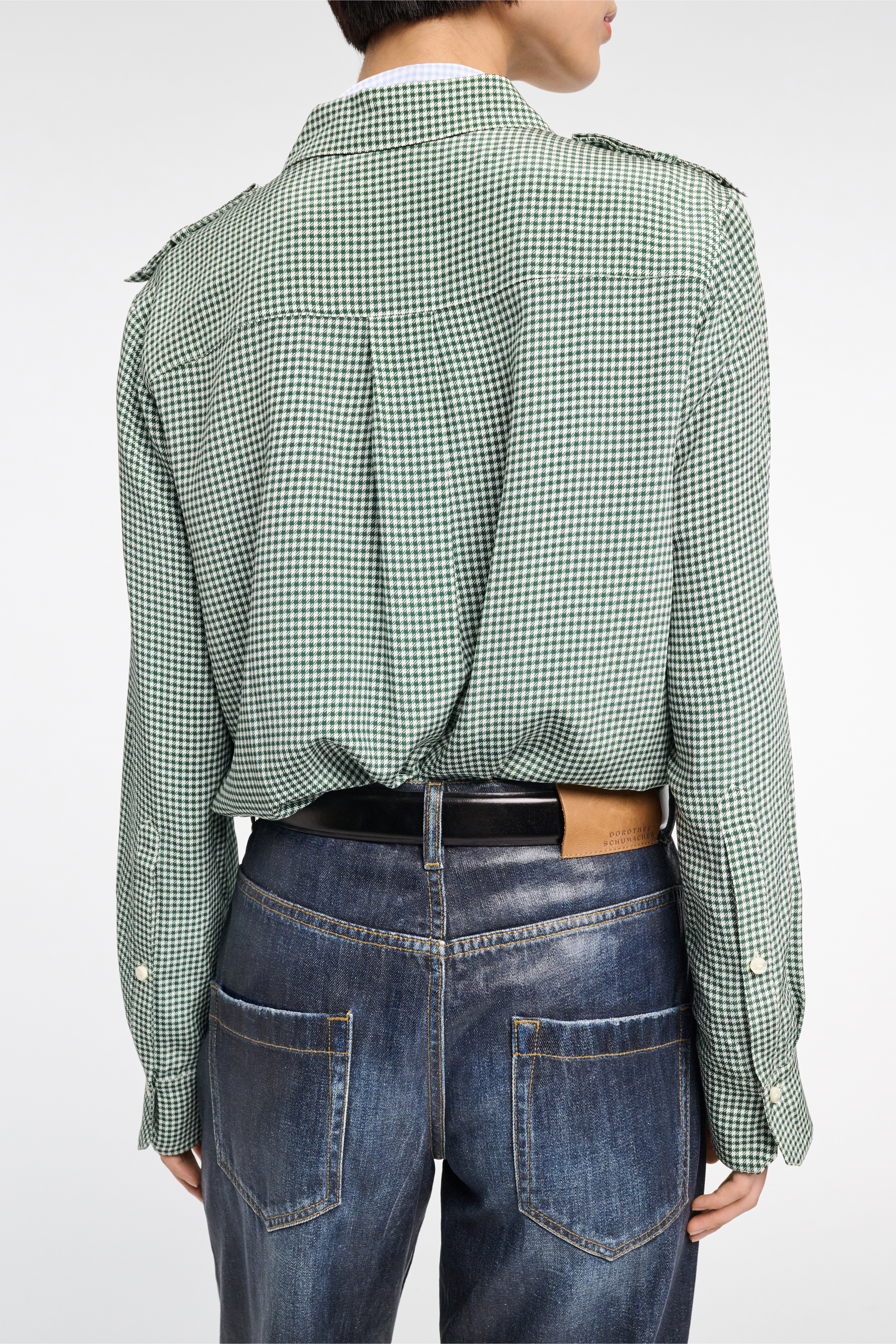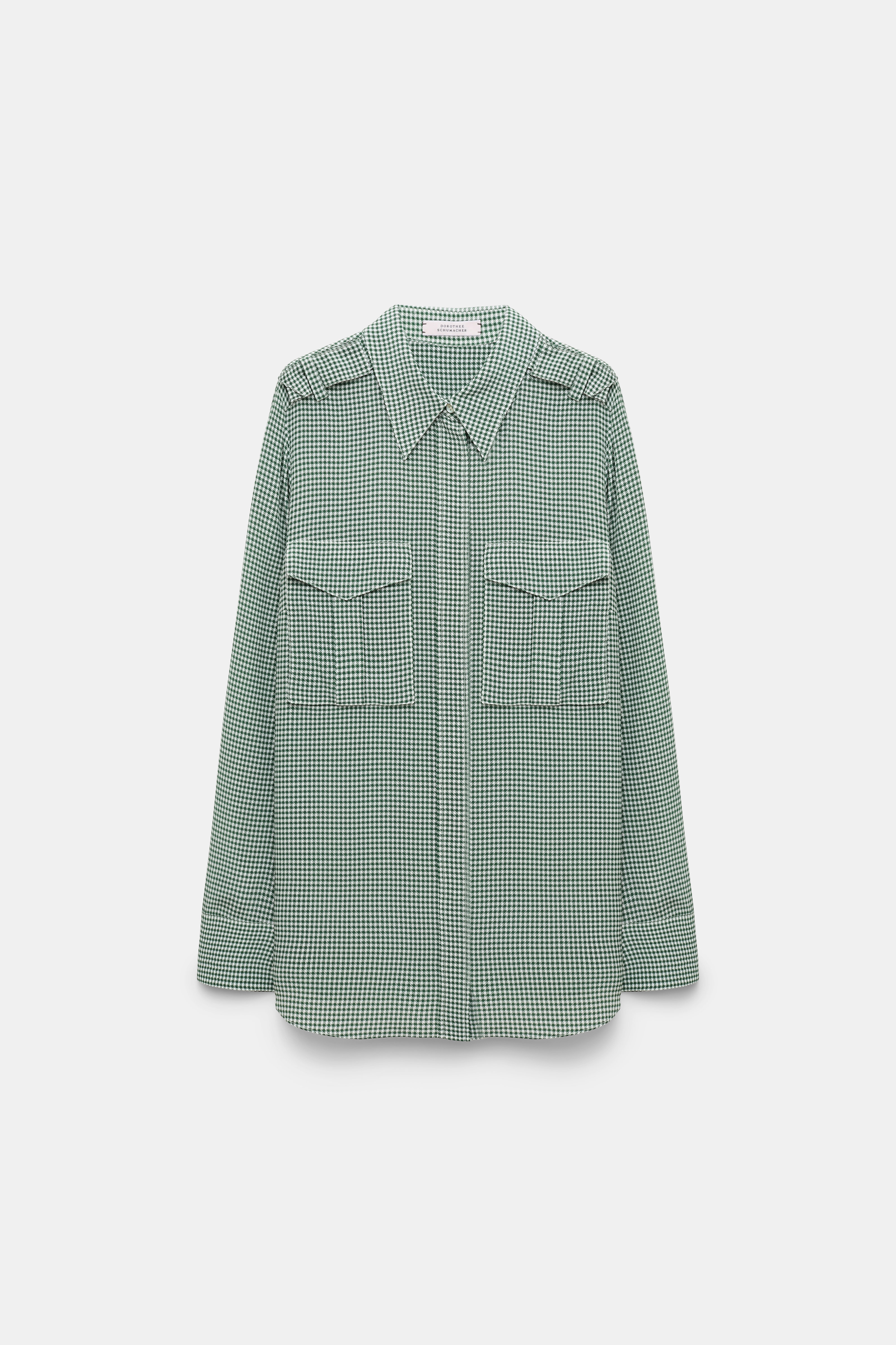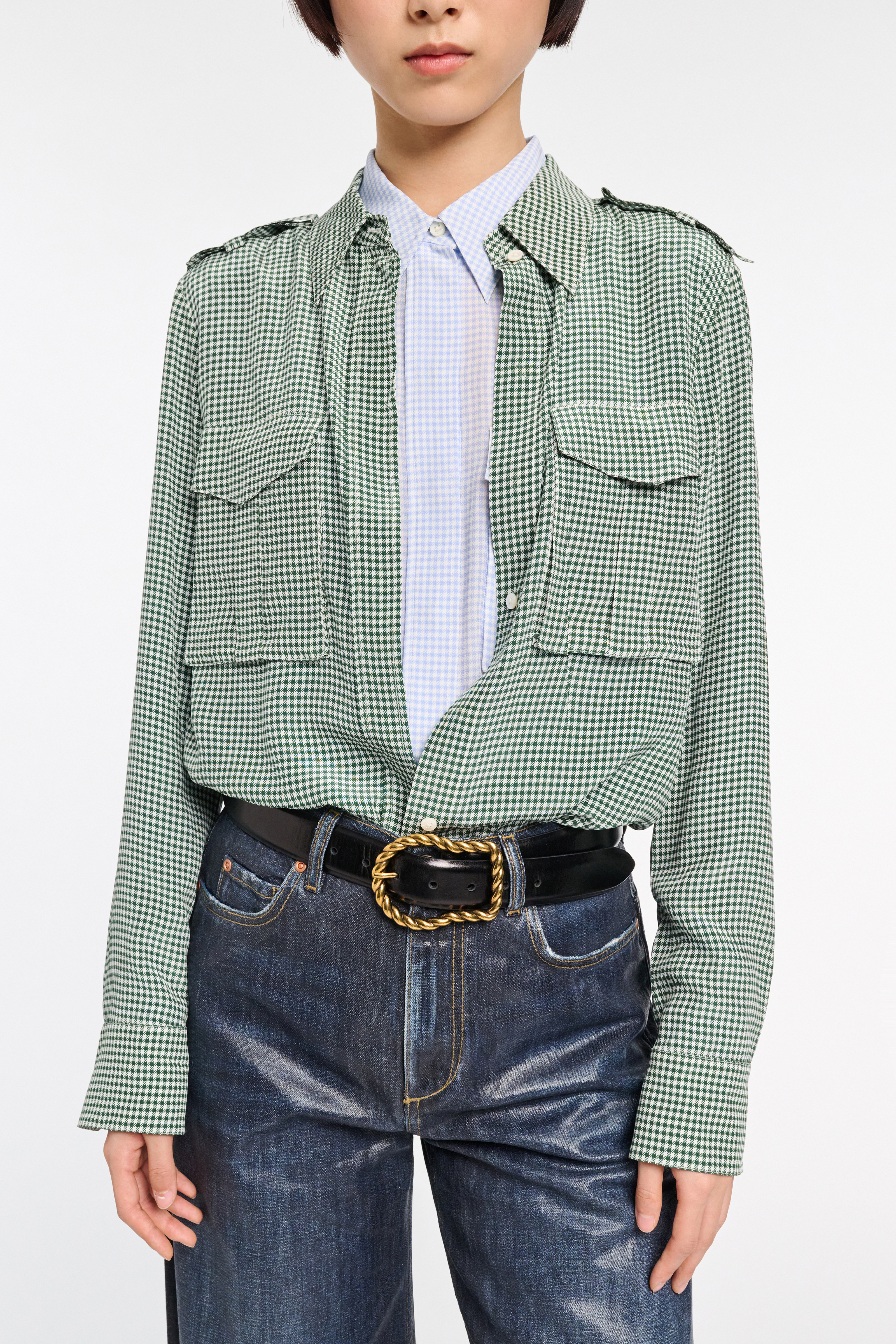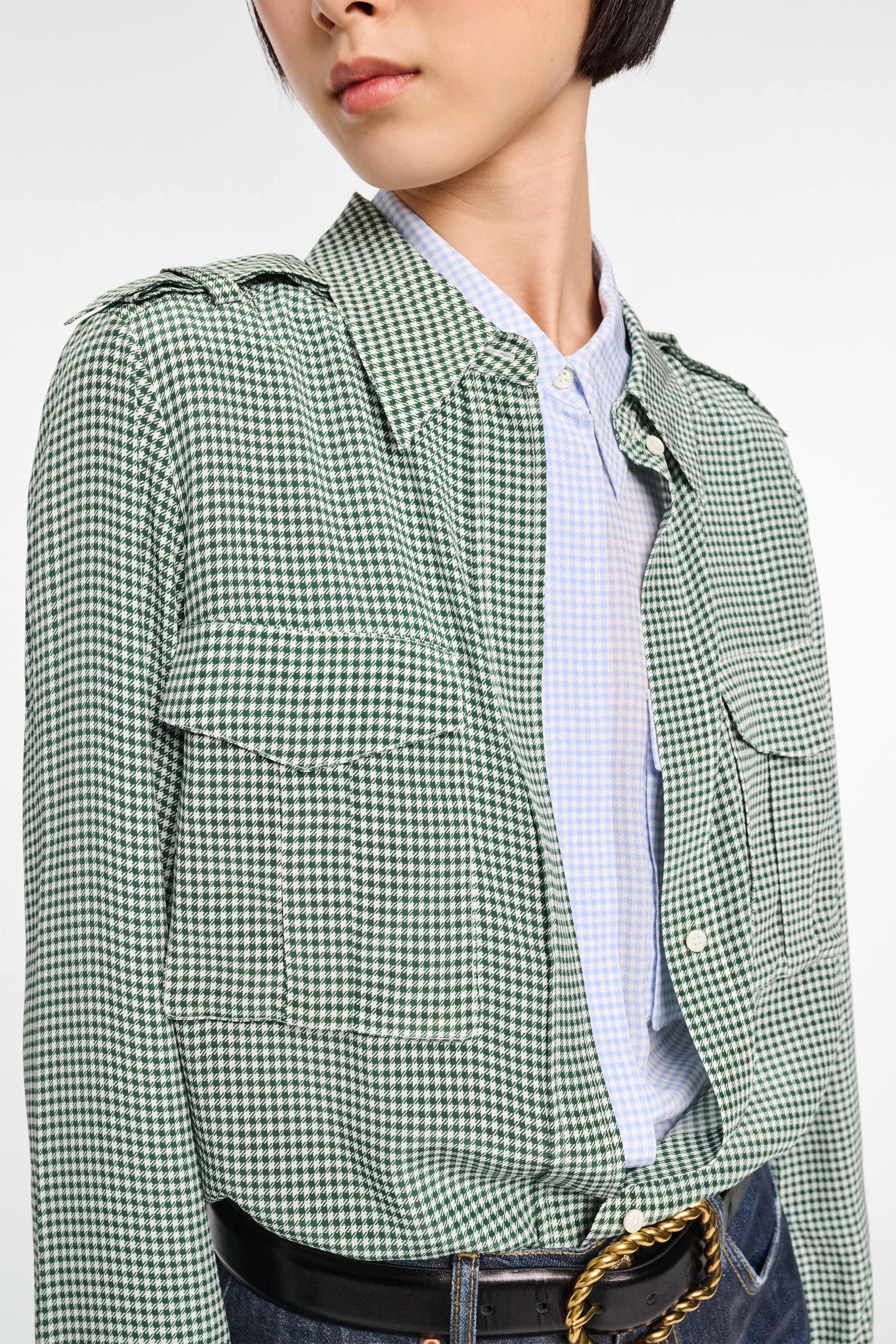 The gingham print silk-viscose blouse has flap patch pockets and neat epaulettes on the shoulders.