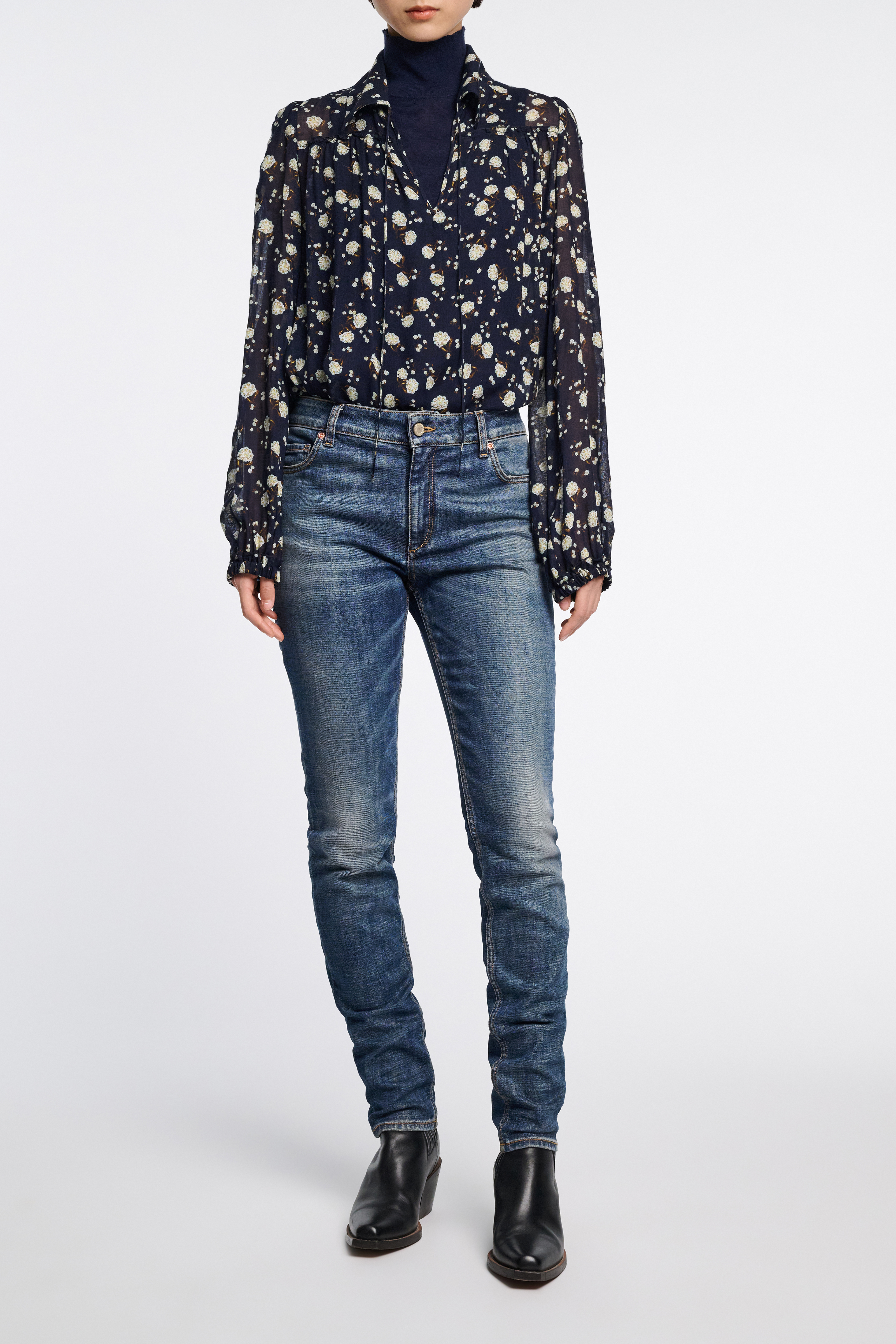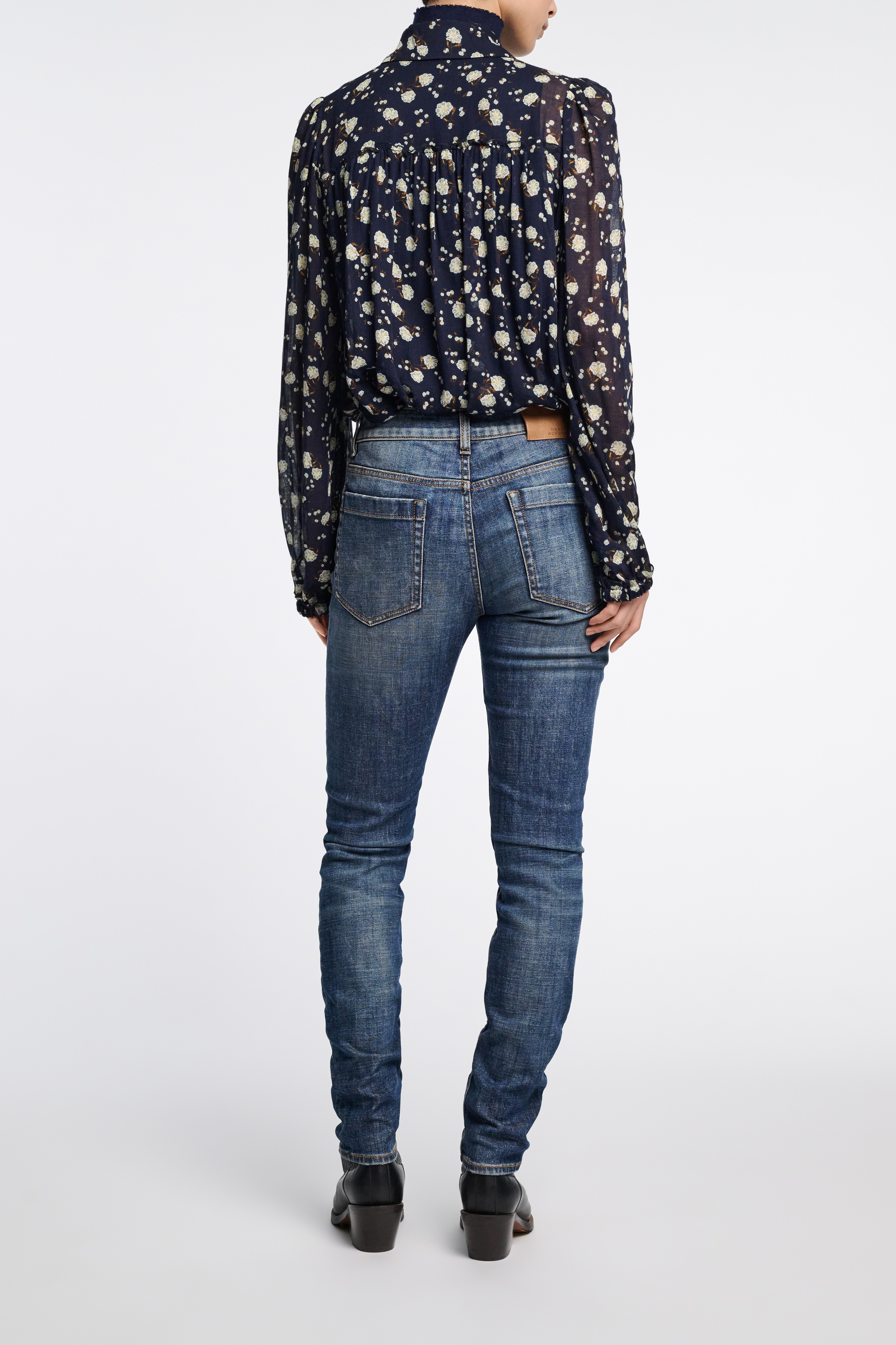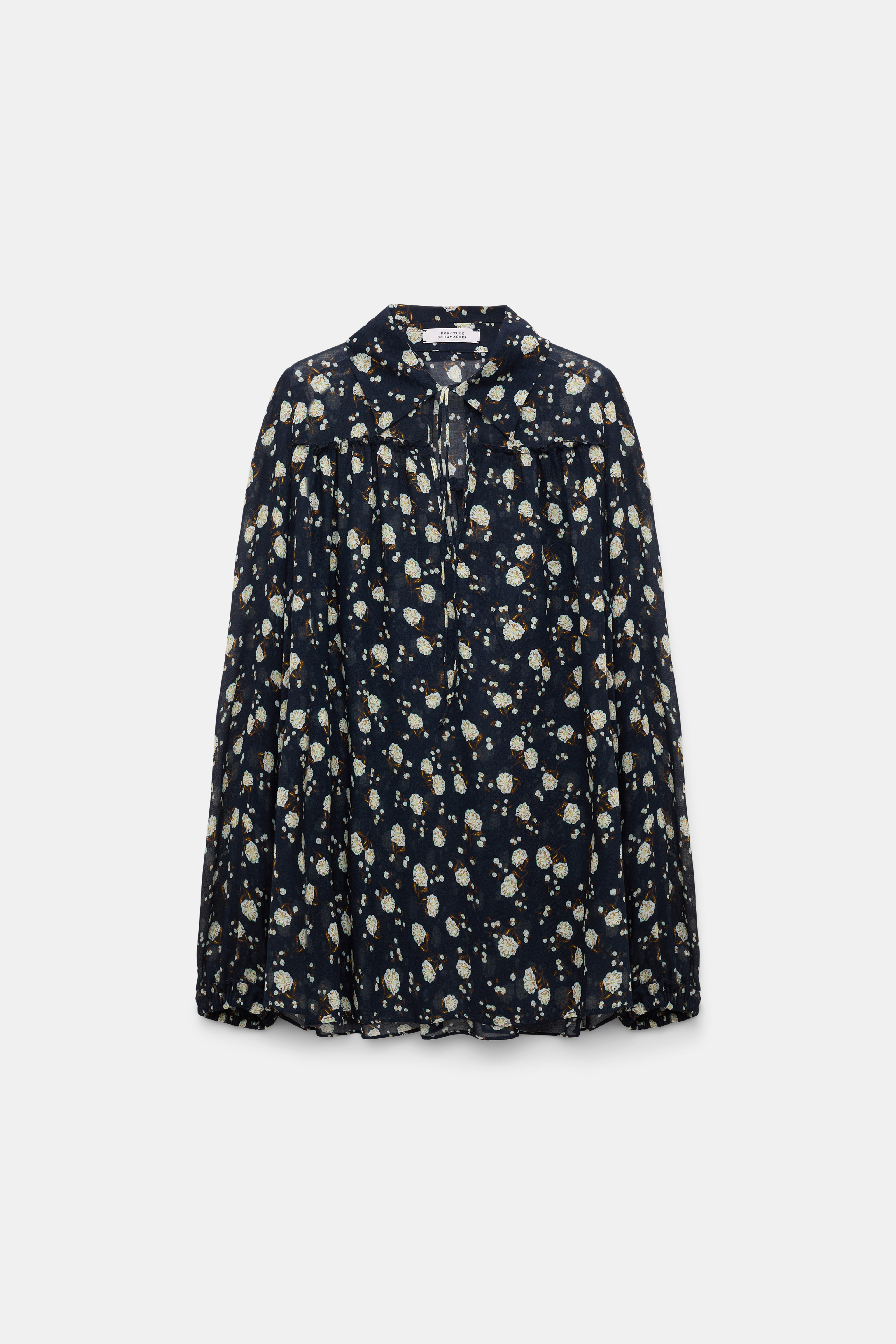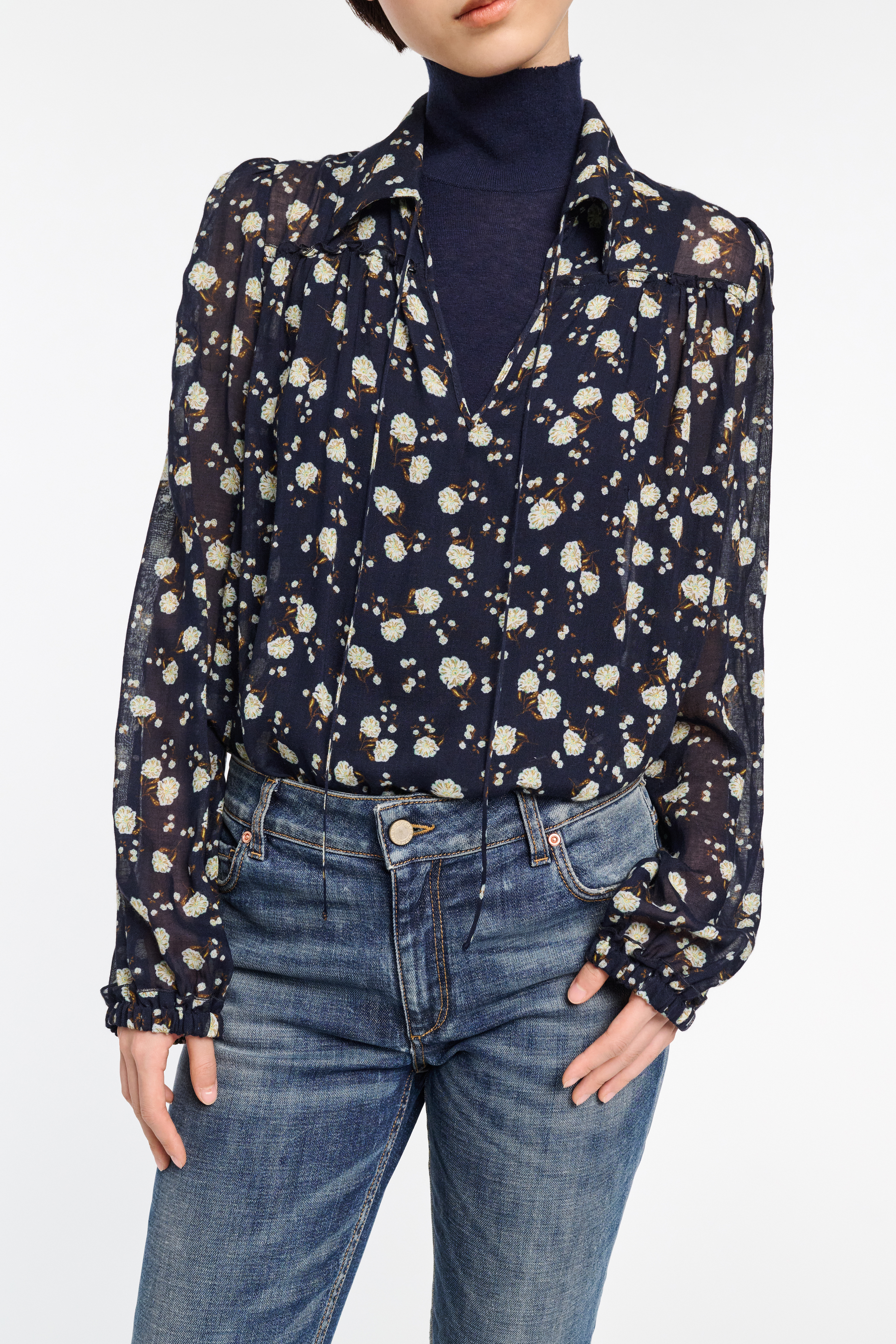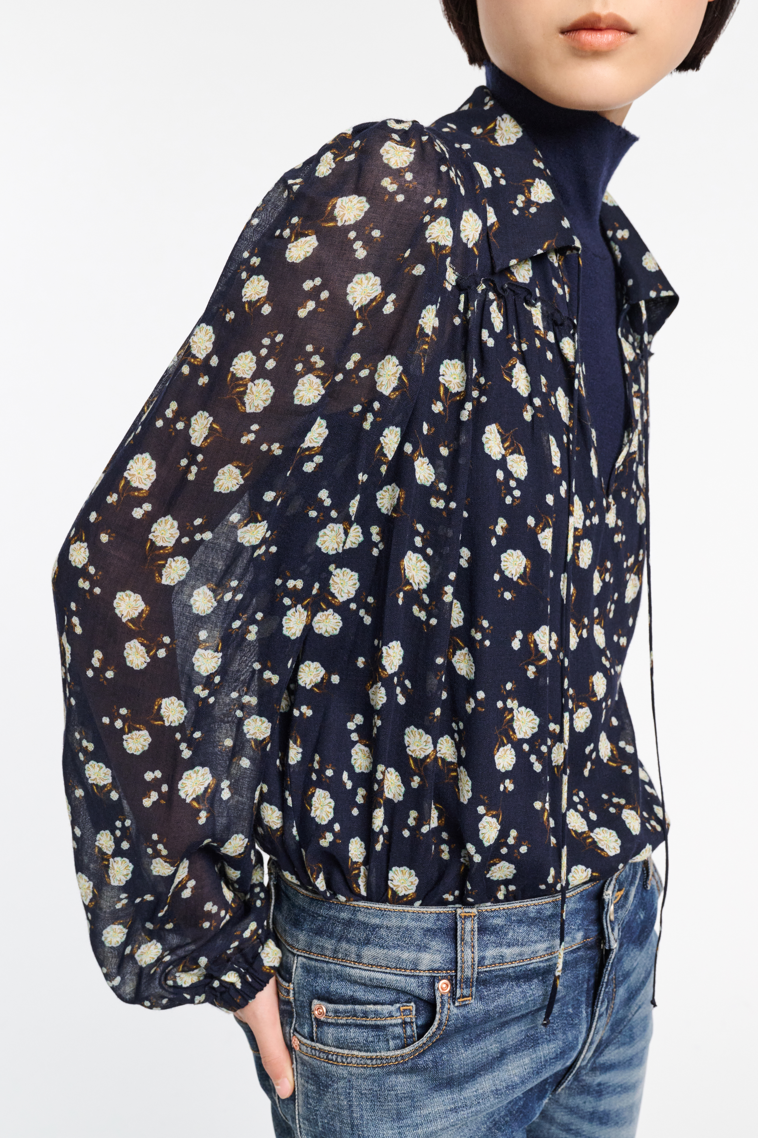 The printed gauze blouse is covered with a micro floral print and has a delicate tie collar.
