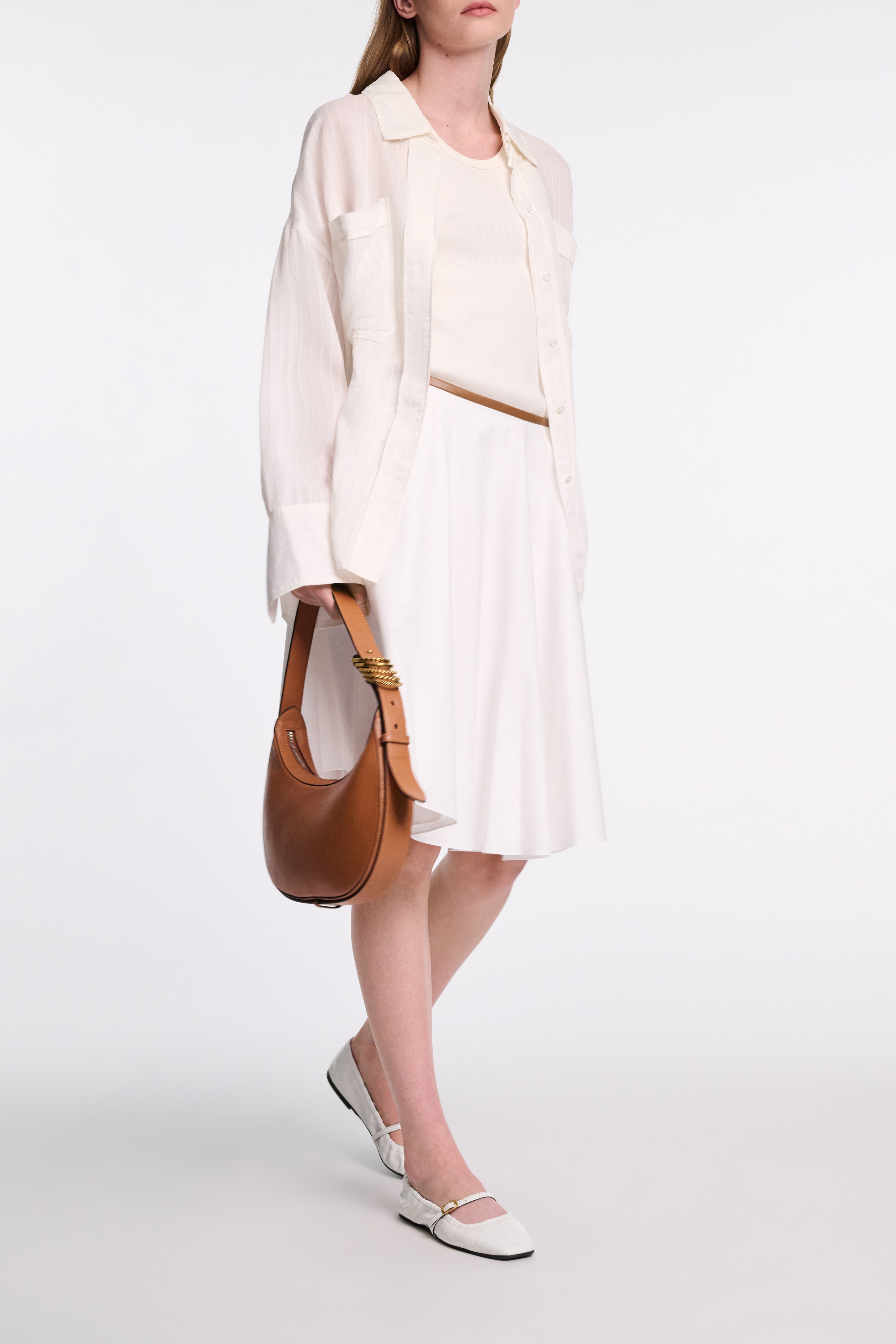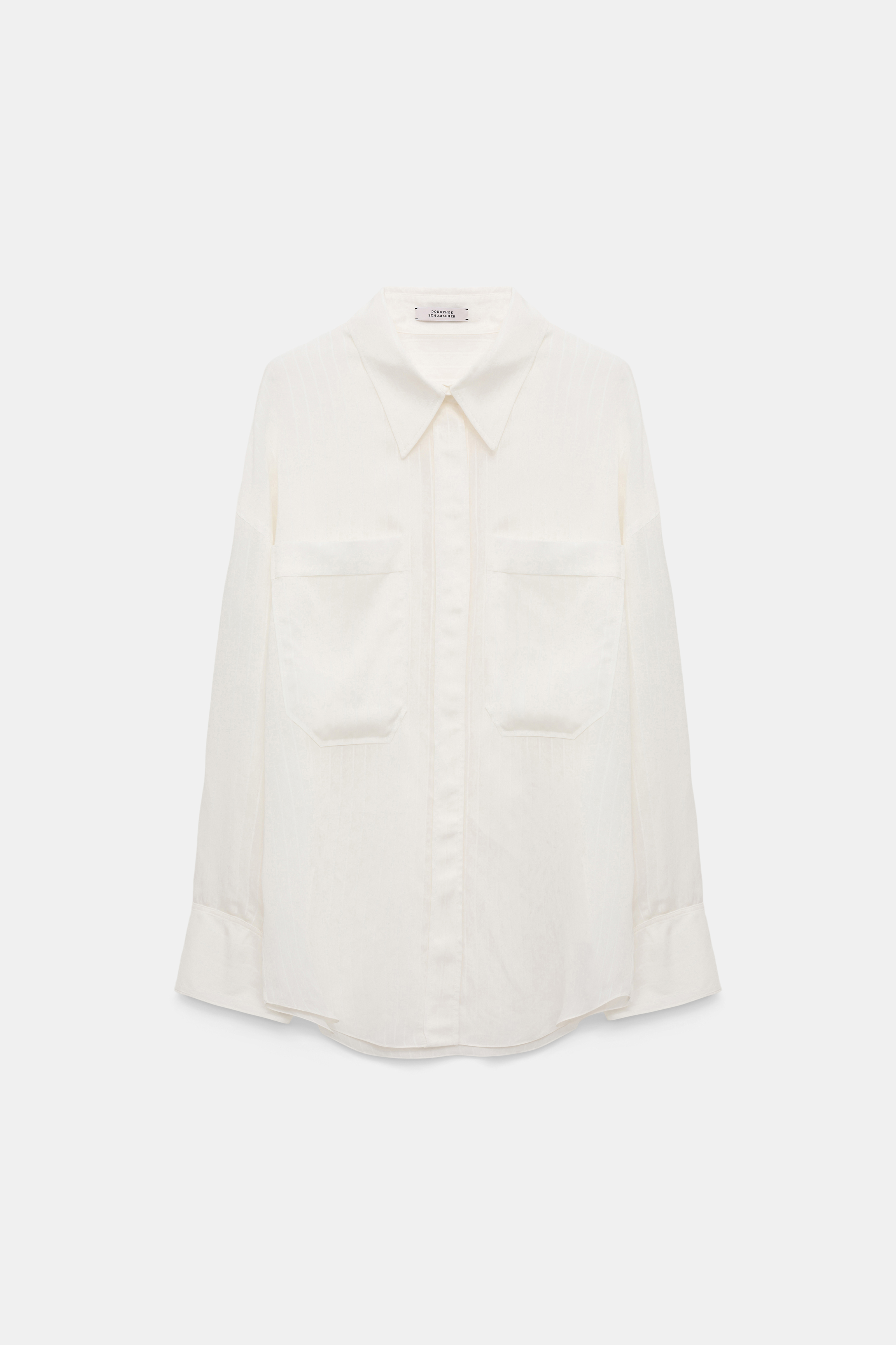 The shirt is made from silk-viscose and has an oversized silhouette.