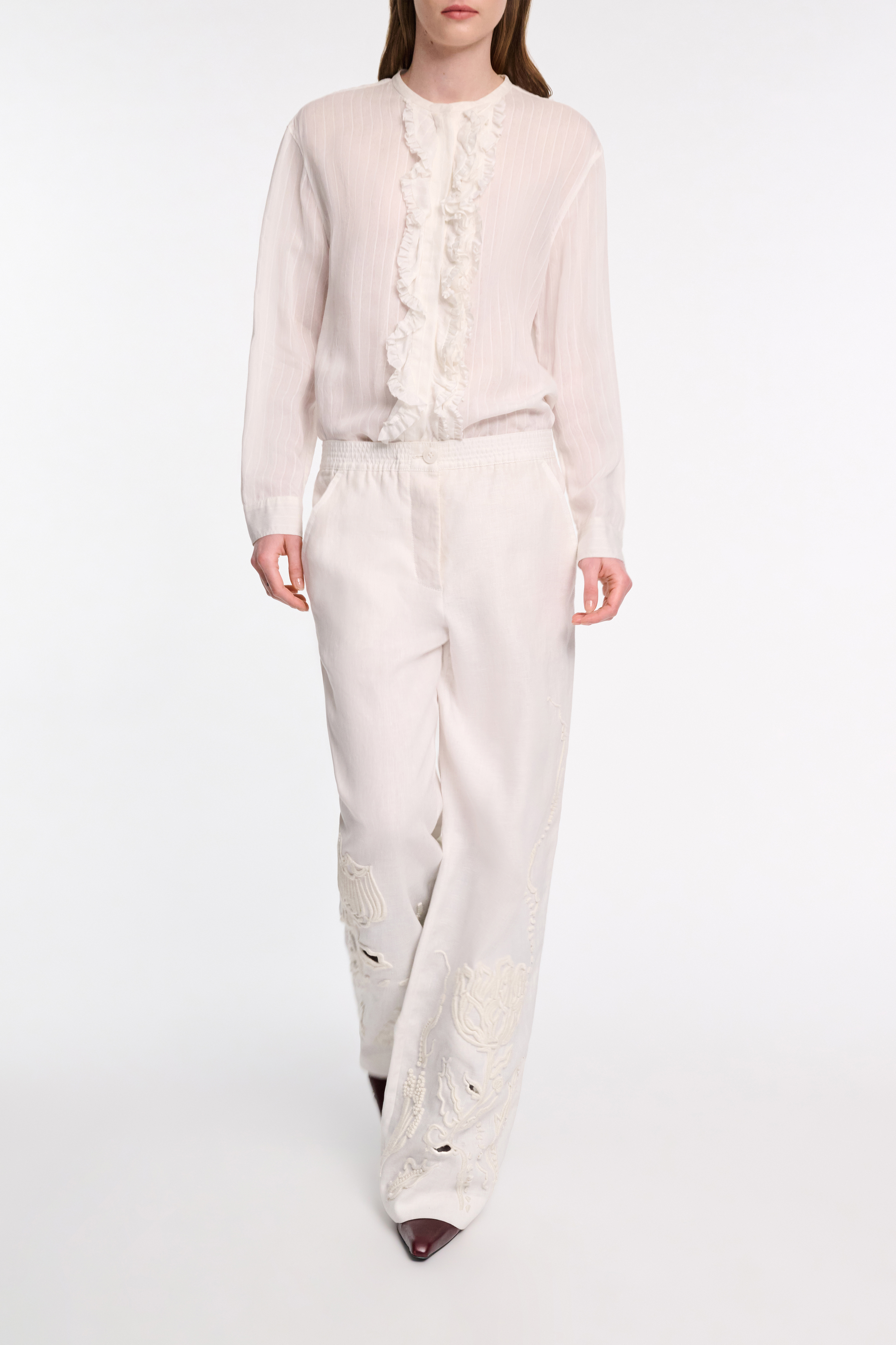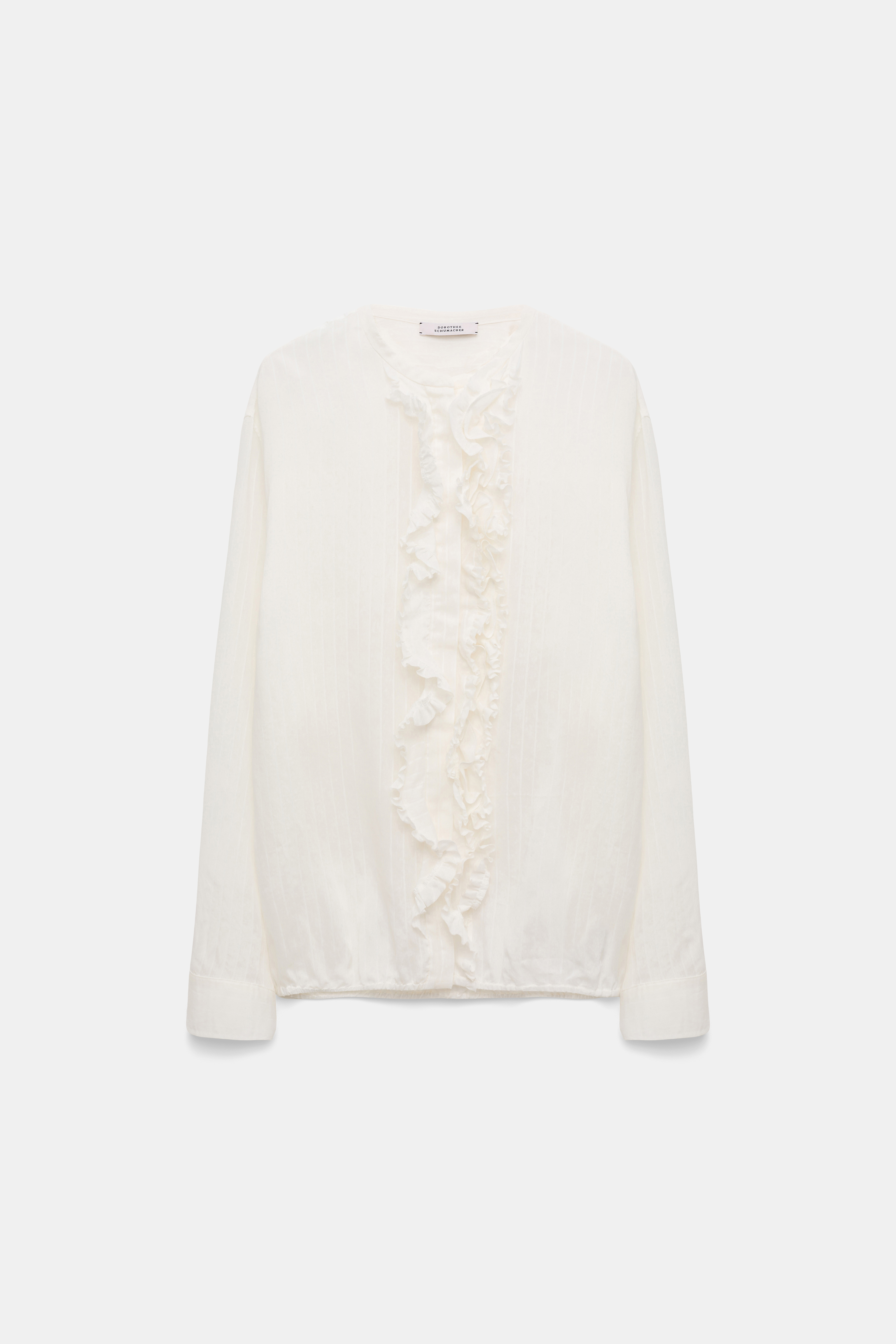 The blouse is made from silk-viscose and has asymmetric ruffle trim on the front.