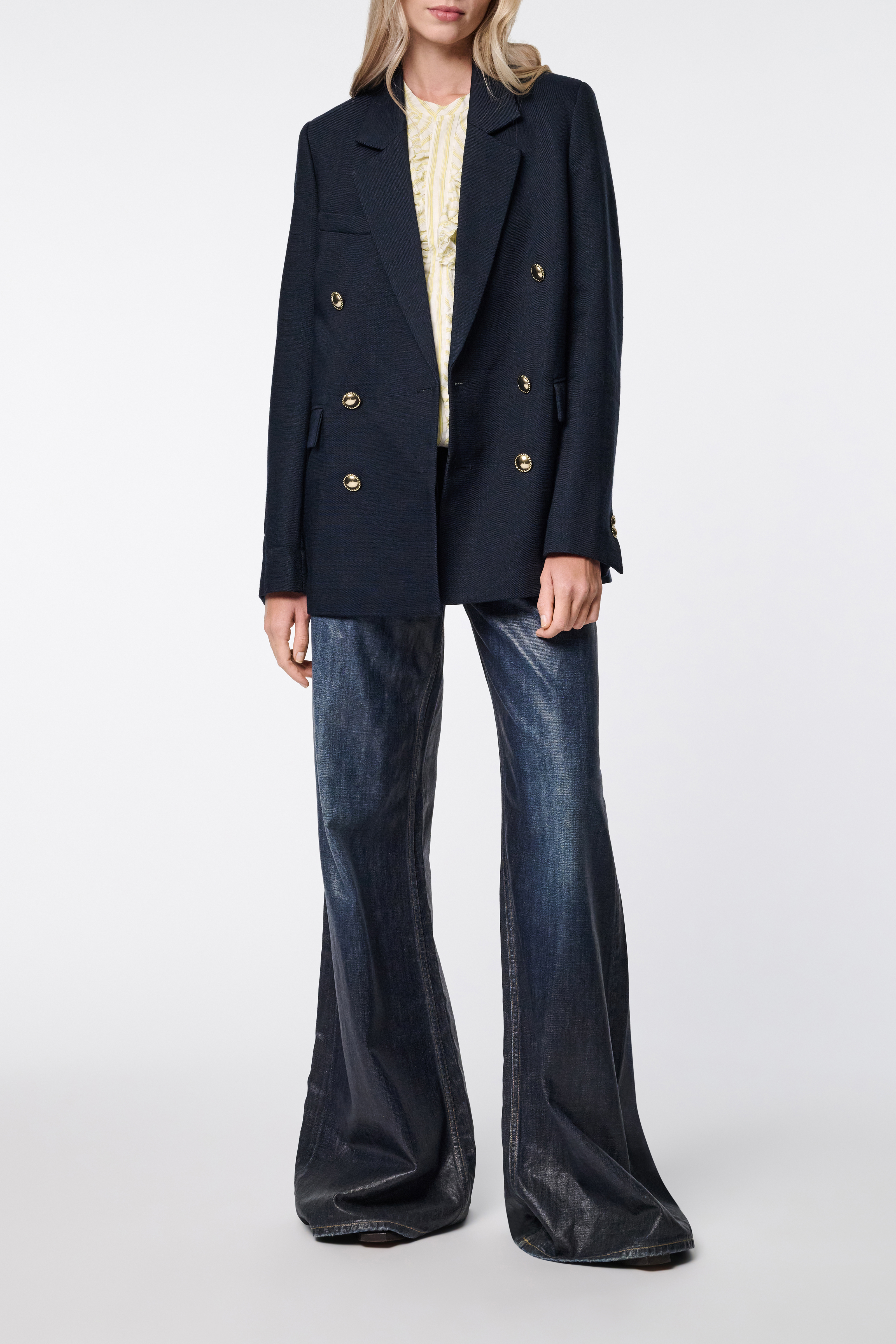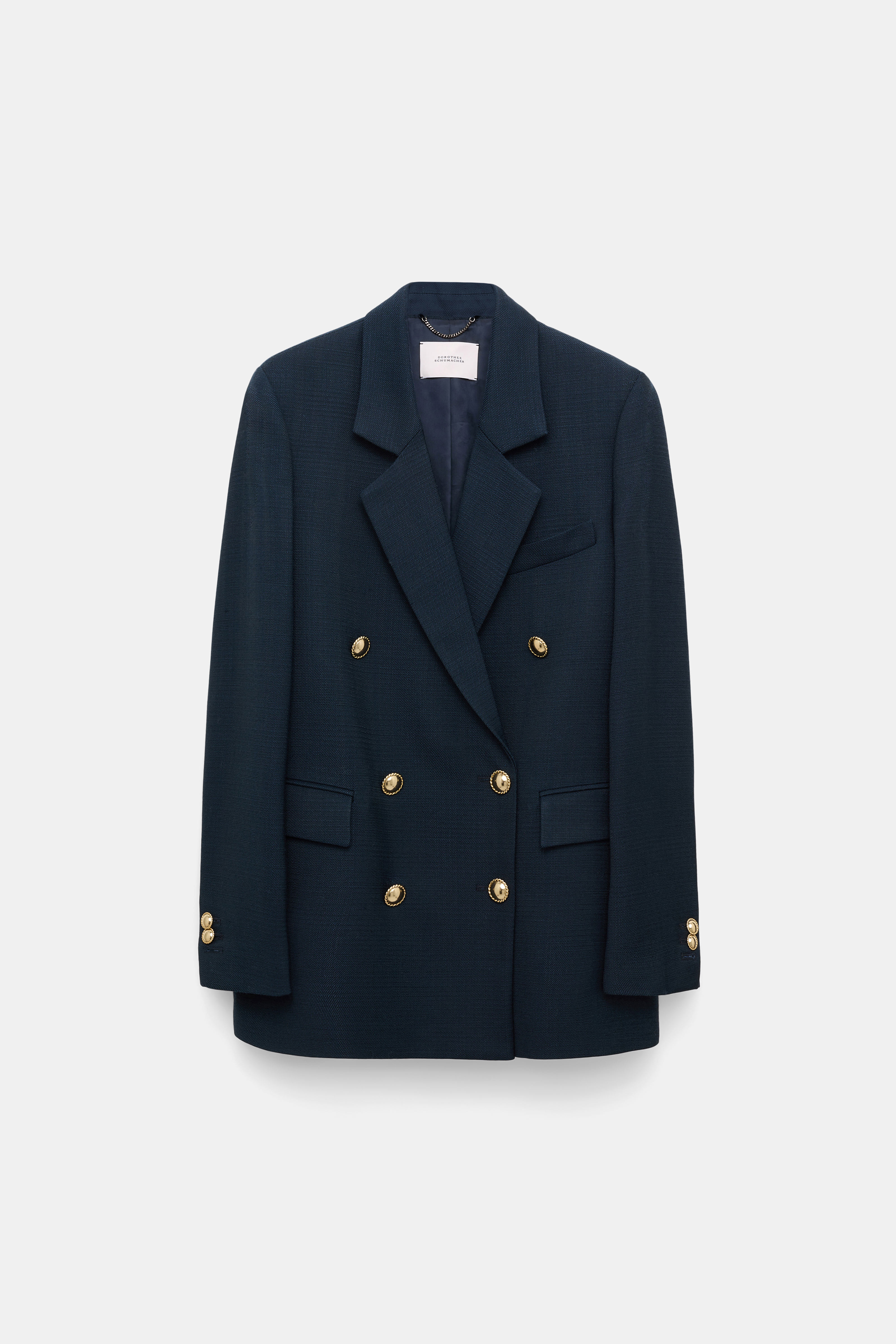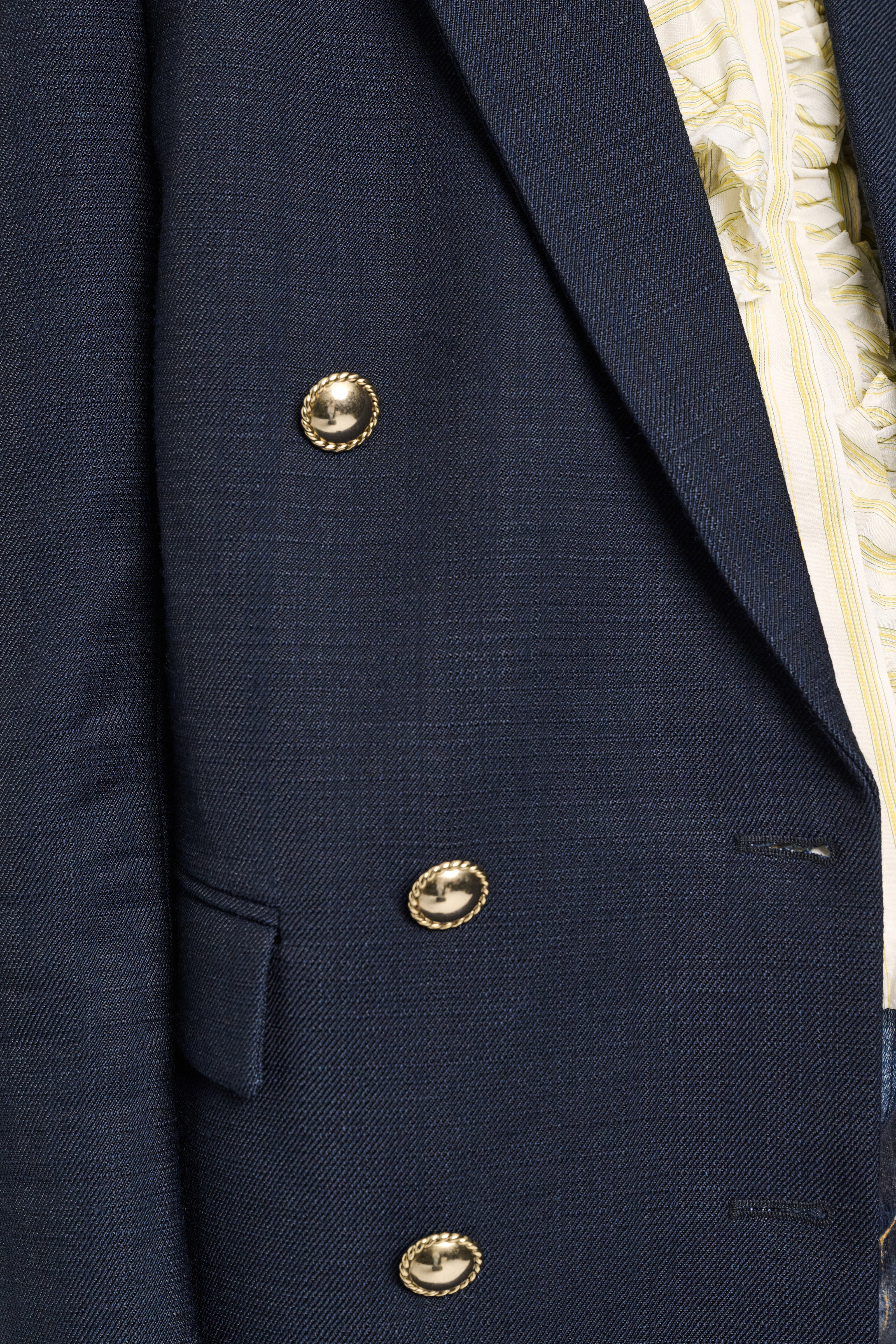 The double-breasted blazer is made from a virgin wool blend and has gold-tone buttons.