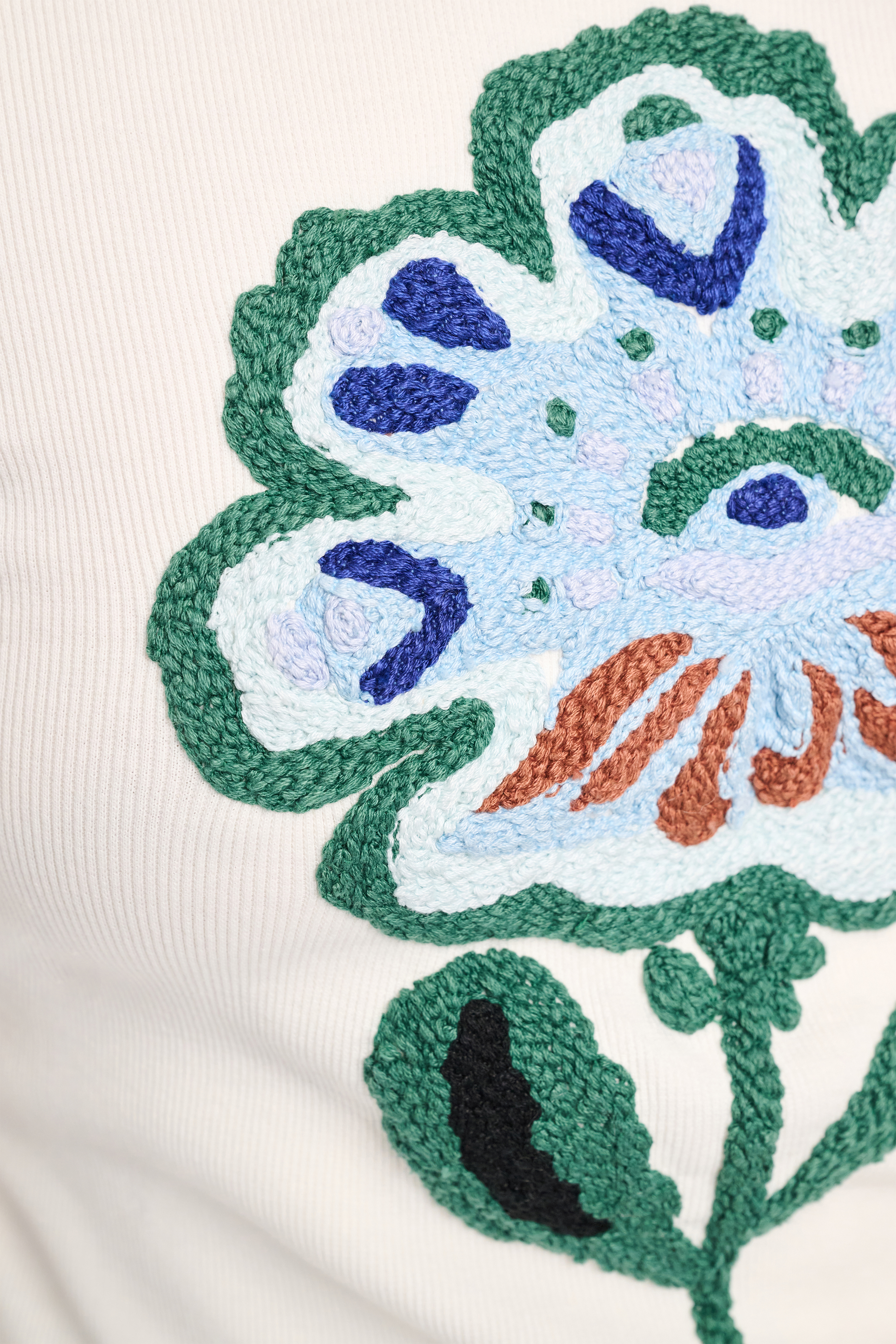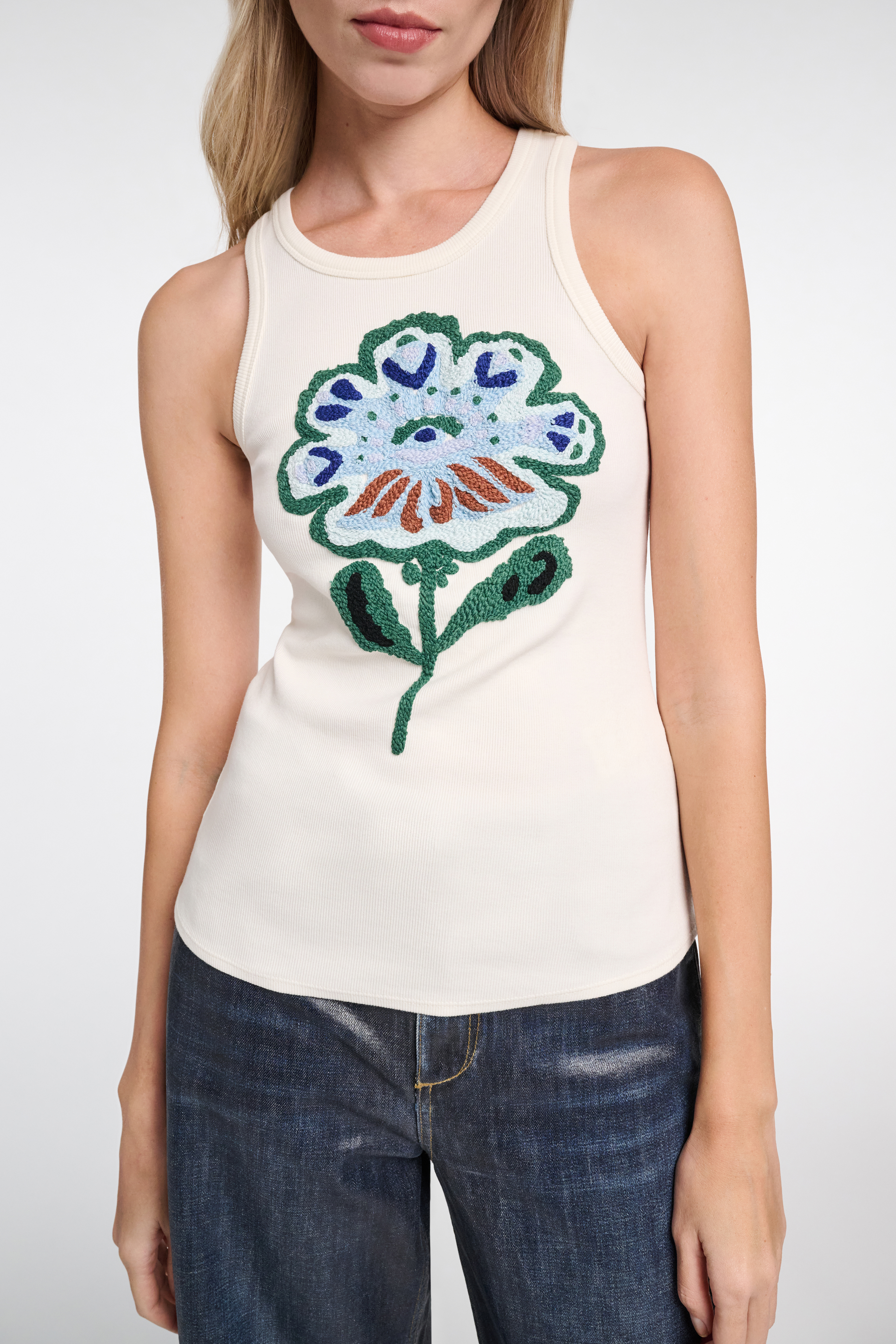 The fine rib tank top is made from comfortable stretch cotton and has a high scoop neckline.