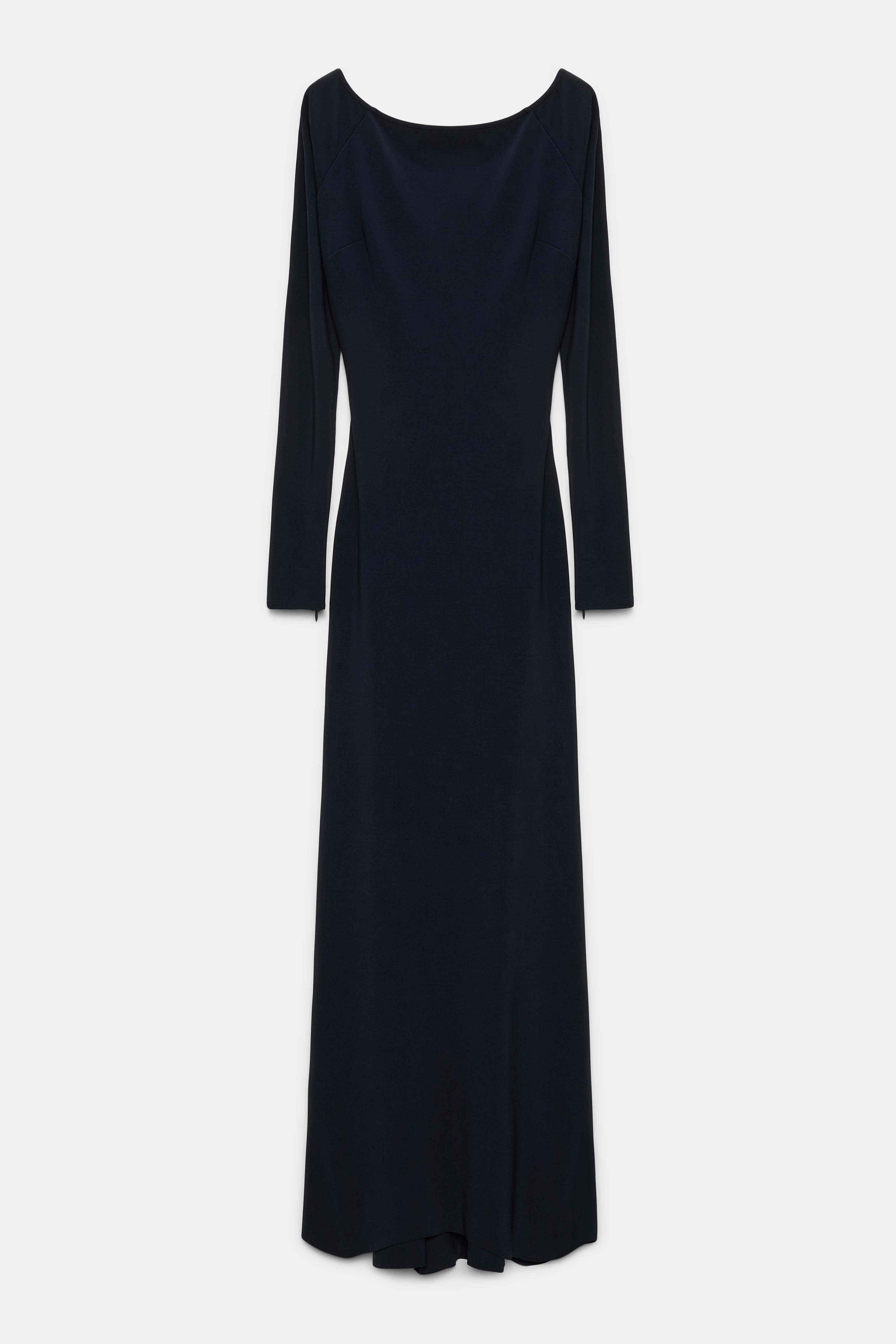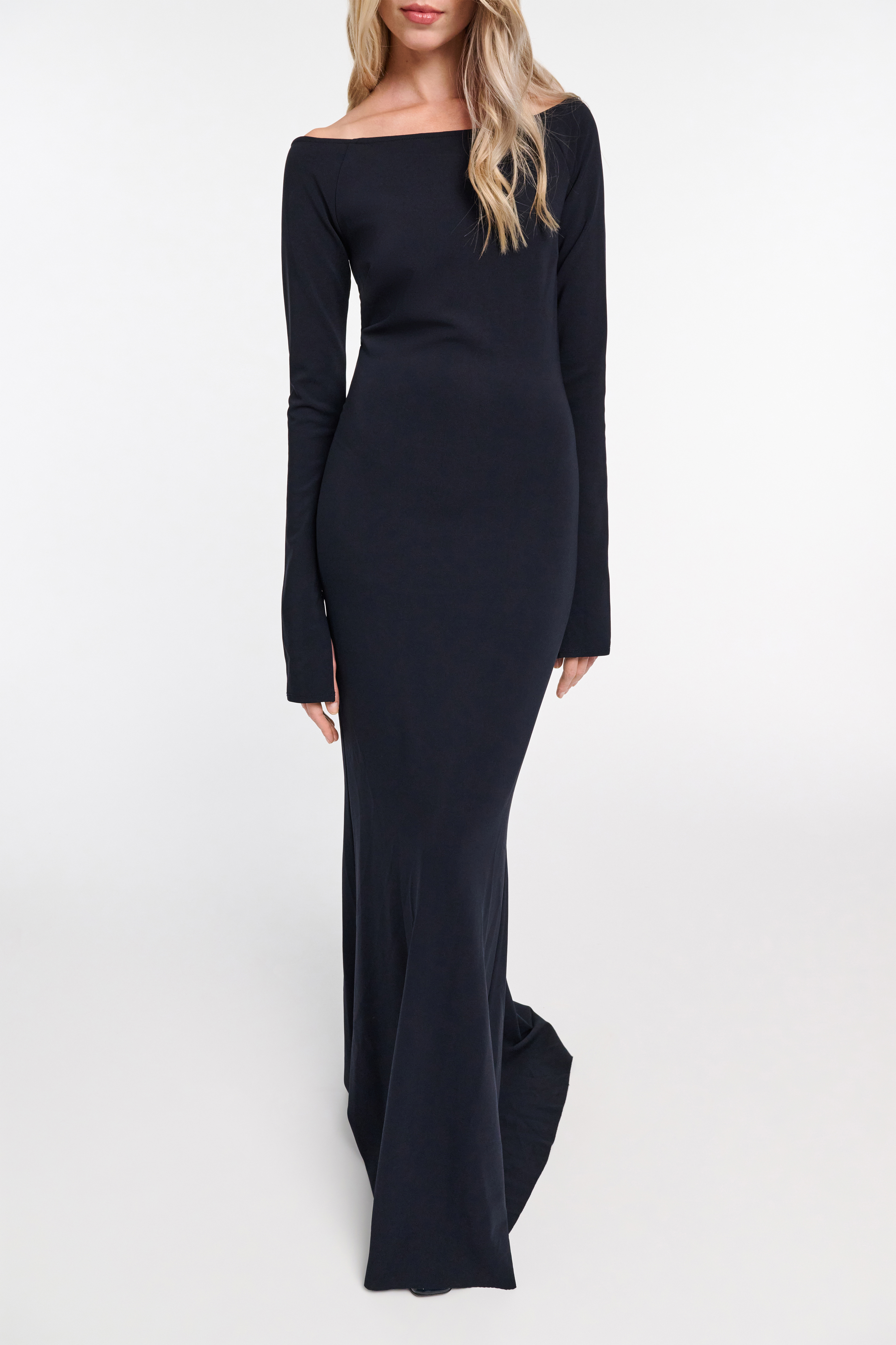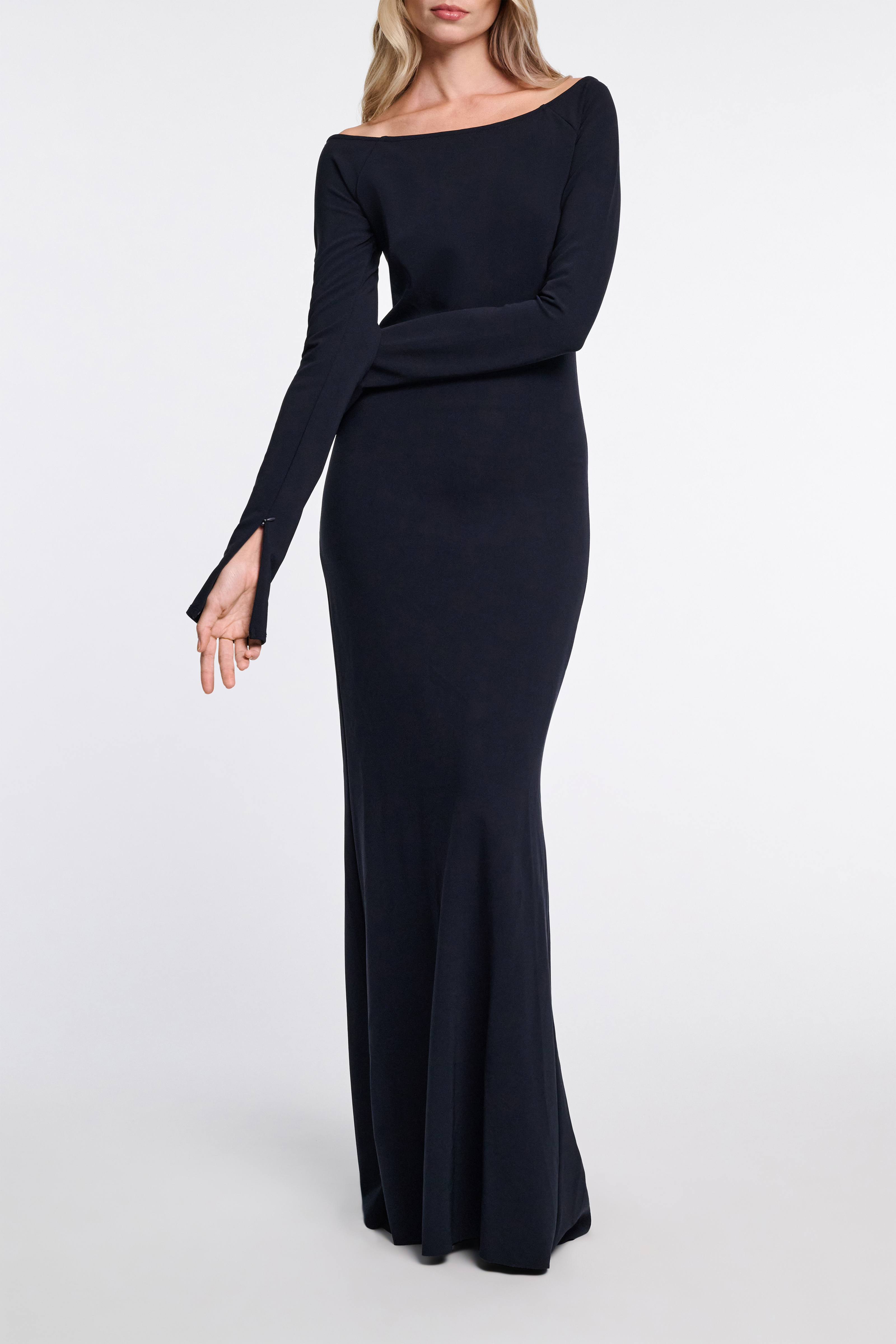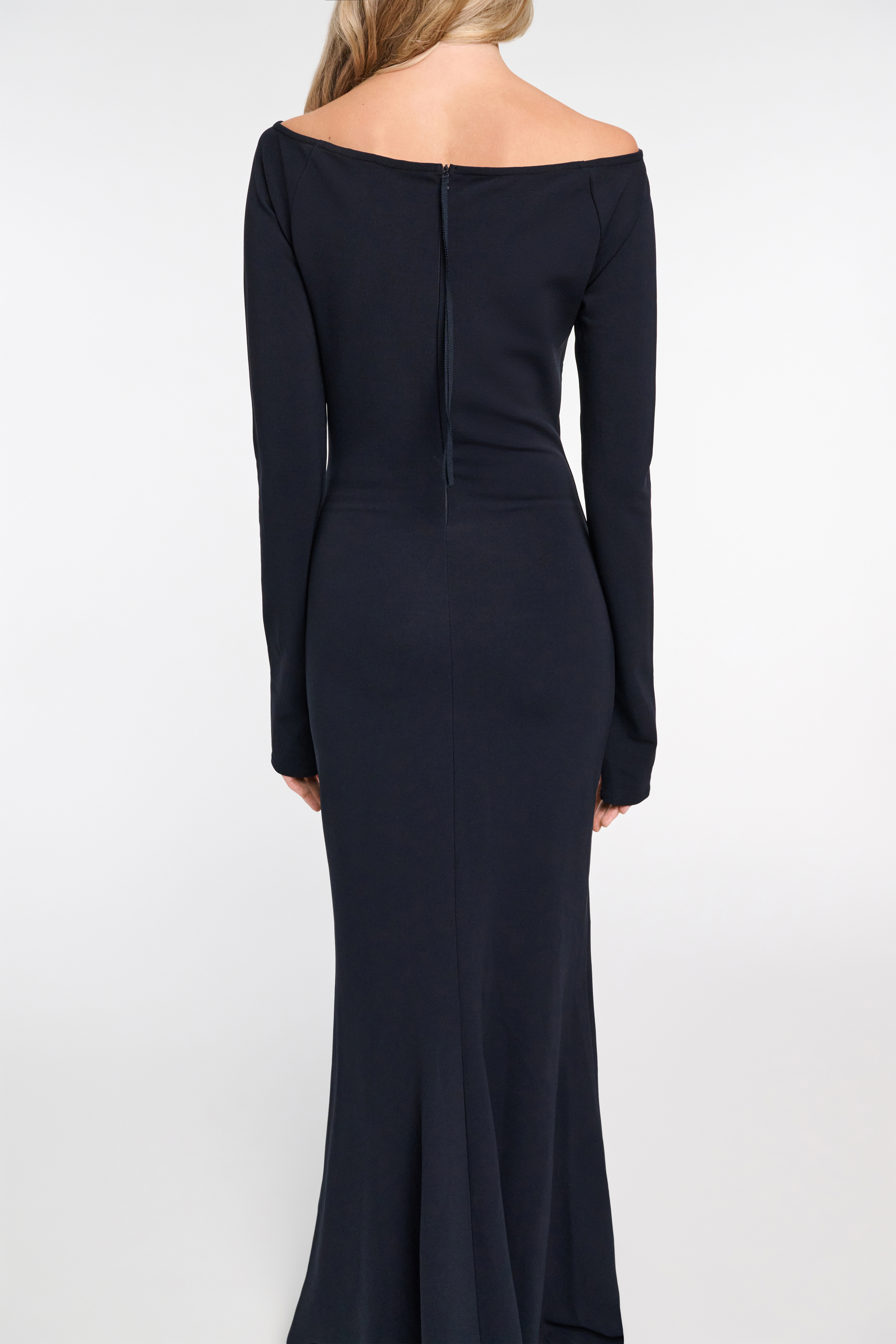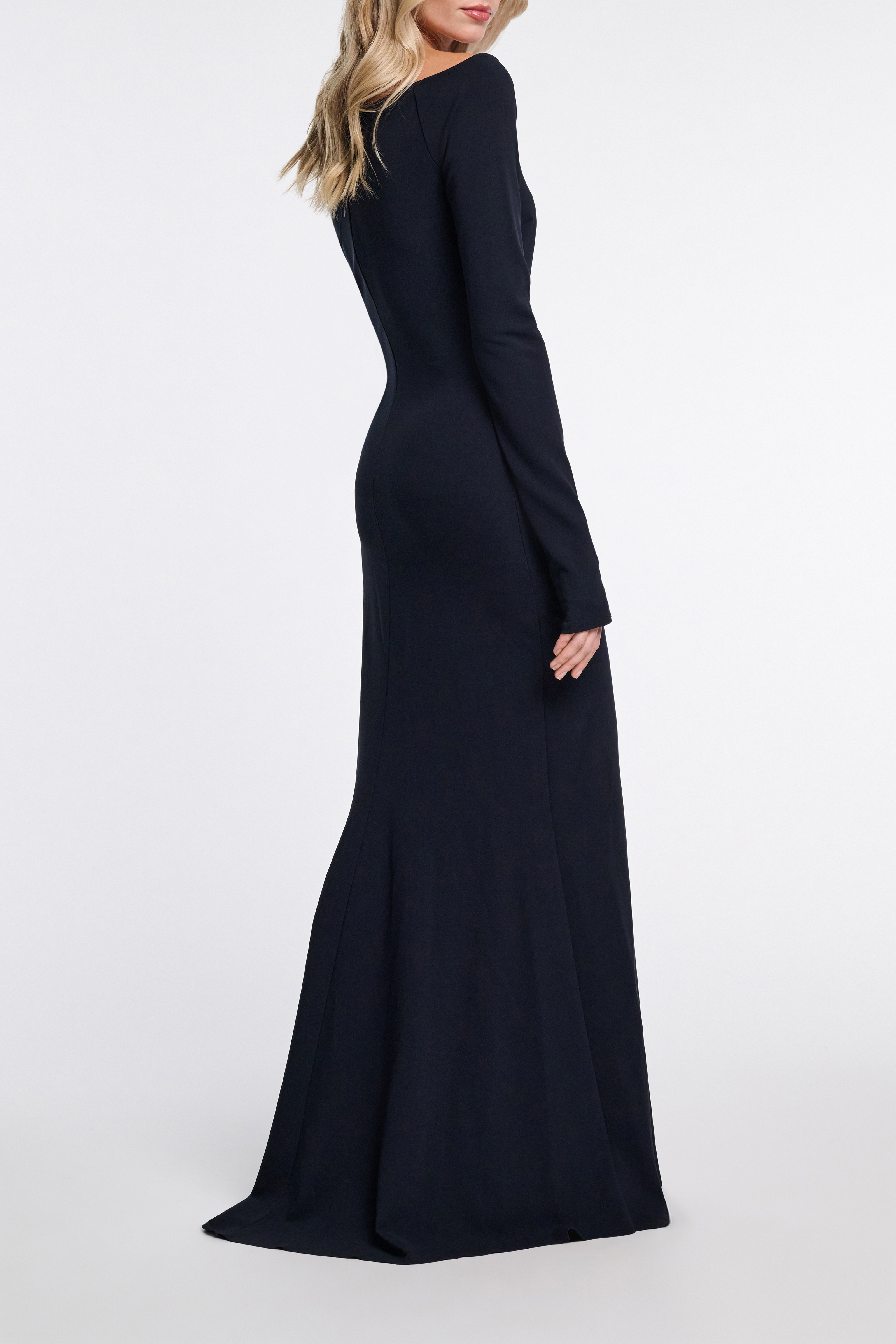 The evening dress has a wide, straight neckline in the front and the back and long sleeves.