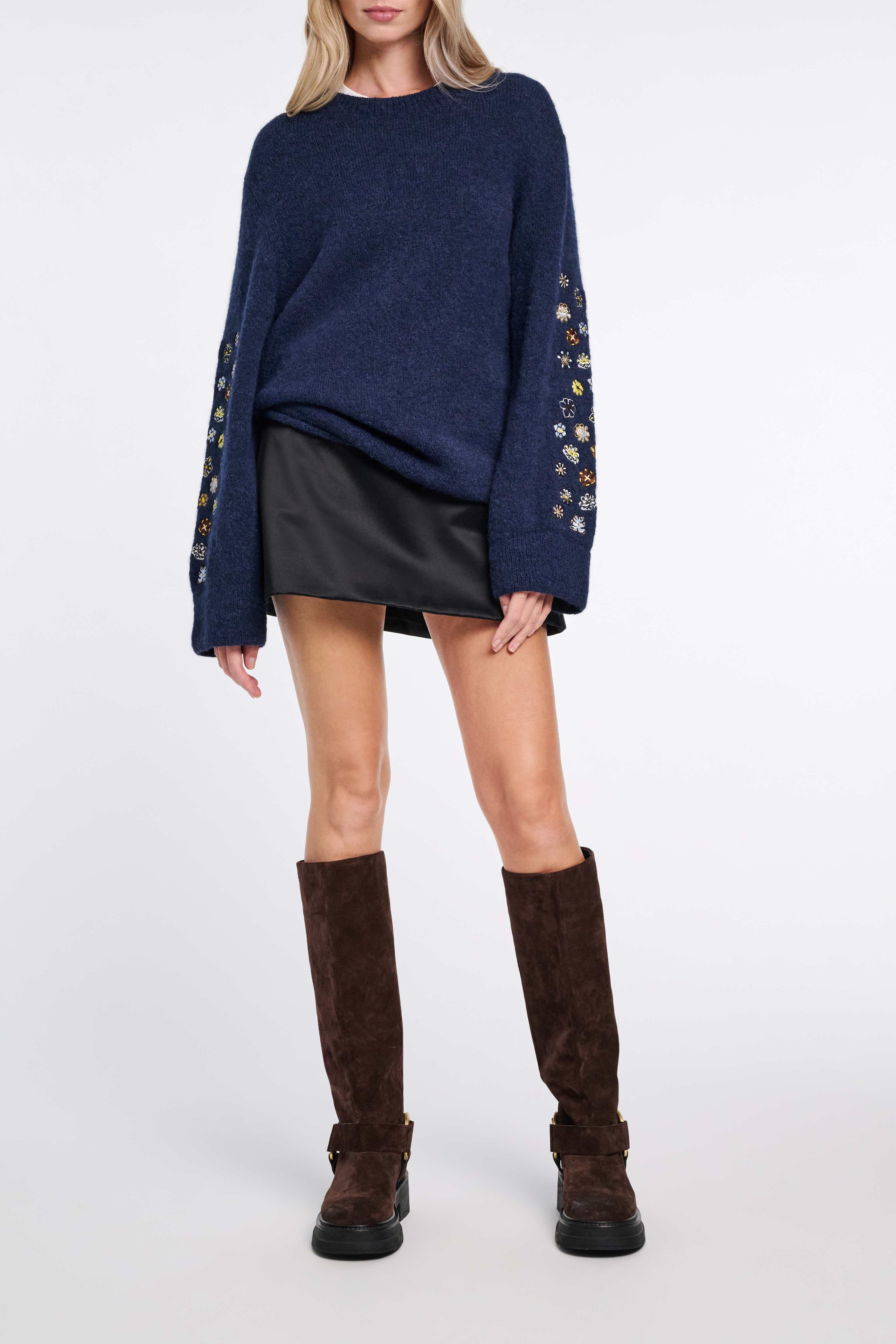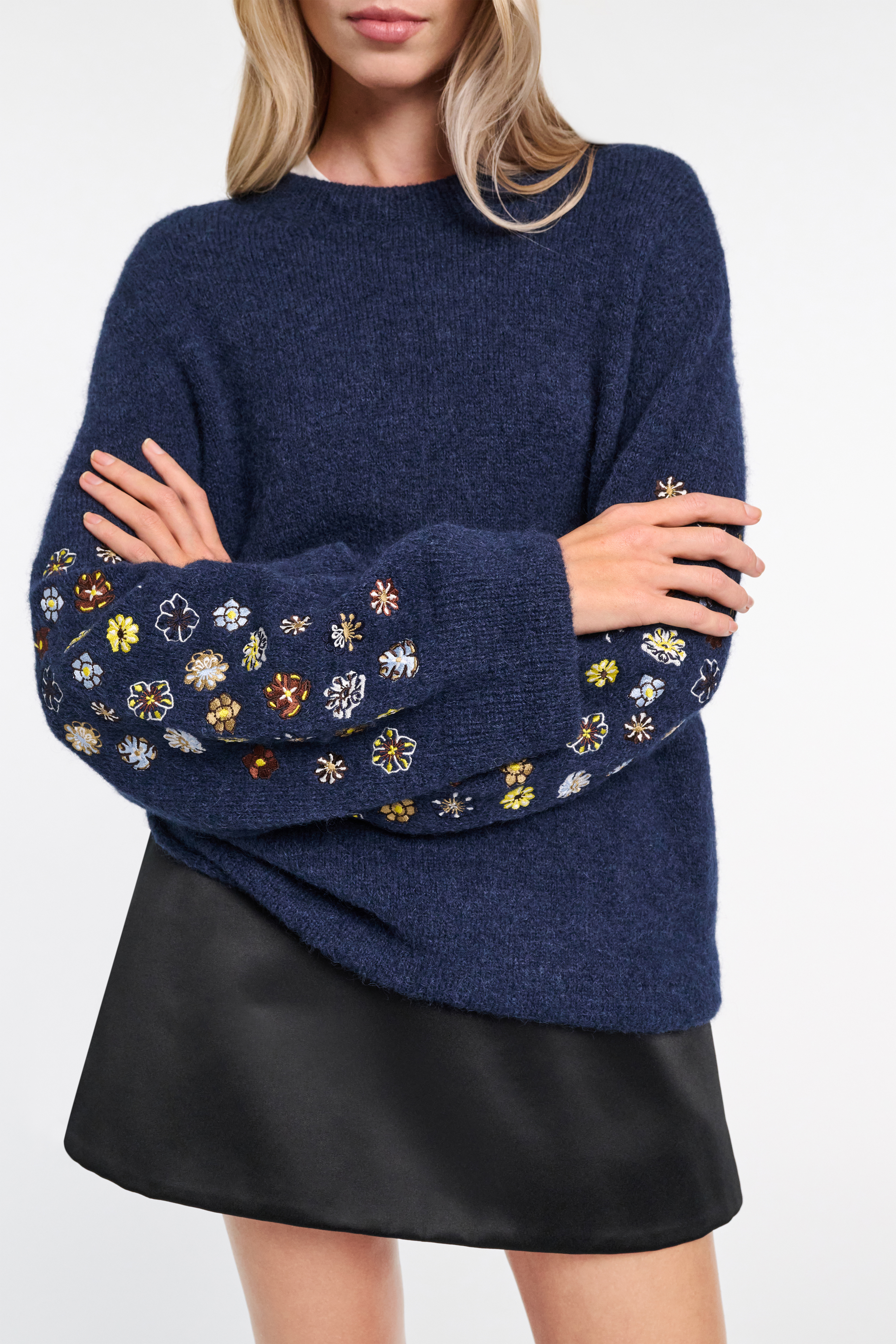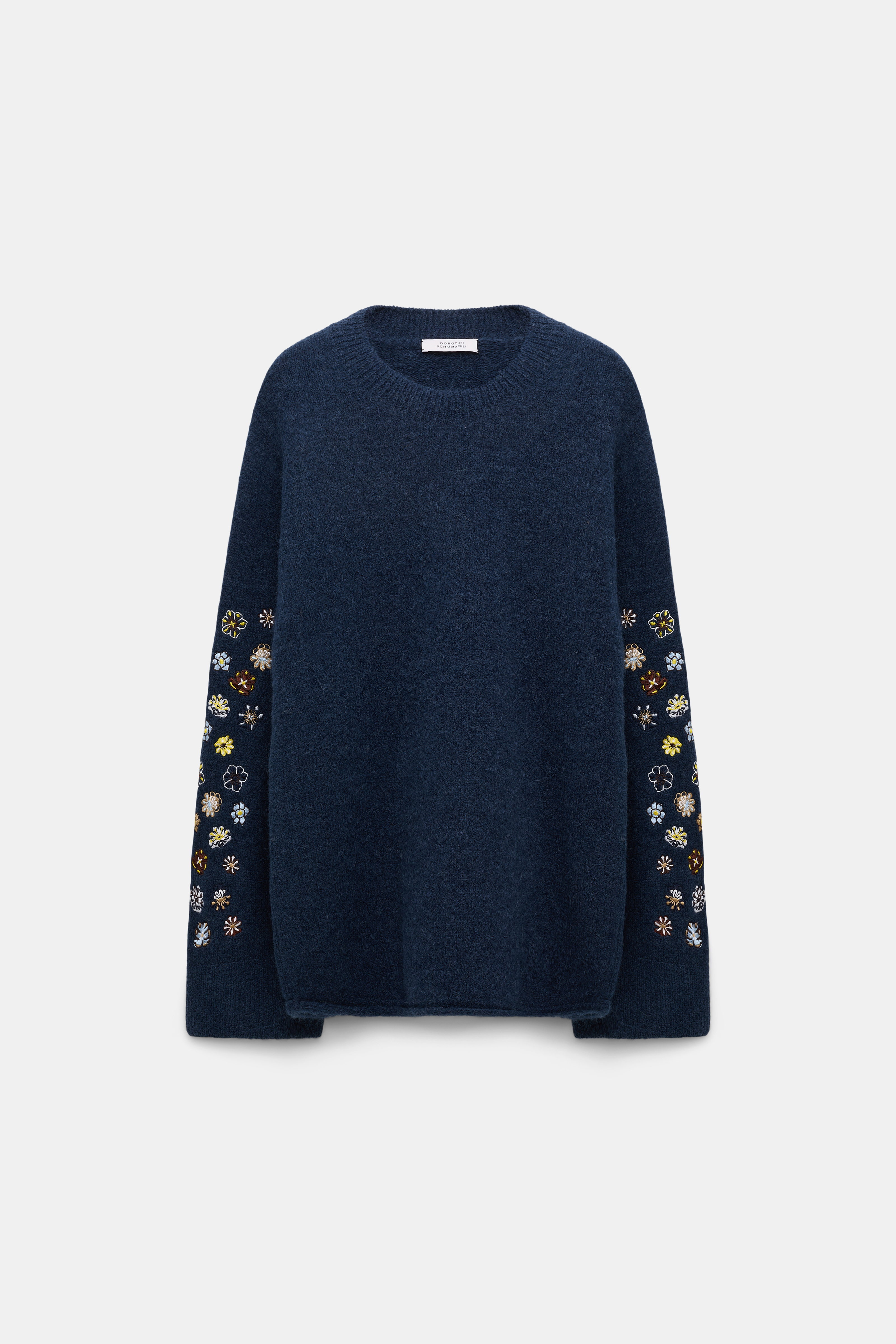The round neck pullover is made from a fuzzy alpaca blend and has wide long sleeves covered with embroidered flowers.