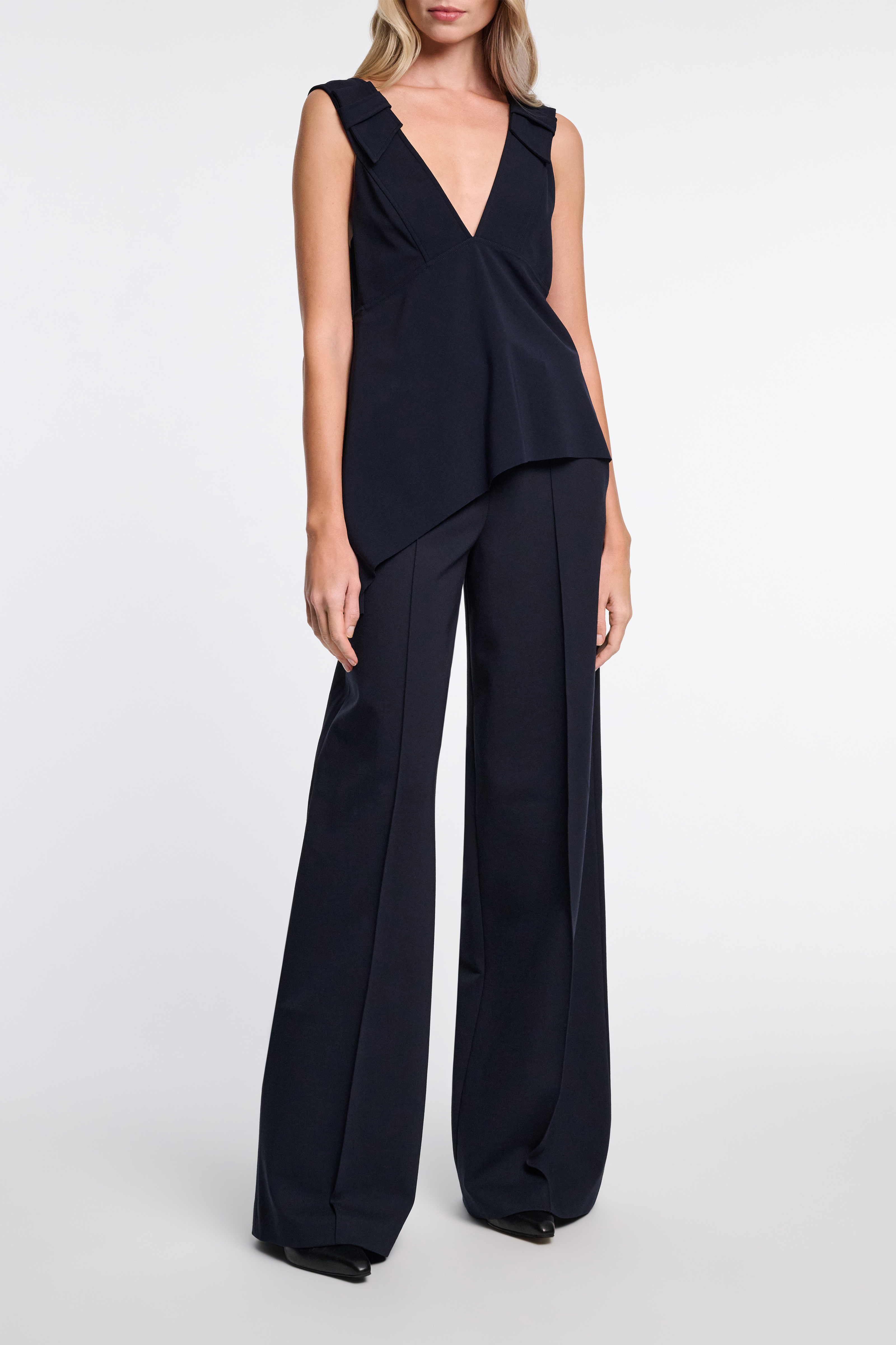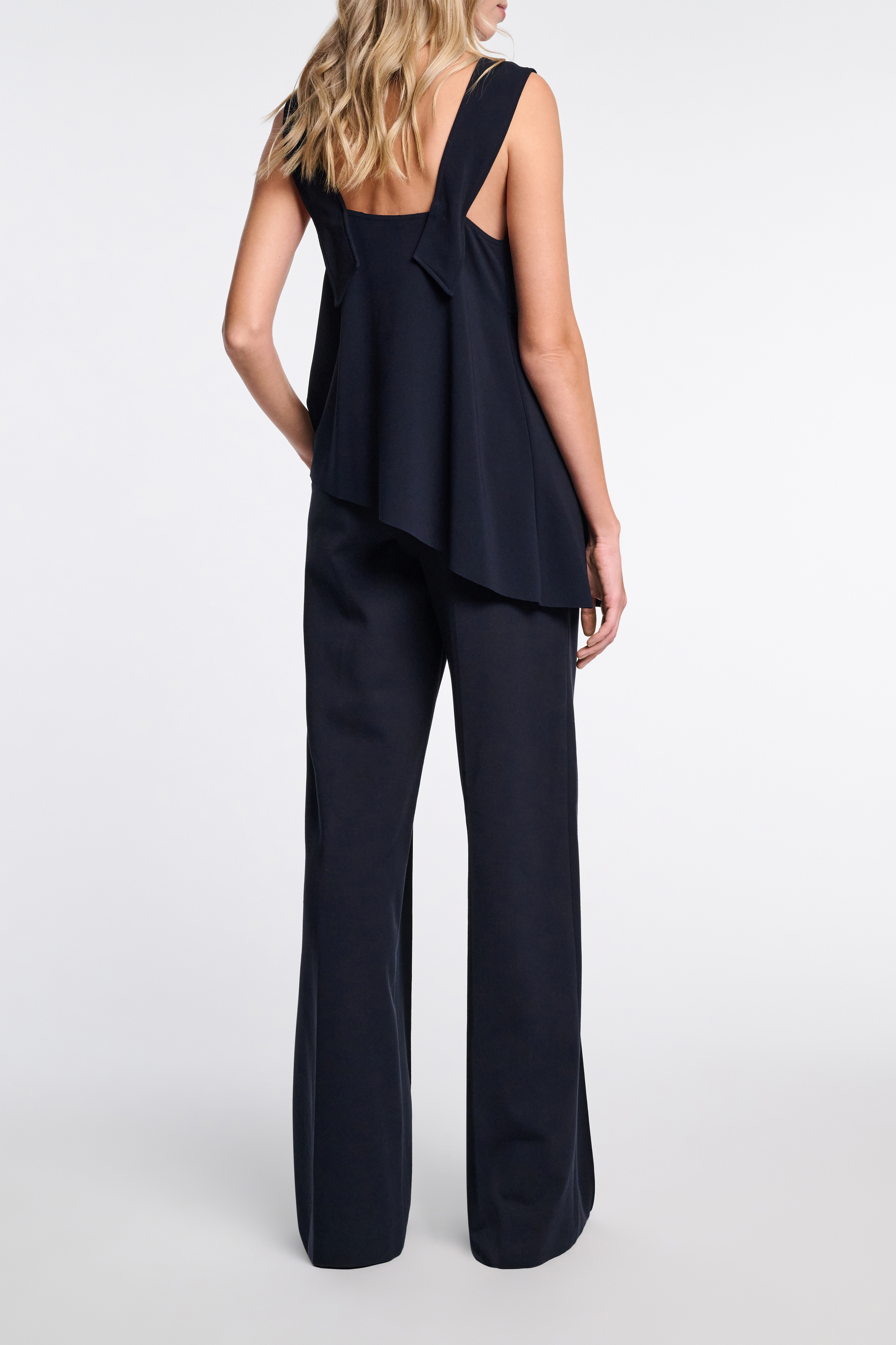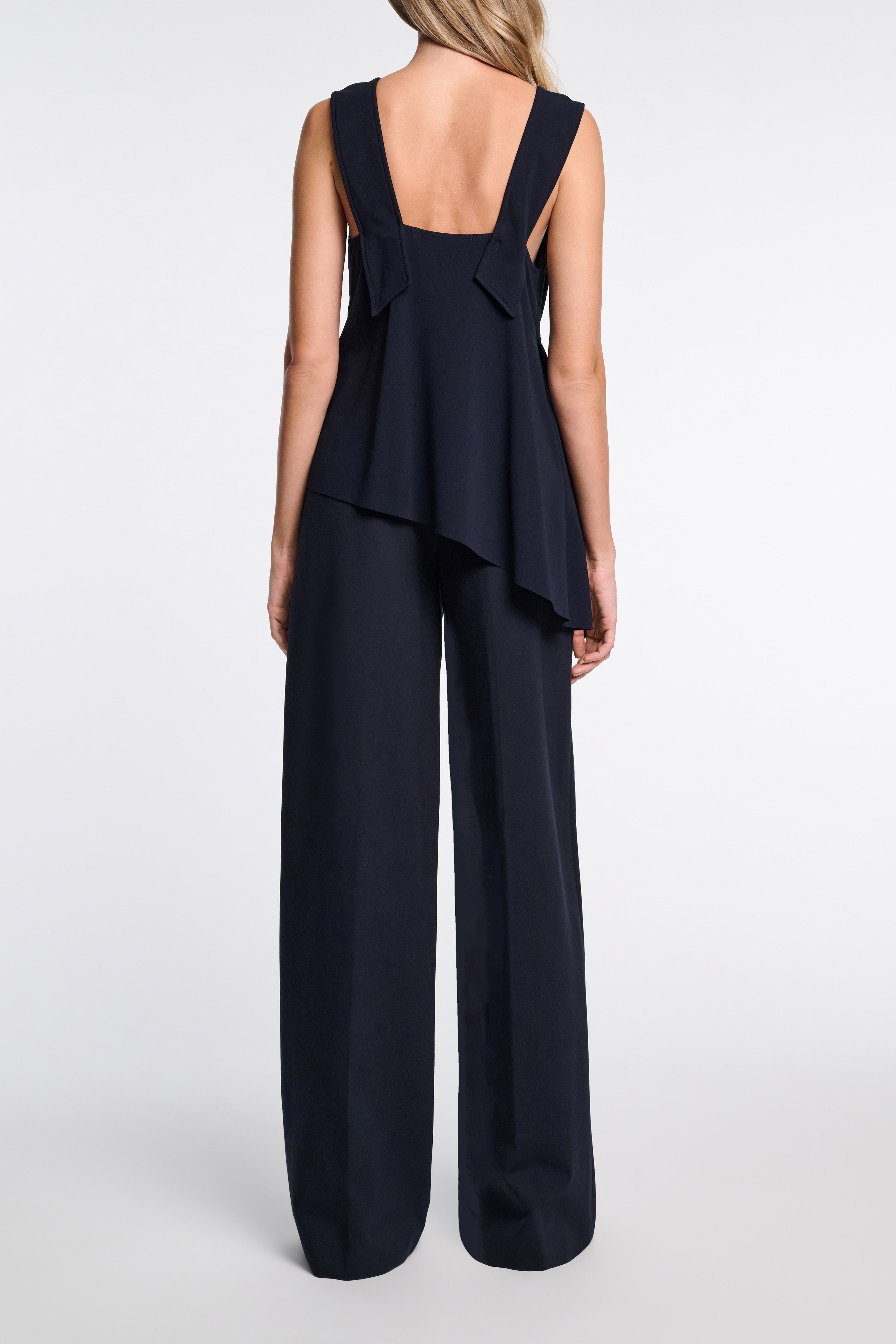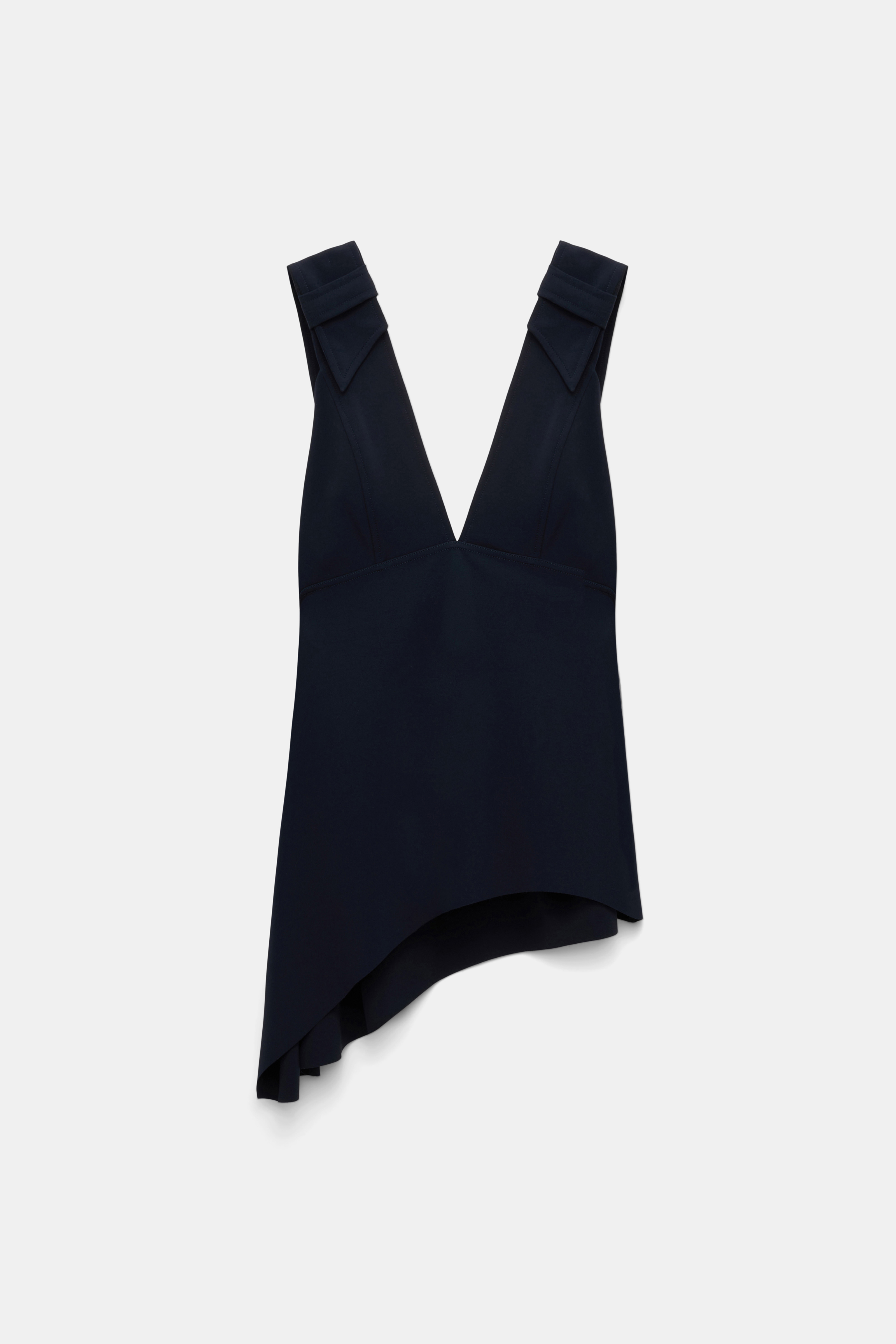 The tank top has a deep V-neckline in the front and the back and an asymmetric draped hemline.