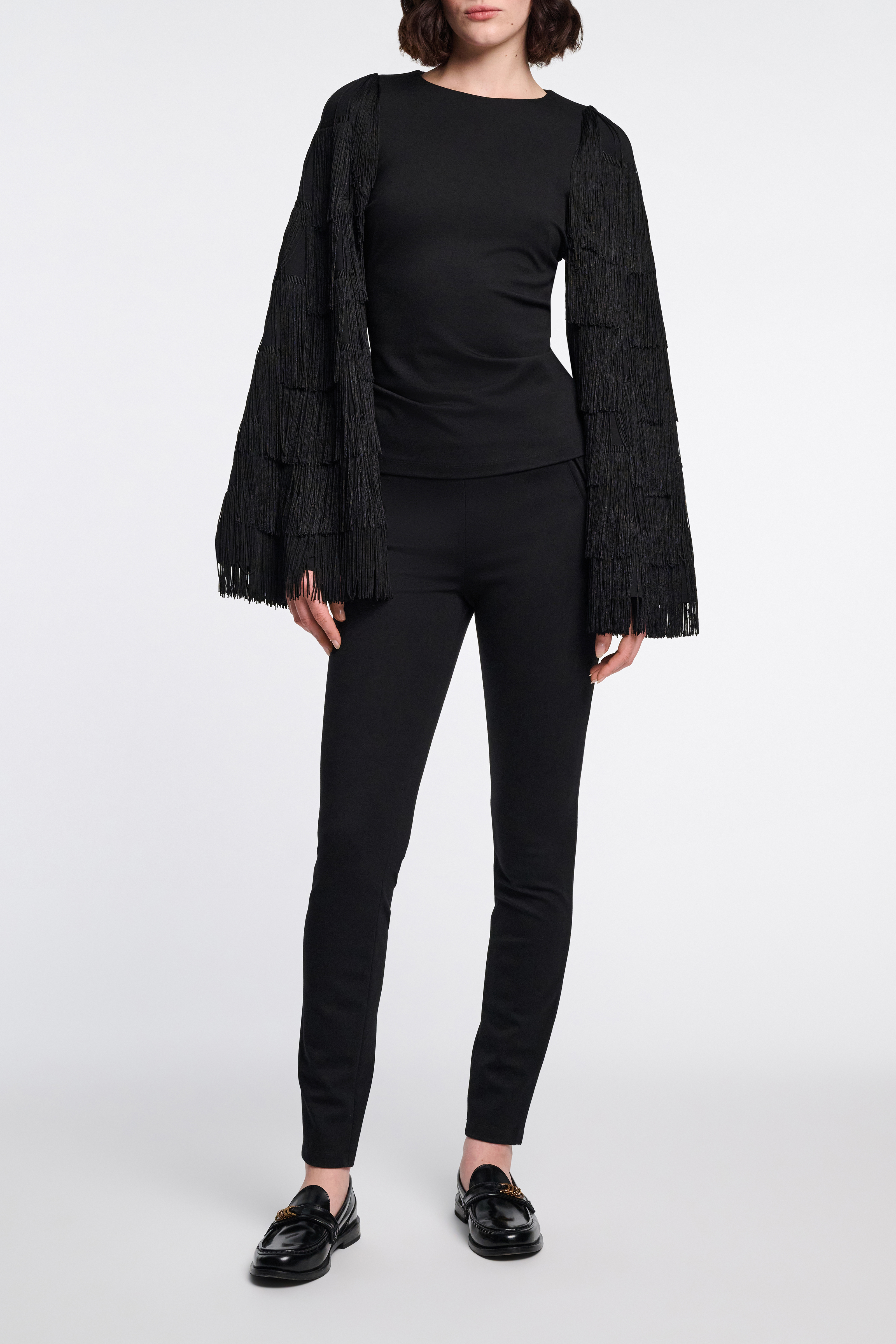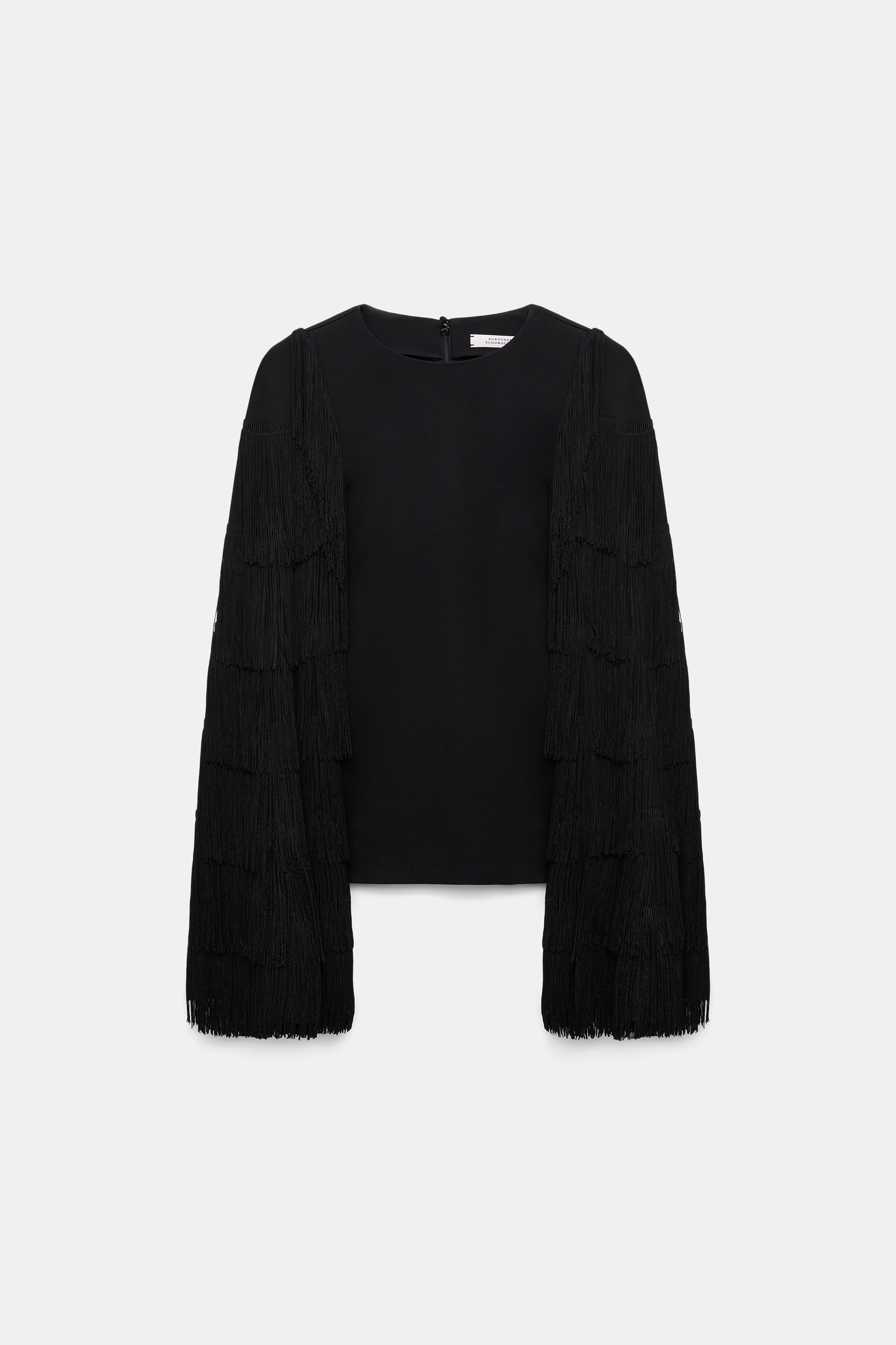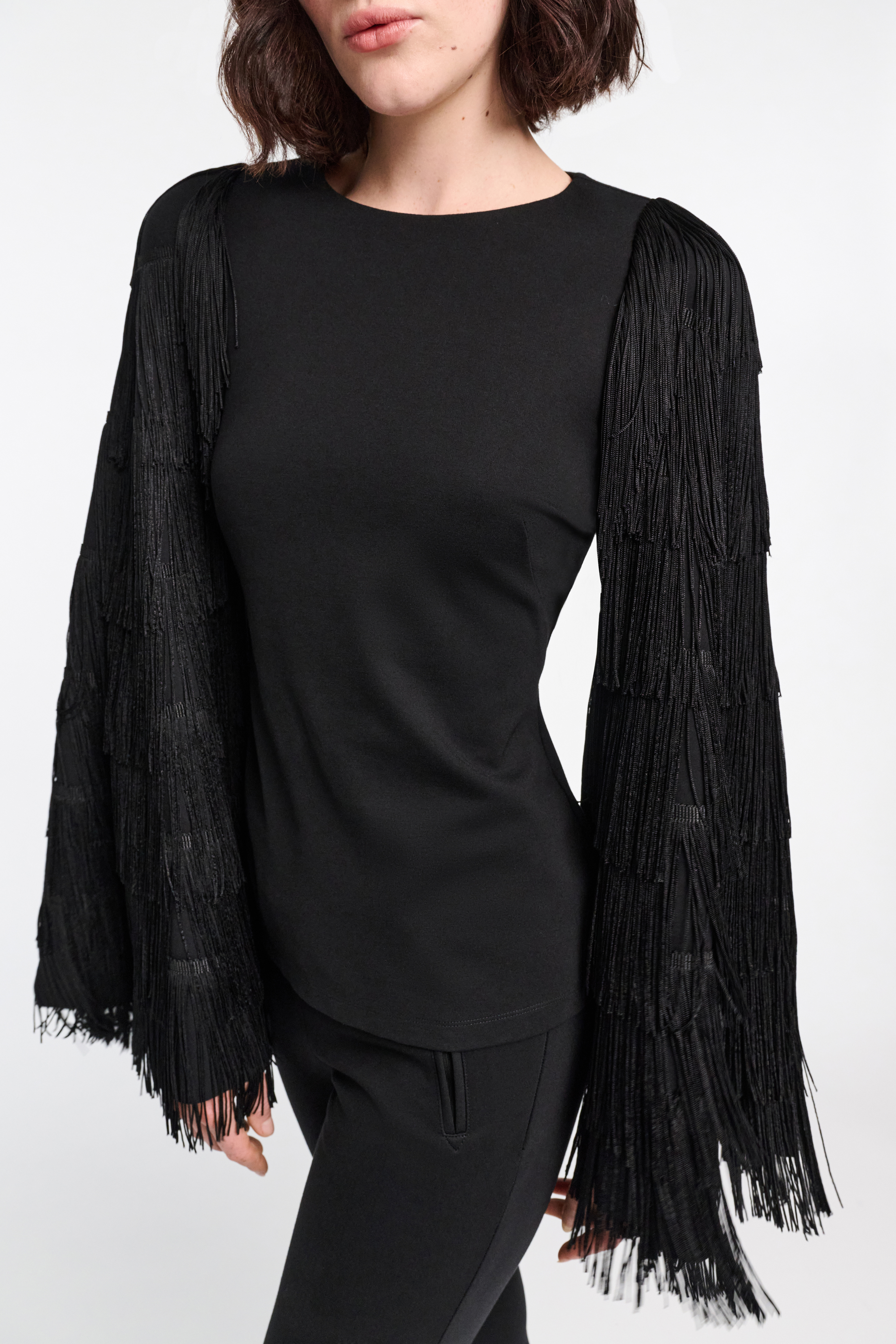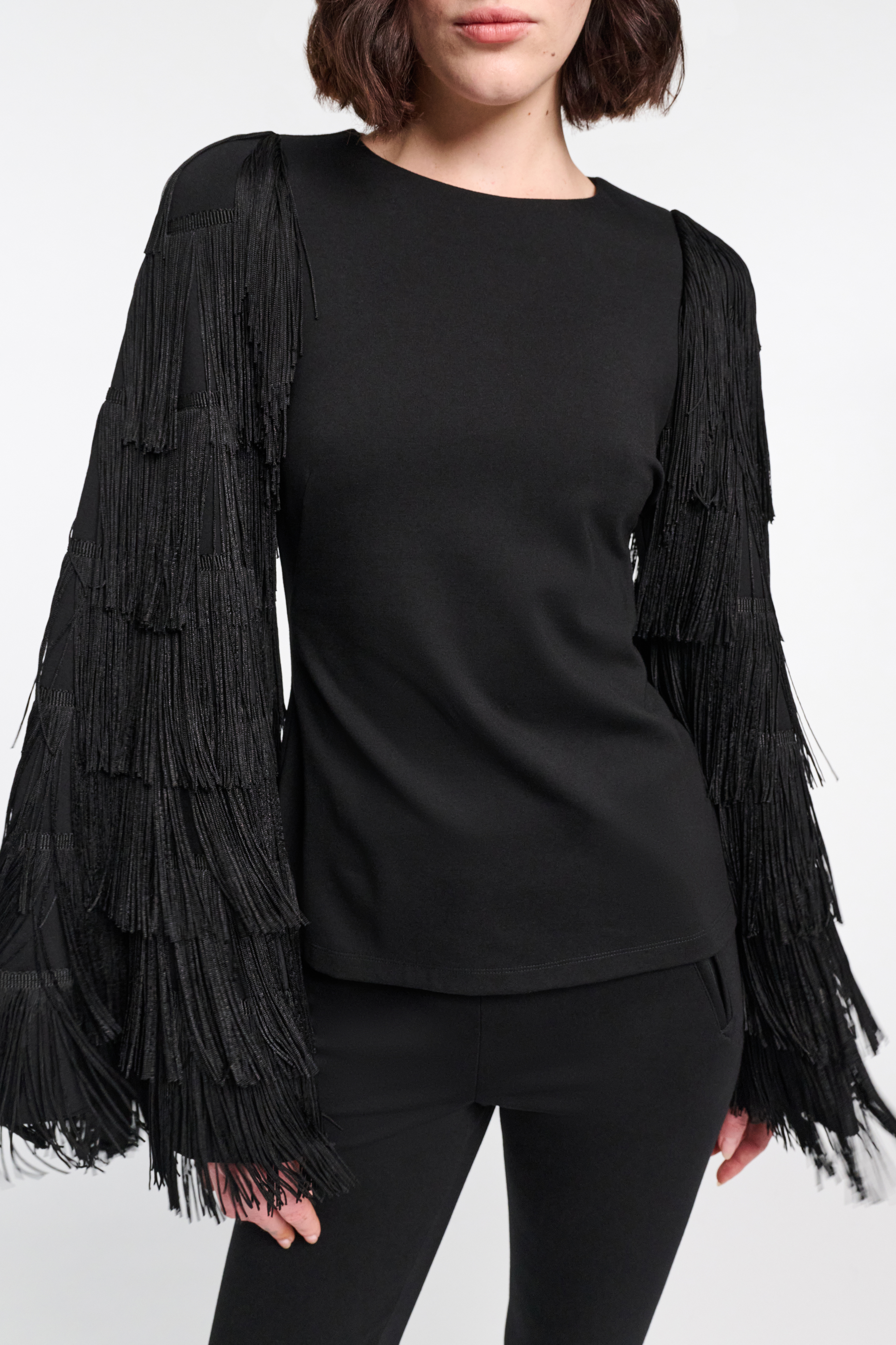 The Punto Milano top has soft flared sleeves covered with rows of tactile fringe.