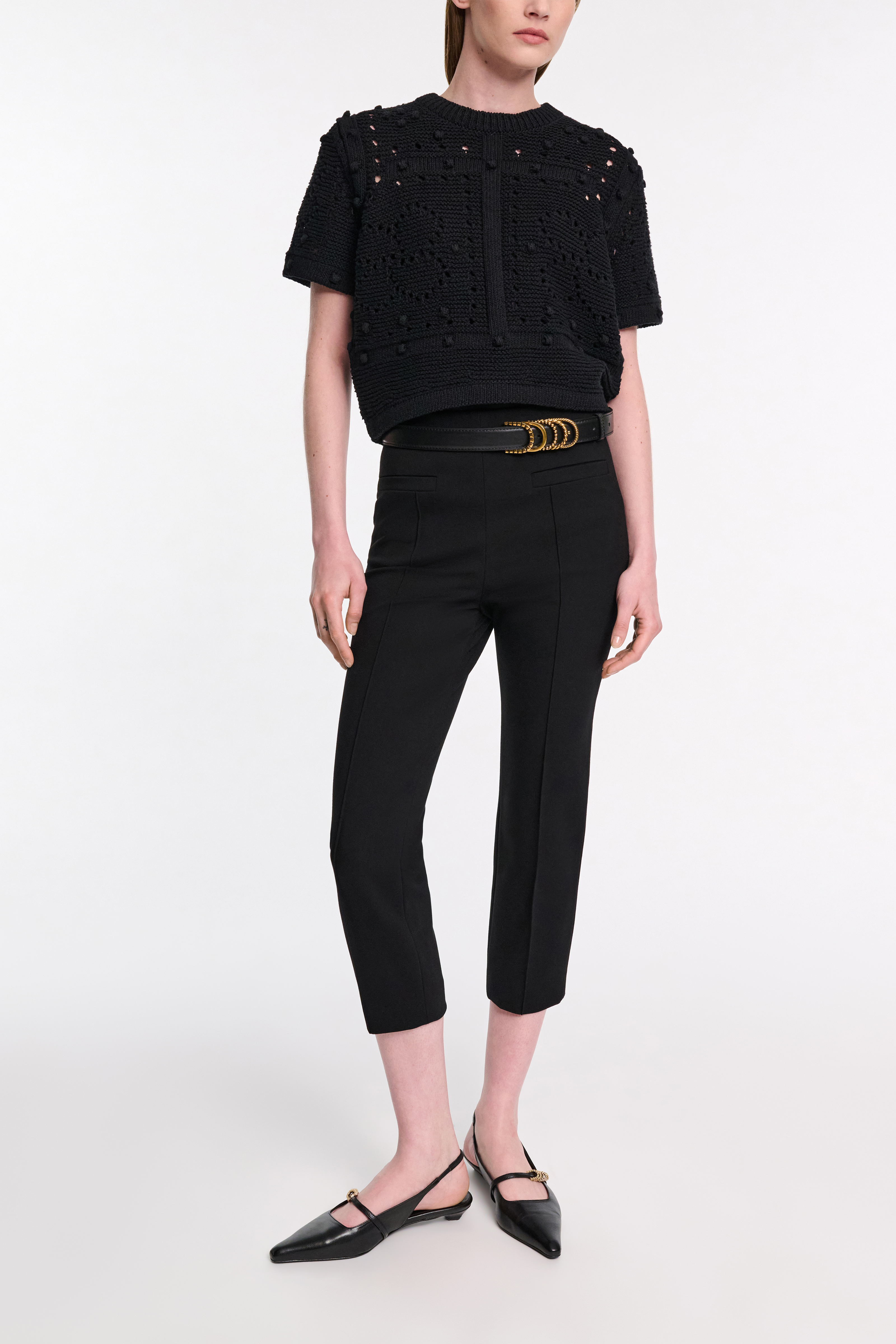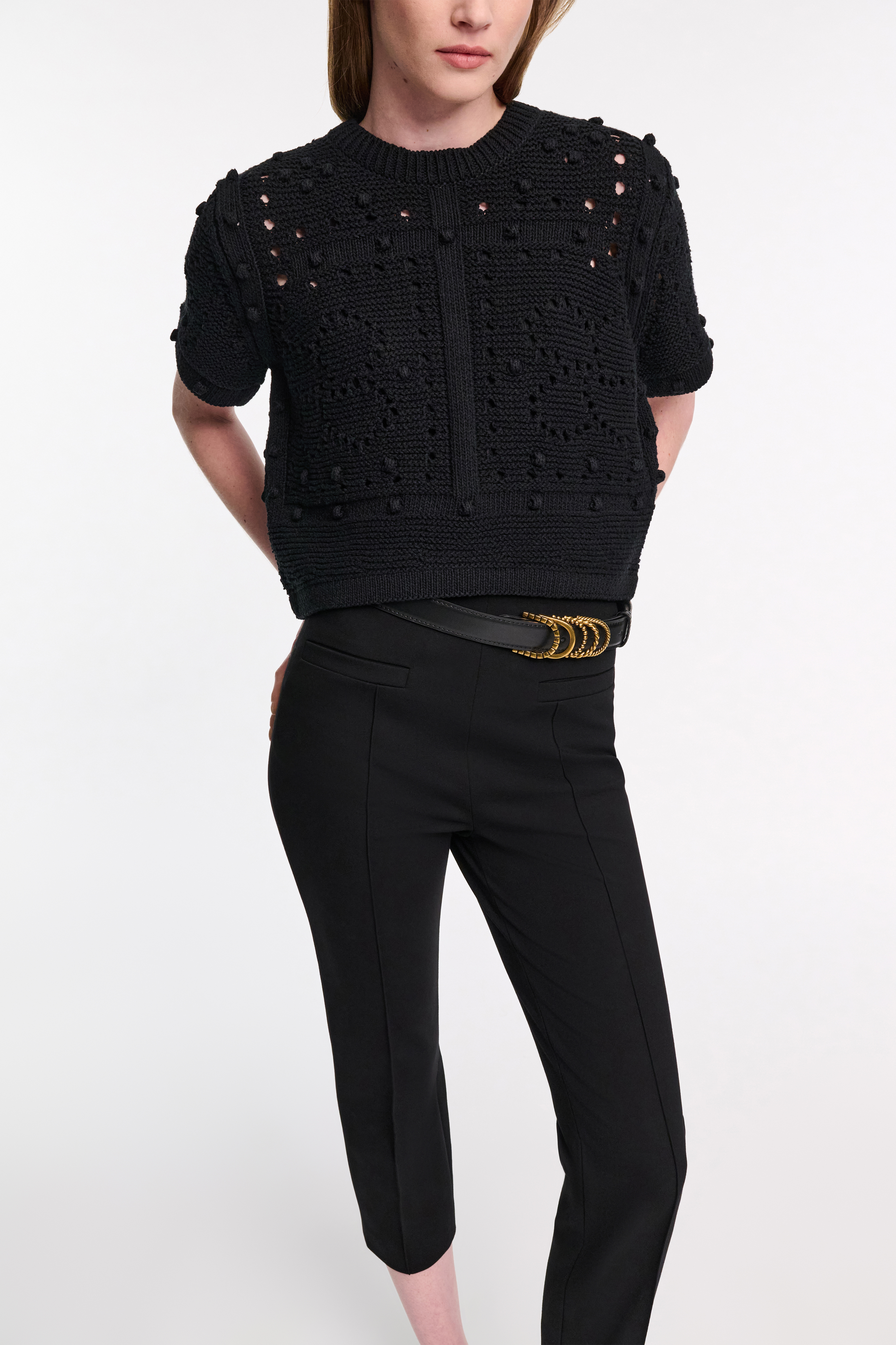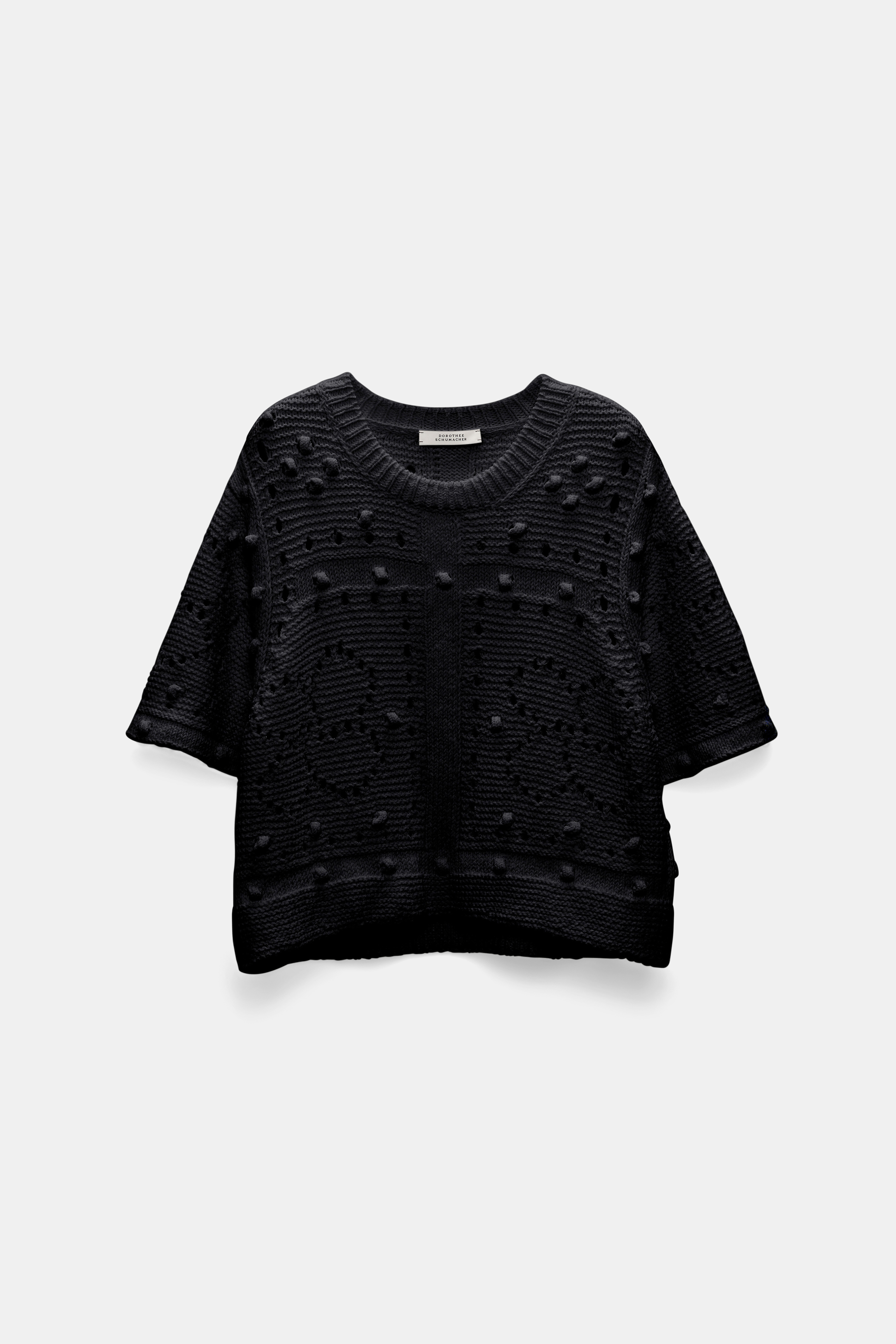 The round neck top is knit in a cotton blend and has stitch and D-rose pointelle patterning.