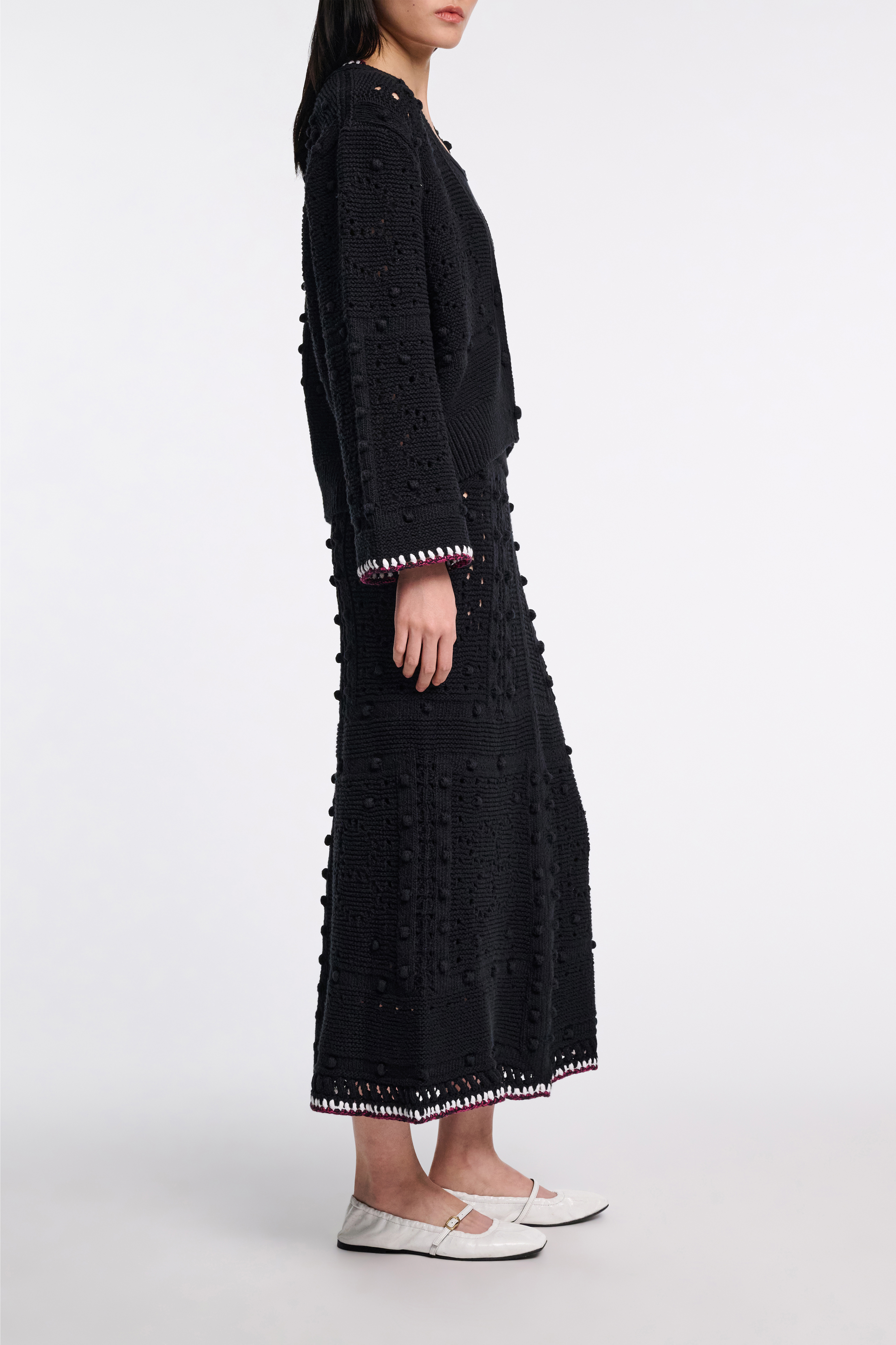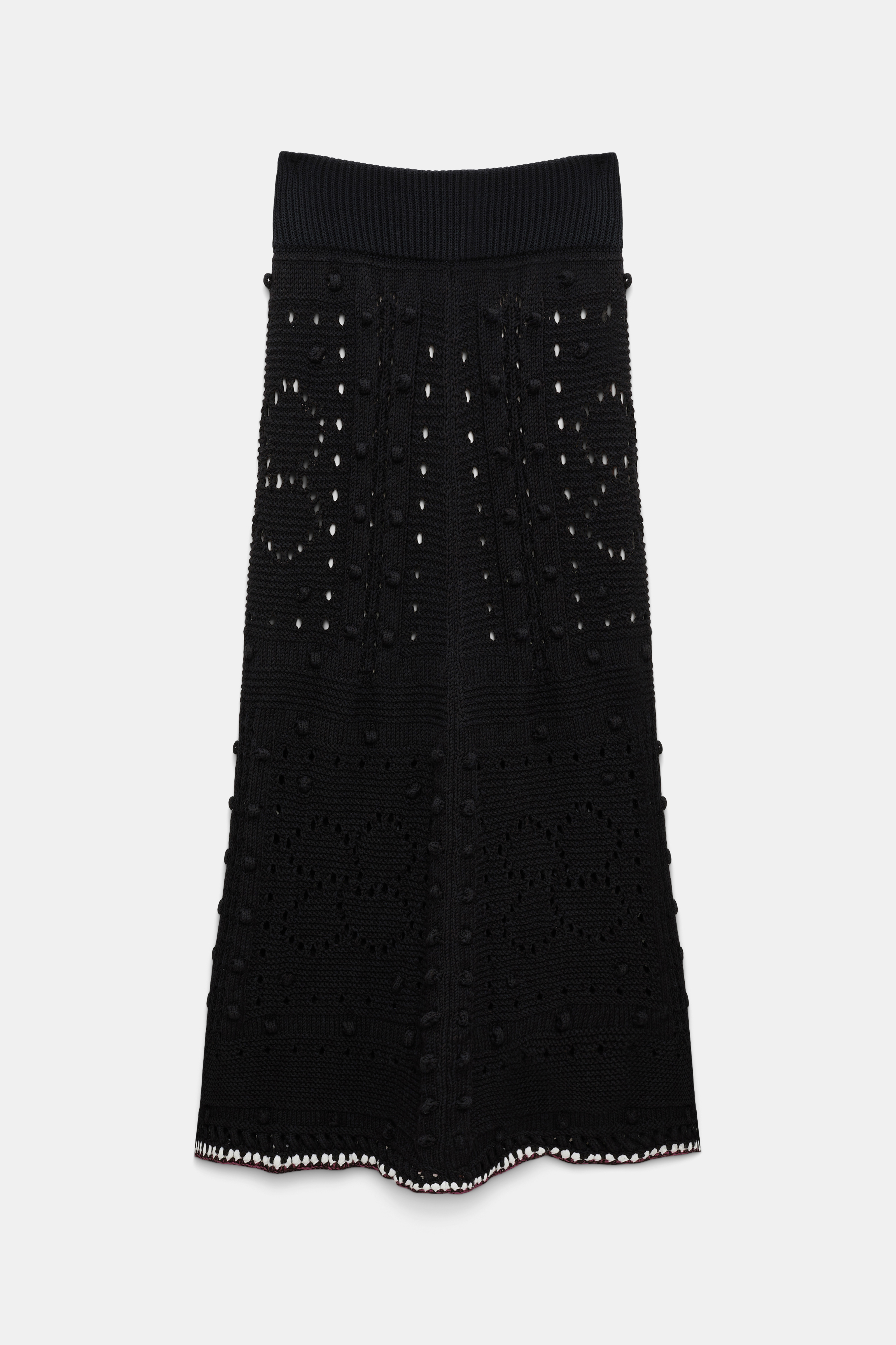 The maxi skirt is knit in a cotton blend and has stitch and D-rose pointelle patterning.