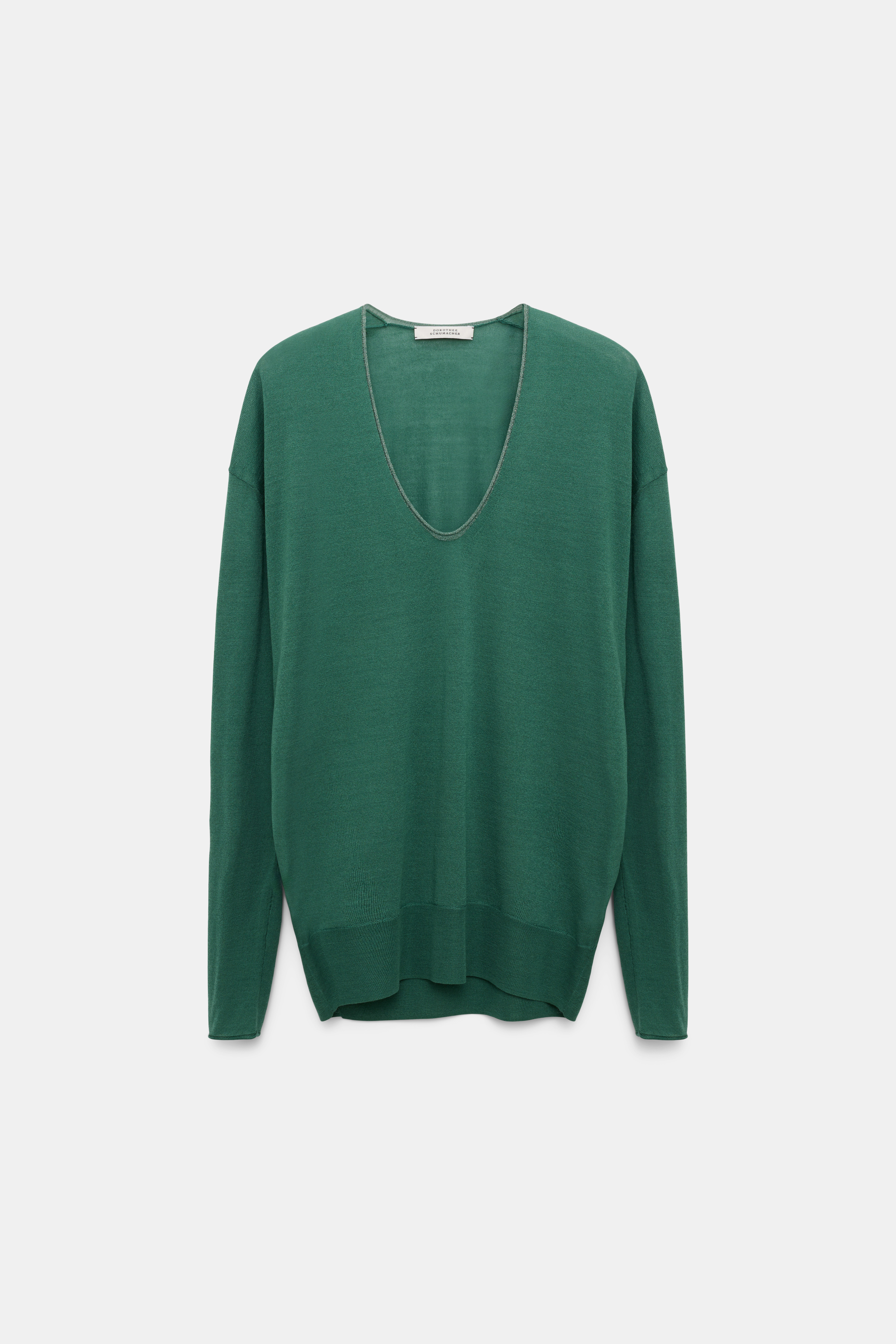 The pullover is knit in a wool-cotton blend and has a deep U-neckline.