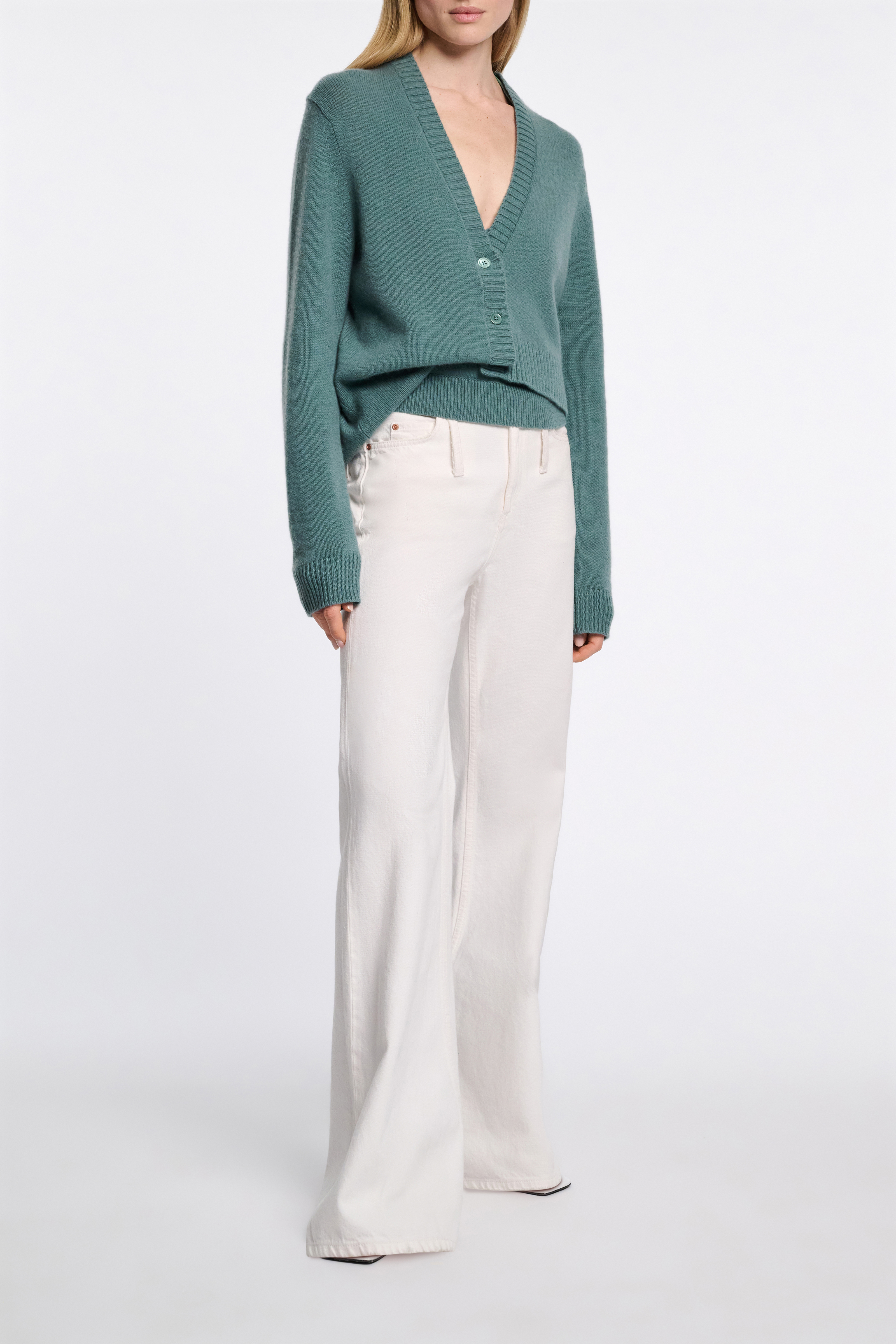 The V-neck cardigan is knit in a Merino-cashmere blend and has ribbed knit trim.