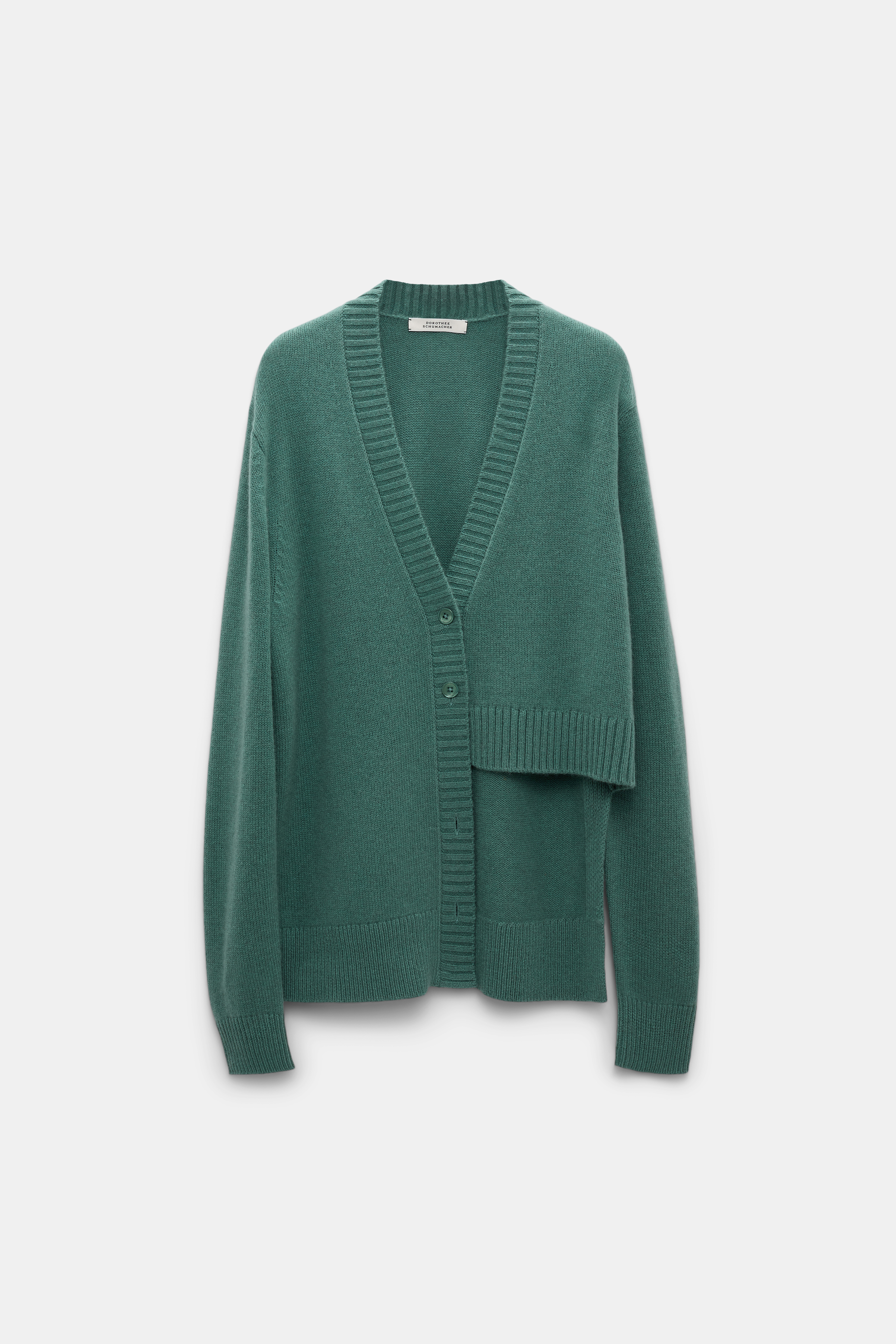 The cardigan has an asymmetric front with buttons for multiple ways to style.