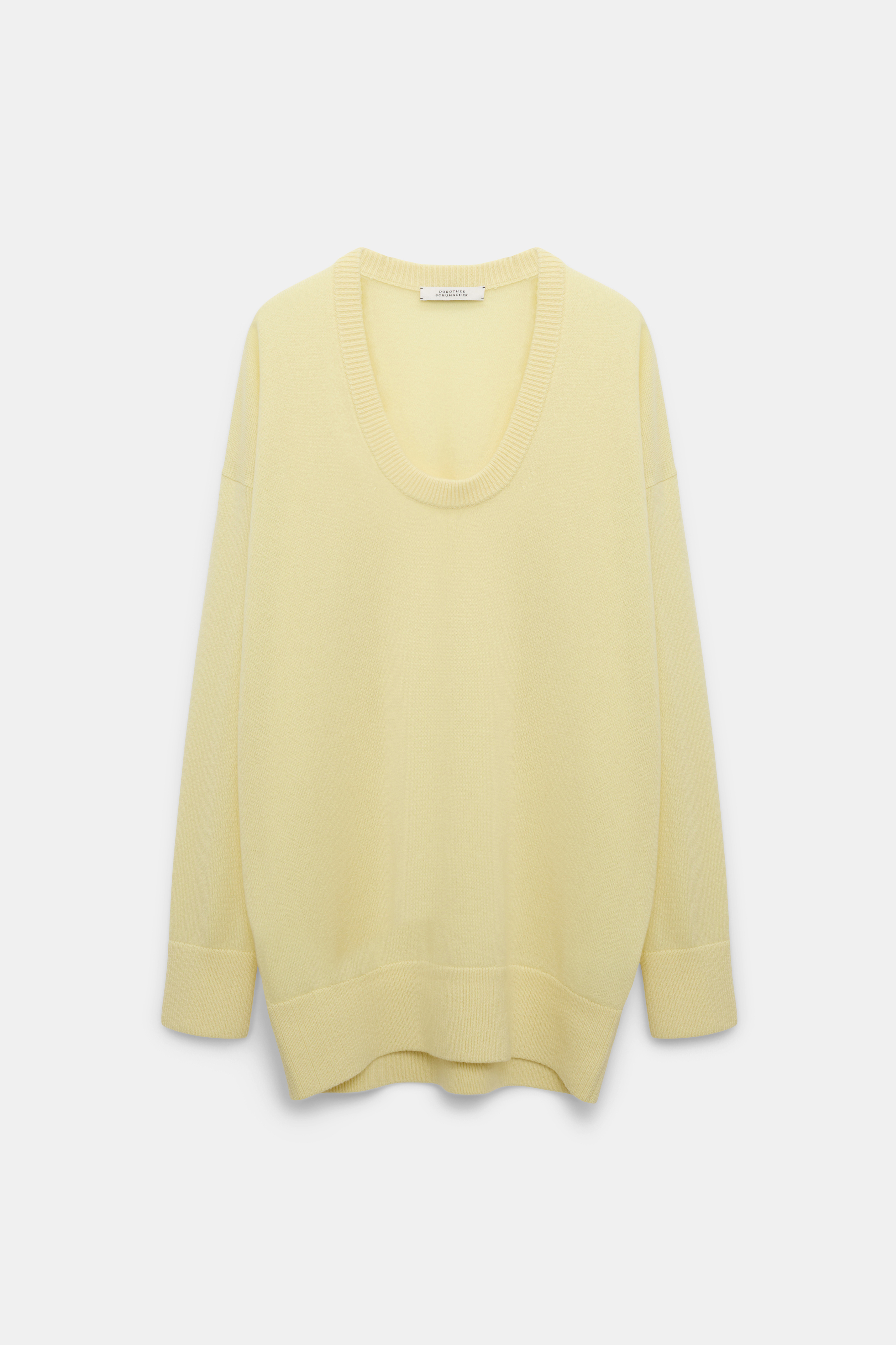 The pullover is knit in a Merino-cashmere blend and has a U-neckline.