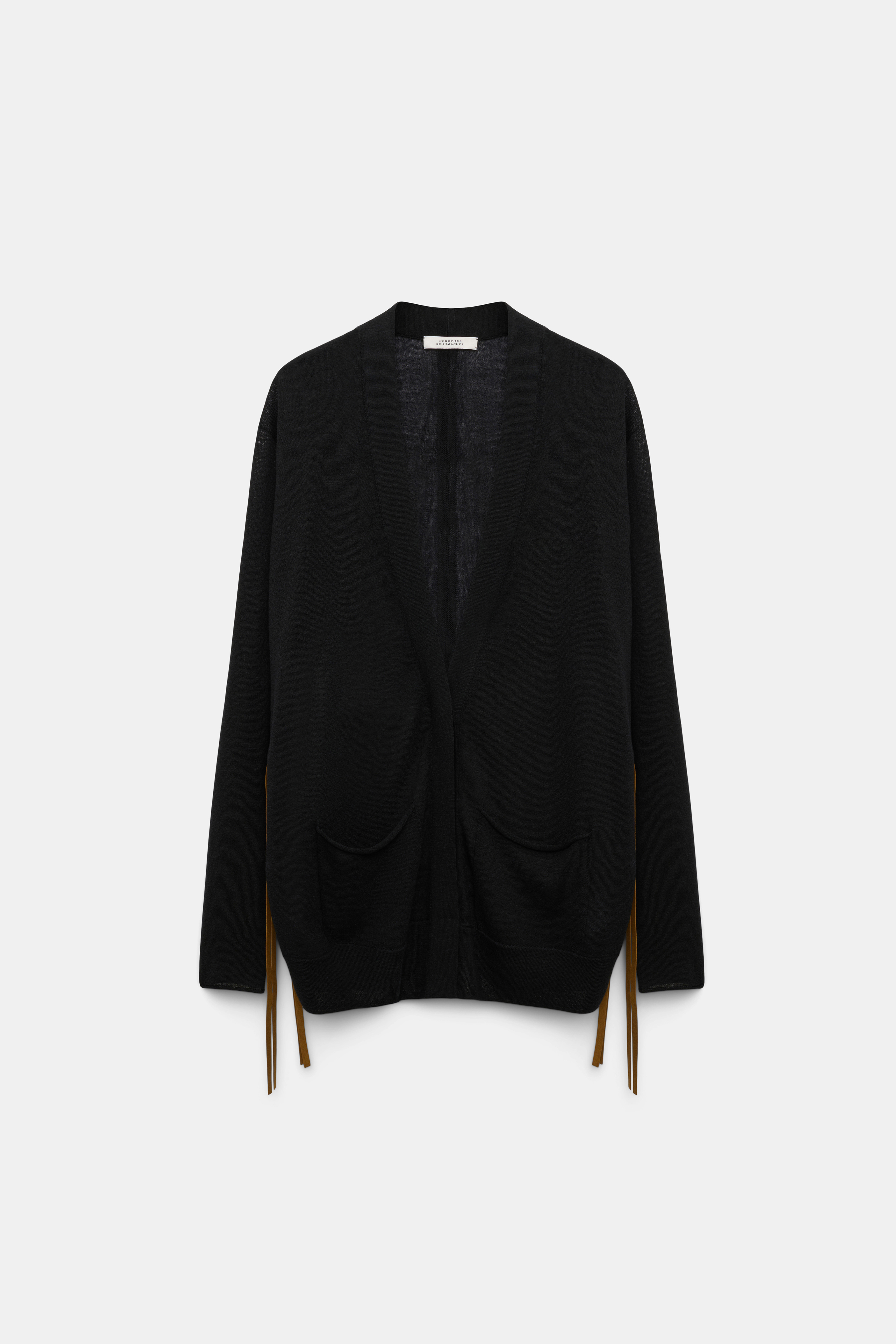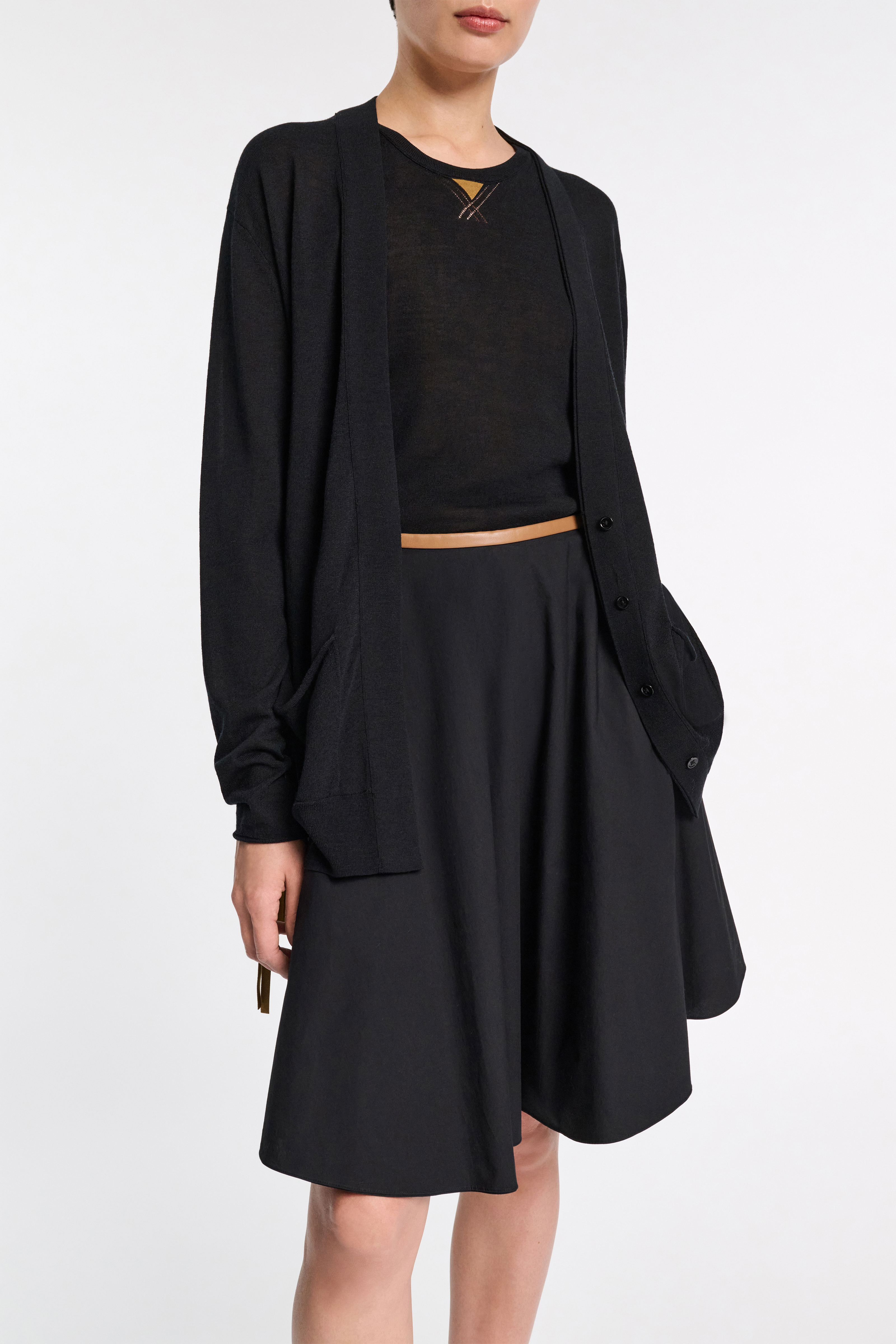 The knit cardigan is made from a soft wool-cotton blend and has a V-neckline.