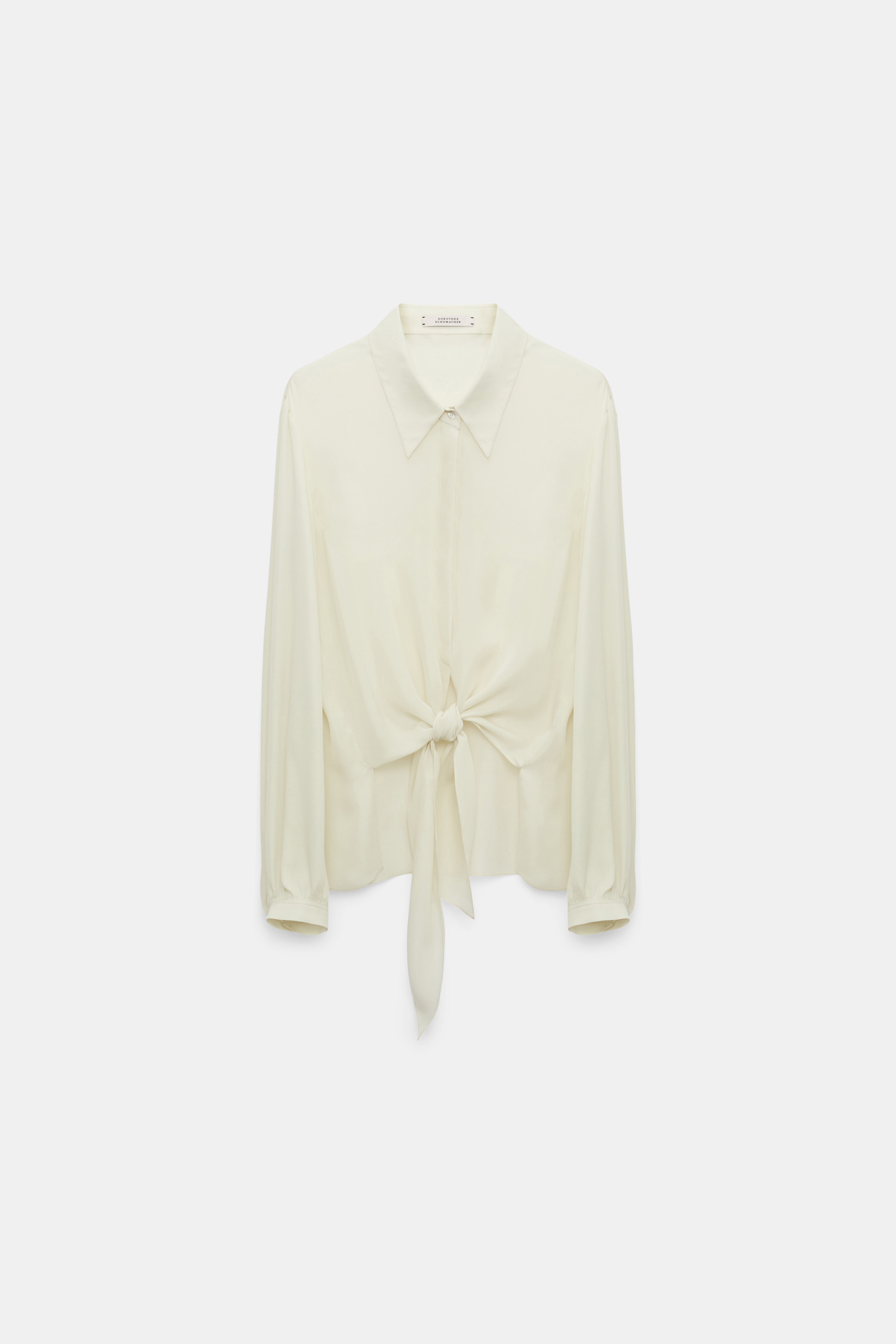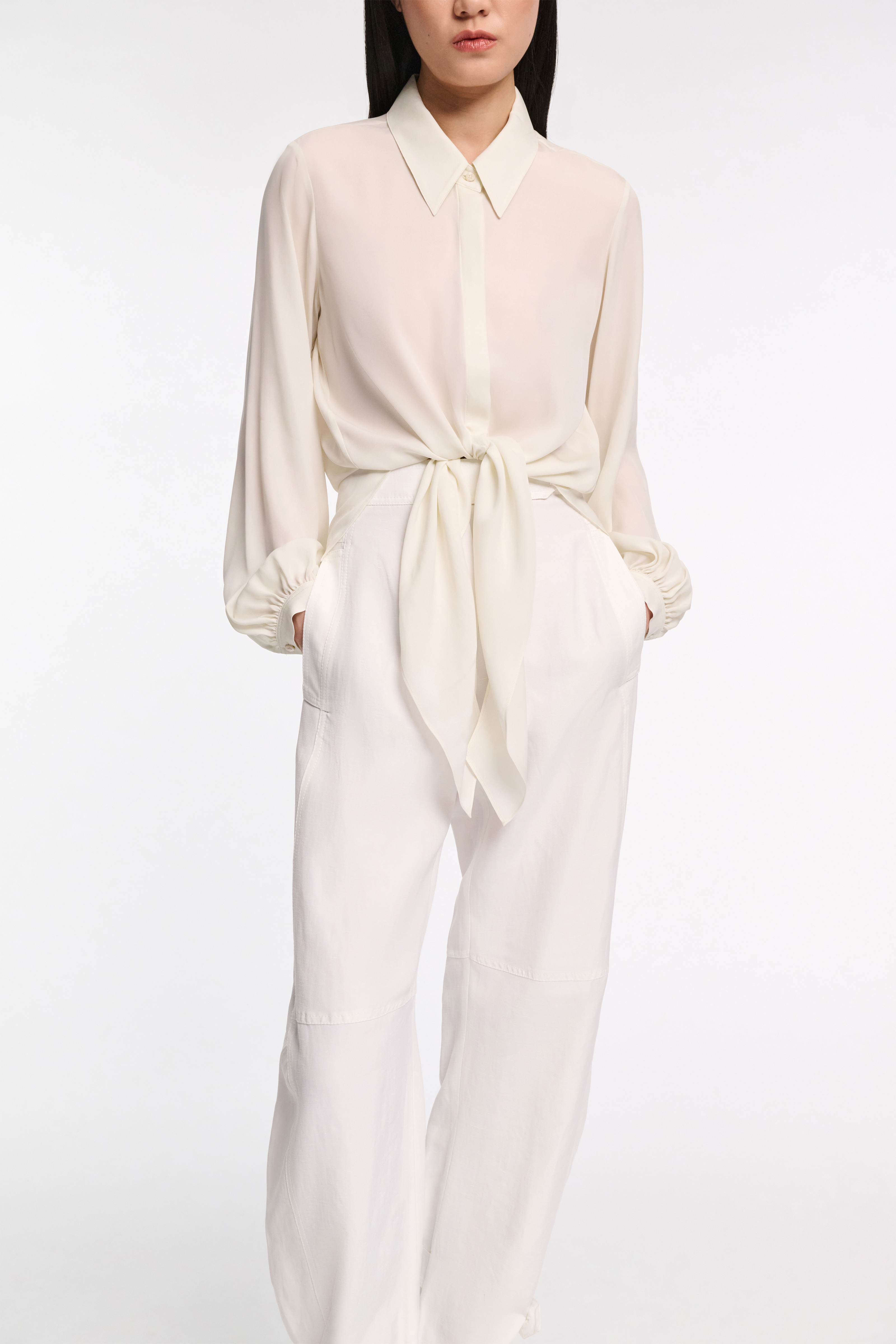 The blouse has causal volume in the body and loose long sleeves with fitted button cuffs.