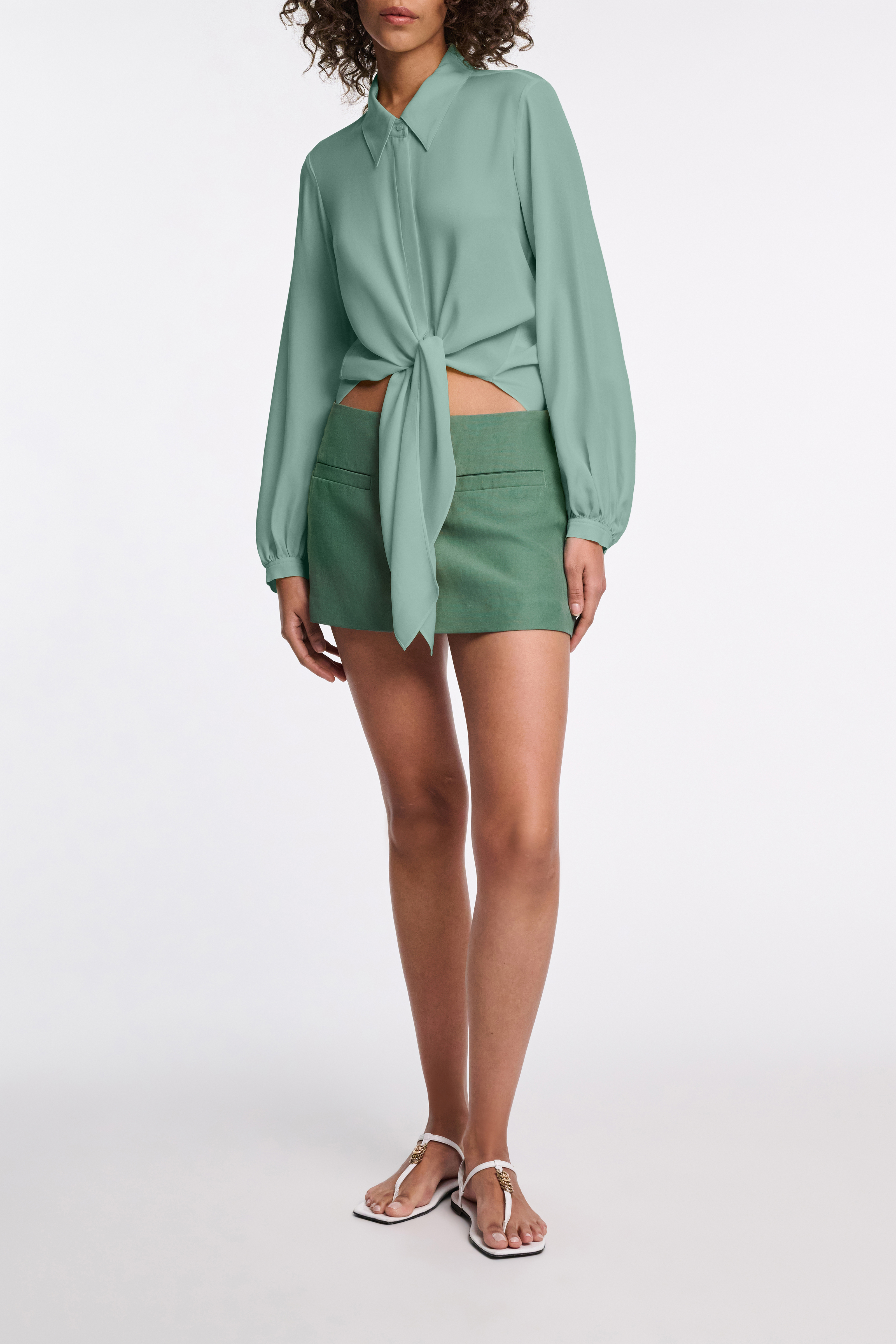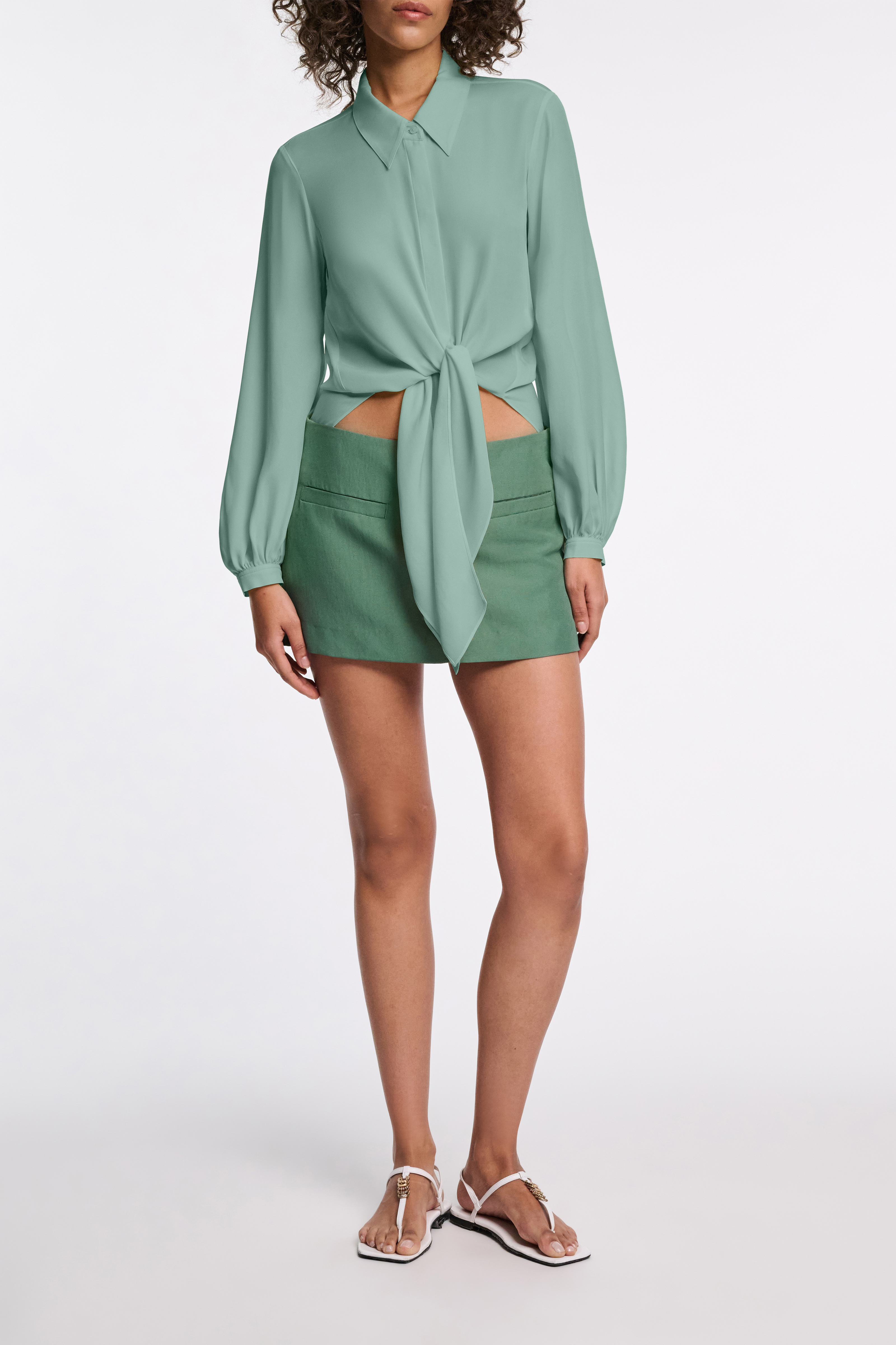 The blouse has causal volume in the body and loose long sleeves with fitted button cuffs.