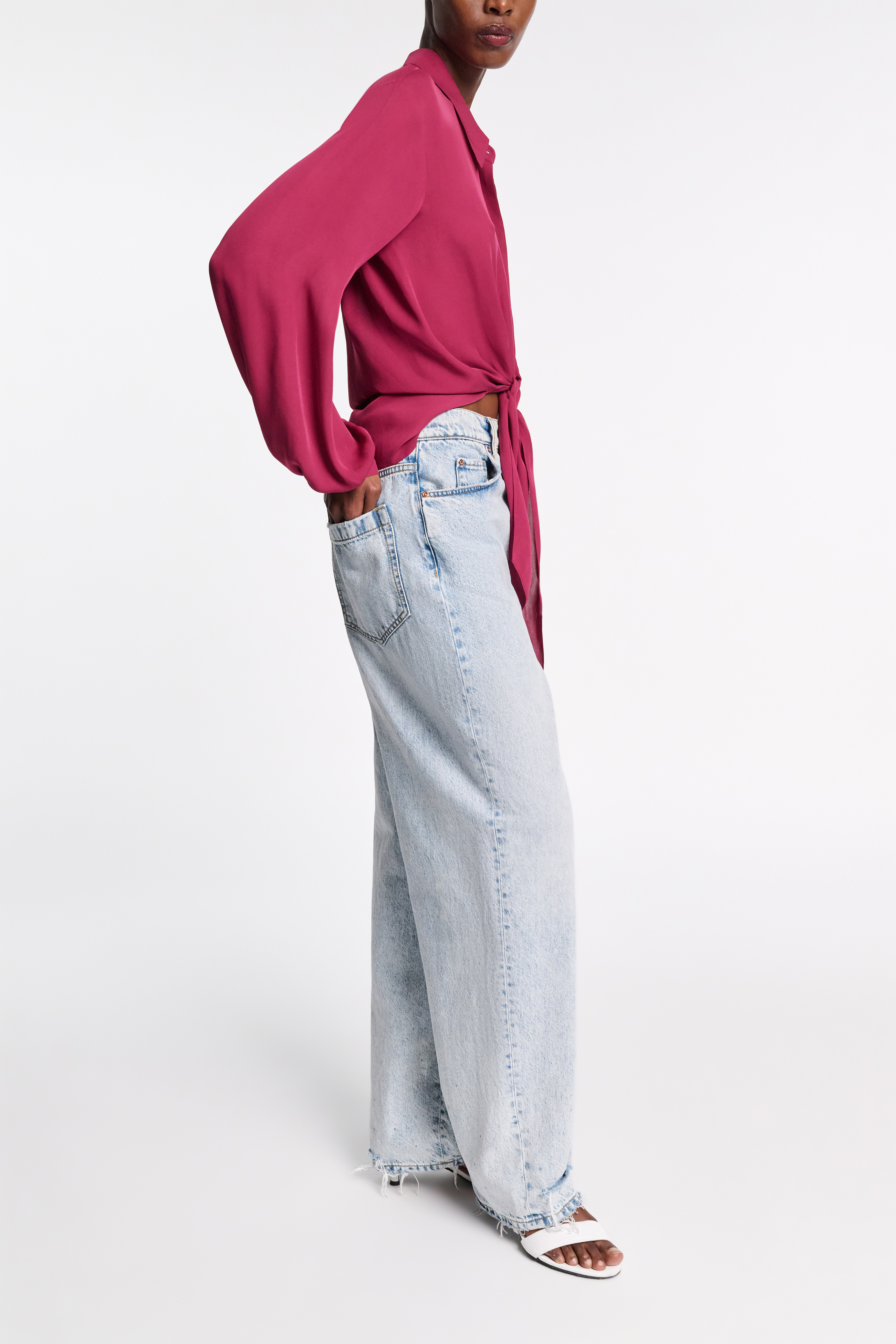 The blouse has causal volume in the body and loose long sleeves with fitted button cuffs.