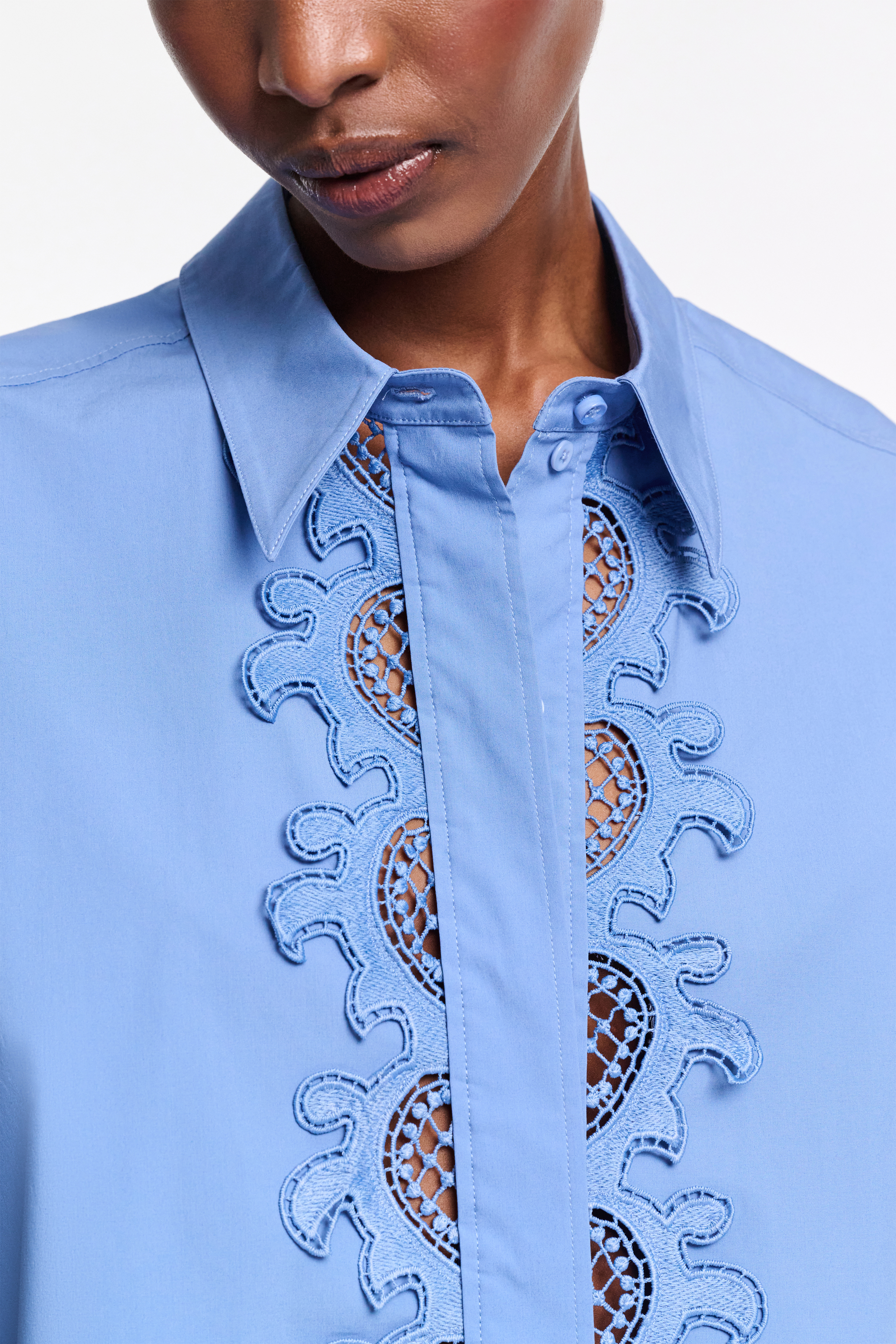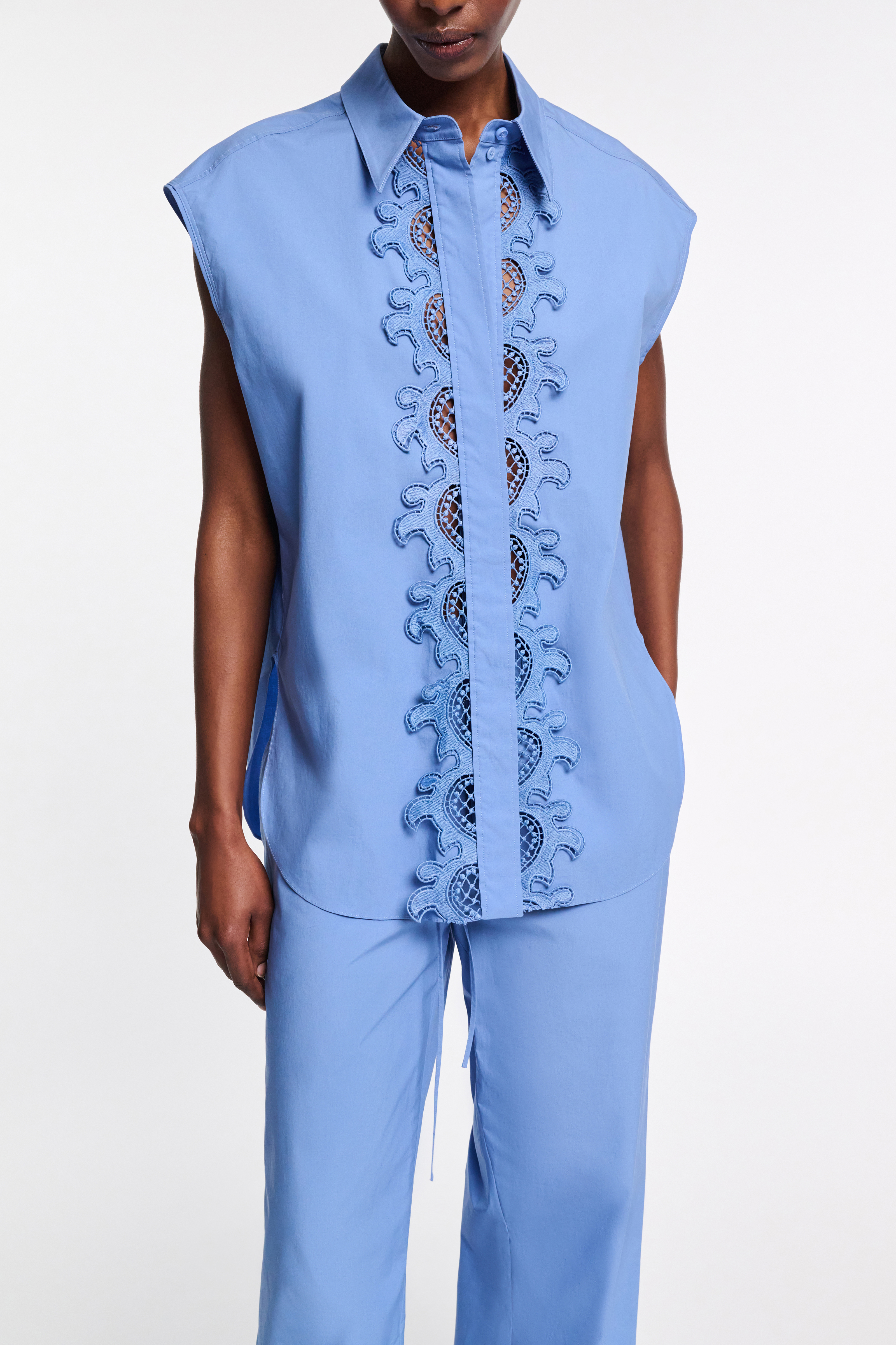 The sleeveless shirt is made from cotton poplin and has lace applique on the front.