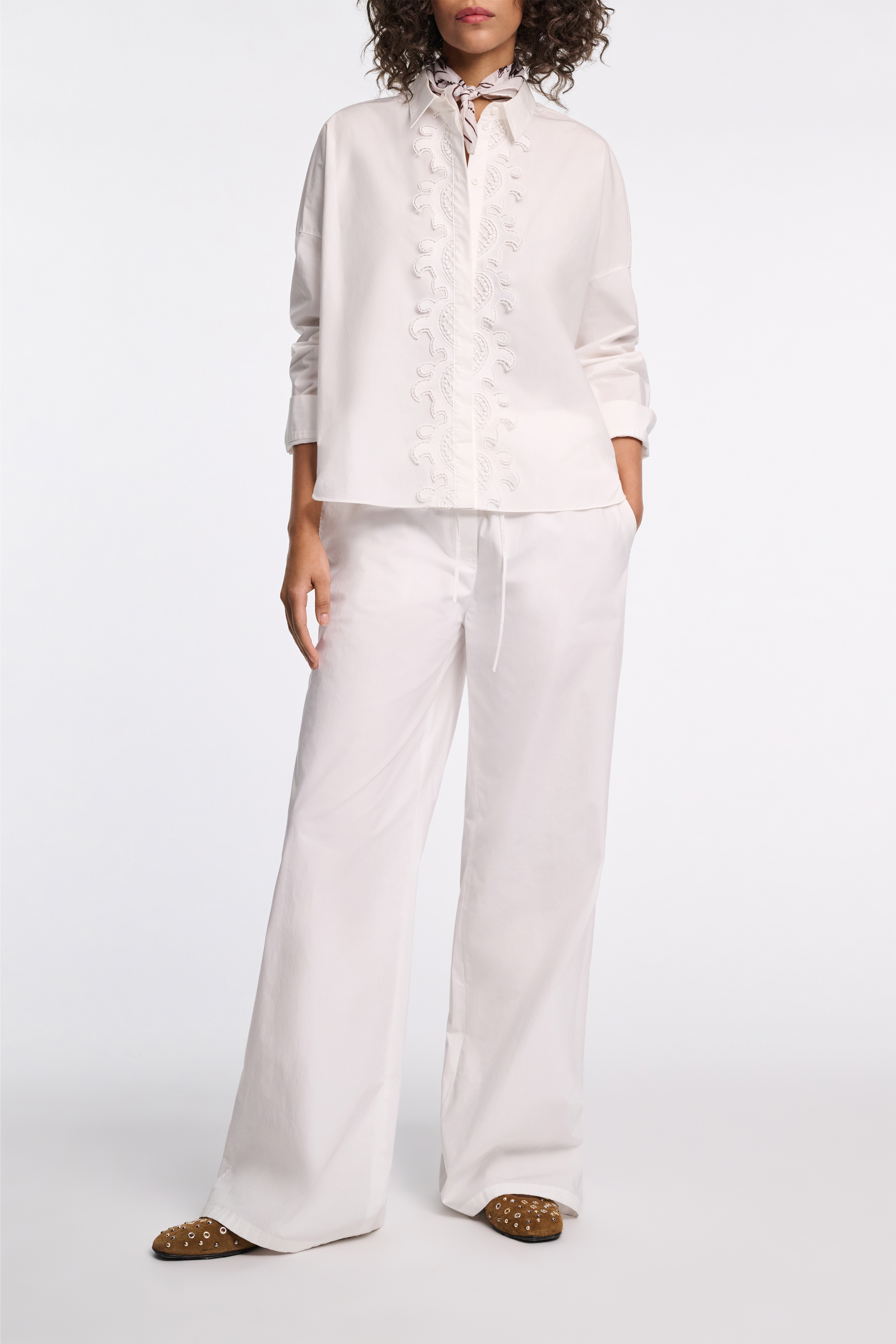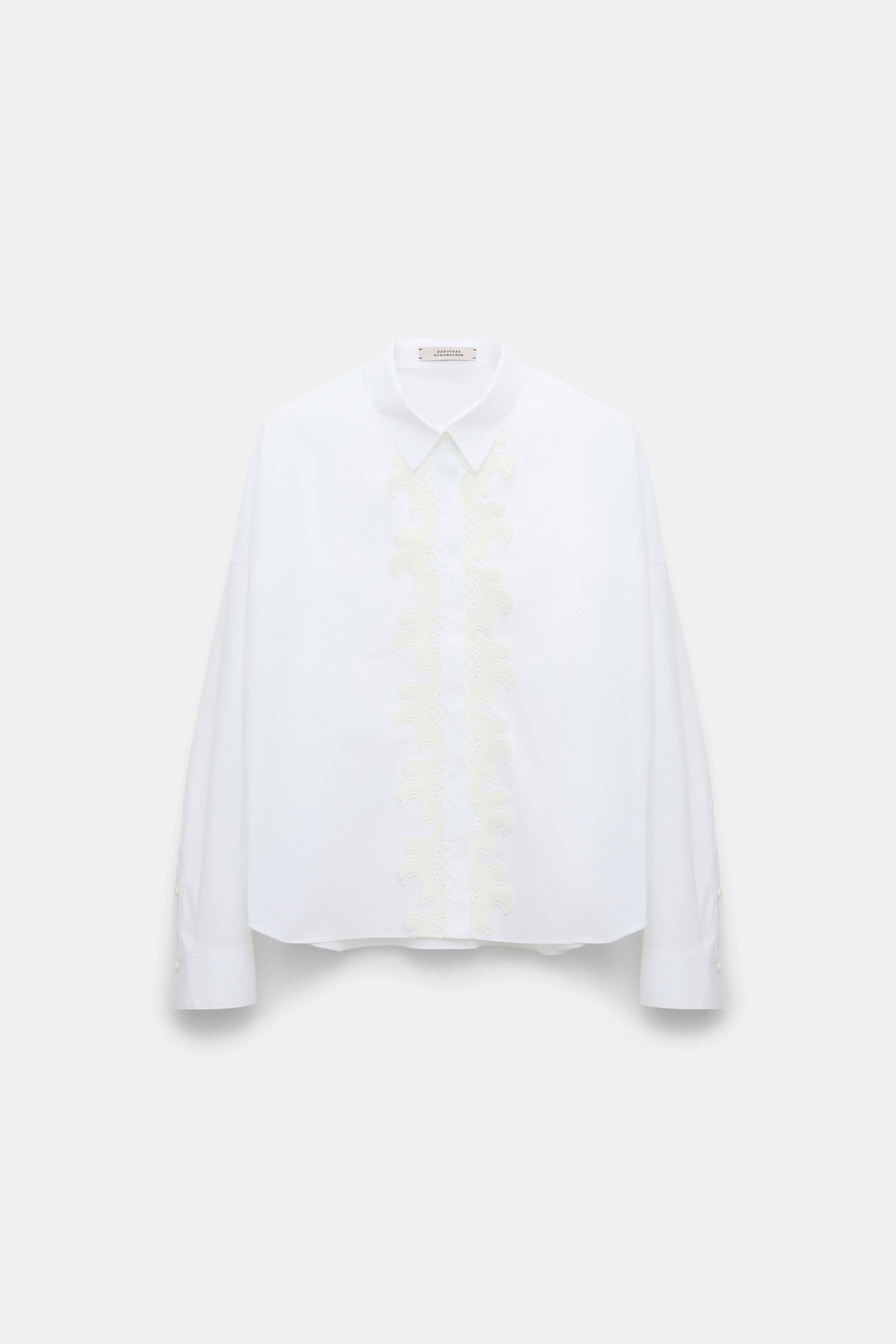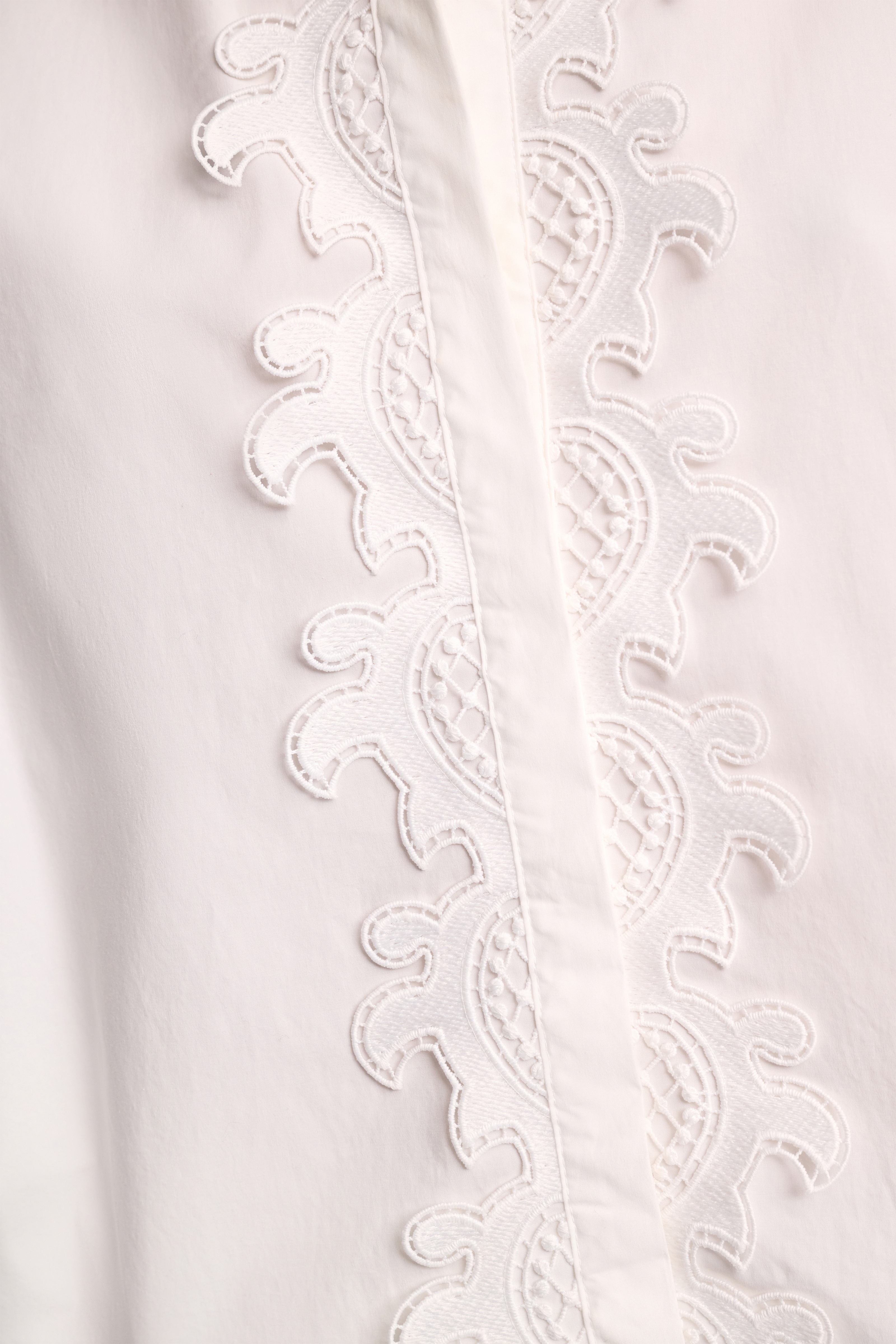 The boxy shirt is made from cotton poplin and has lace applique on the front.