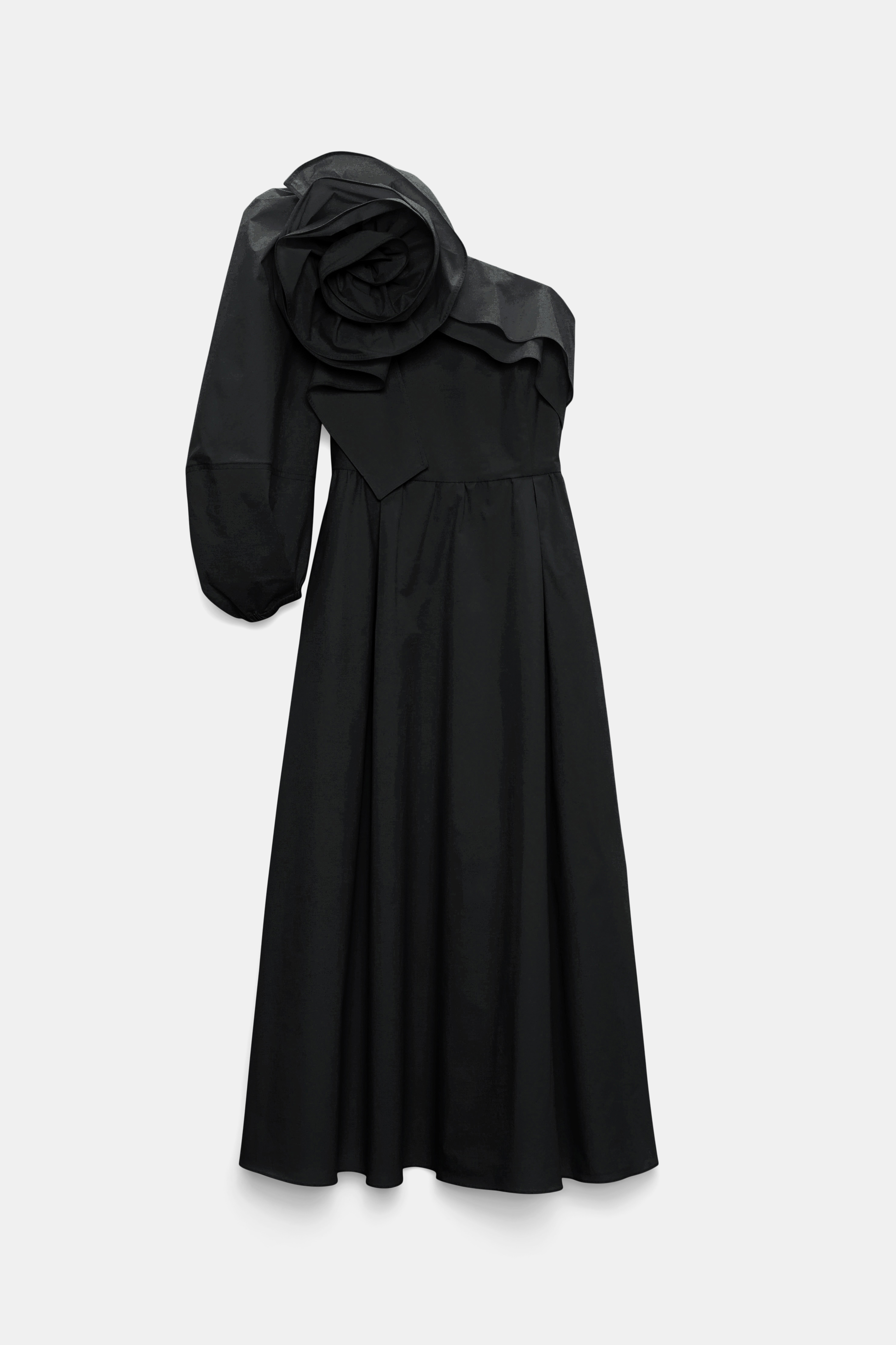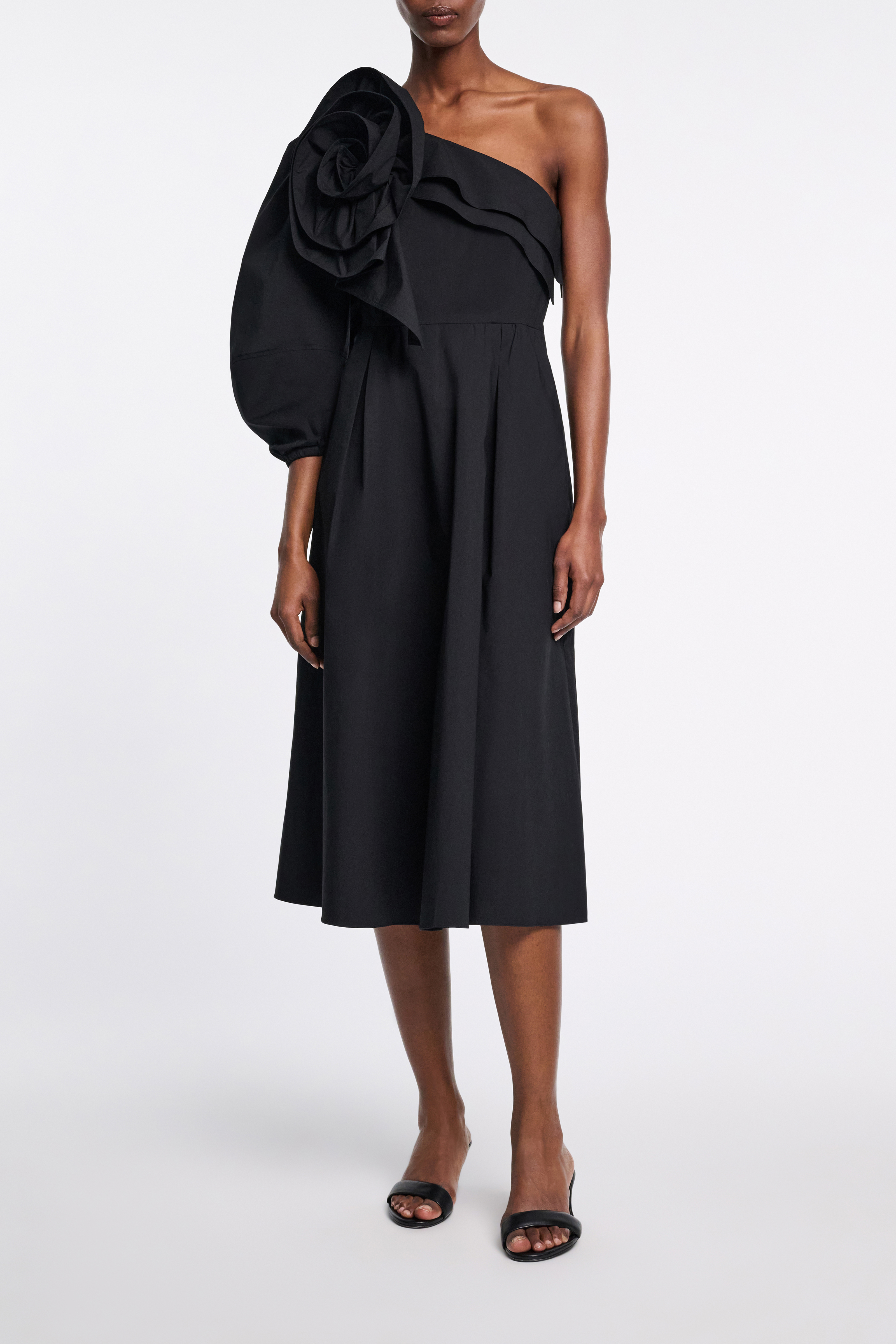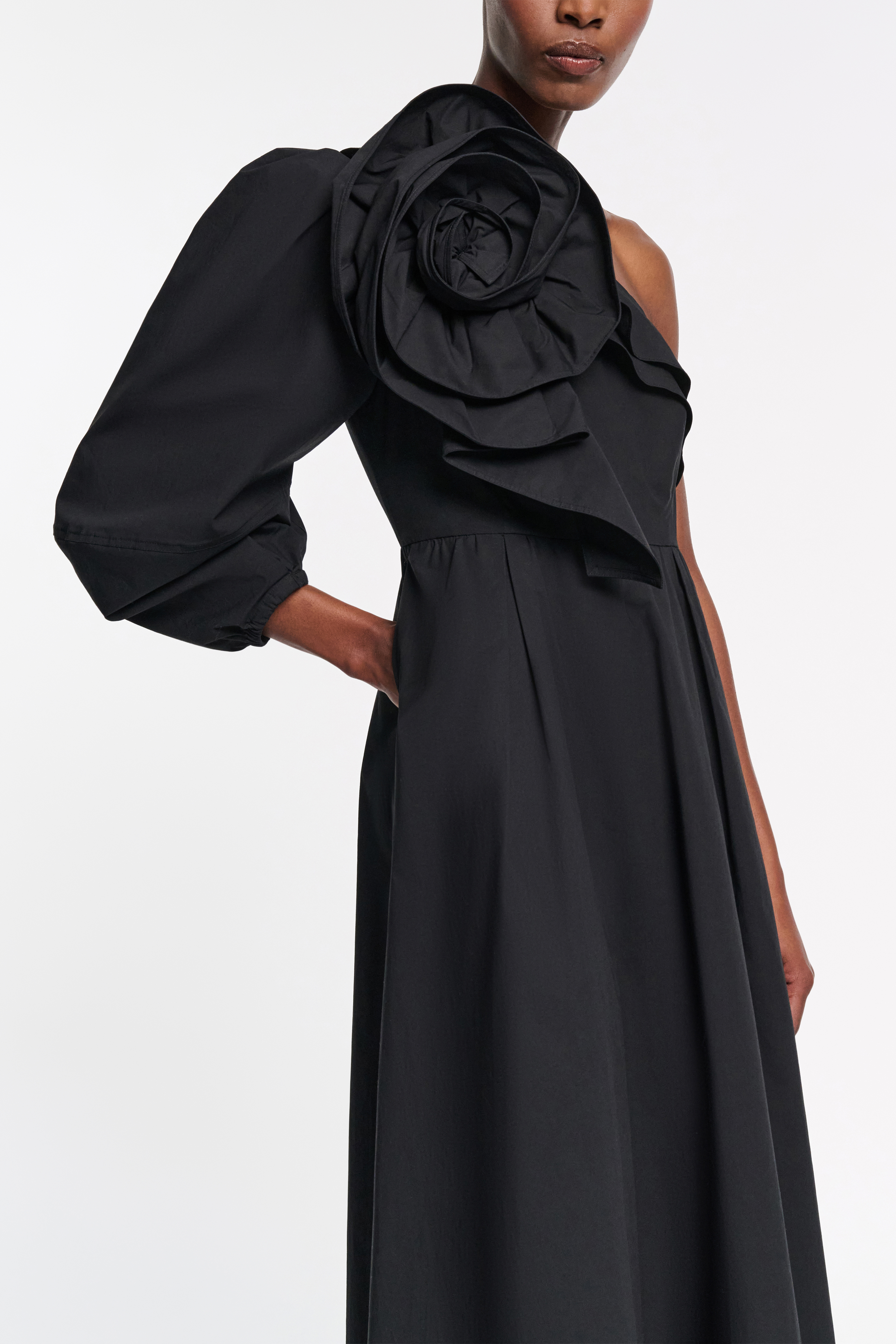 The midi dress is made from cotton poplin and has a single voluminous sleeve.