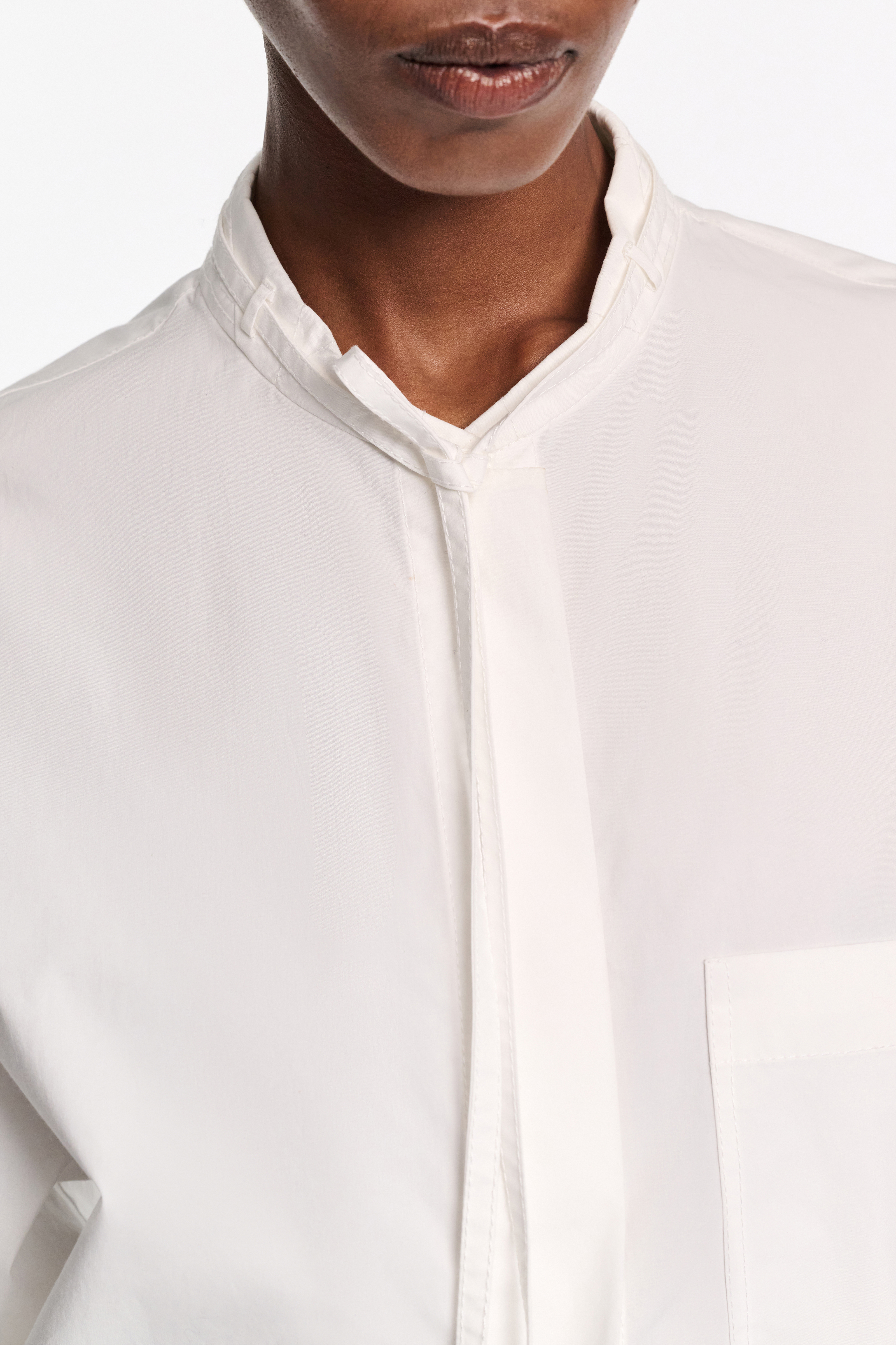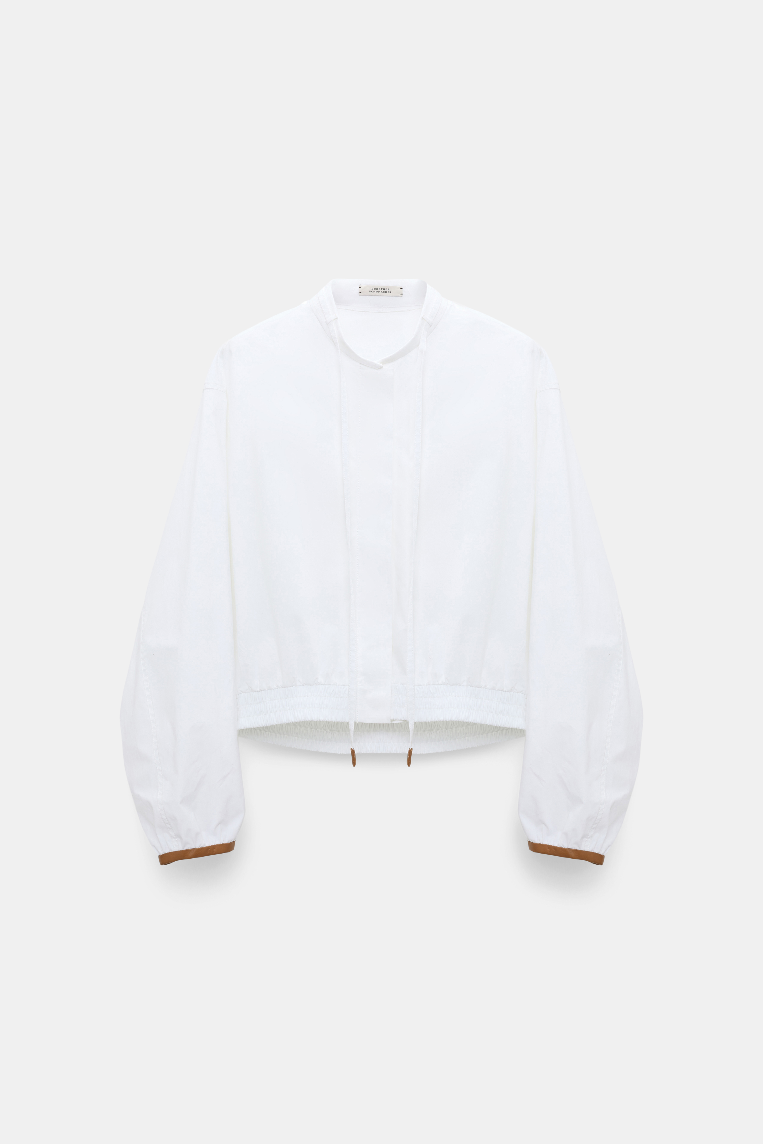 The oversized cotton poplin blouson has a stand collar and tie with eco leather details.