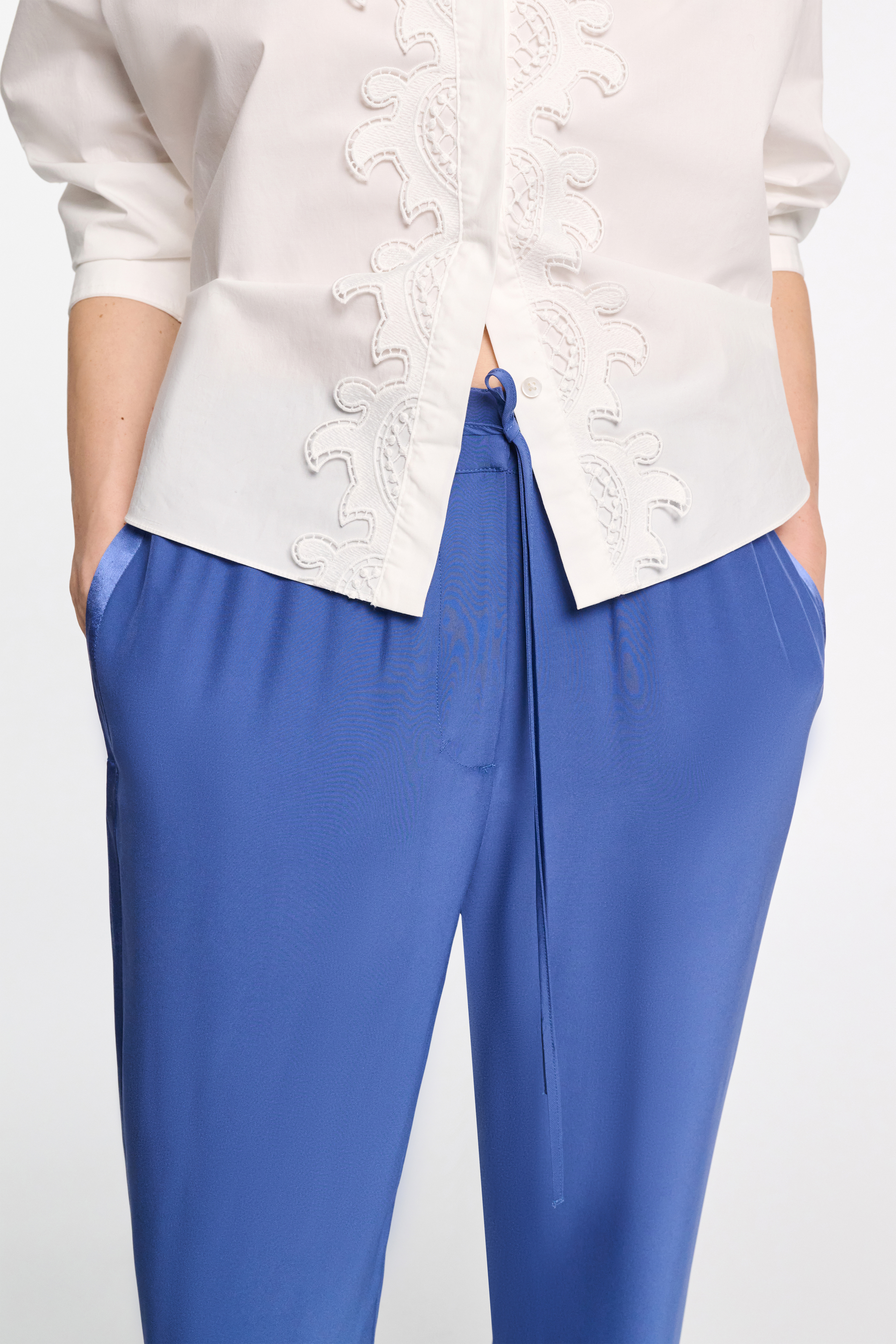 The silk-satin wide leg pants have a relaxed fit and drawstring waist.
