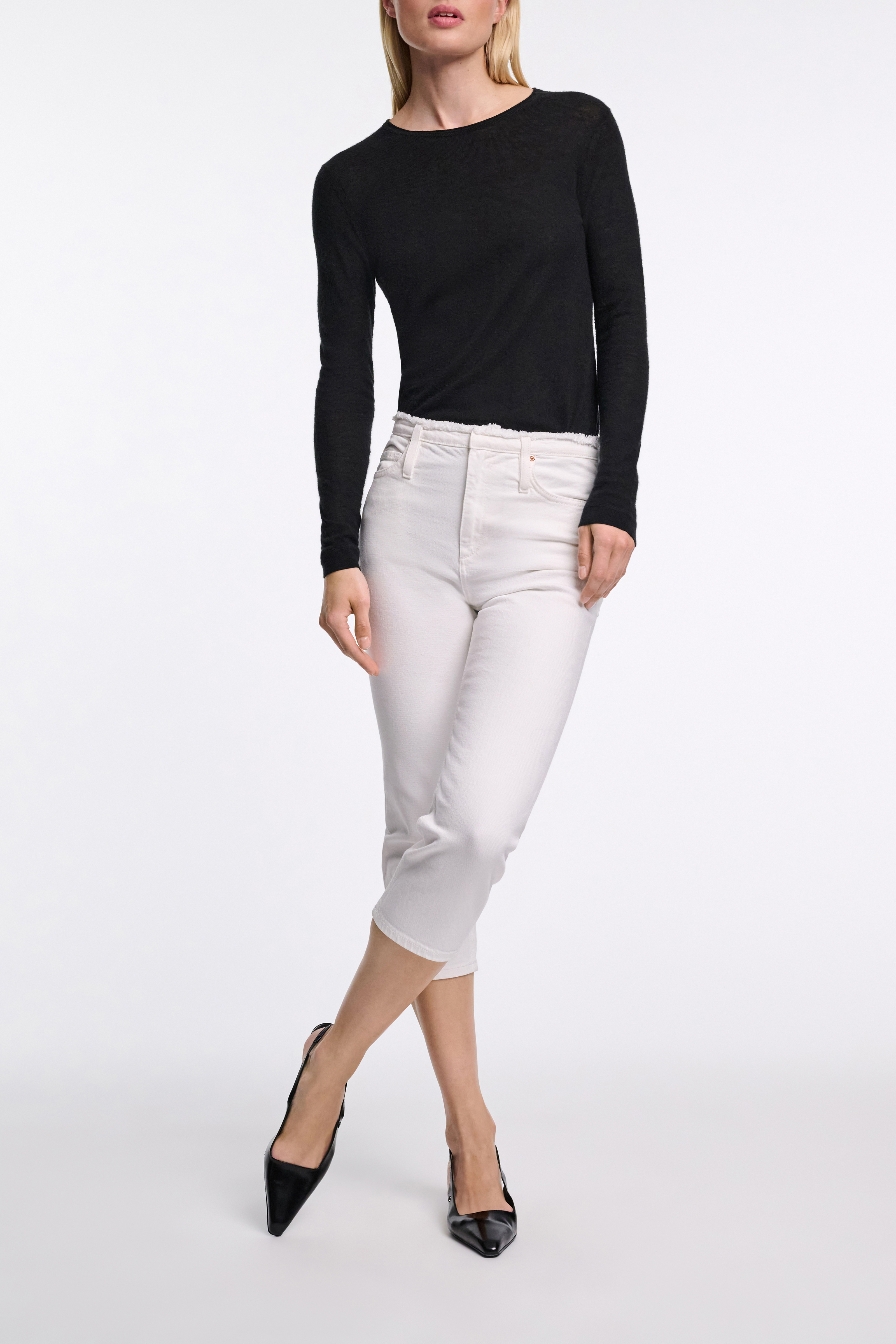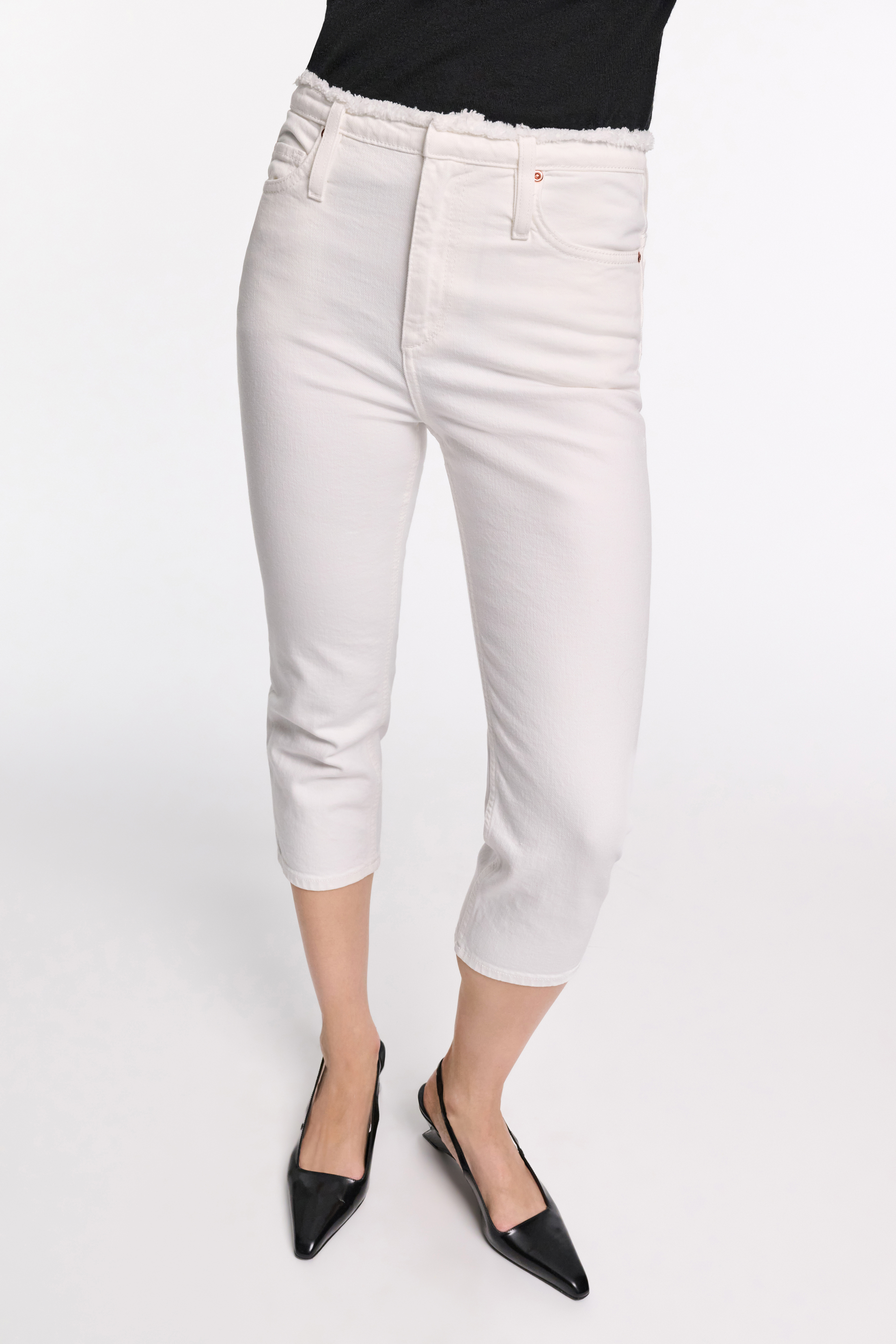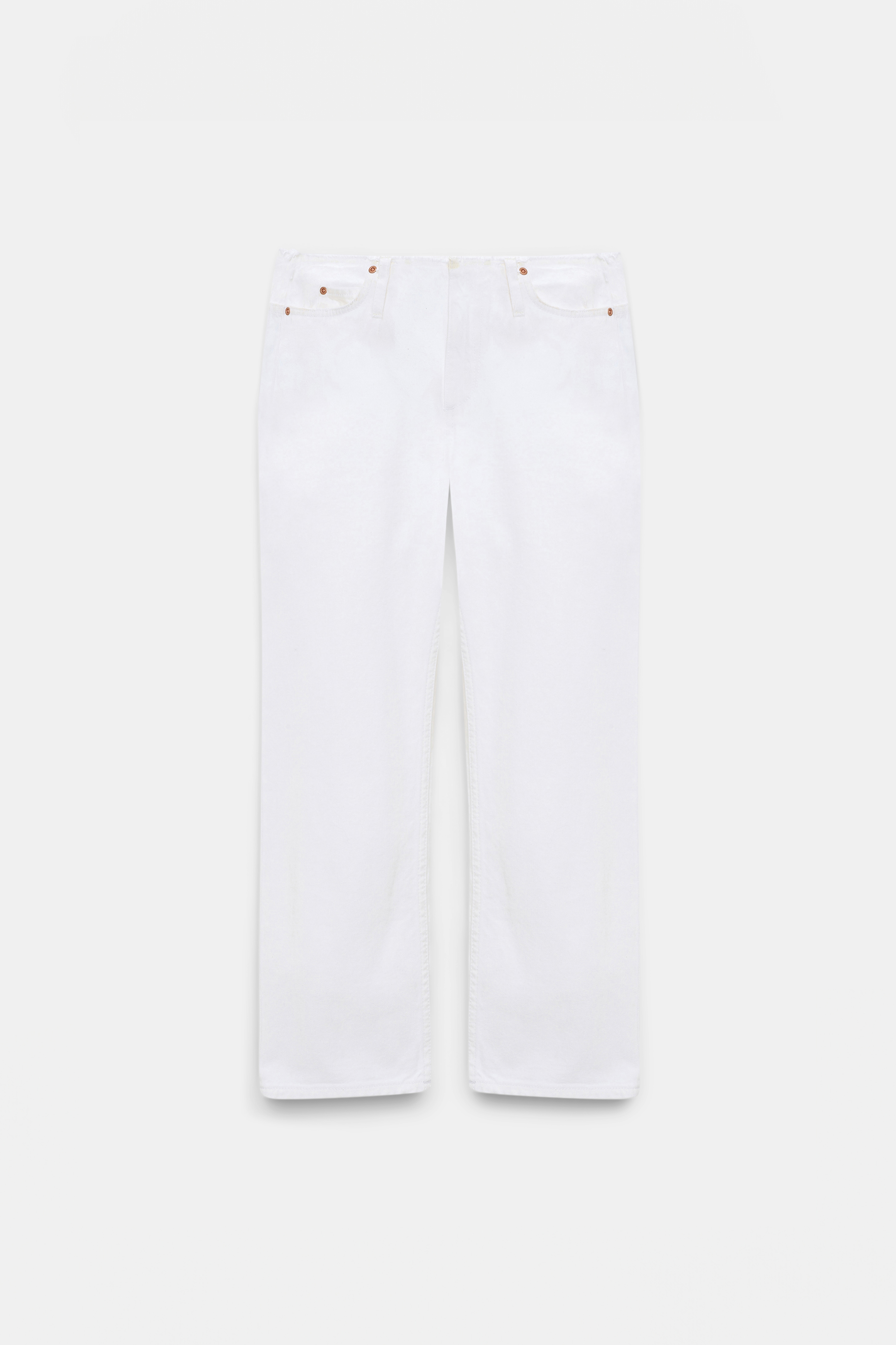 The 5-pocket jeans are fitted and have a narrow frayed waistband.