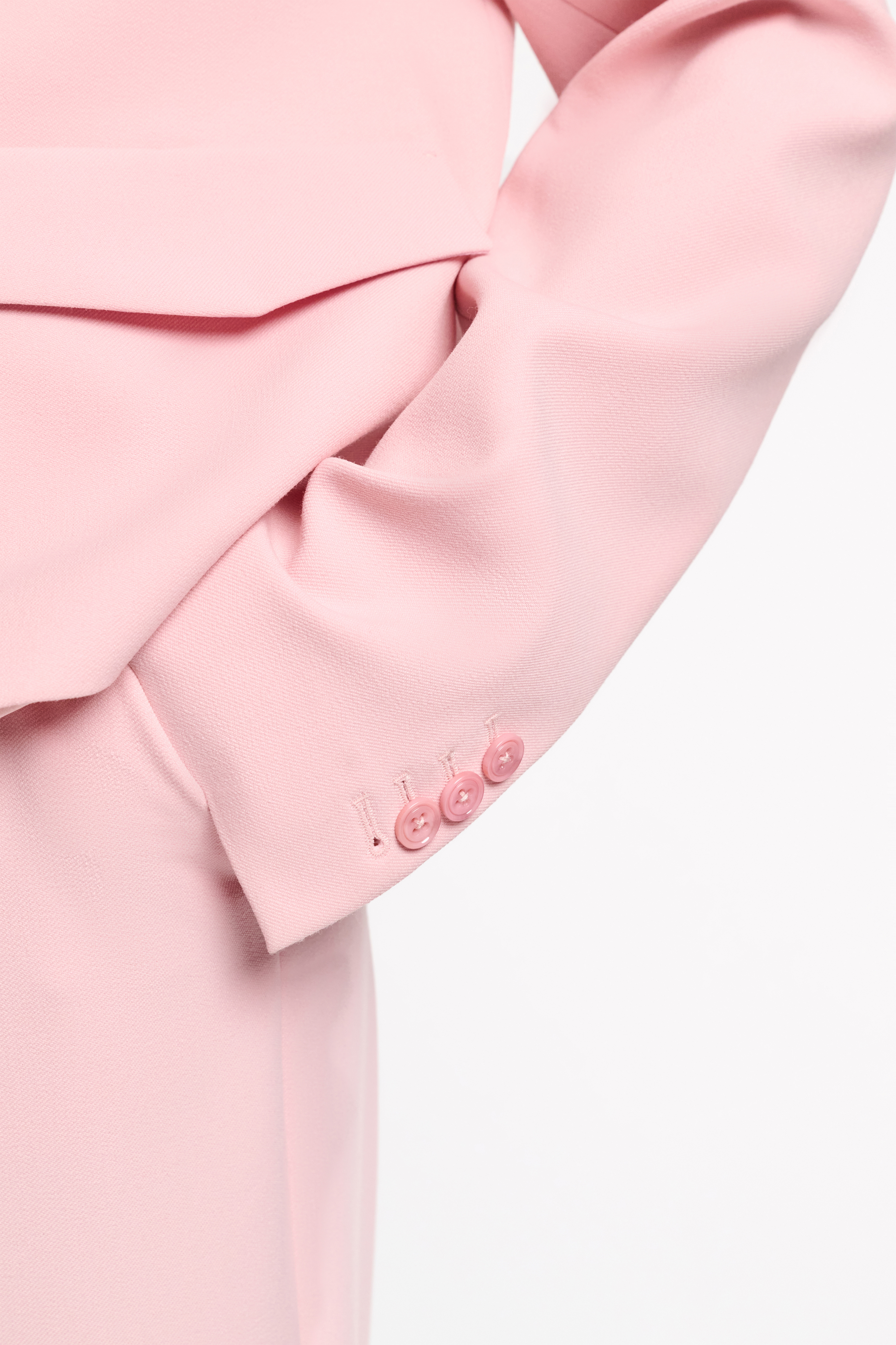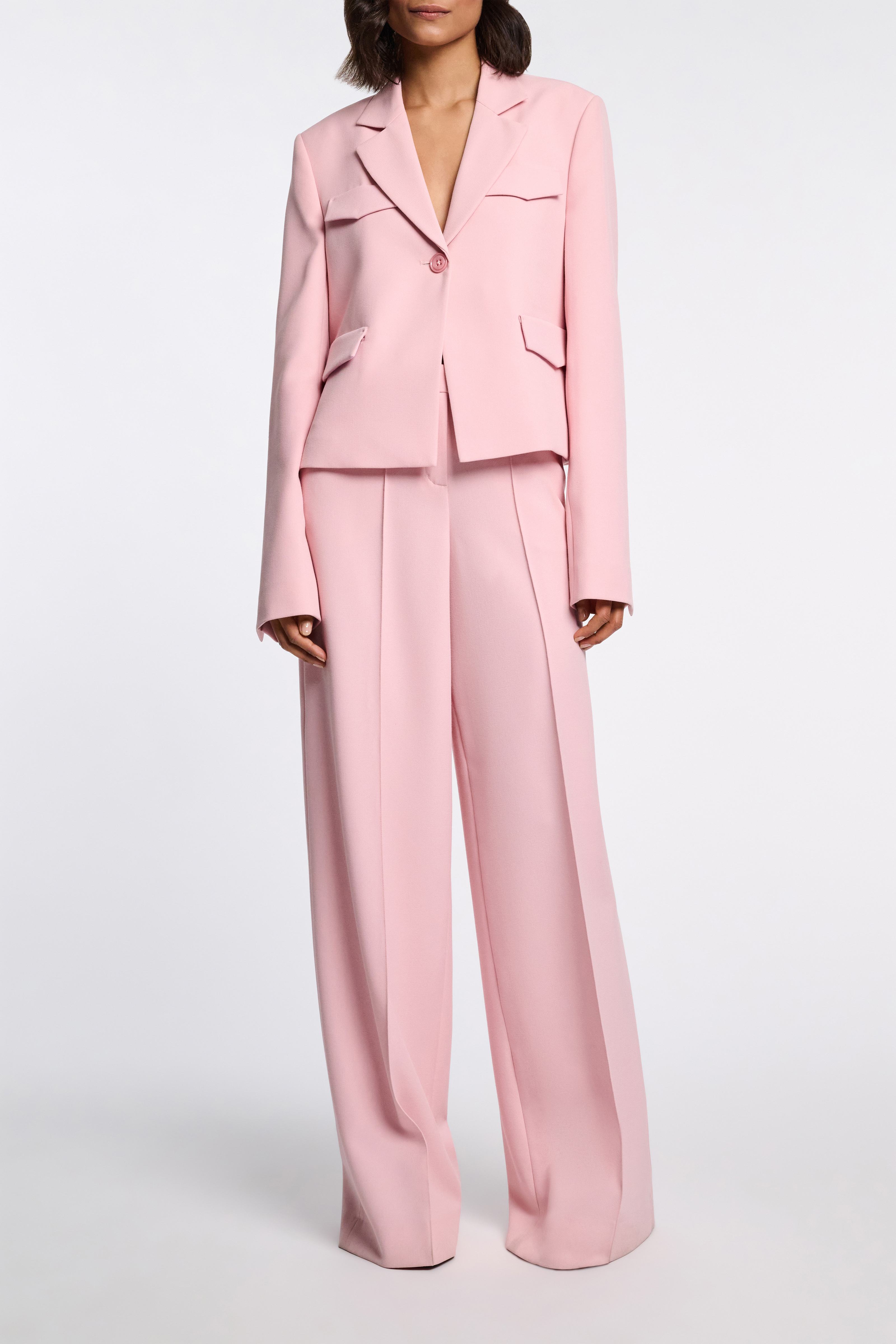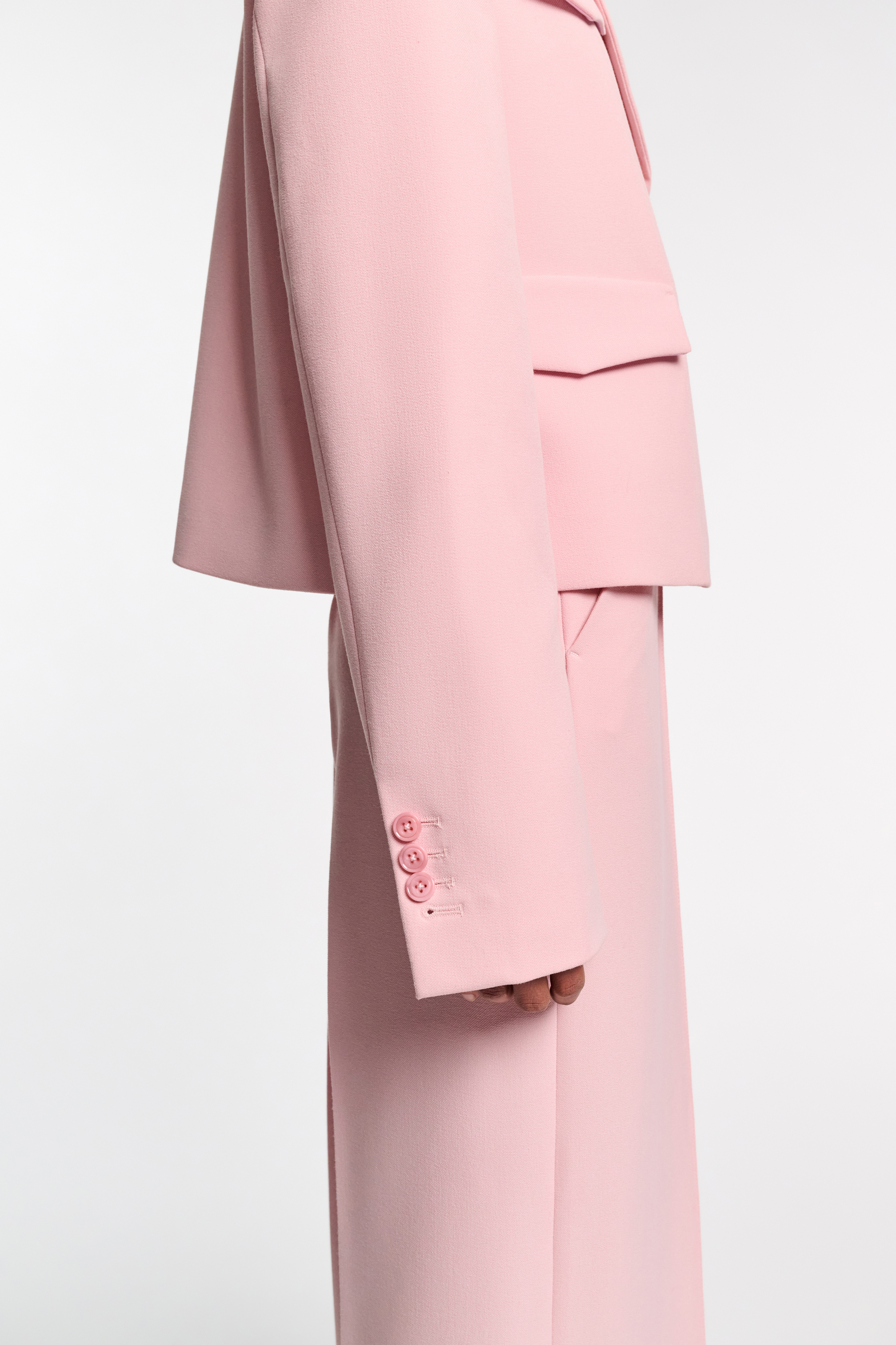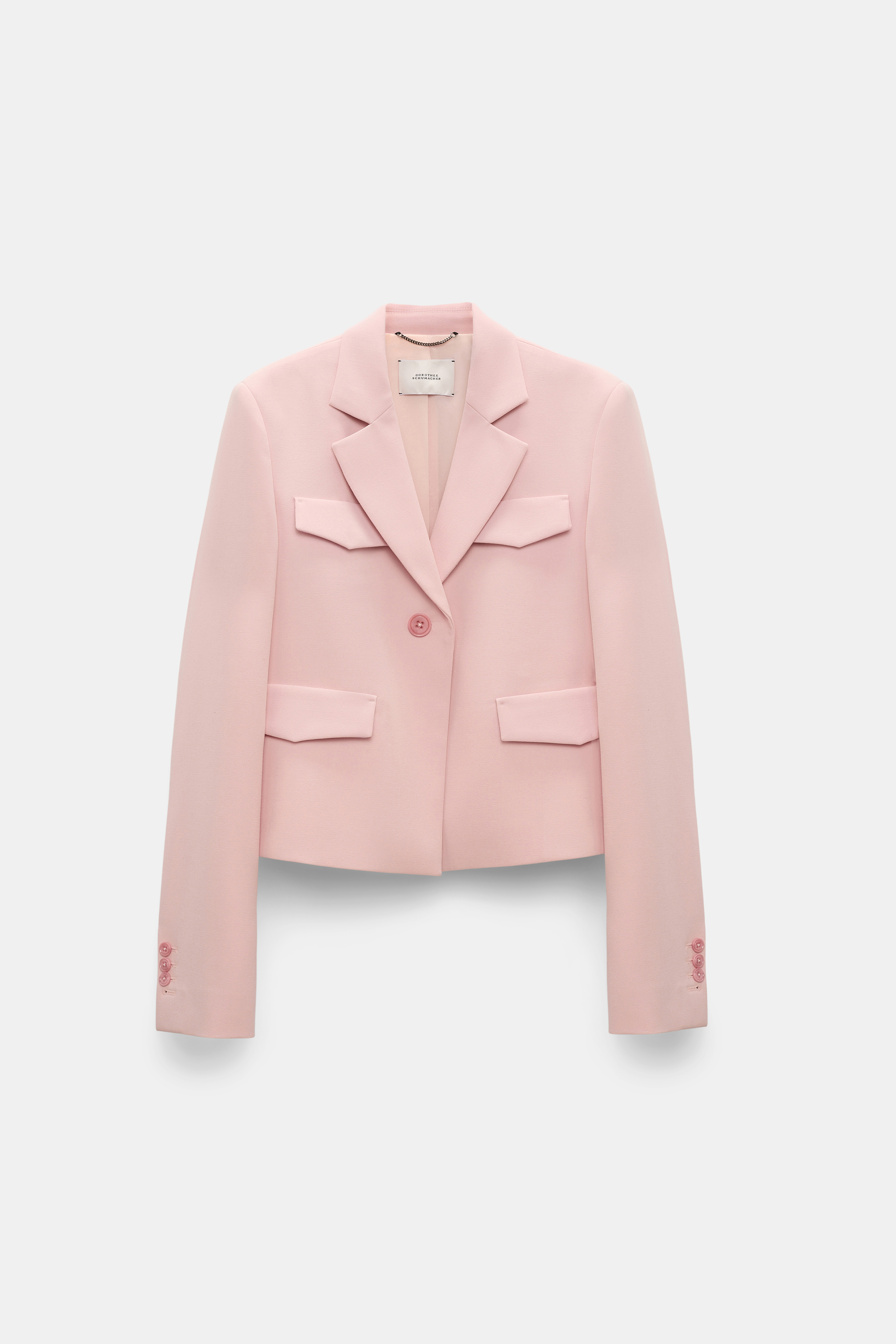 The blazer has a single button closure and can be worn as a suit with the matching pants