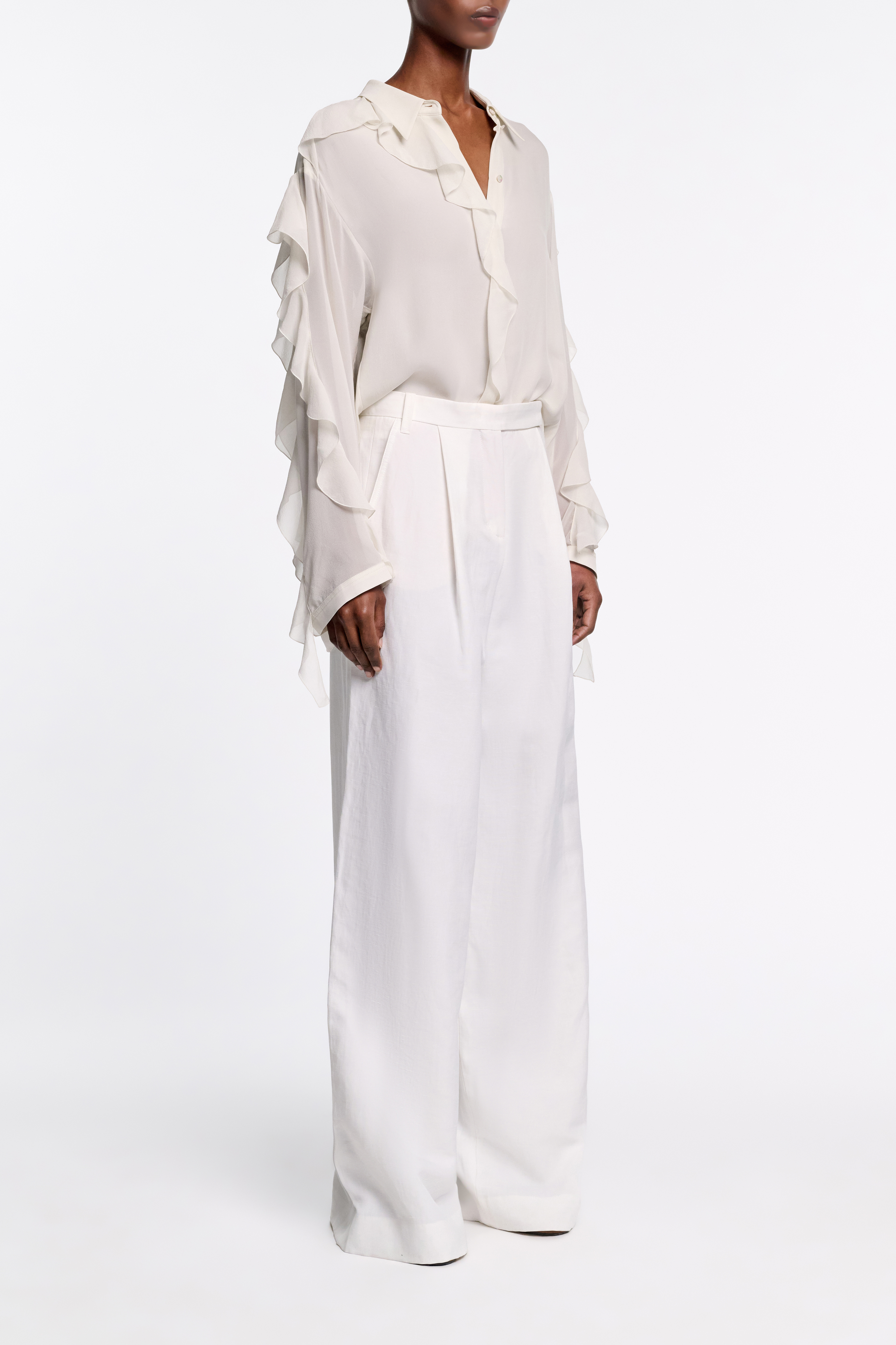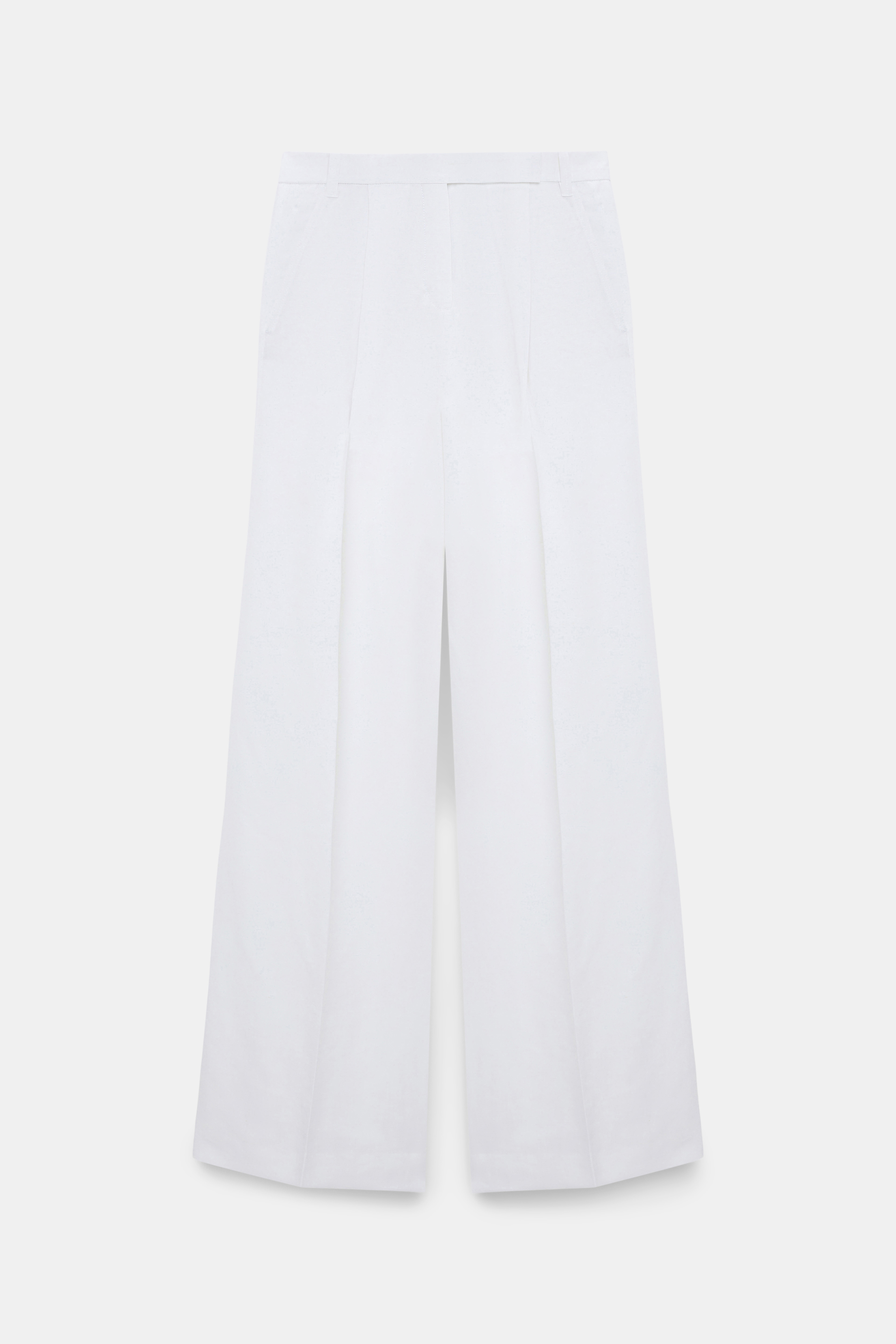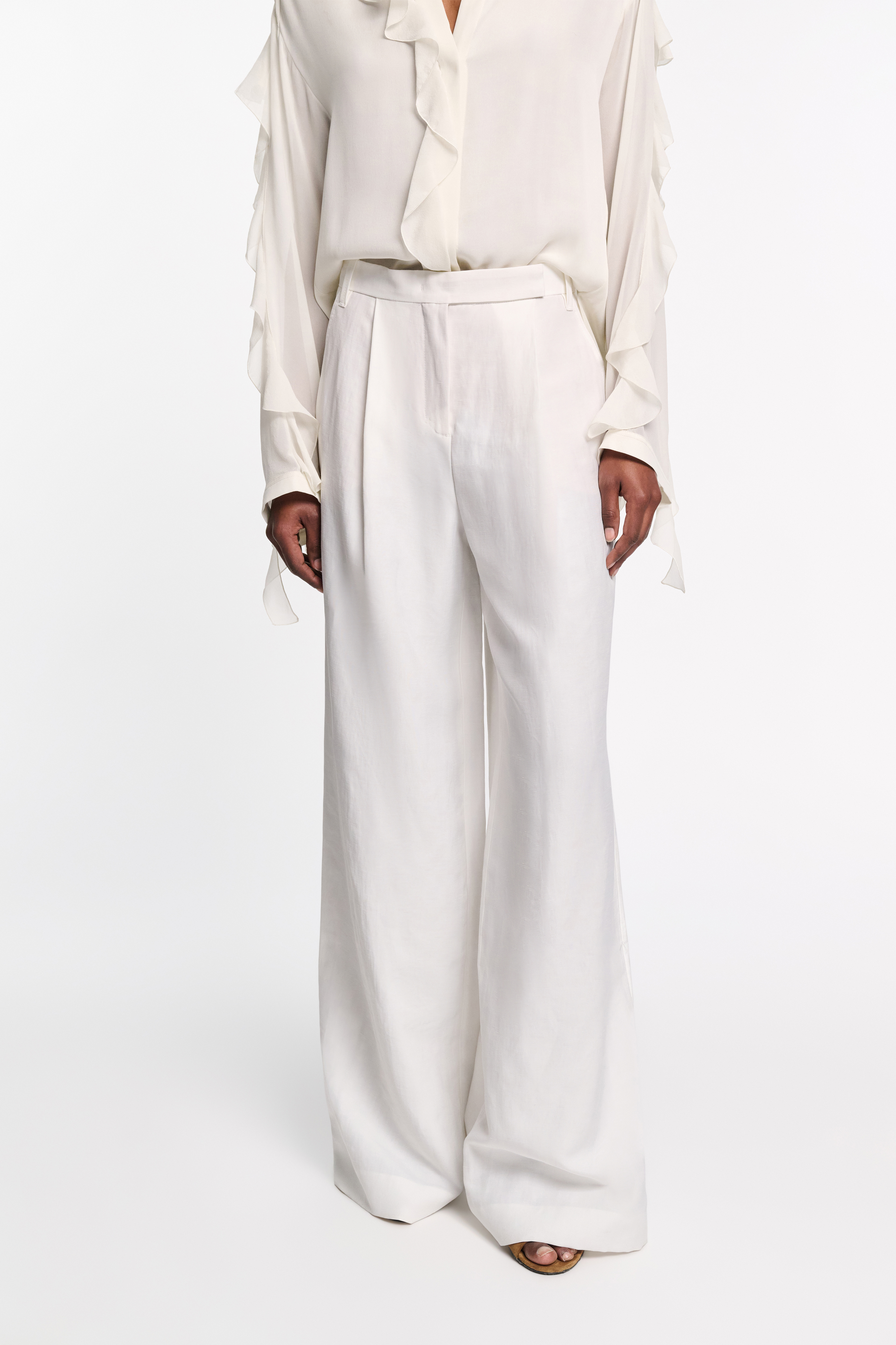 The wide leg pants are made from technical linen and have pressed front pleating.