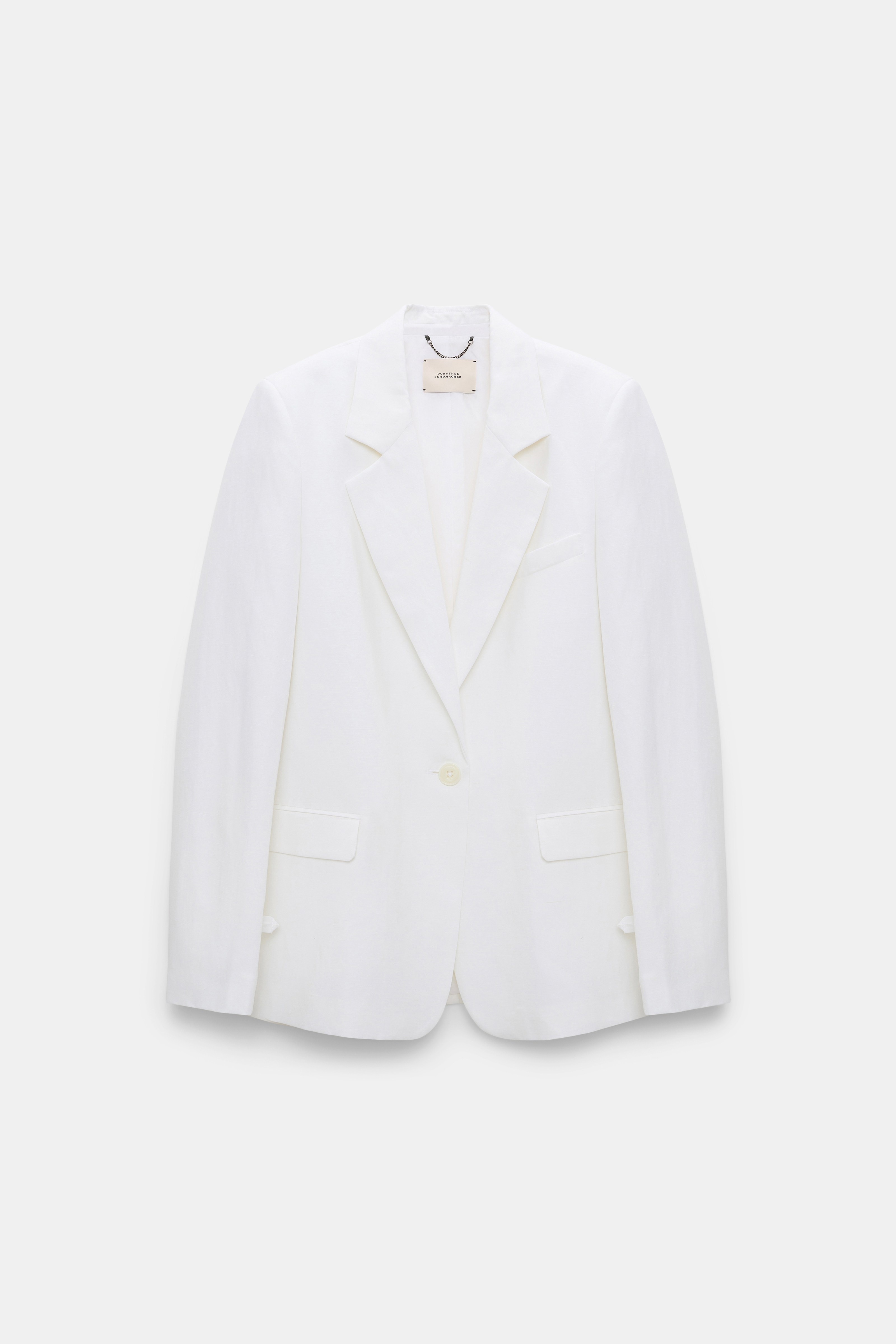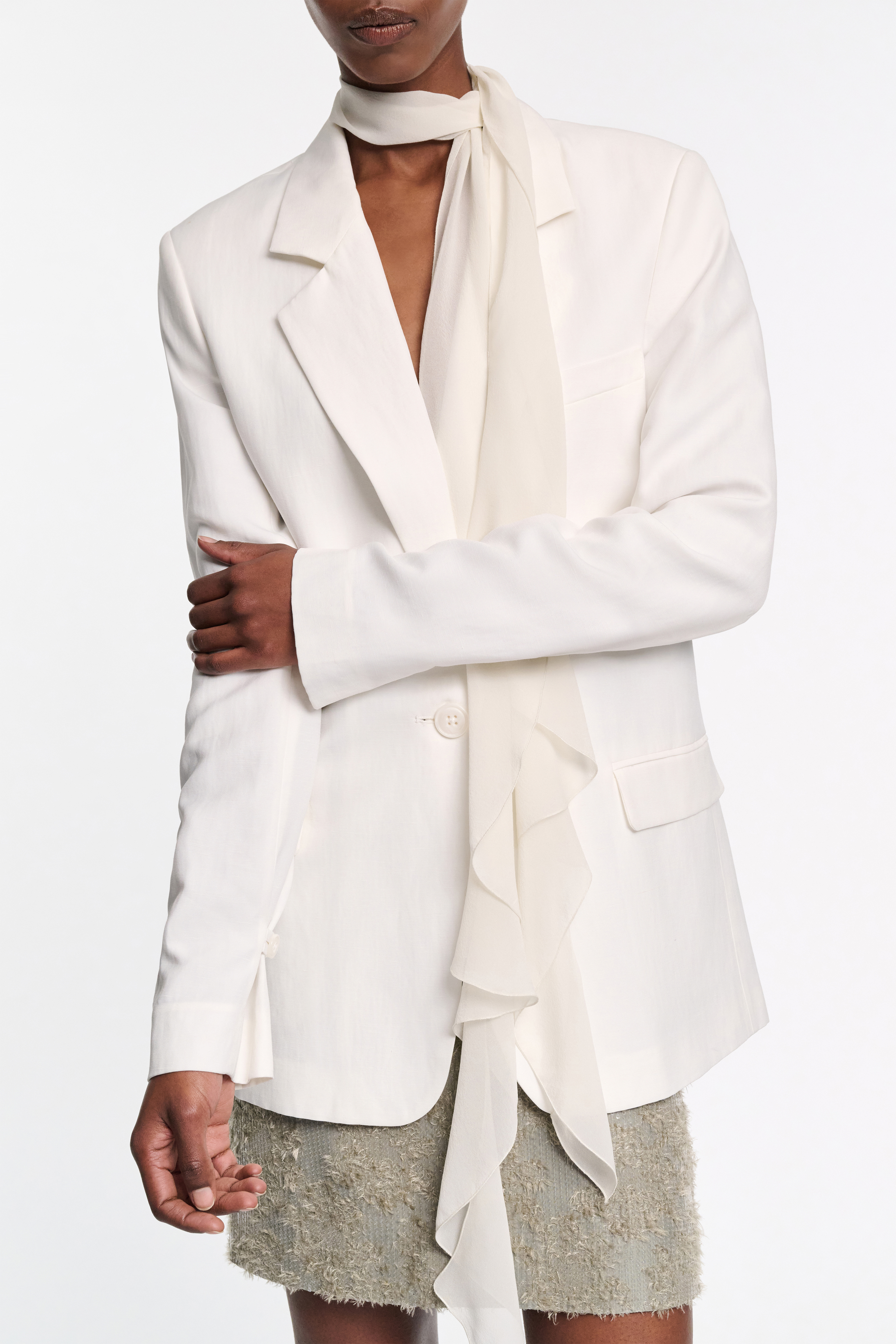 The blazer features classic styling and a buttoned loop detail at the wrist.