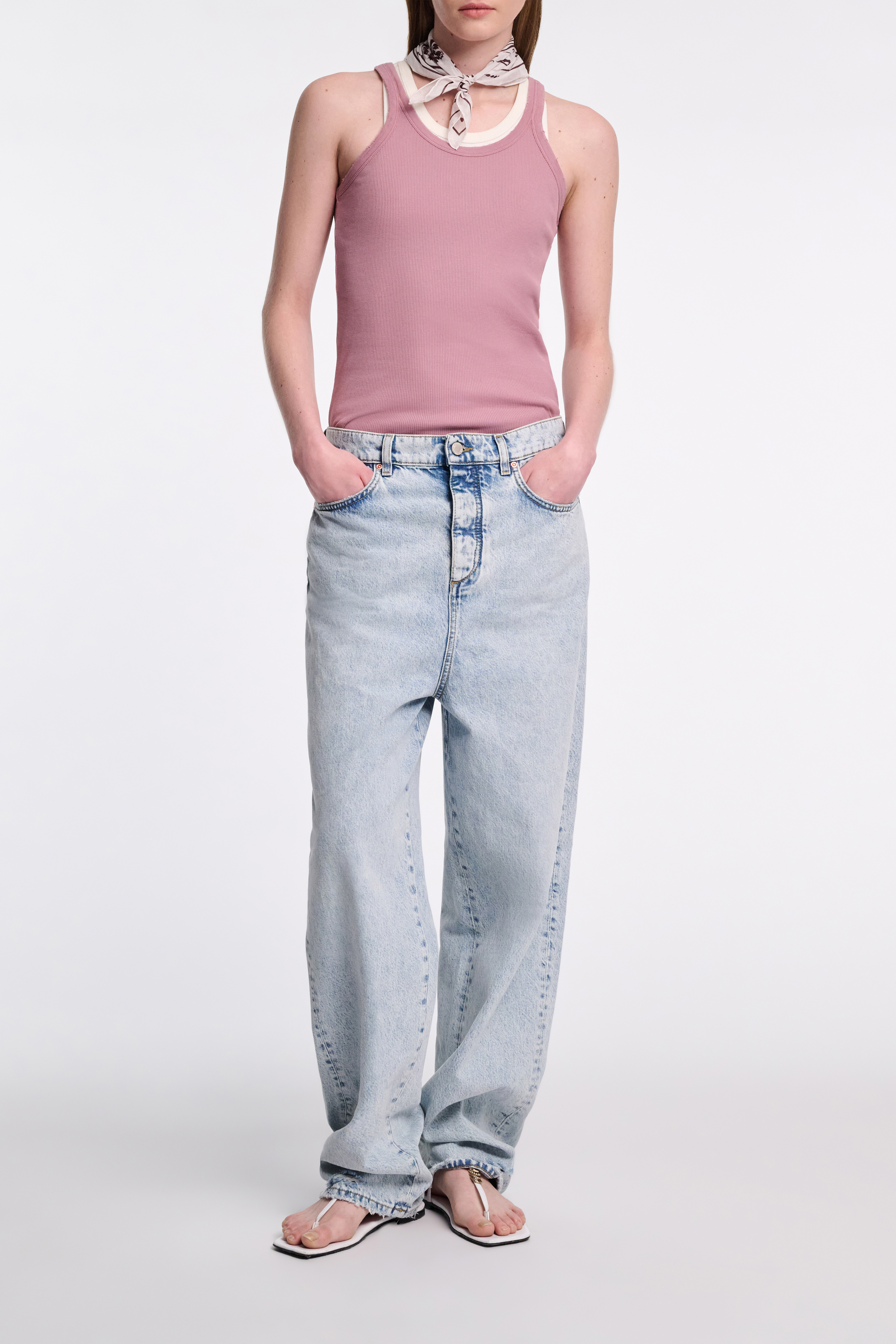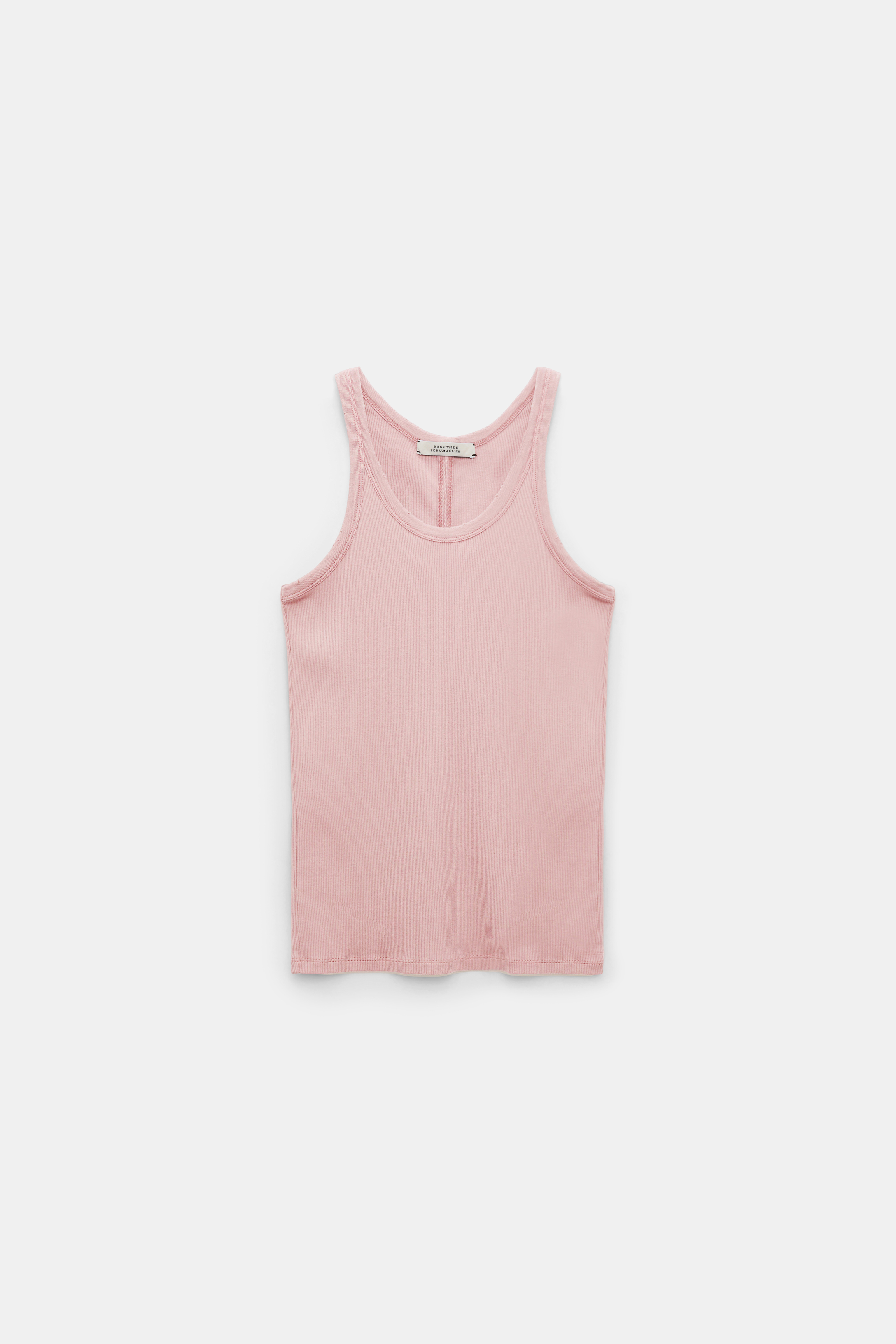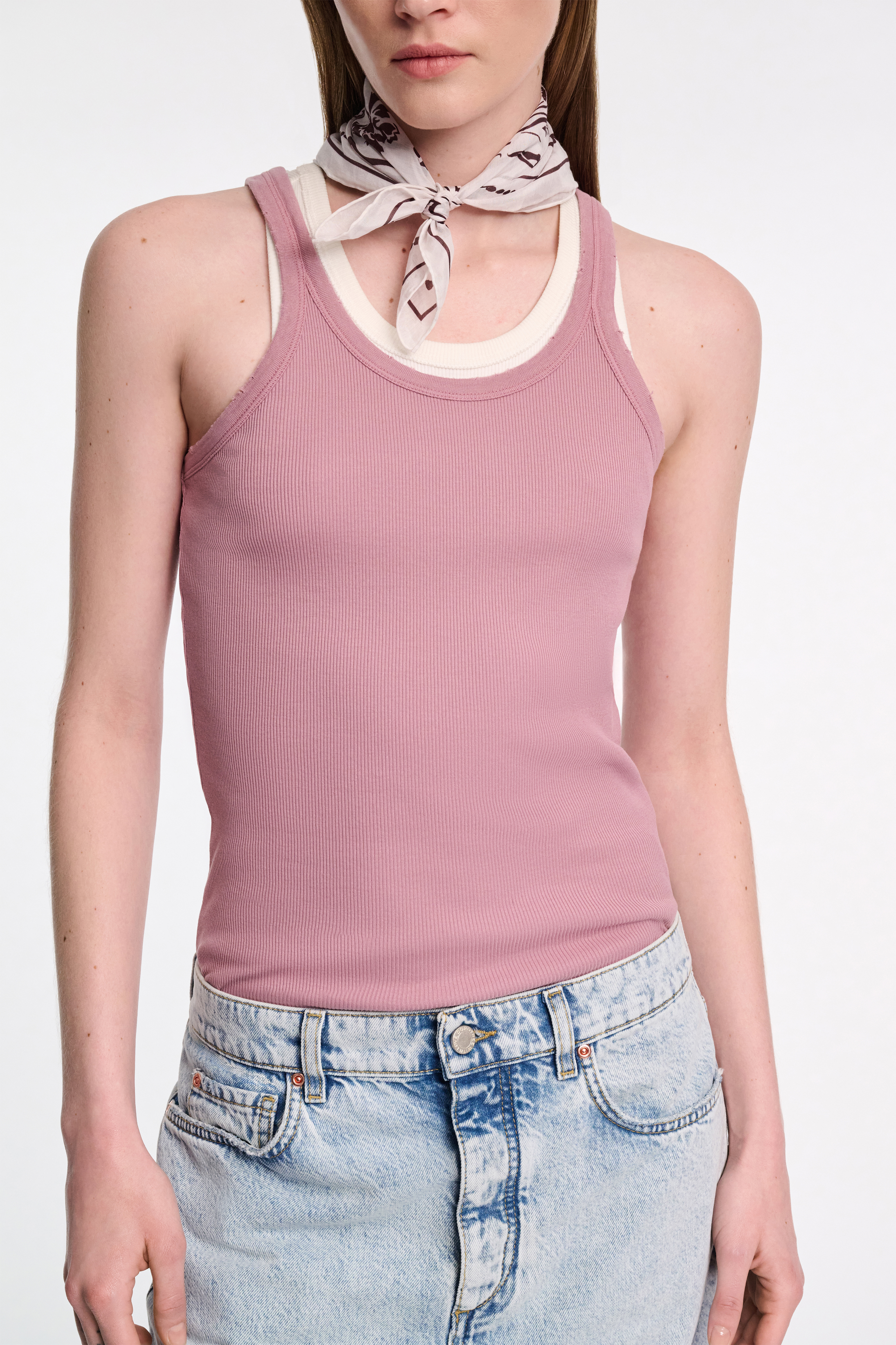 The ribbed cotton tank top has a round scoop neckline and distressed edges.