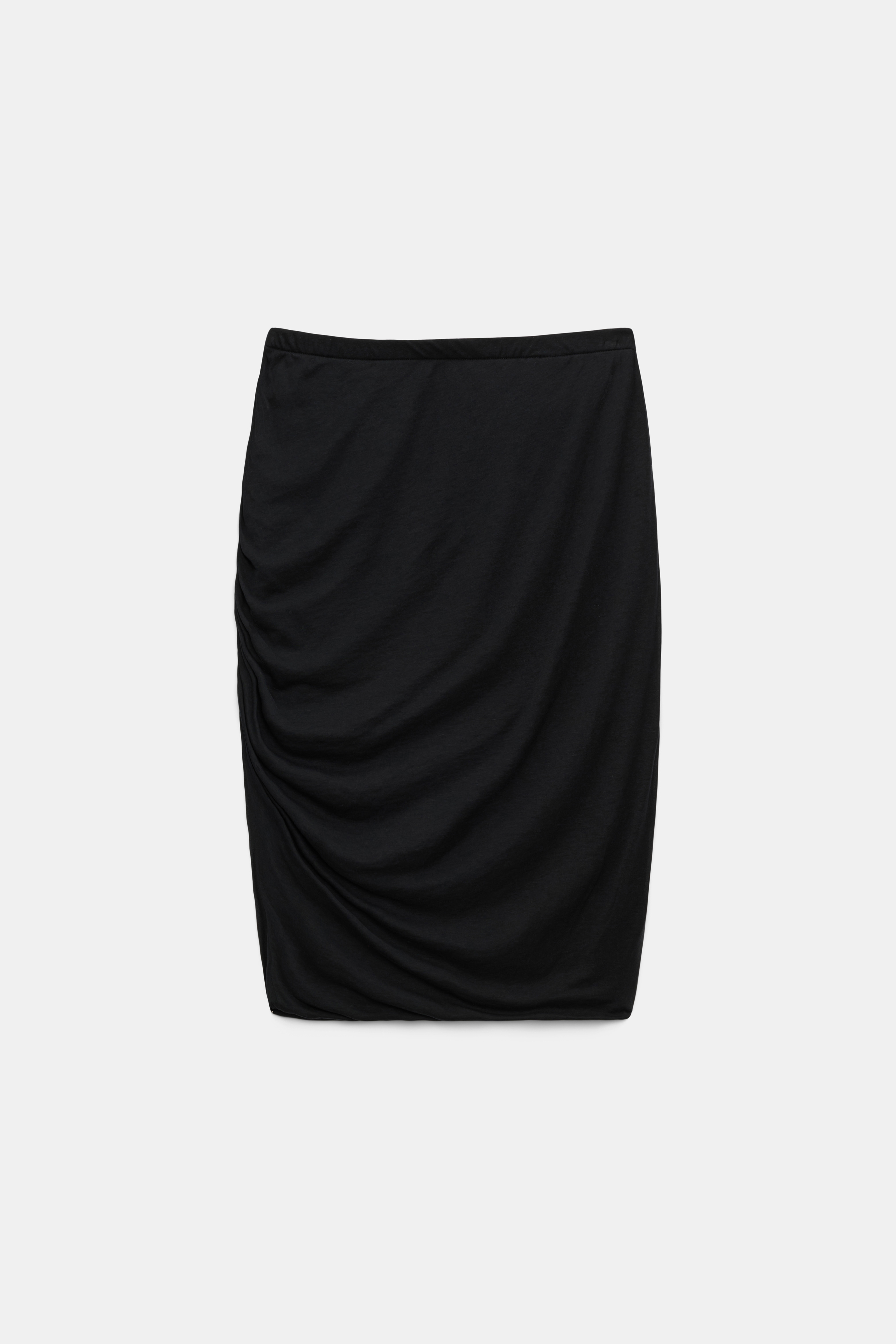 The skirt has a gathered side seam, which creates soft, asymmetrical draping.
