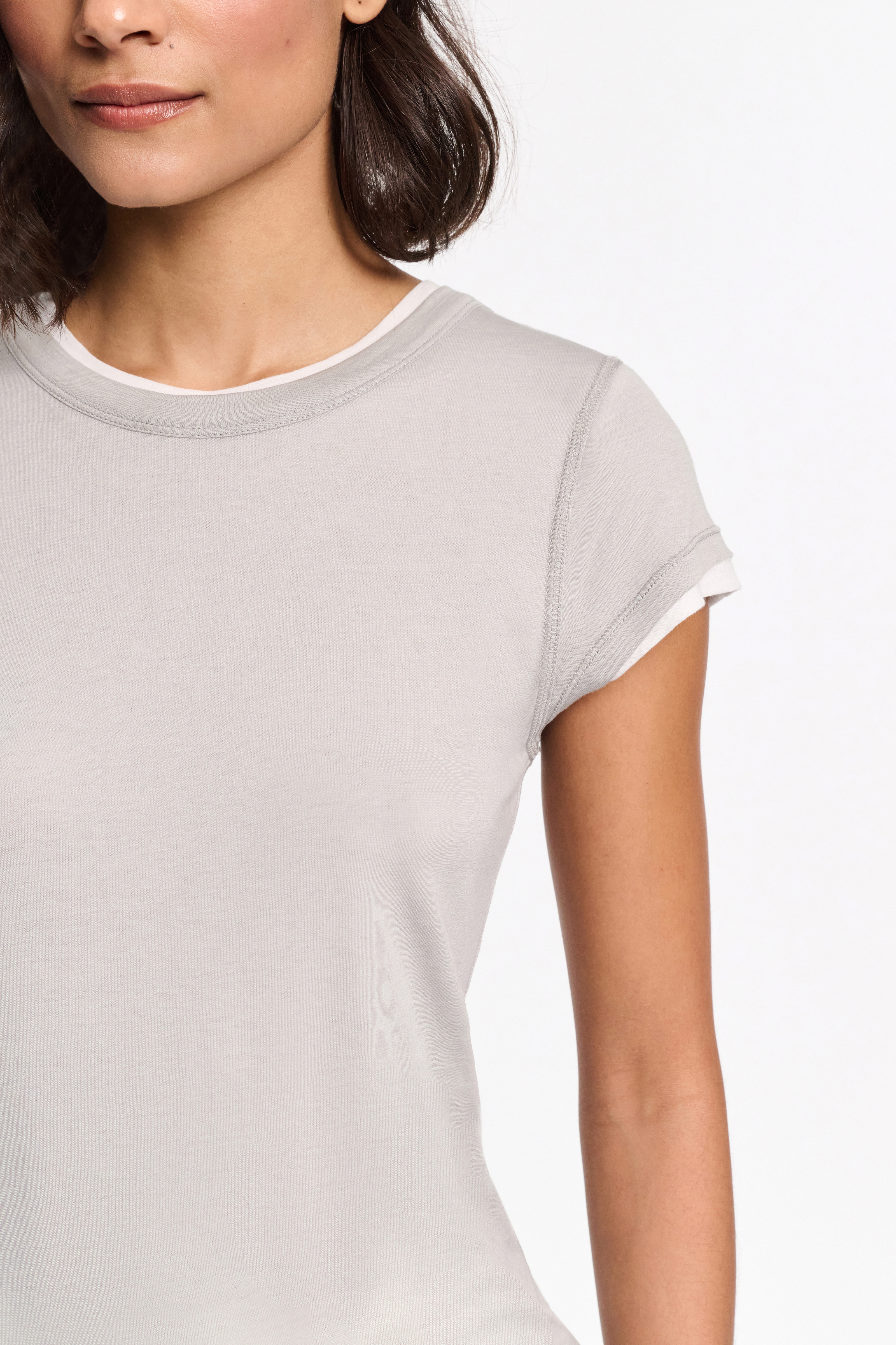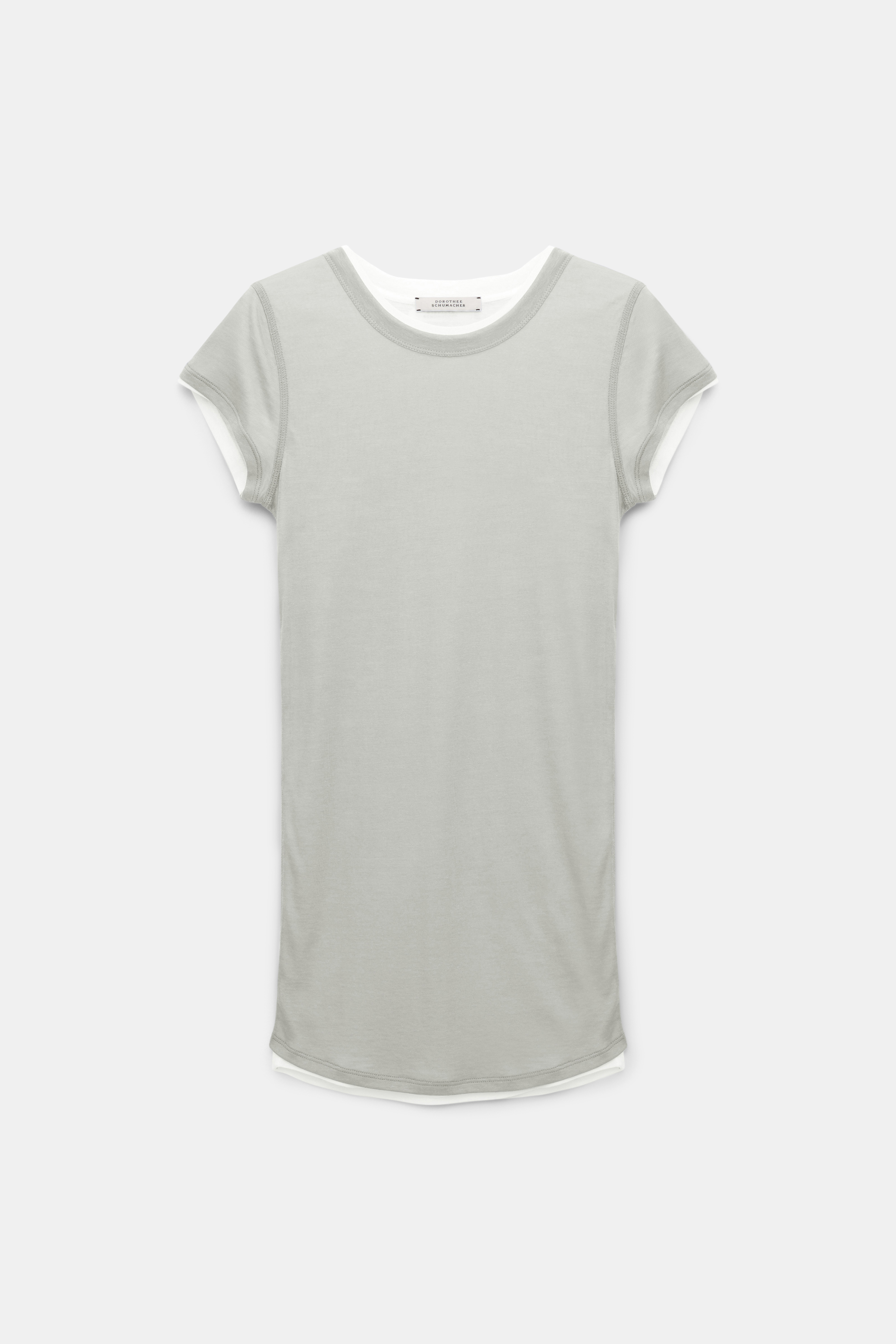The double layer T-shirt is made from fine jersey and has coverlock seams.