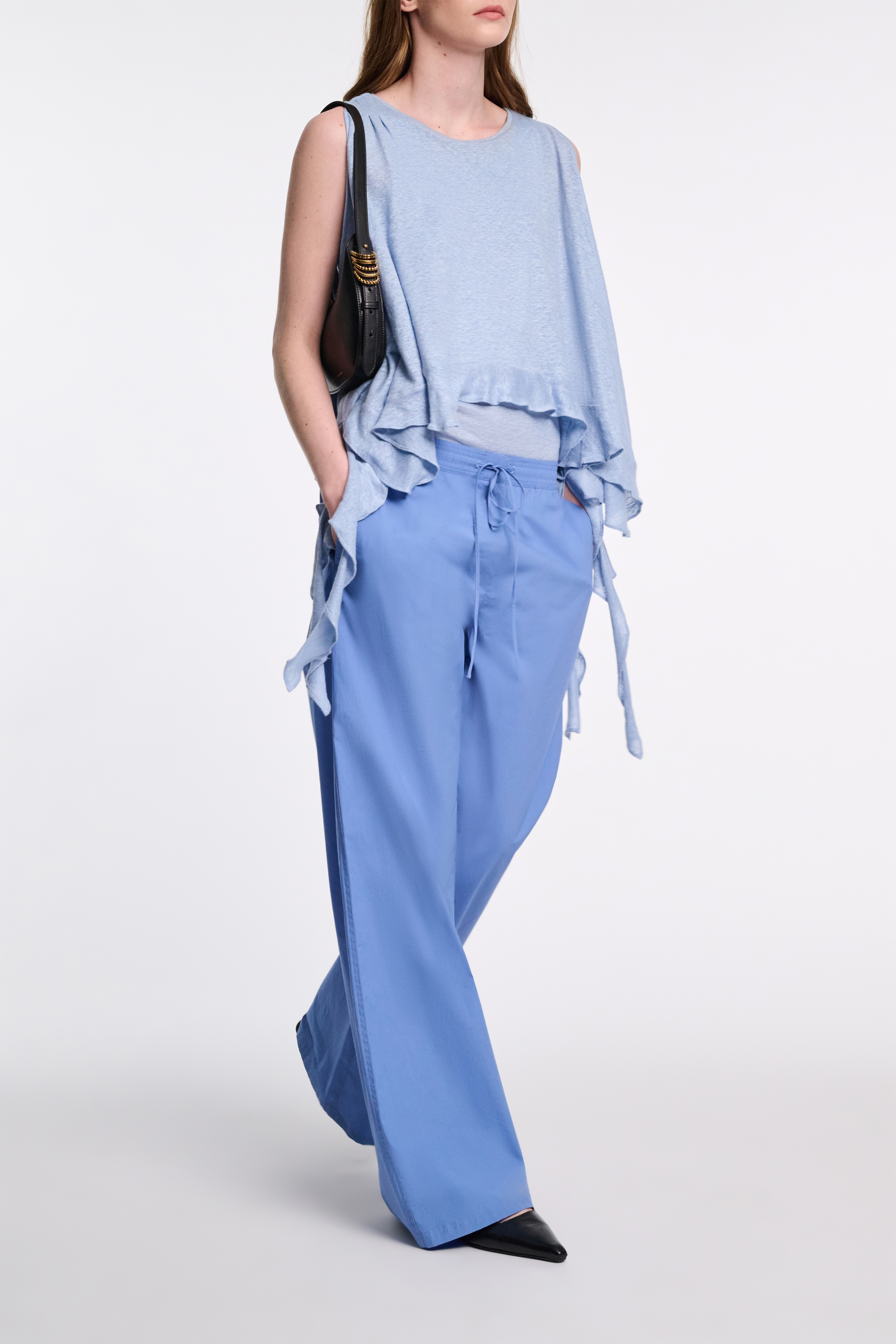 The round neck hemp tank top has long draped ruffles on the sides and a flared A-line drape.
